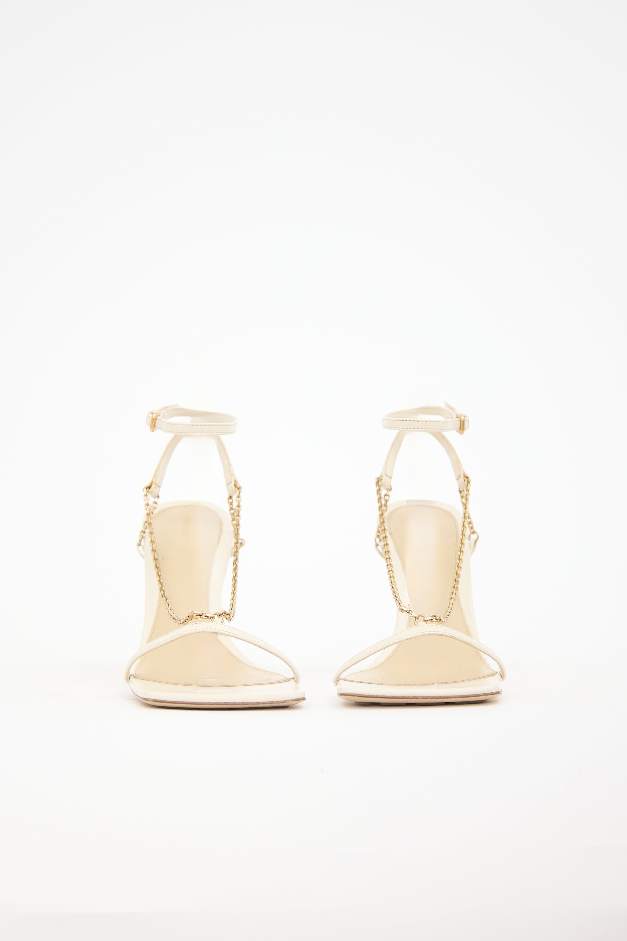 Pre-owned Bottega Veneta beige leather Stretch Chain sandals featuring an open square toe, gold tone chain straps at vamp, adjustable ankle strap, and covered spool heel.