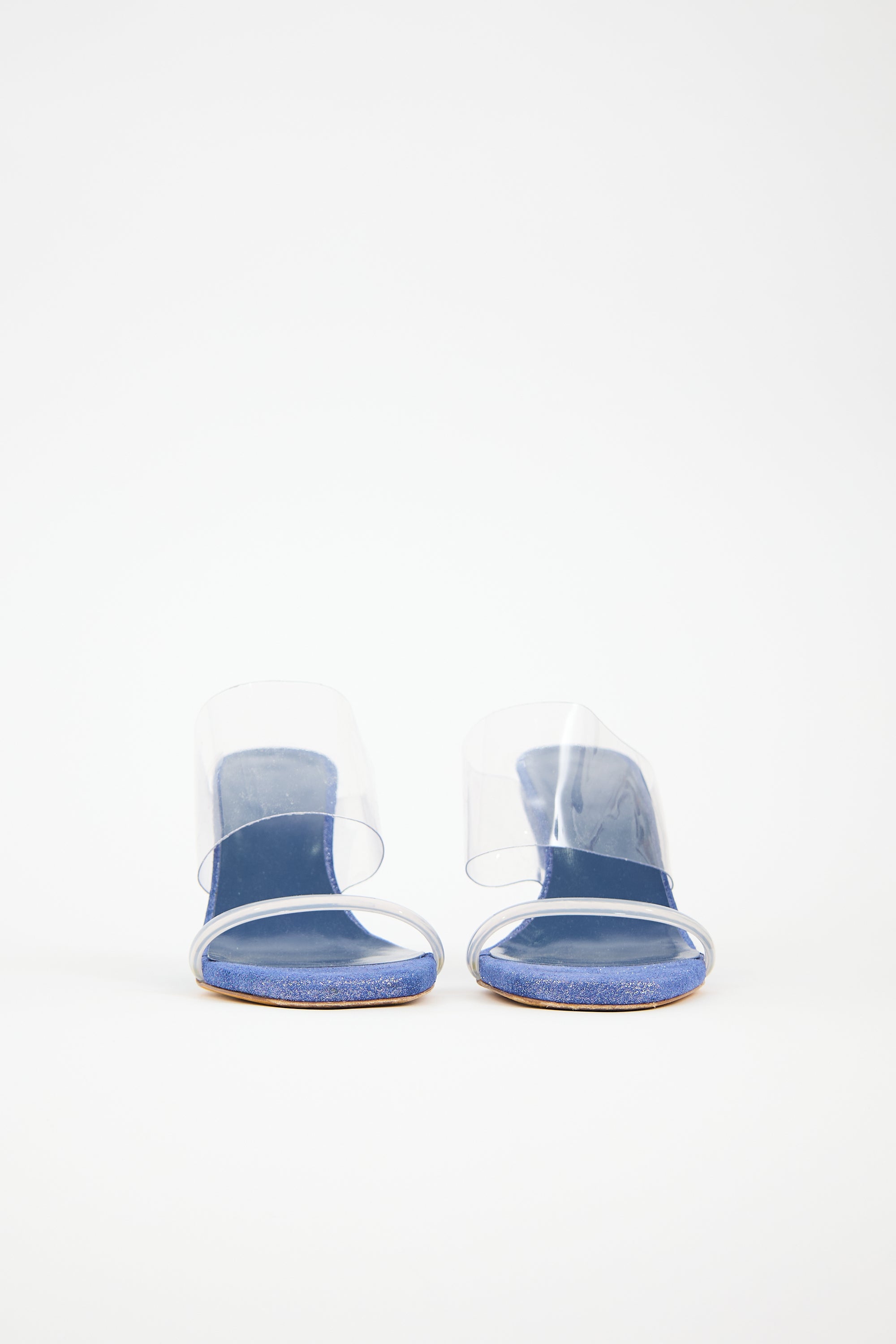 Pre-owned Maryam Nassir Zadeh blue Olympia sandals featuring square toe, clear PVC strap upper, and glitter suede wedge.