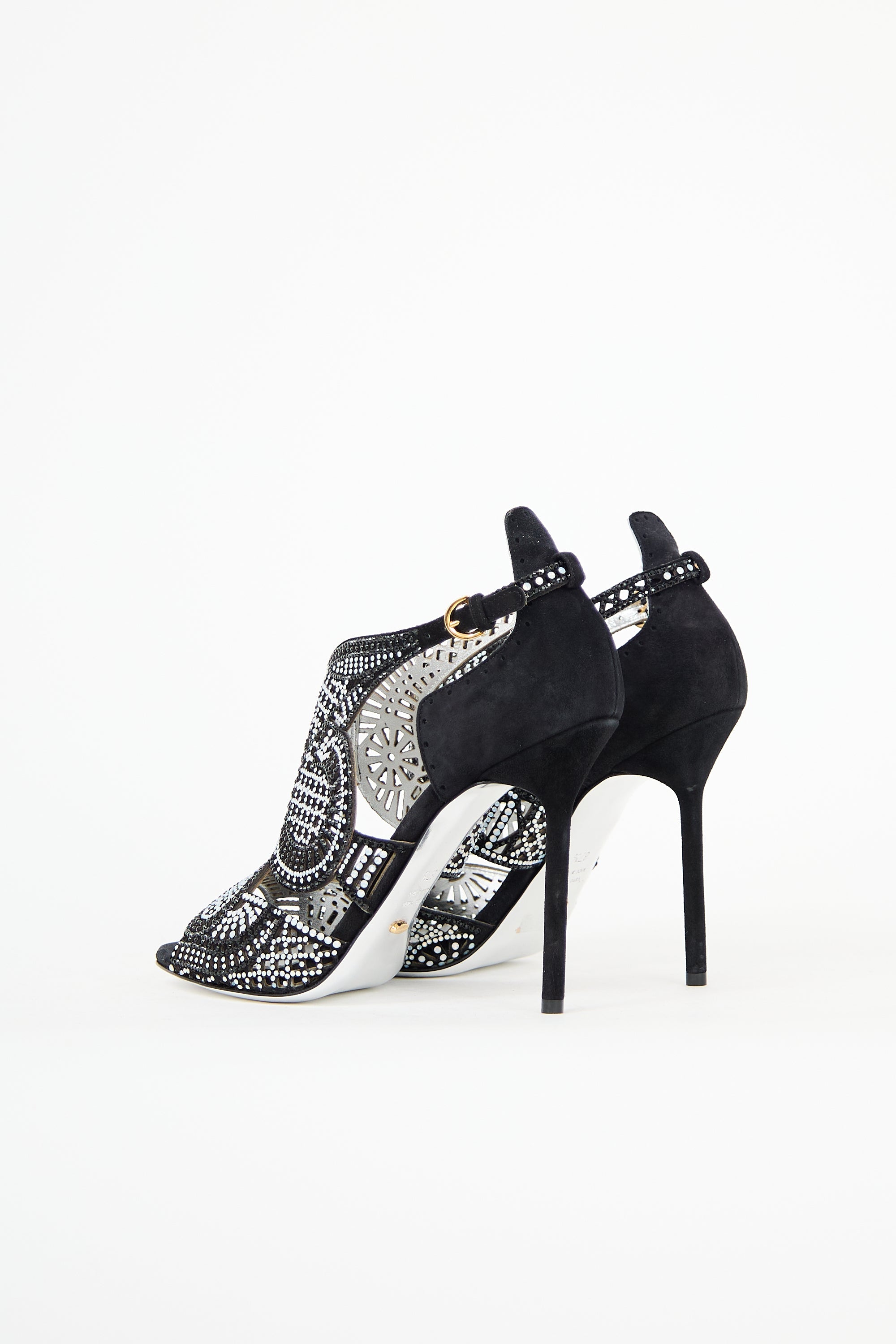 Pre-owned Sergio Rossi black suede sandals featuring an open rounded toe, rhinestone embellished upper, adjustable ankle strap, and covered stiletto heel.