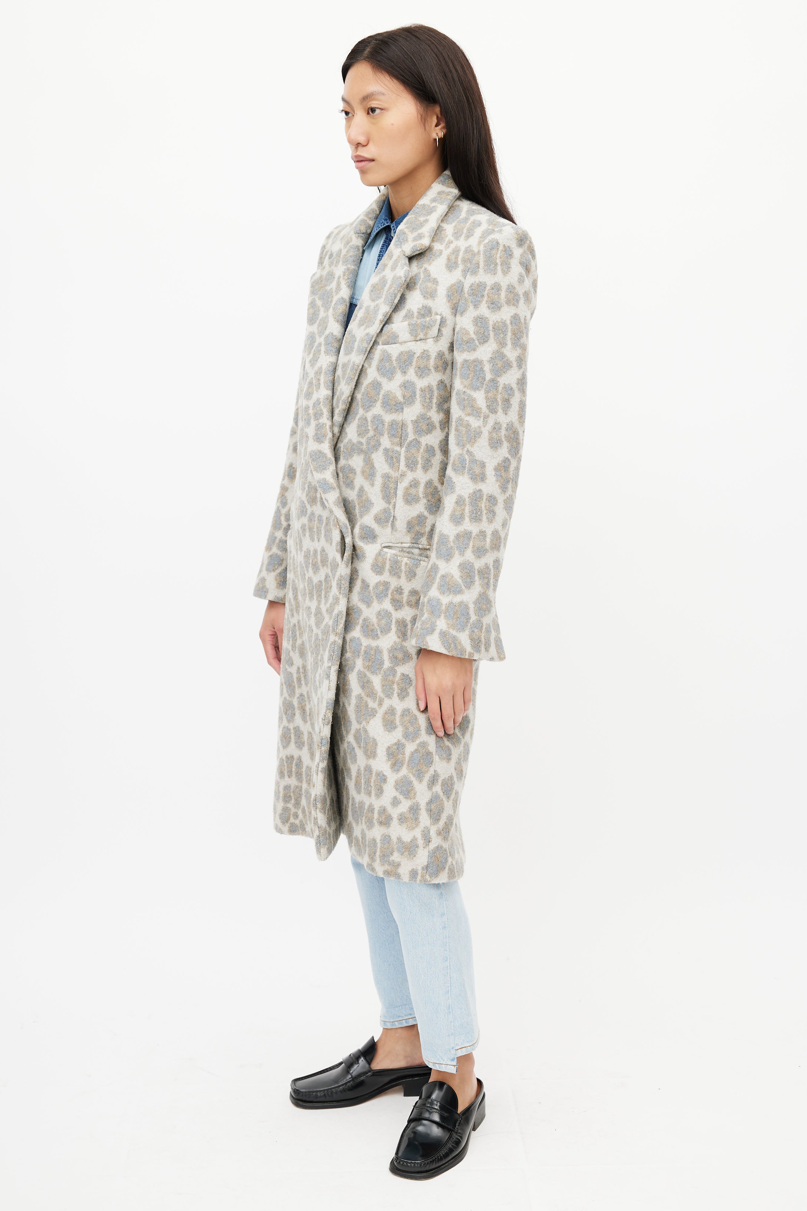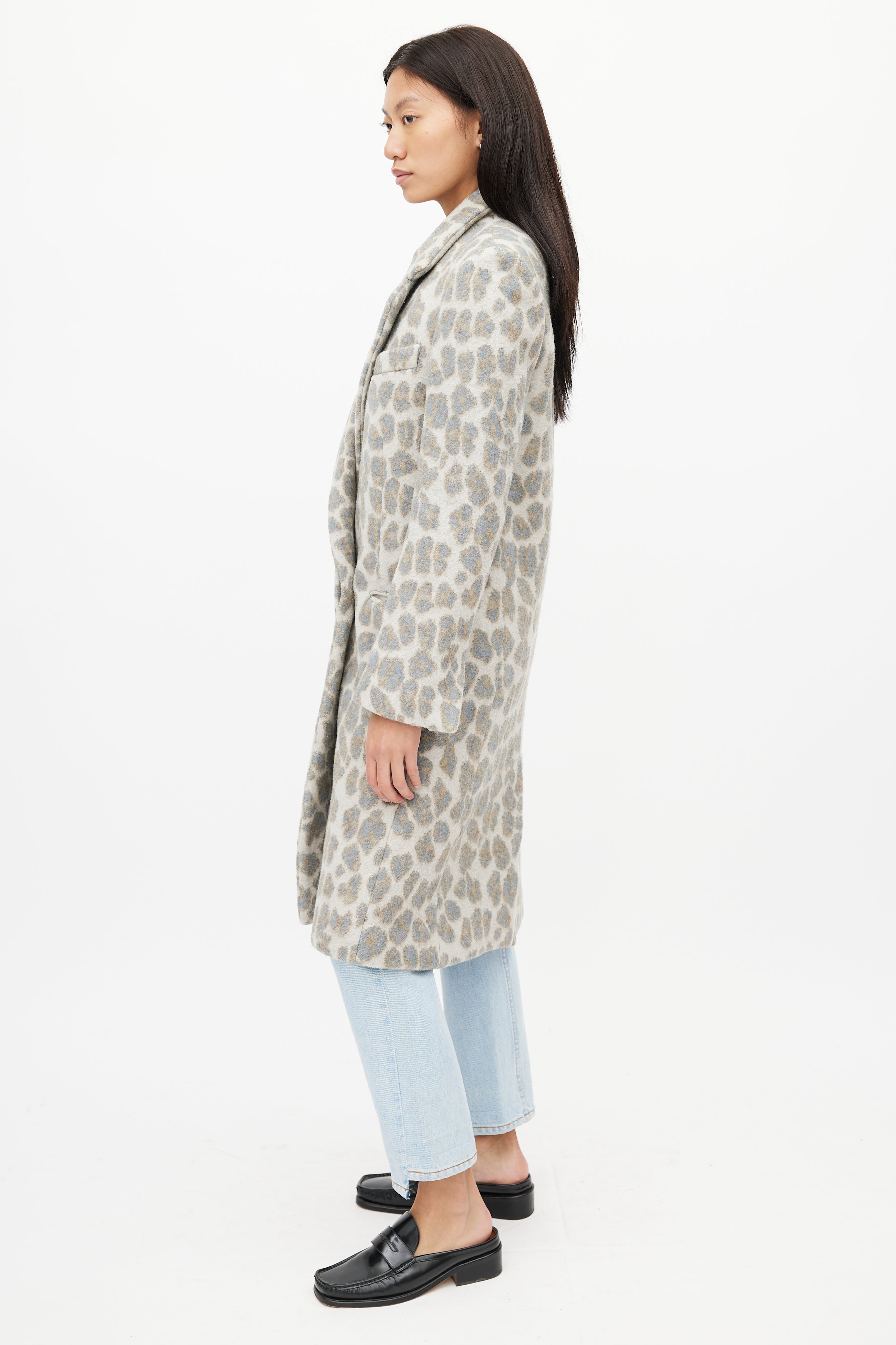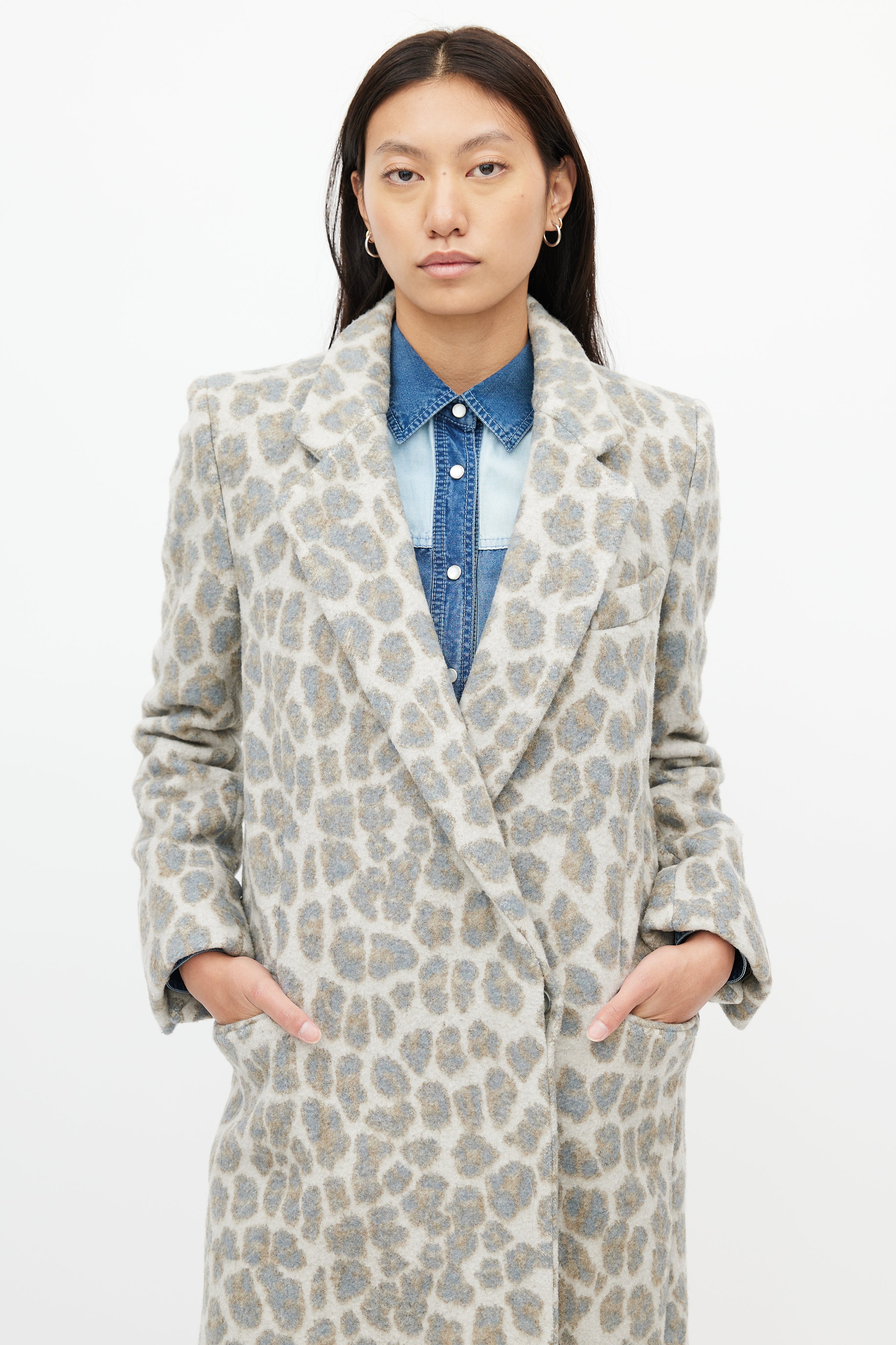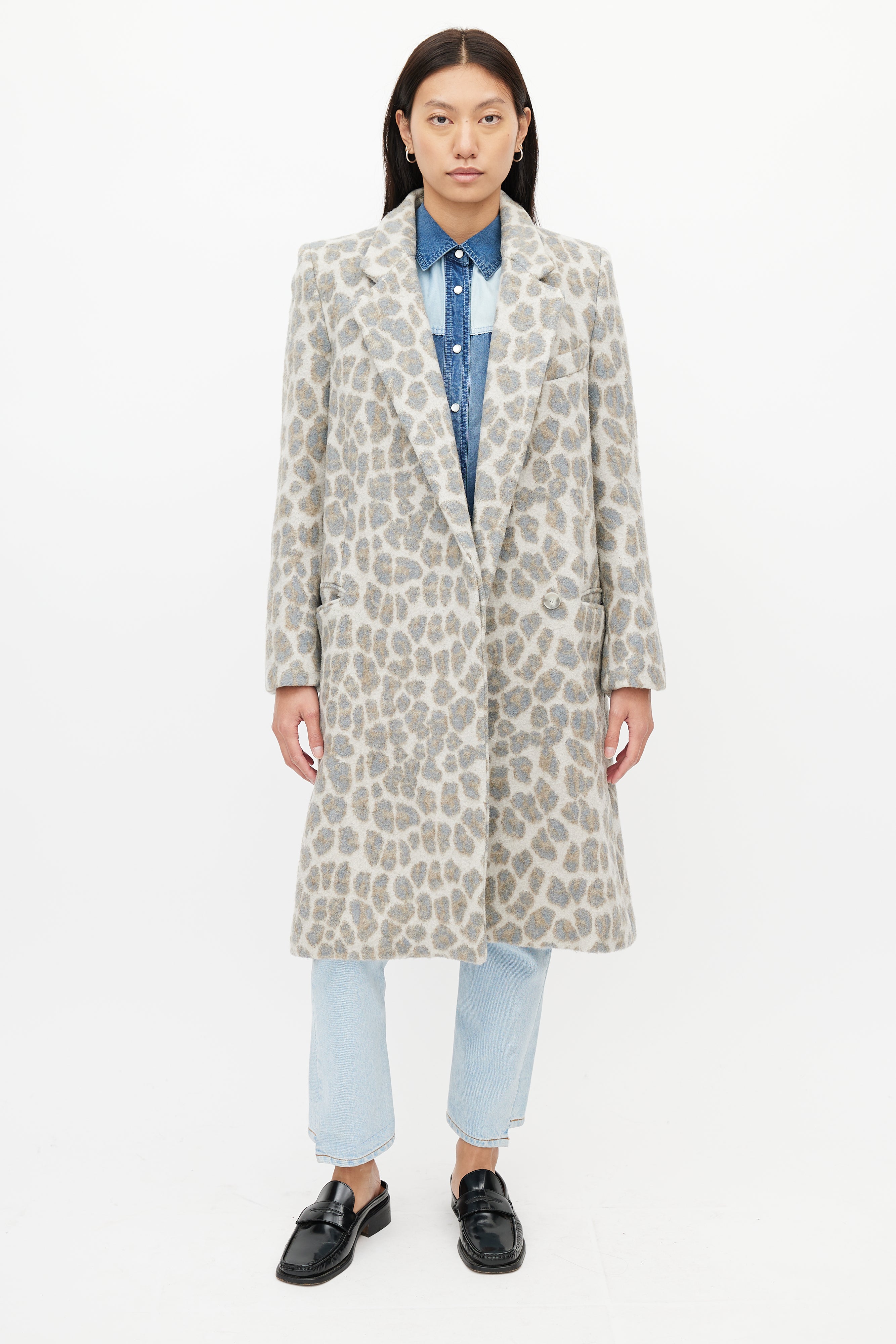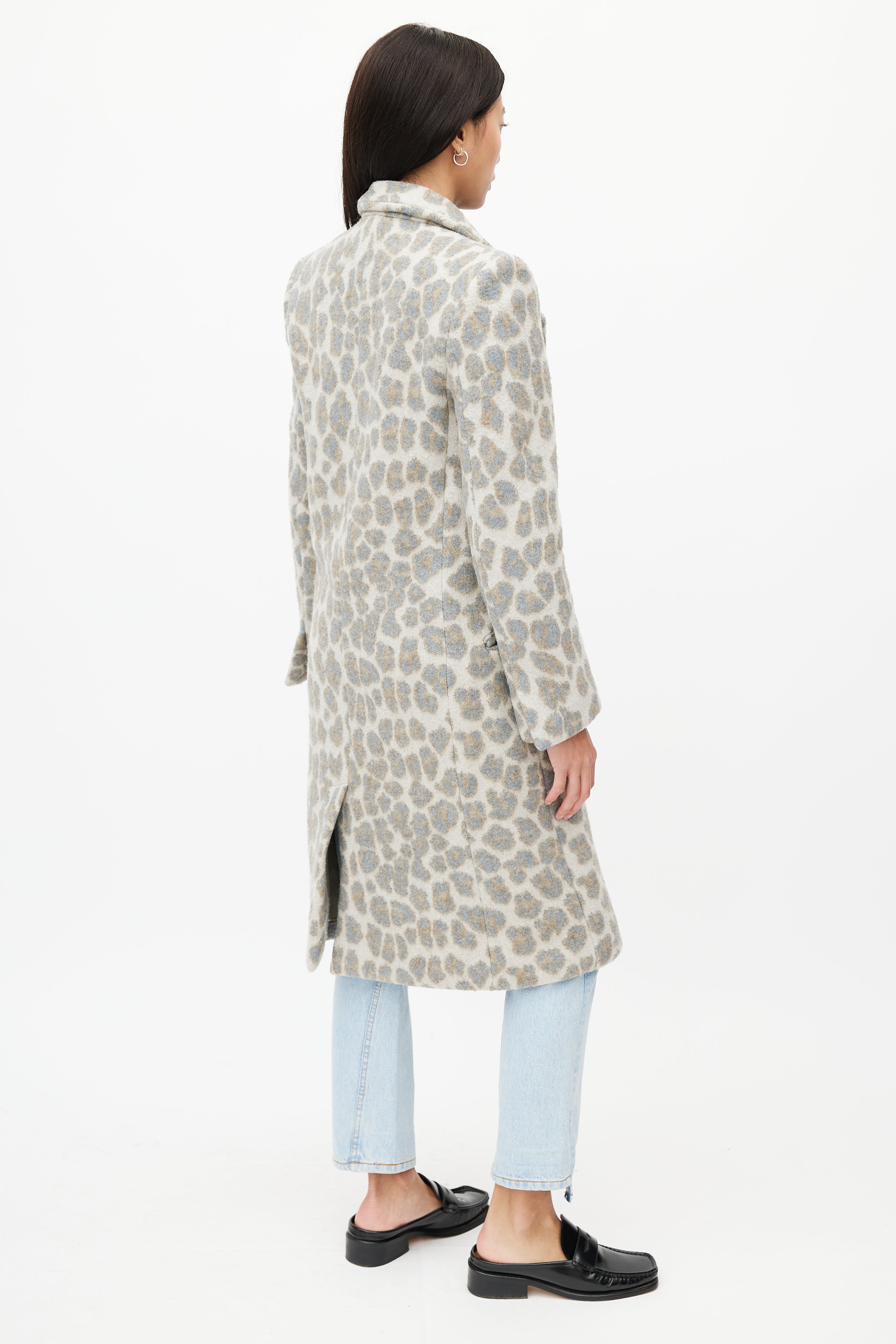 Pre-owned Stella McCartney grey coat featuring brown leopard print, notch lapel, concealed button up front, two welt pockets at hips, and back vent. Lined.