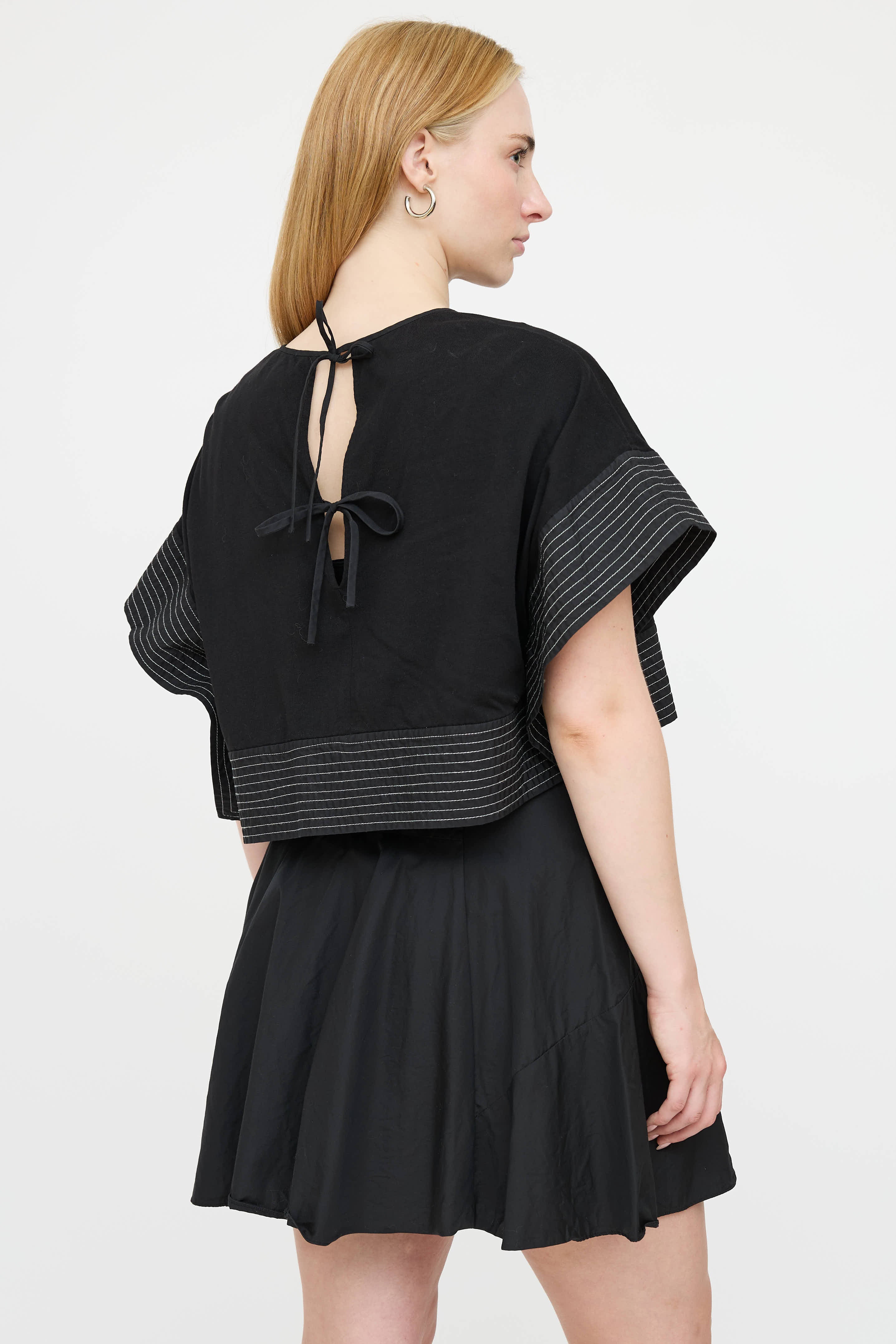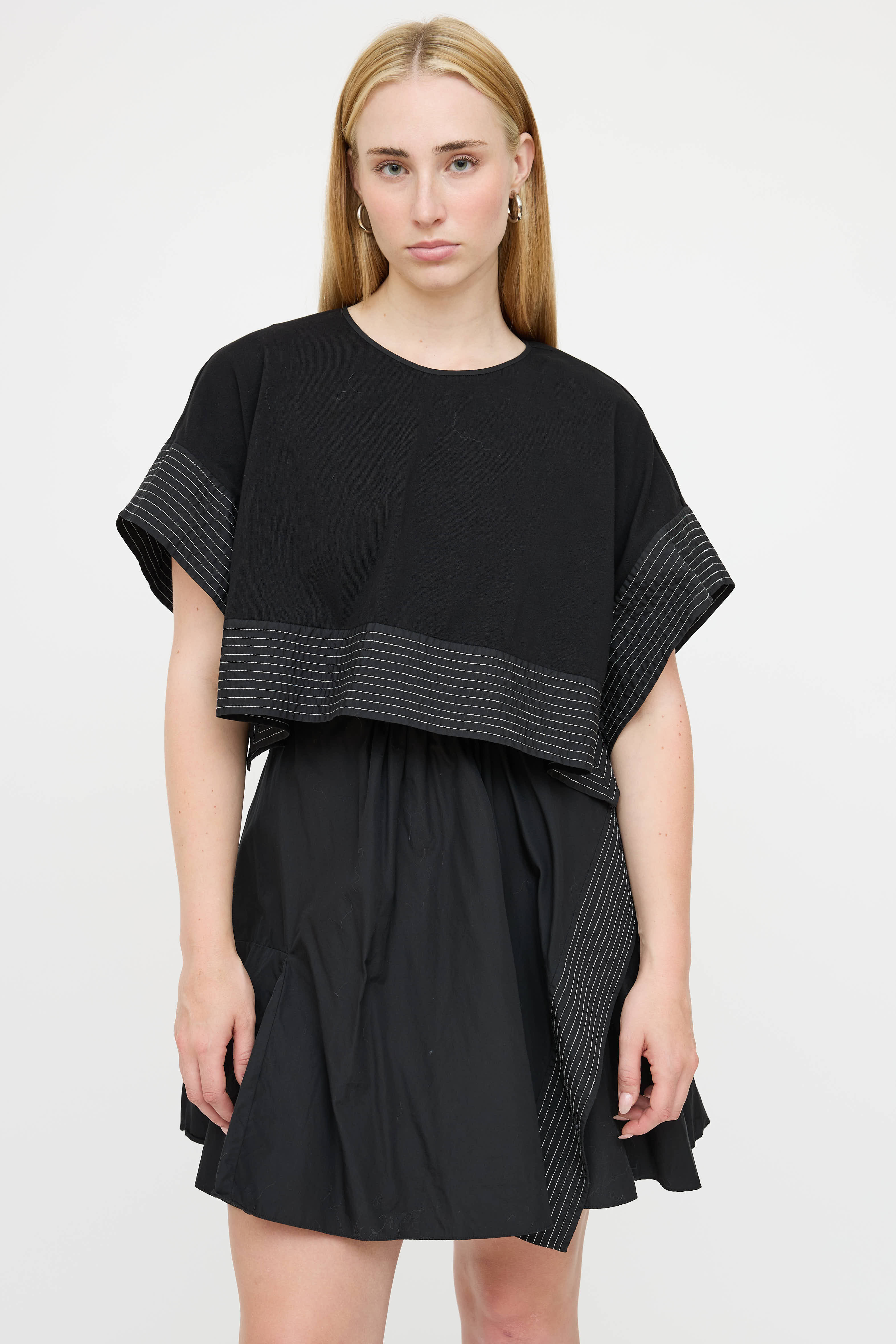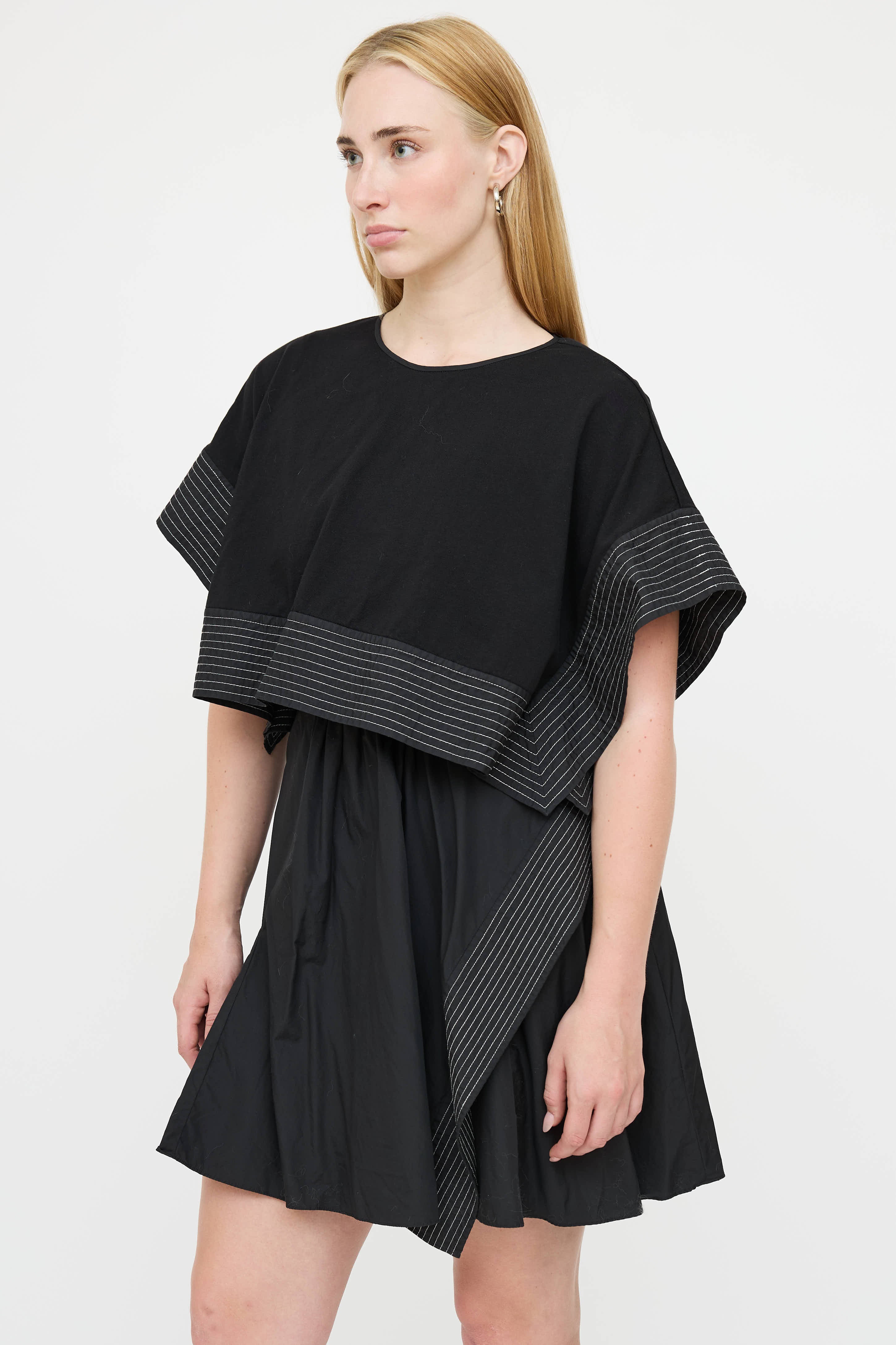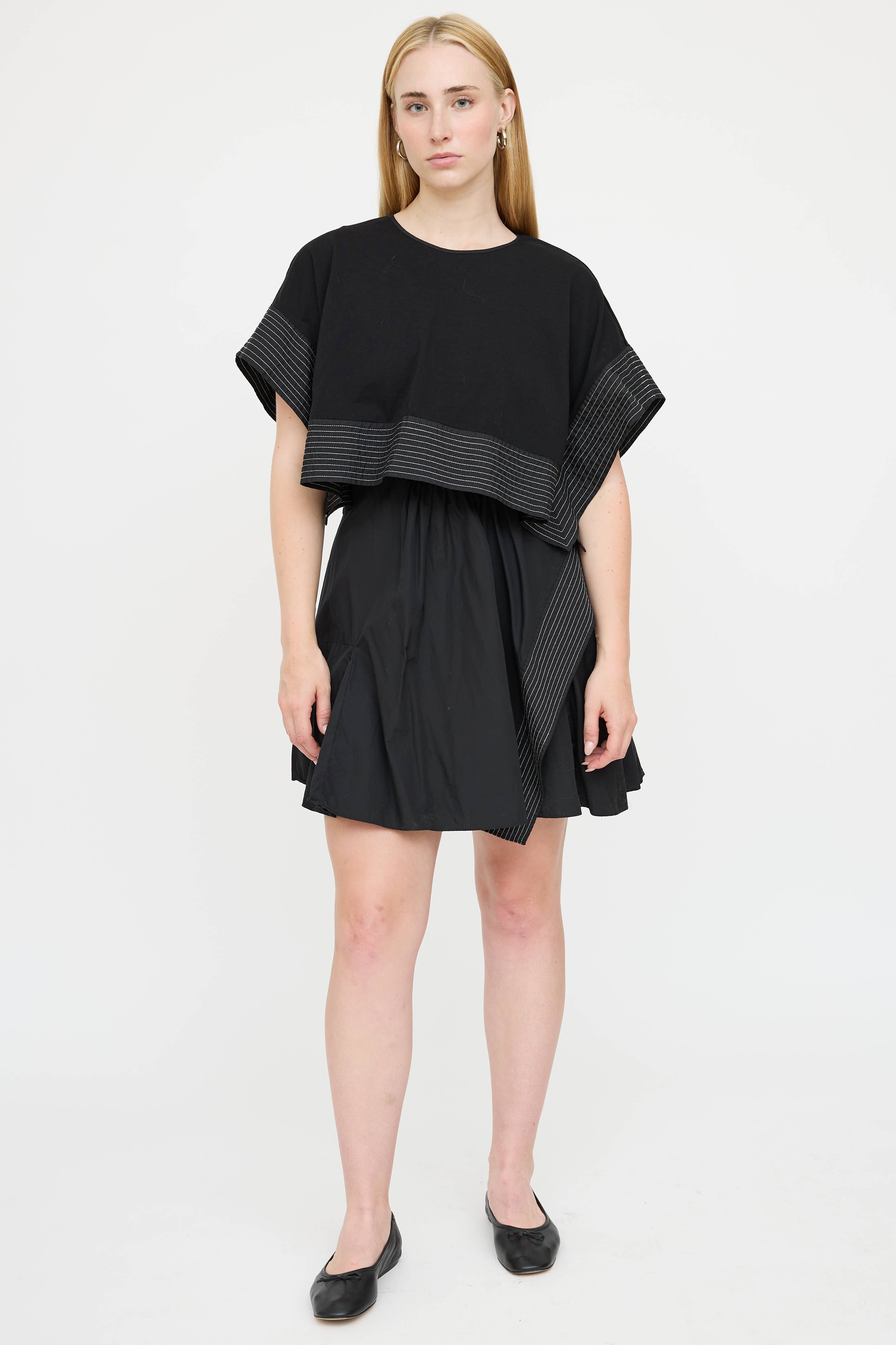 Pre-owned 3.1 Phillip Lim black top featuring white contrast stitching, round neckline, cap sleeves, and dual tie closure at back. Matching dress features a scoop neckline, sleeveless styling, layered skirt with white contrast stitching, and zip at side with hook and eye closure.