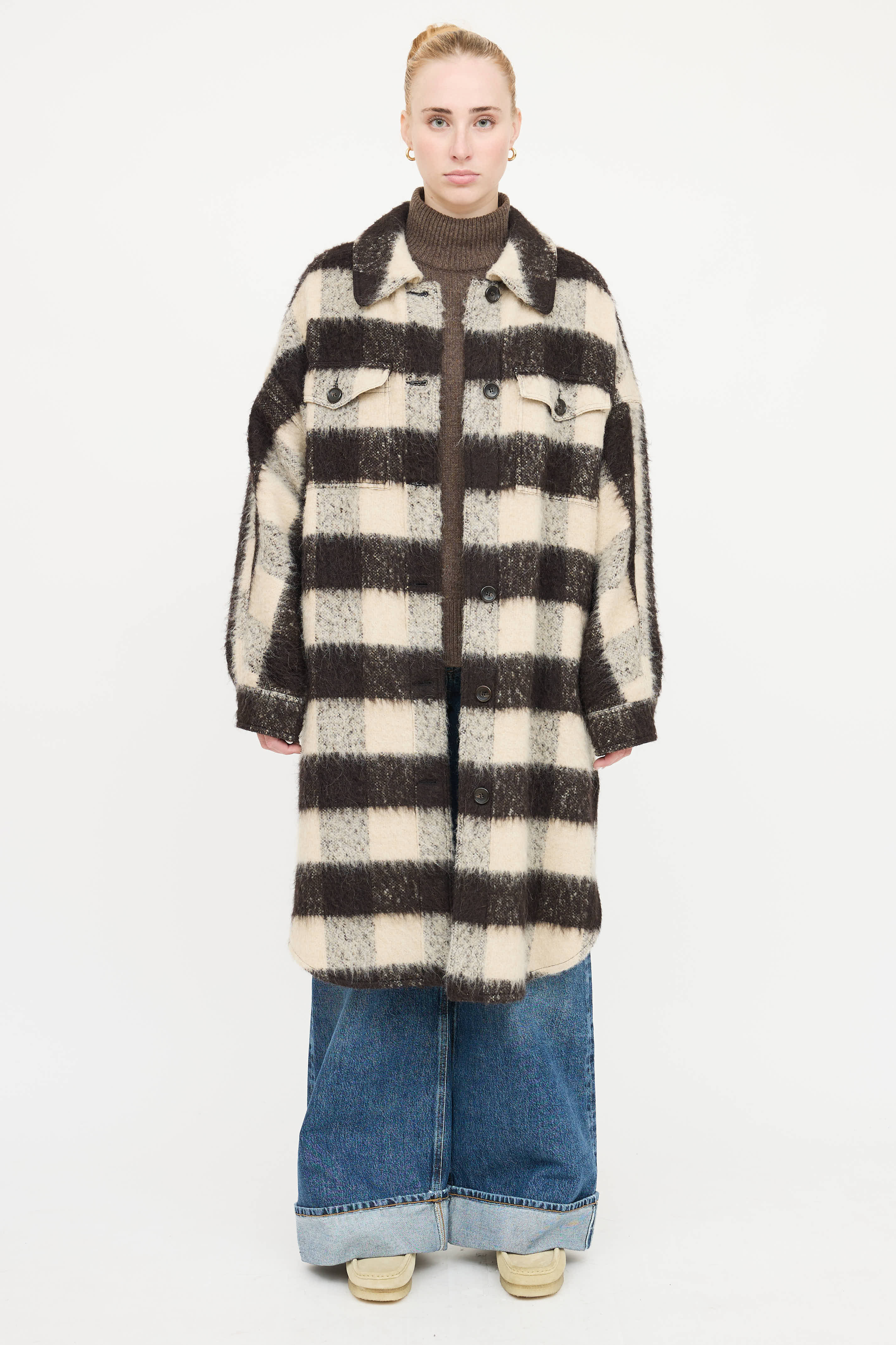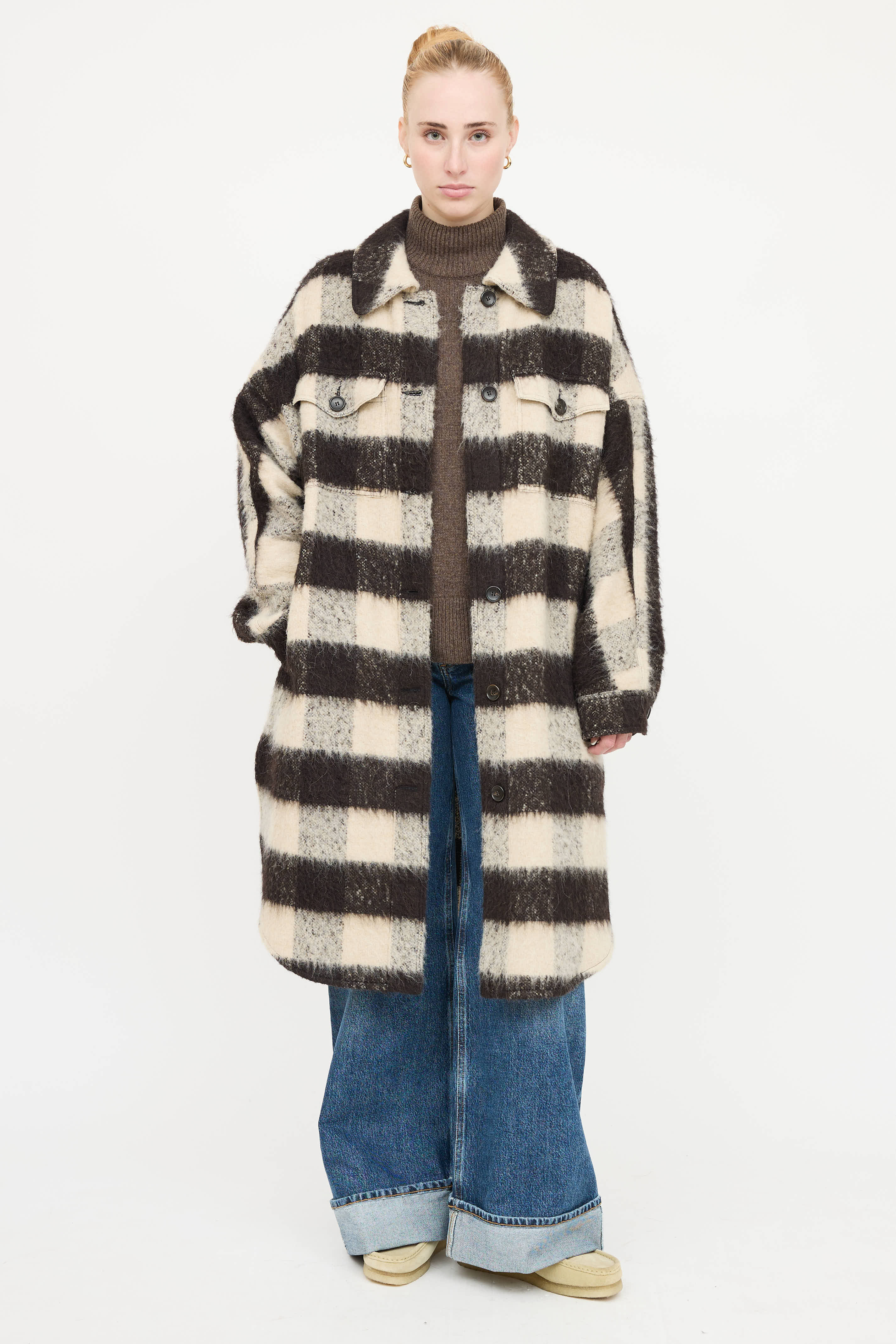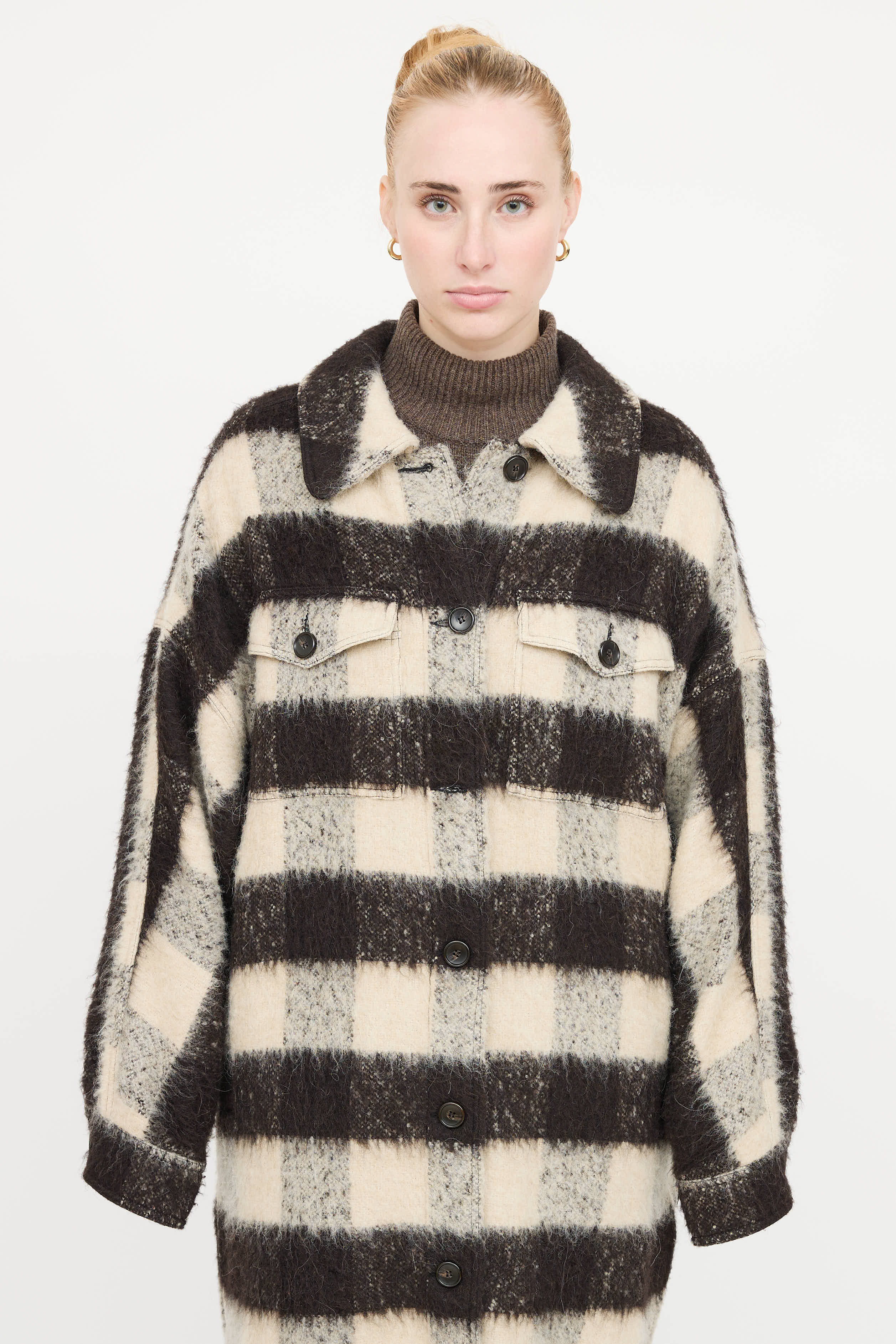 Pre-owned A.L.C. brown and cream plaid jacket featuring fuzzy knit, two large flap button pockets at chest, tortoise shell buttons at front and cuffs, two hip pockets and split hem.