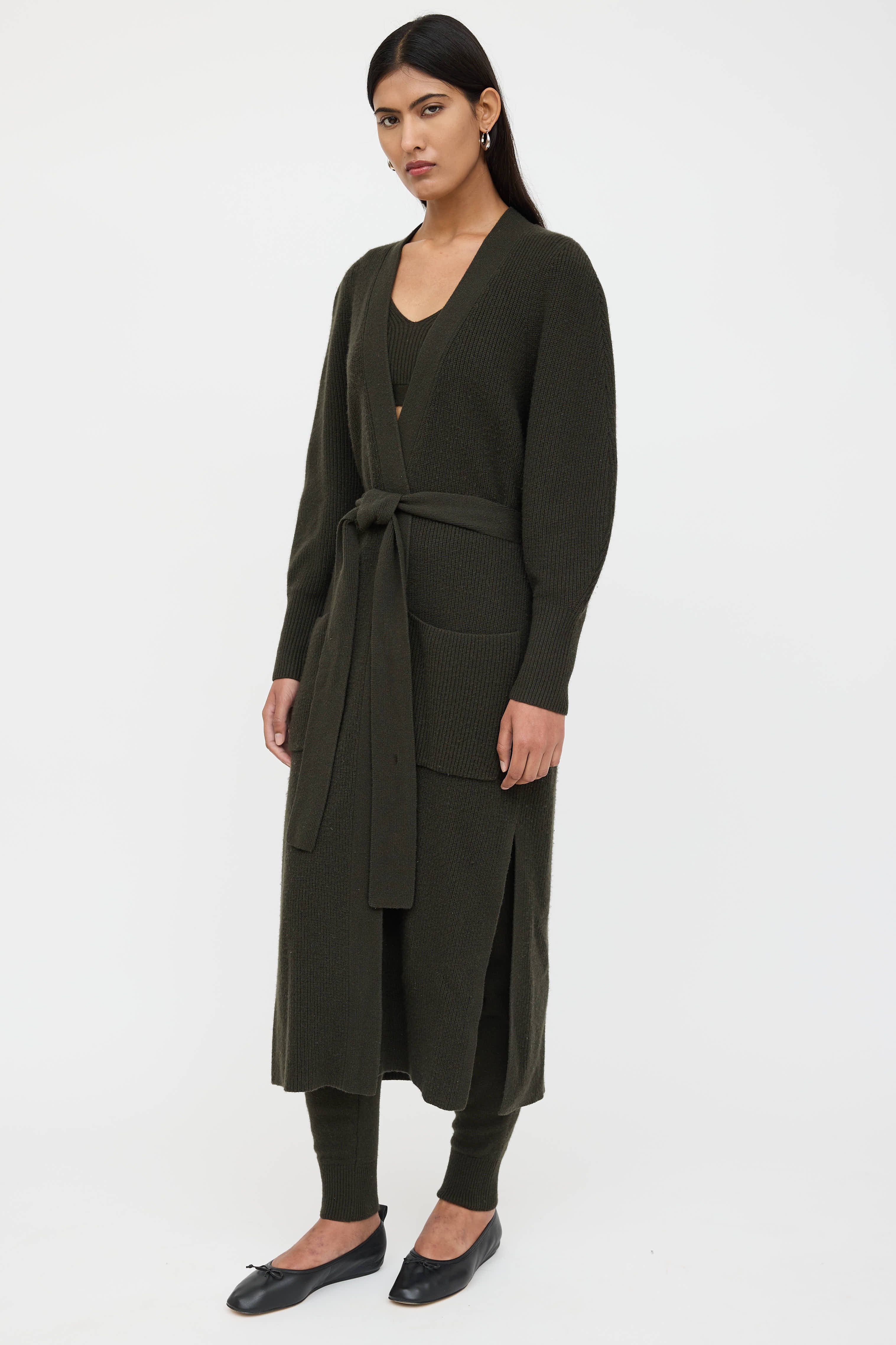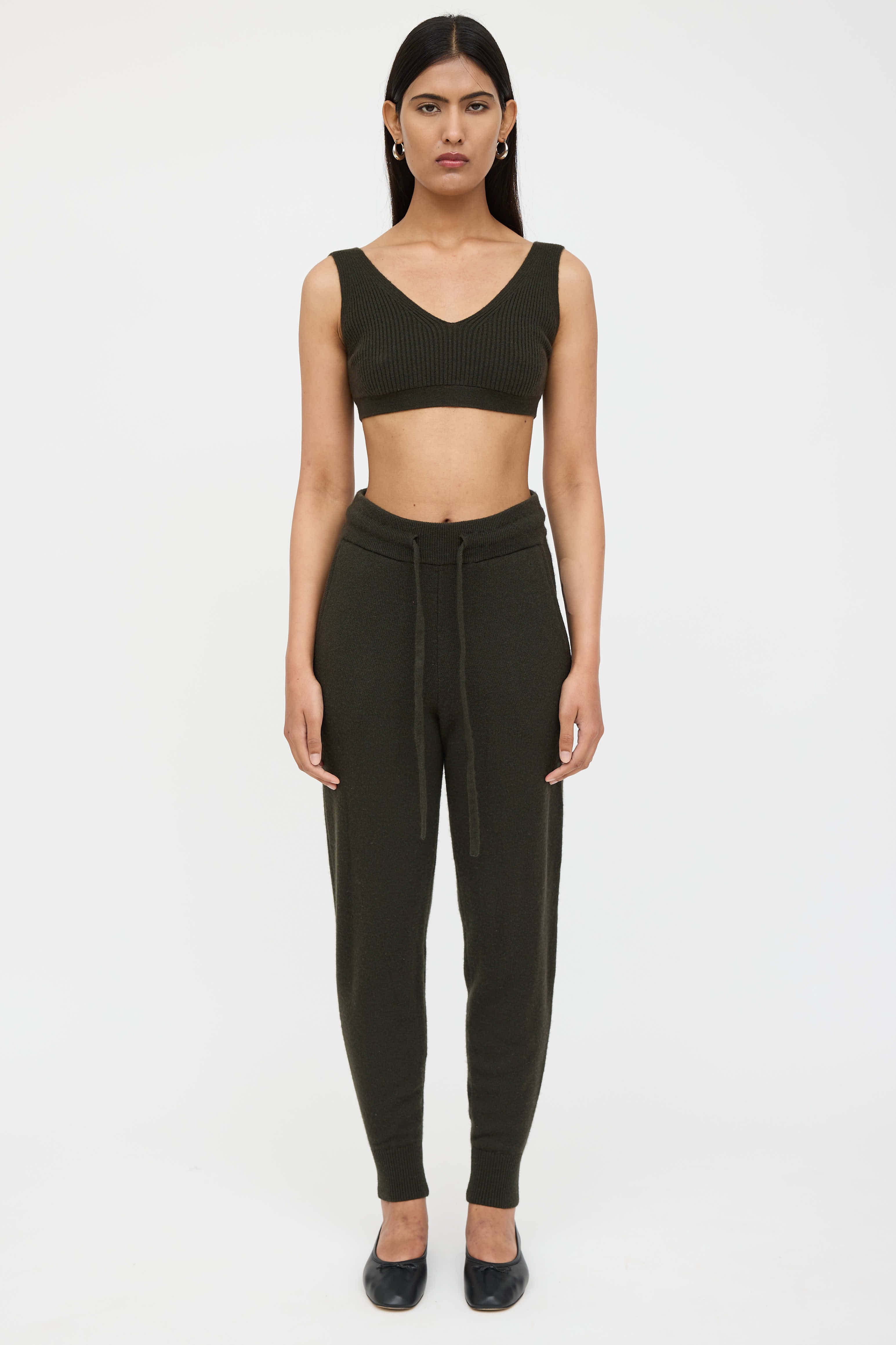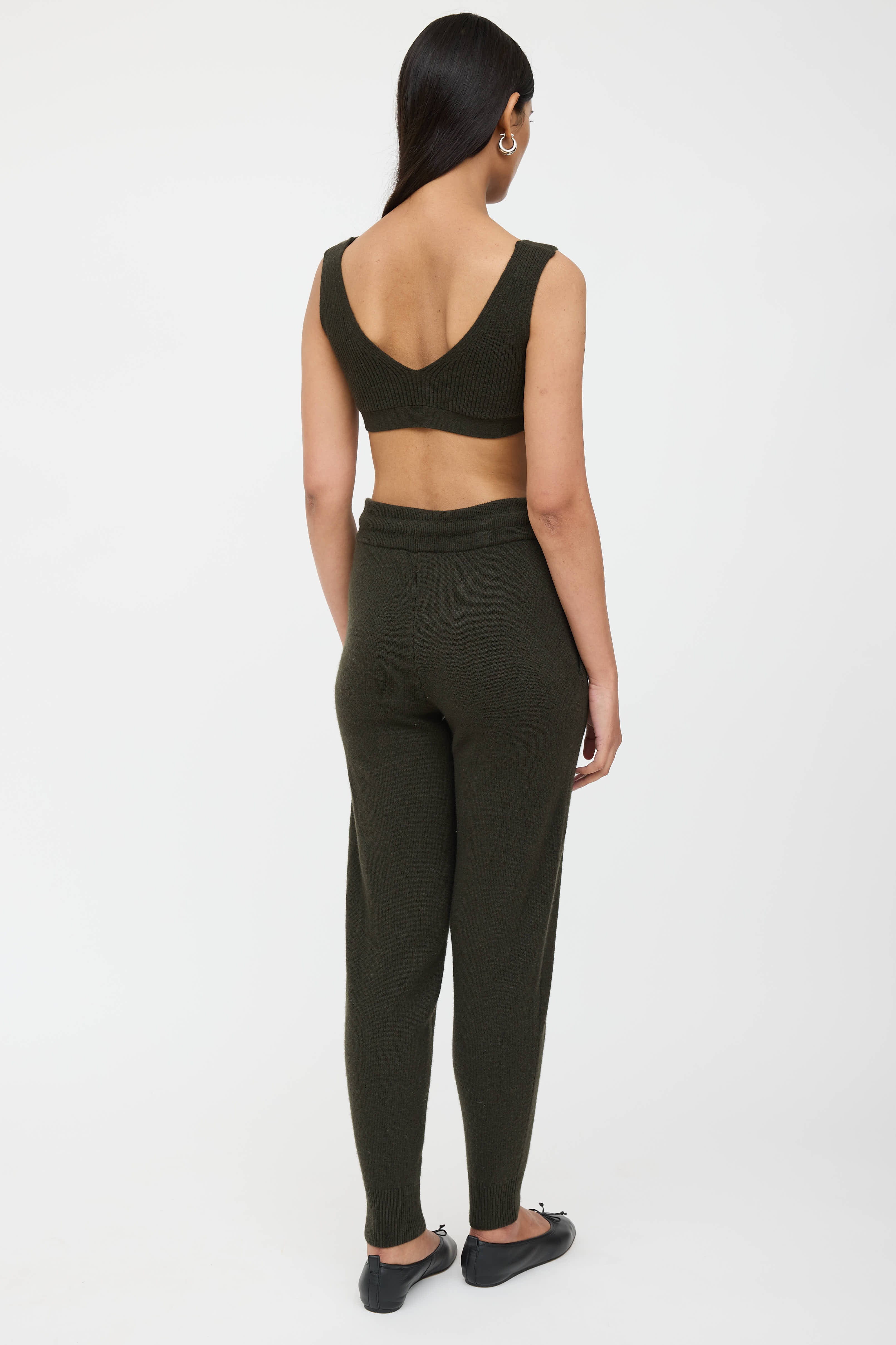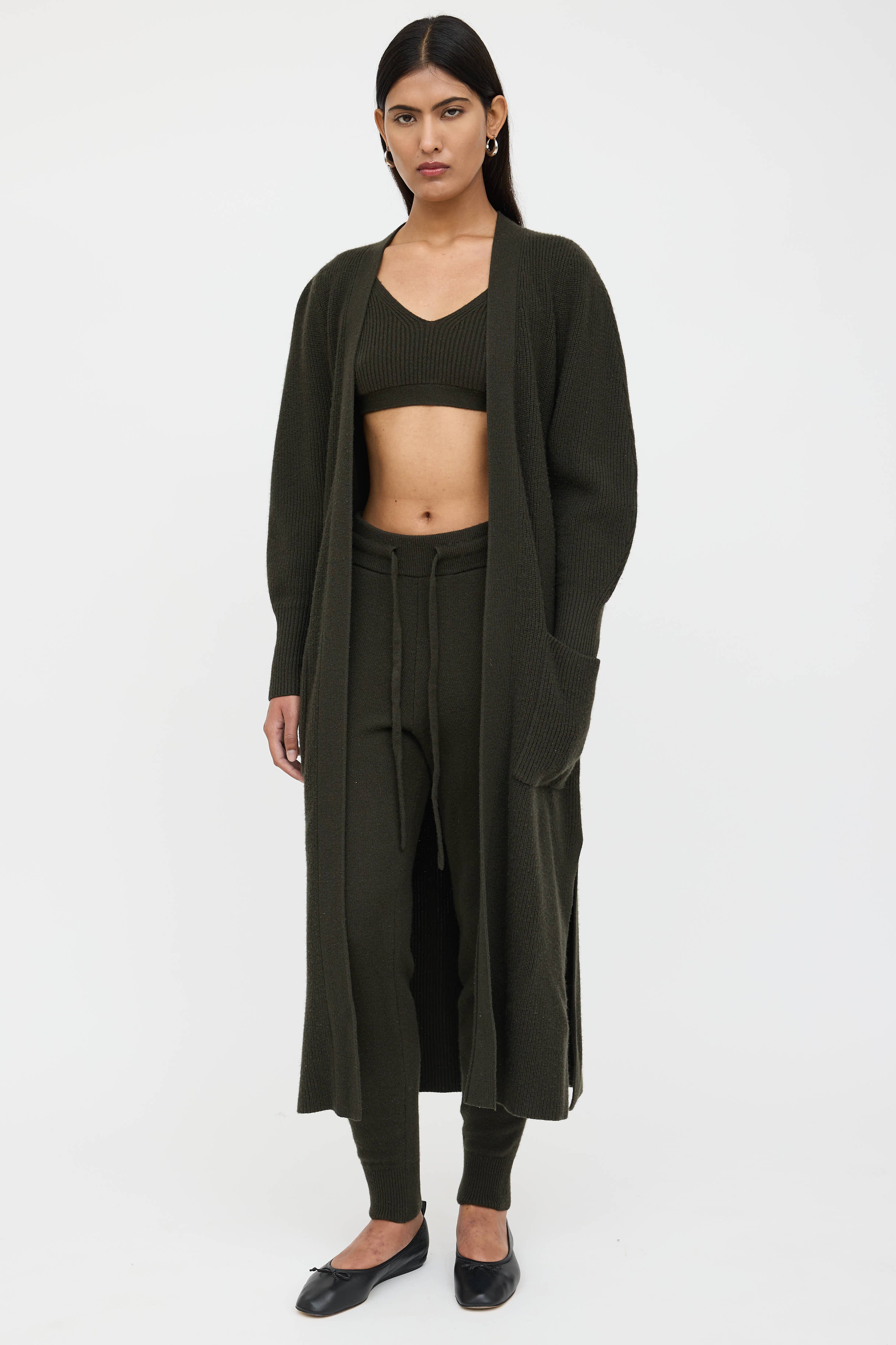 Pre-owned A.L.C. green wool knit bralette featuring a V-neckline, cropped fit, and ribbed detailing. Cardigan features a V-neckline, long sleeves, two patch pockets at hip, tie belt at waist, and open front. Matching trousers feature an elastic drawstring waist, two slip pockets at hip, and ribbed hem.
