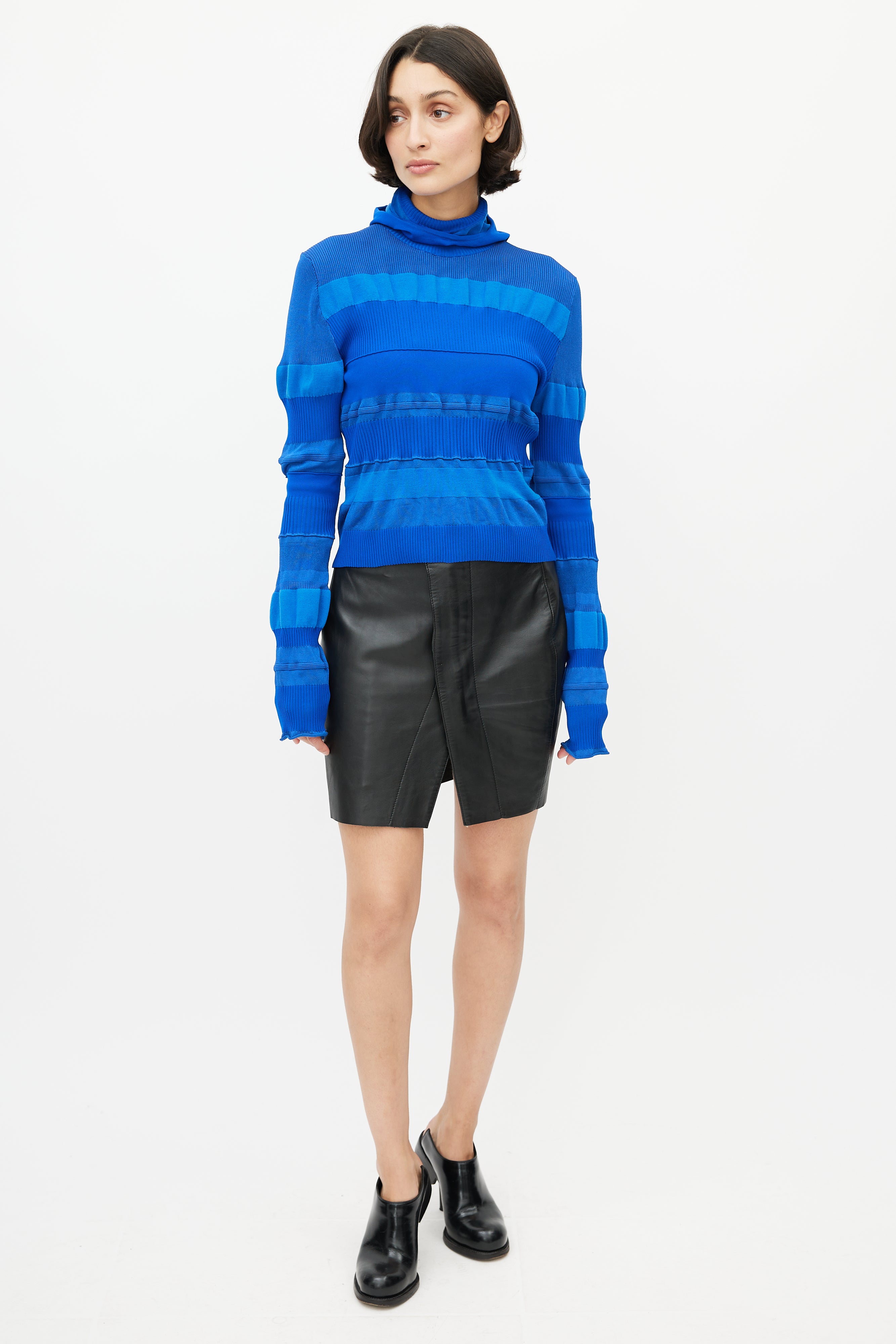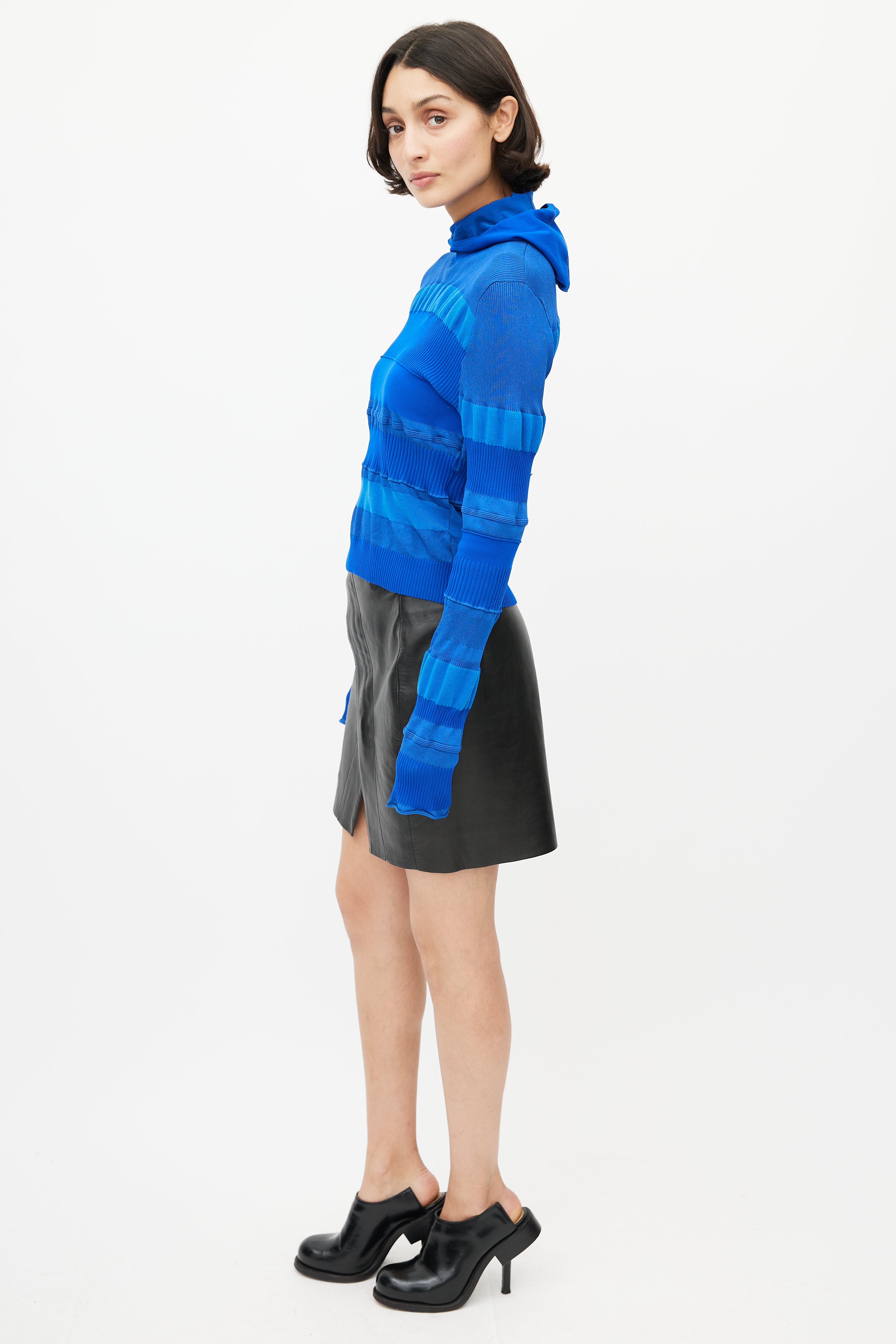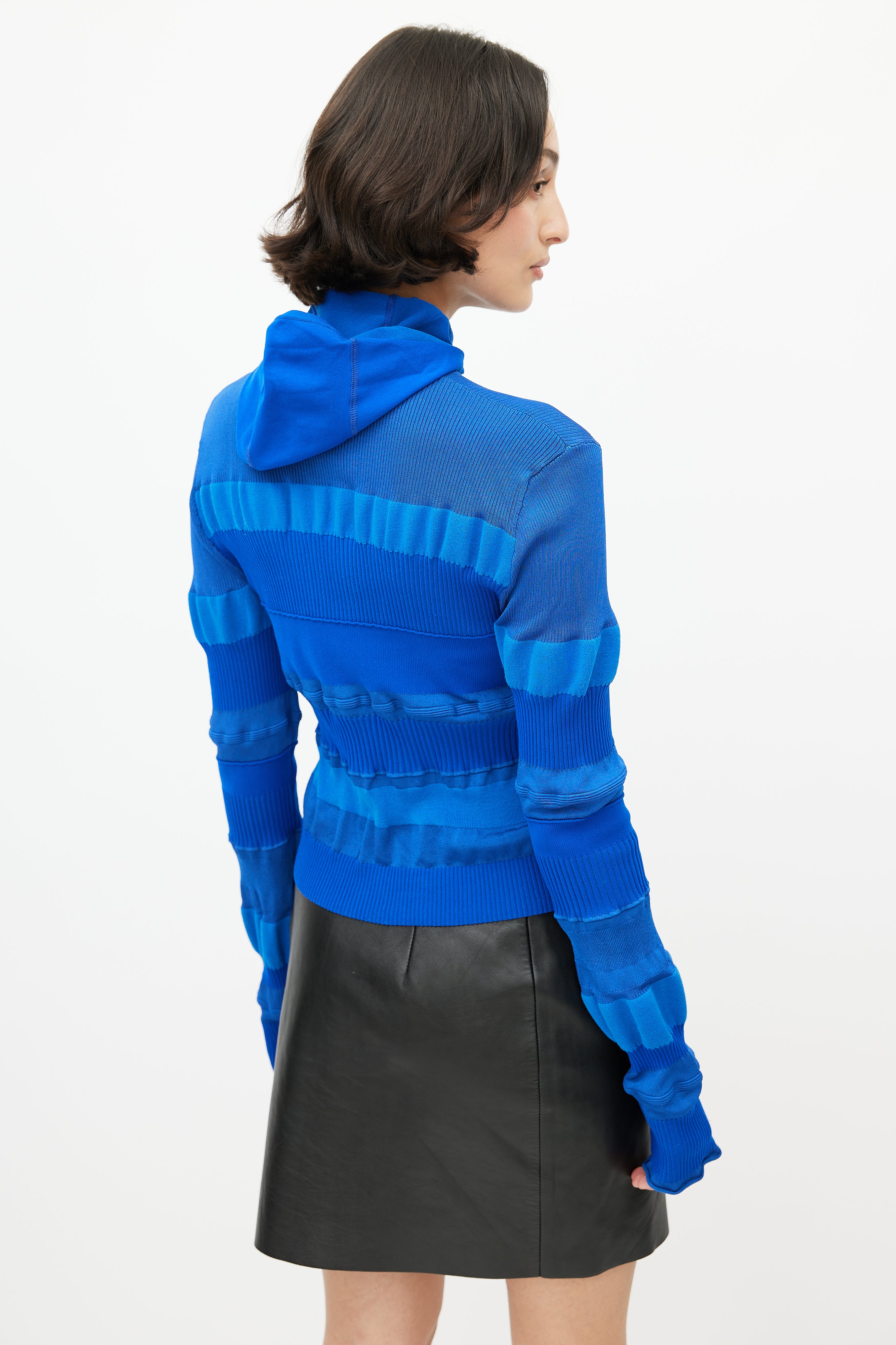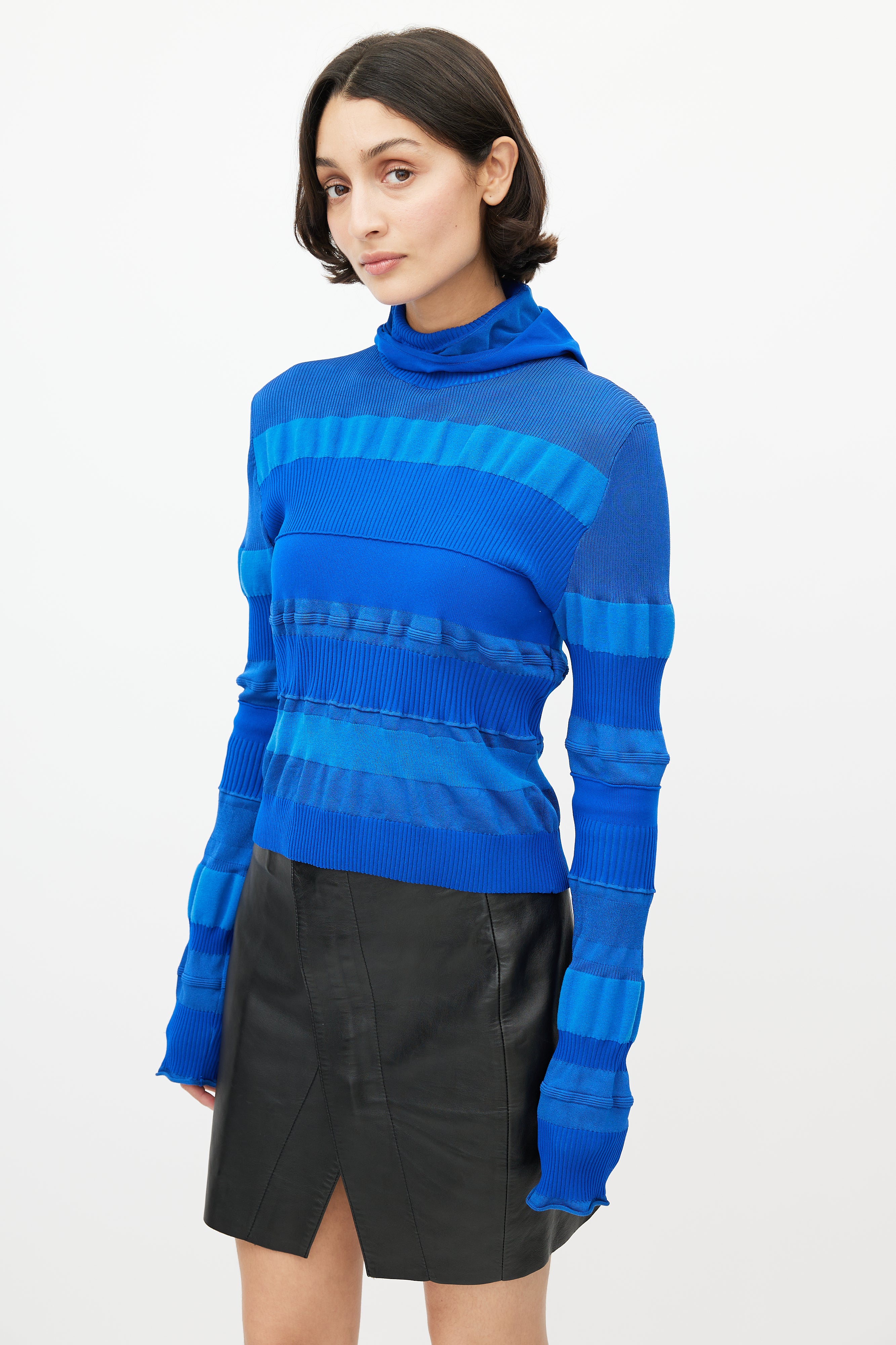 Pre-owned Acne Studios blue knit top featuring a turtleneck, ribbed detailing throughout, and attached hood.