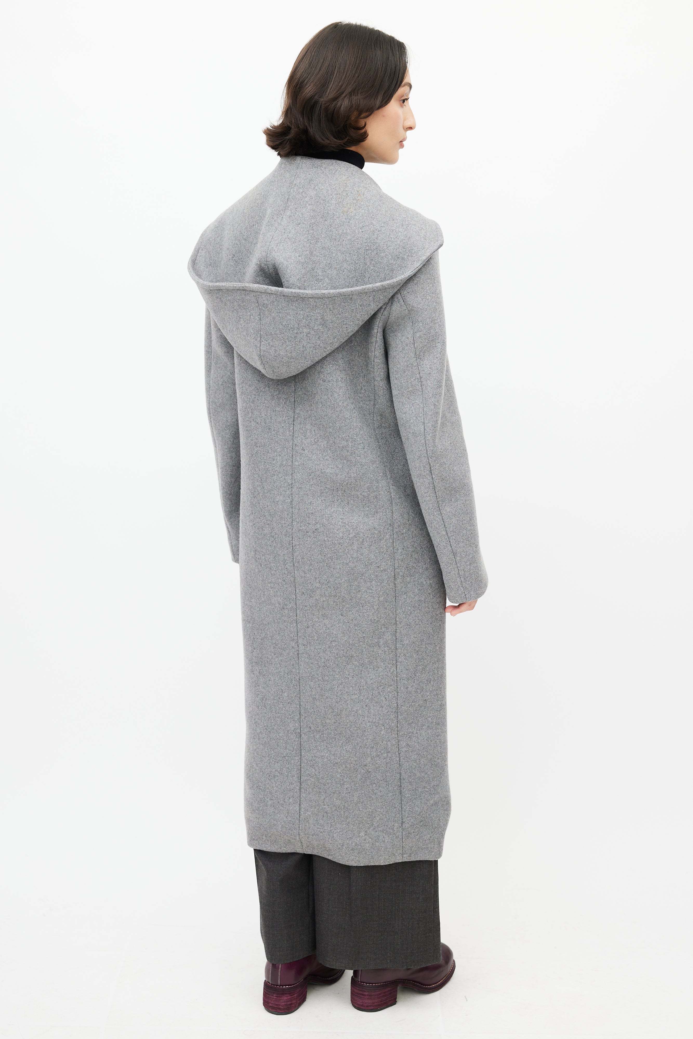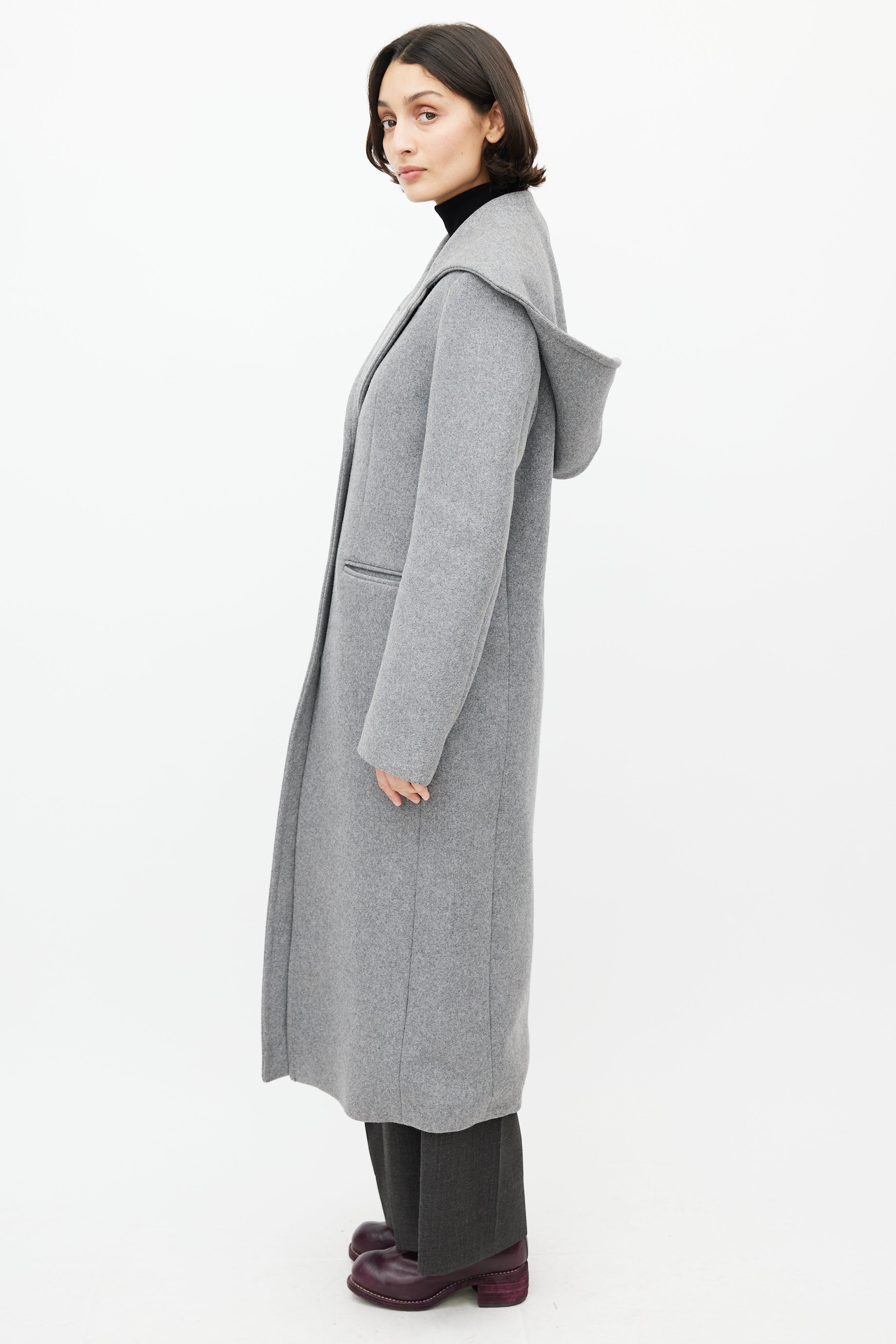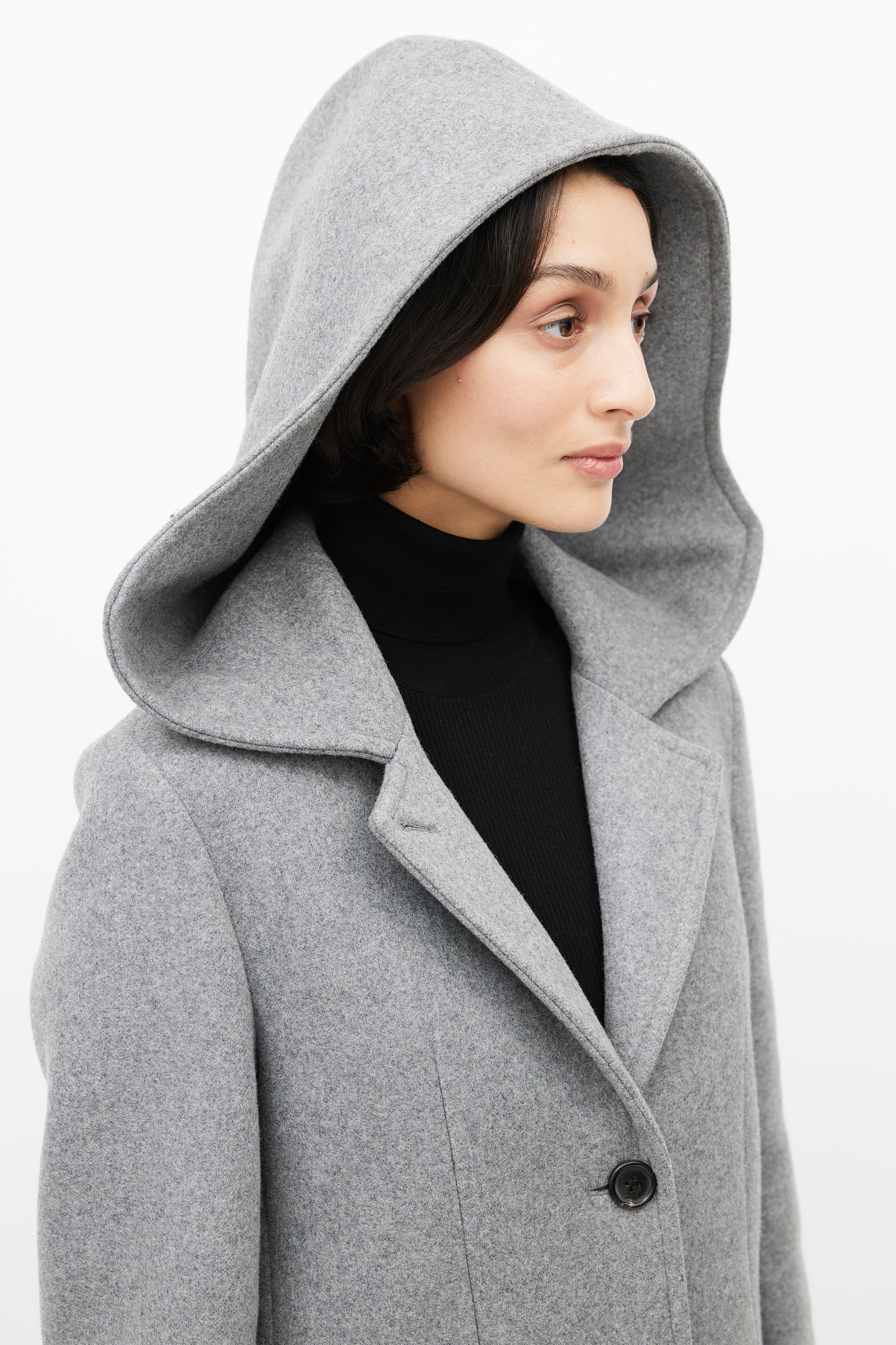 Pre-owned Acne Studios grey wool coat featuring an attached hood, notched lapel, long sleeves with buttoned cuffs, two slip pockets at hip, and button up front. Lined.