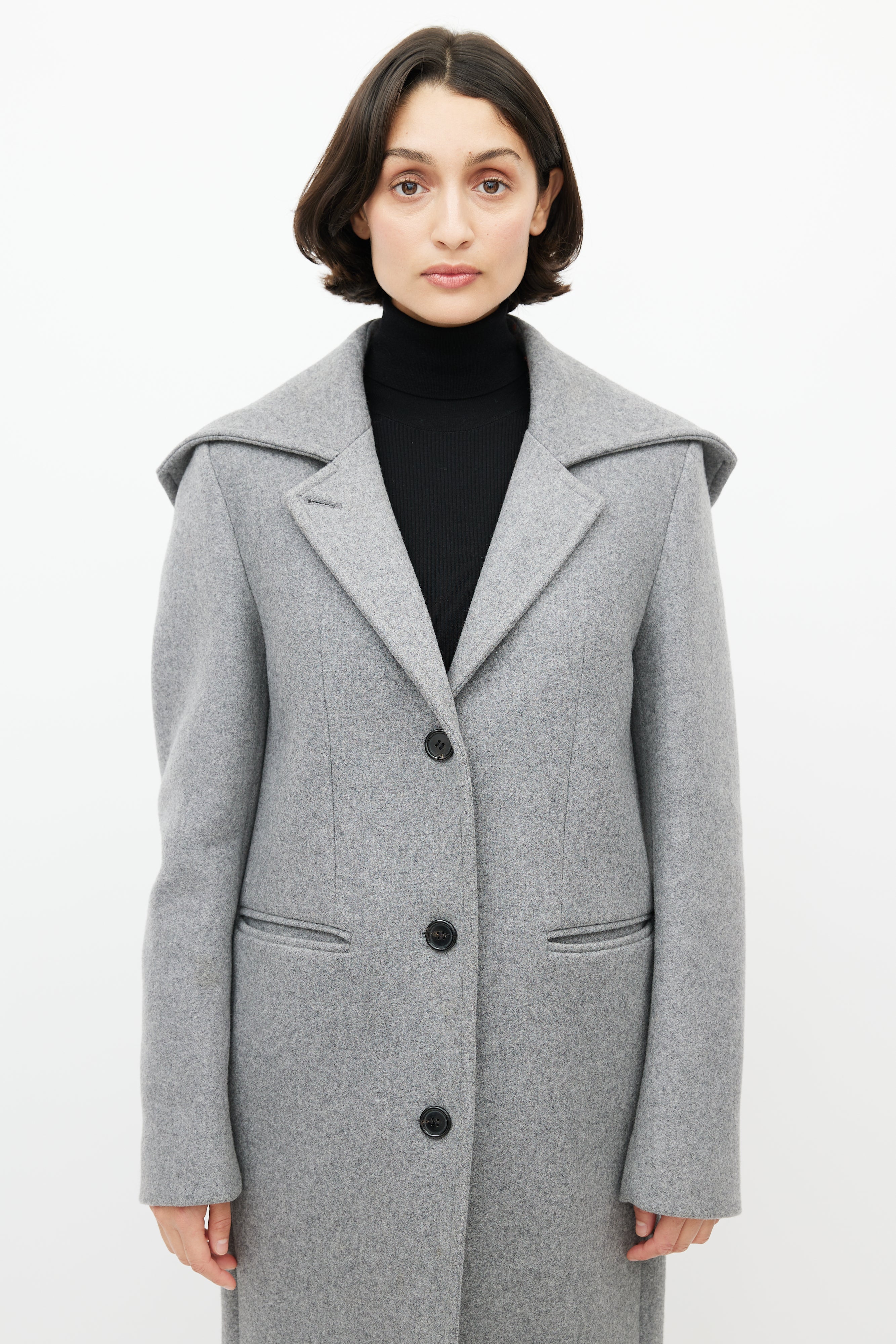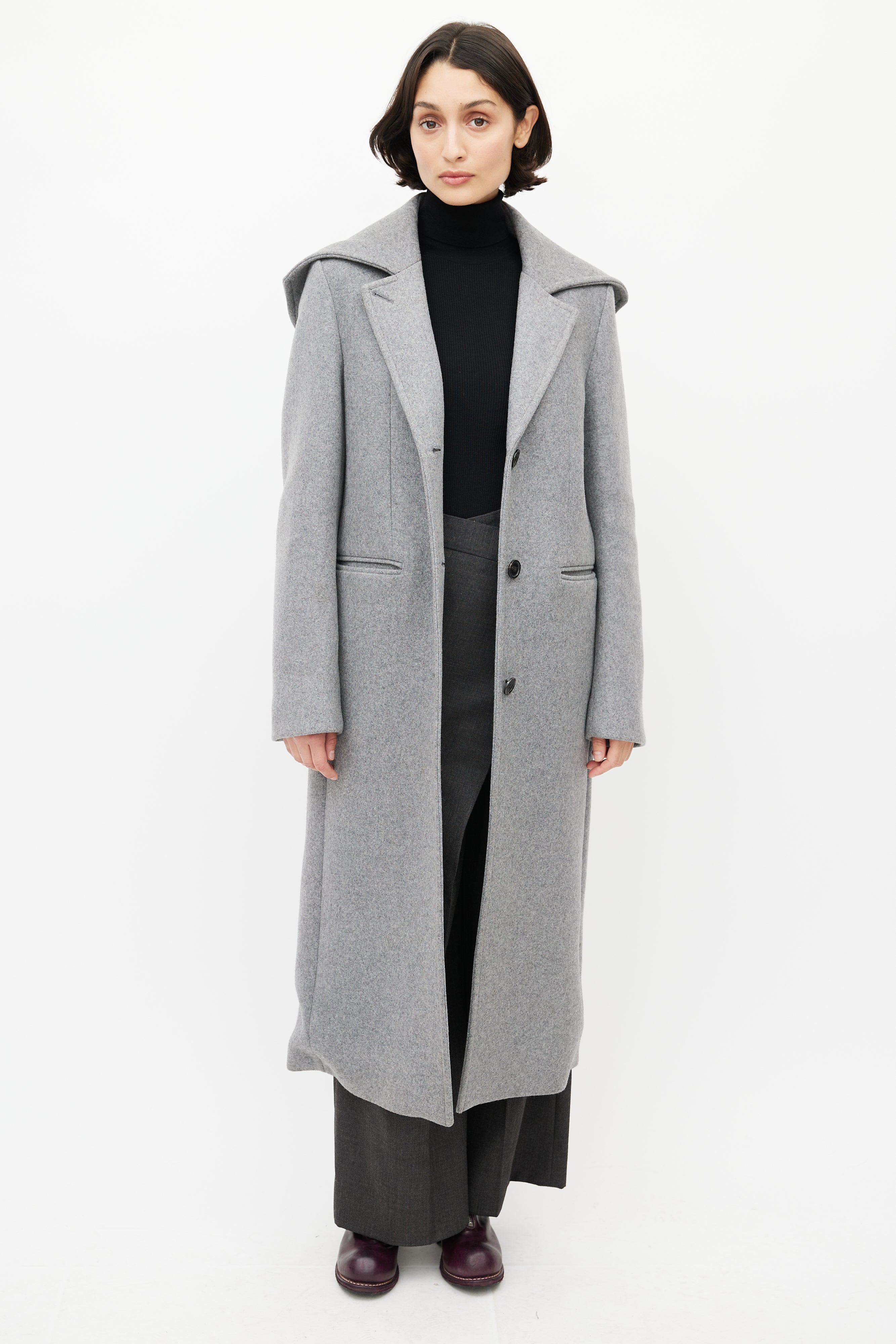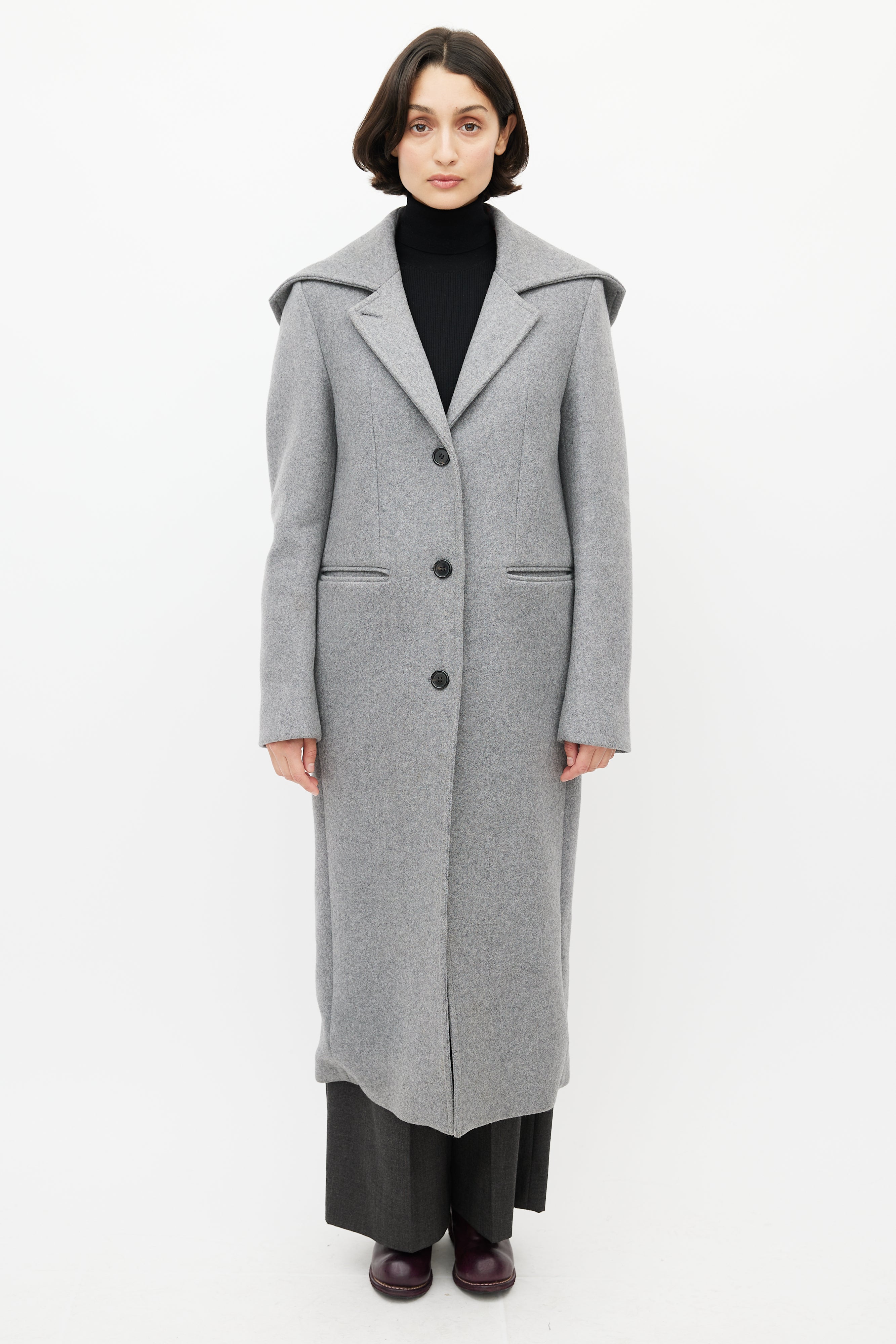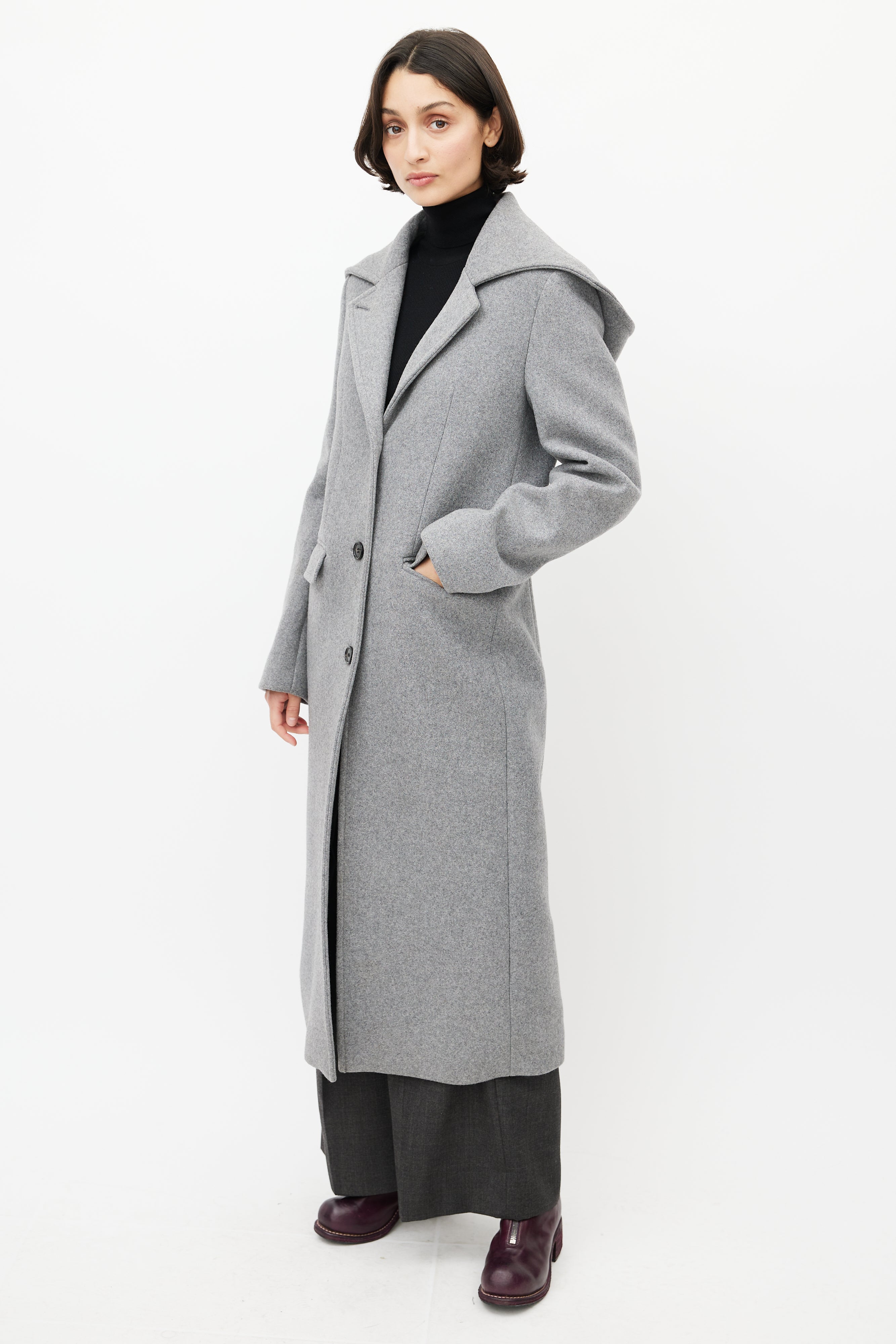 Pre-owned Acne Studios grey wool coat featuring an attached hood, notched lapel, long sleeves with buttoned cuffs, two slip pockets at hip, and button up front. Lined.