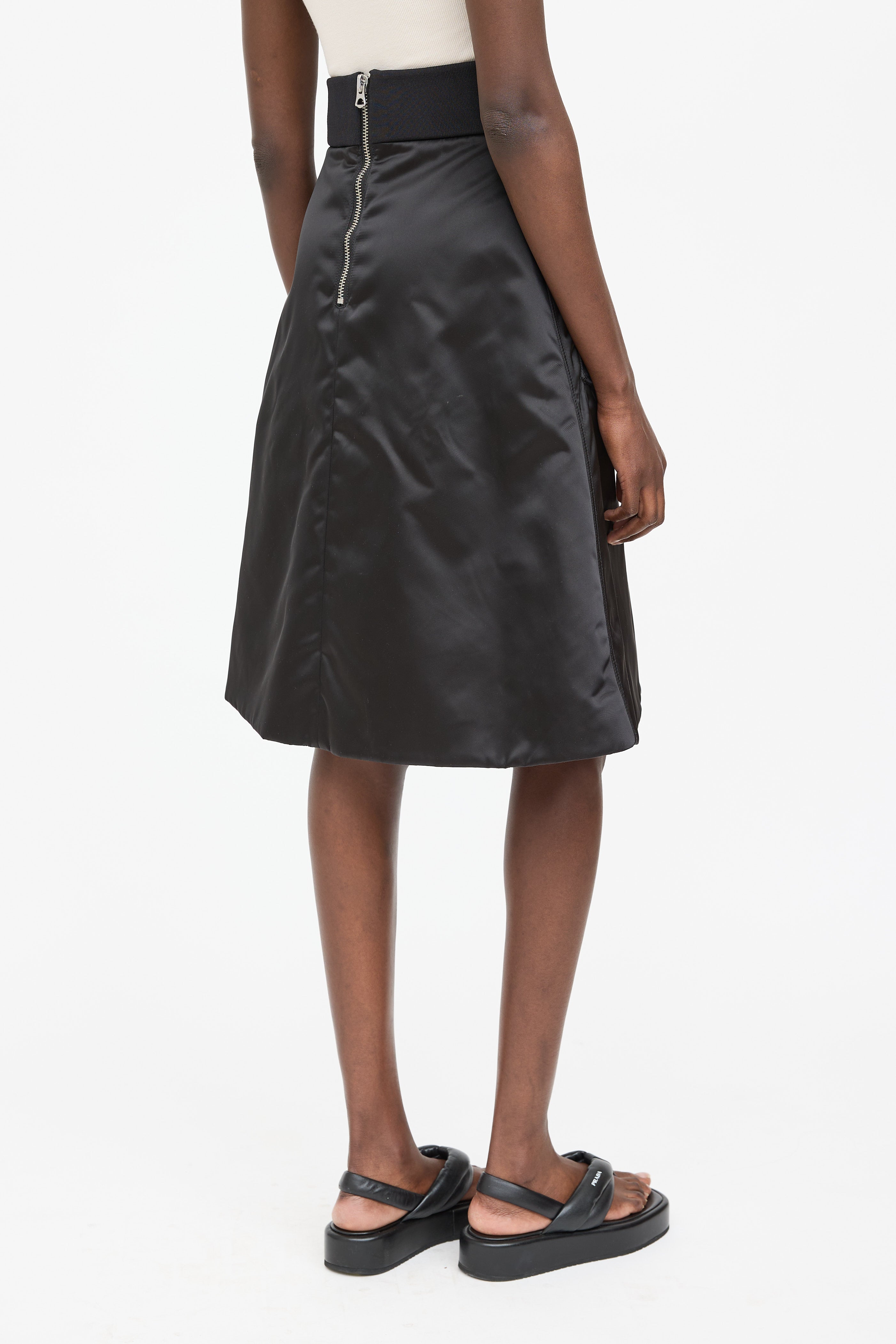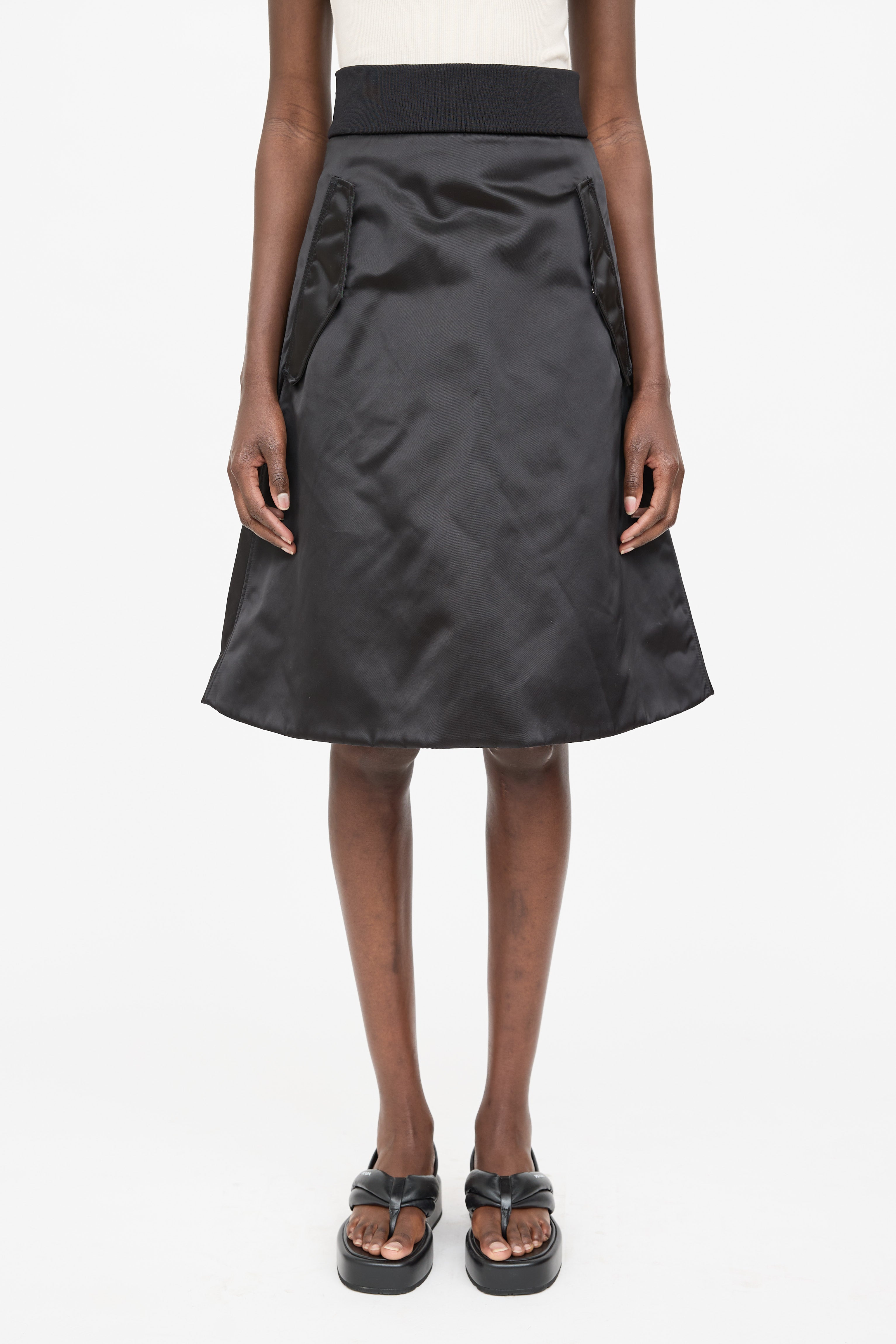 Pre-owned Acne Studios black nylon Pag bomber skirt featuring a-line styling, ribbed waistband, snap flap pockets at side, and exposed zip at back. Lined.