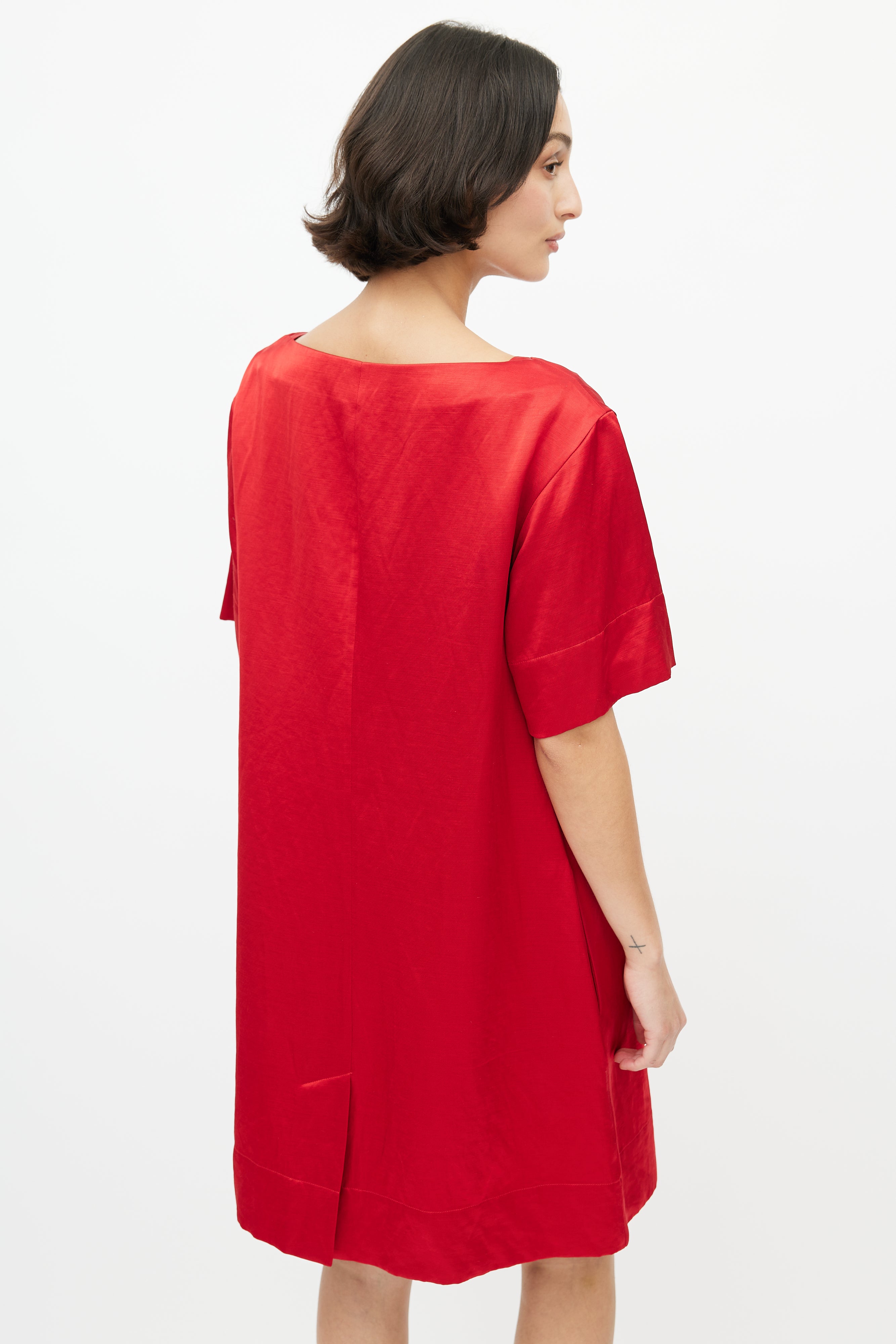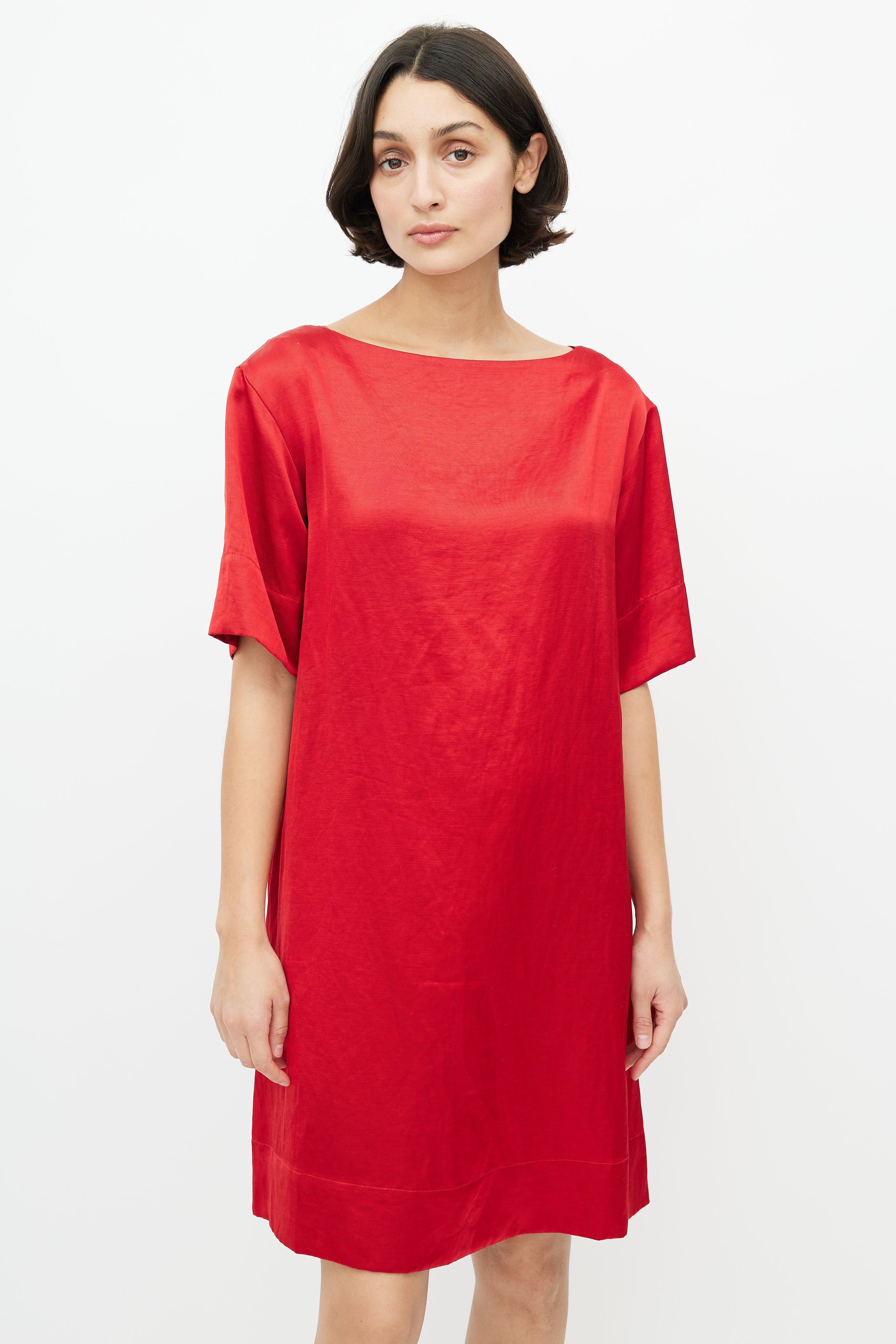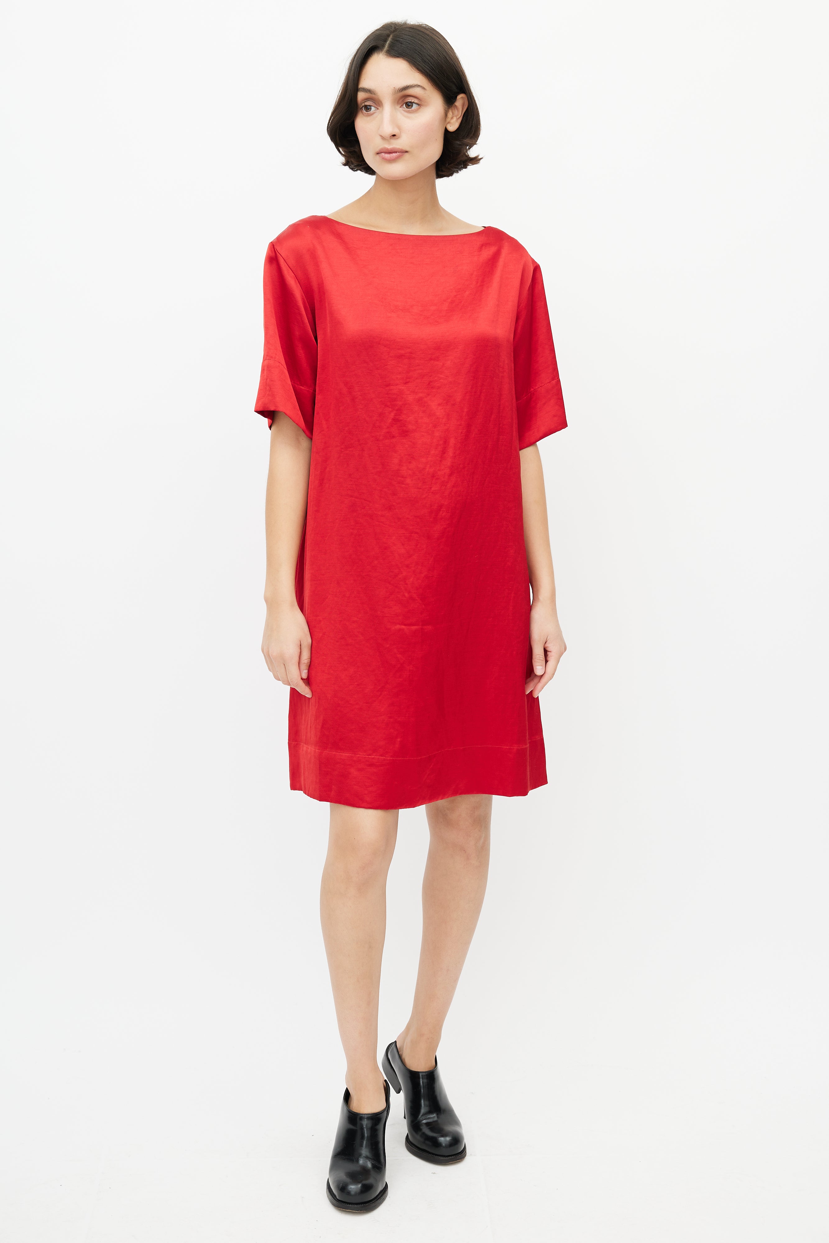 Pre-owned Acne Studios red satin shift dress featuring a bateau neckline, short sleeves, and two slip pockets at hip. Lined.
