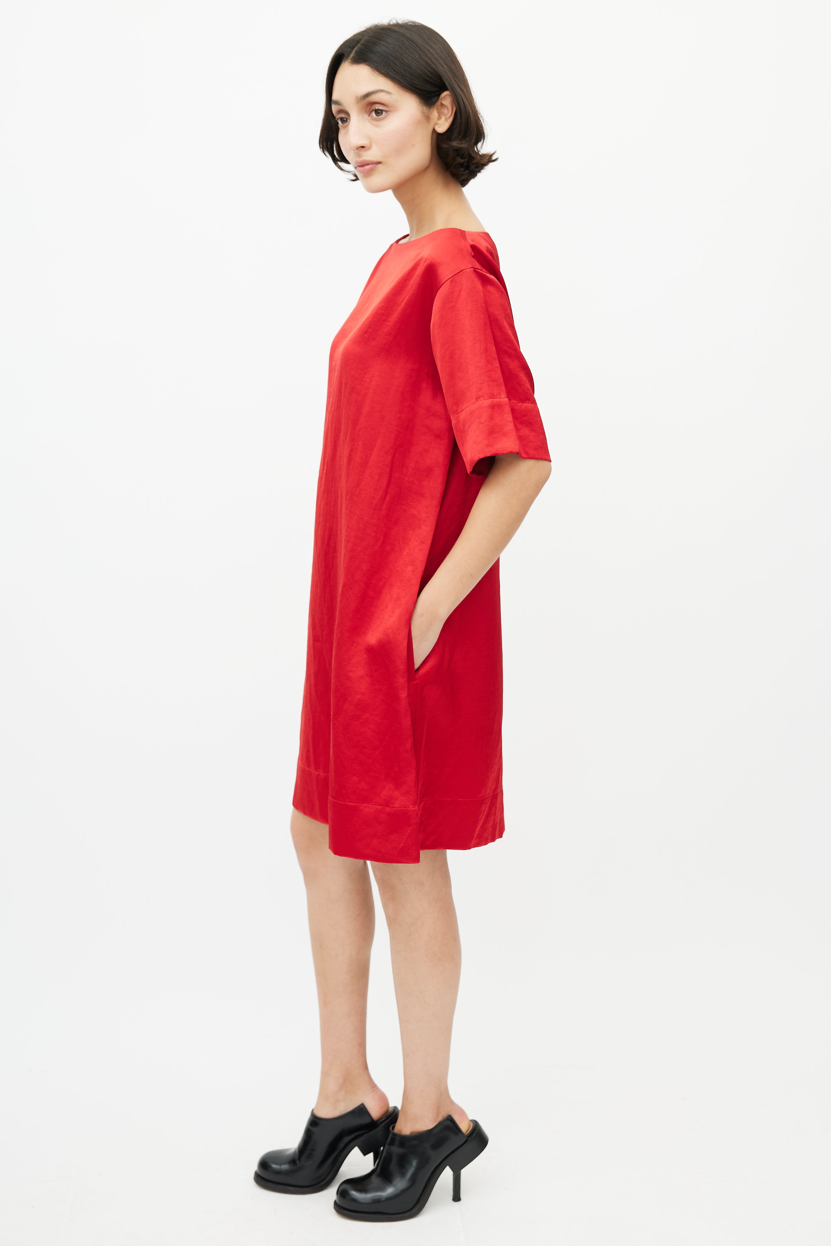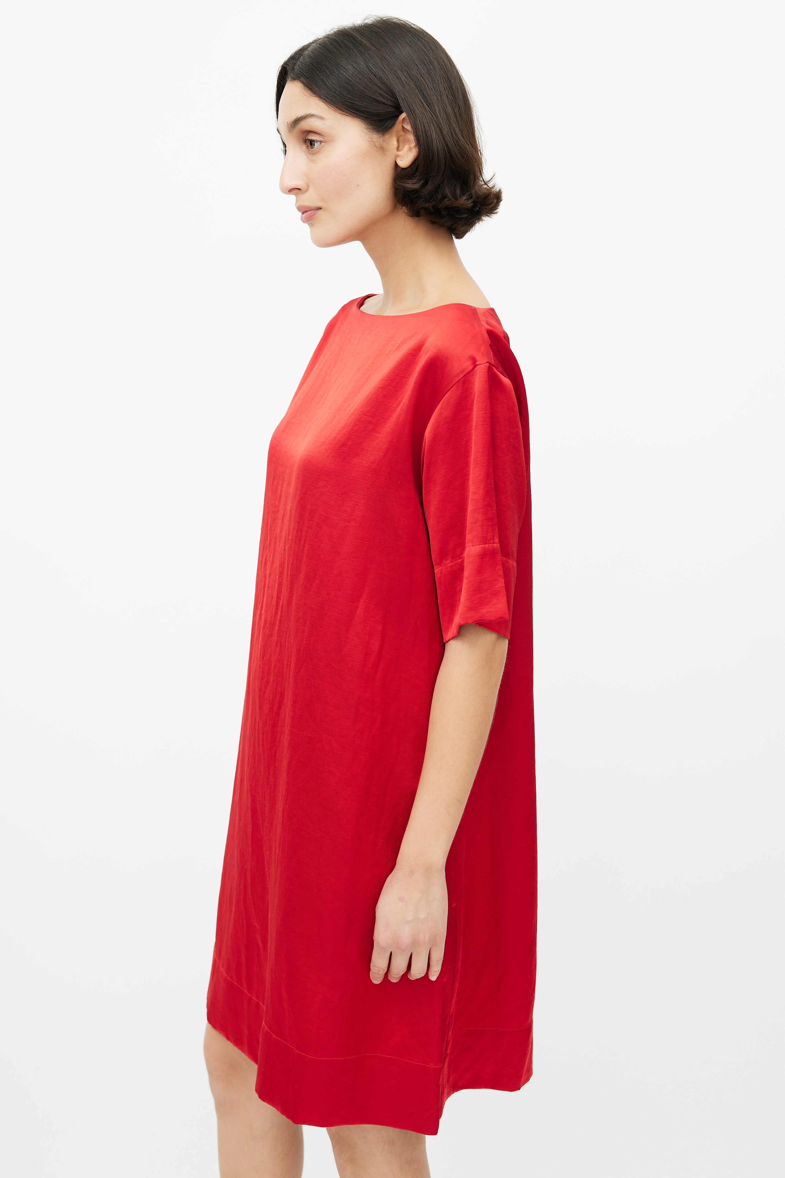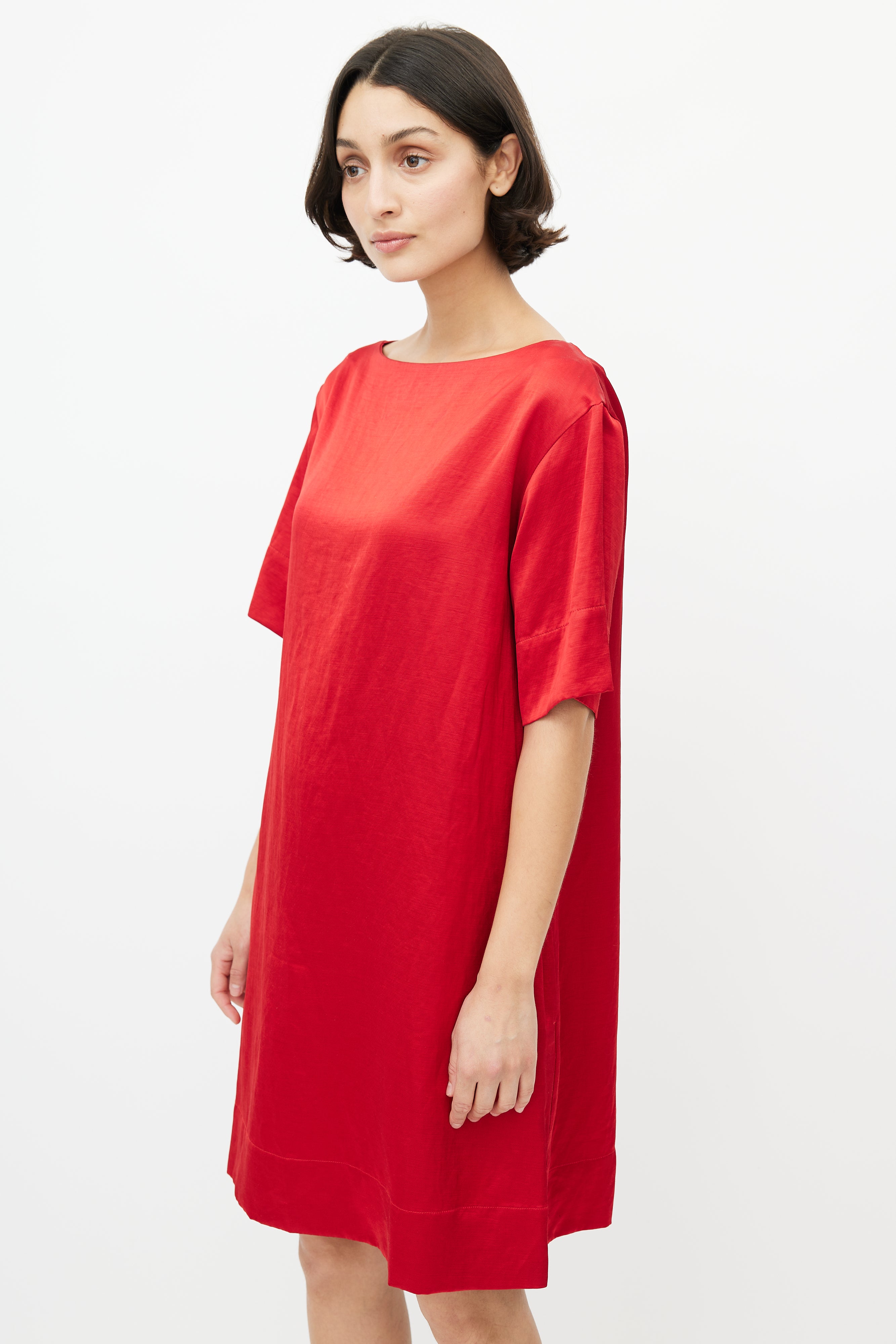 Pre-owned Acne Studios red satin shift dress featuring a bateau neckline, short sleeves, and two slip pockets at hip. Lined.