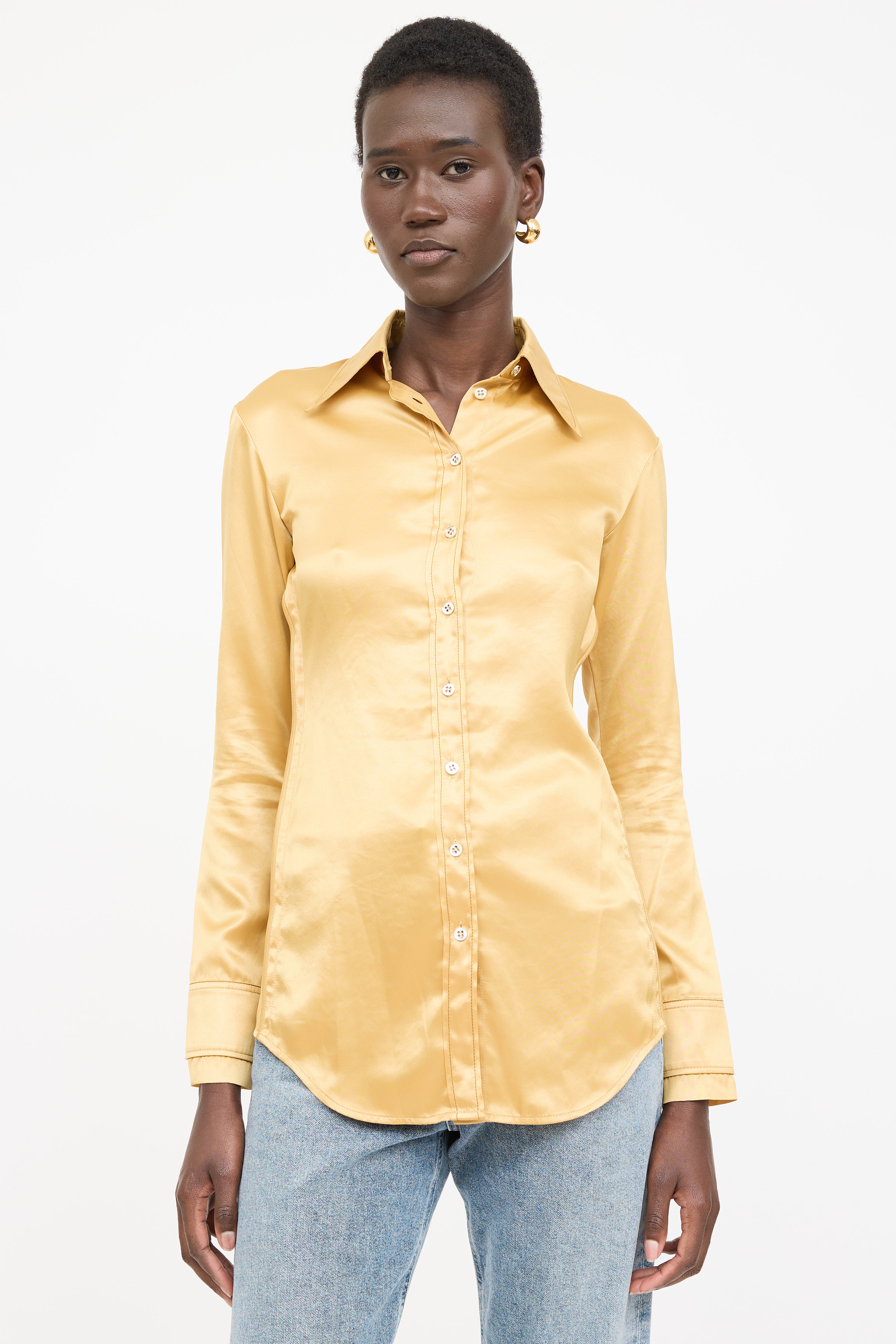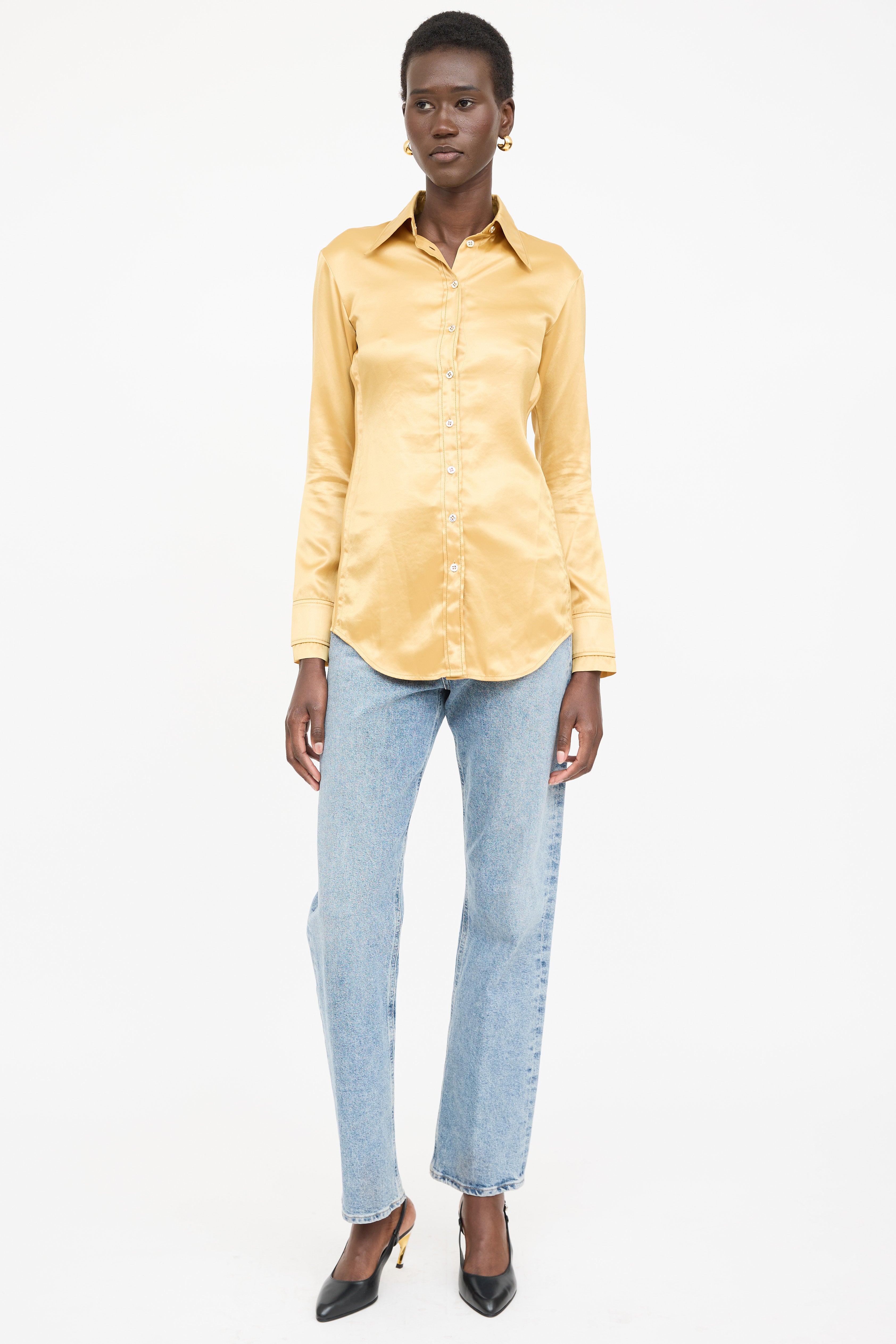 Pre-owned Acne Studios yellow stain button up top featuring pointed collar, silver button front, contrast stitching, and paneled button cuffs.