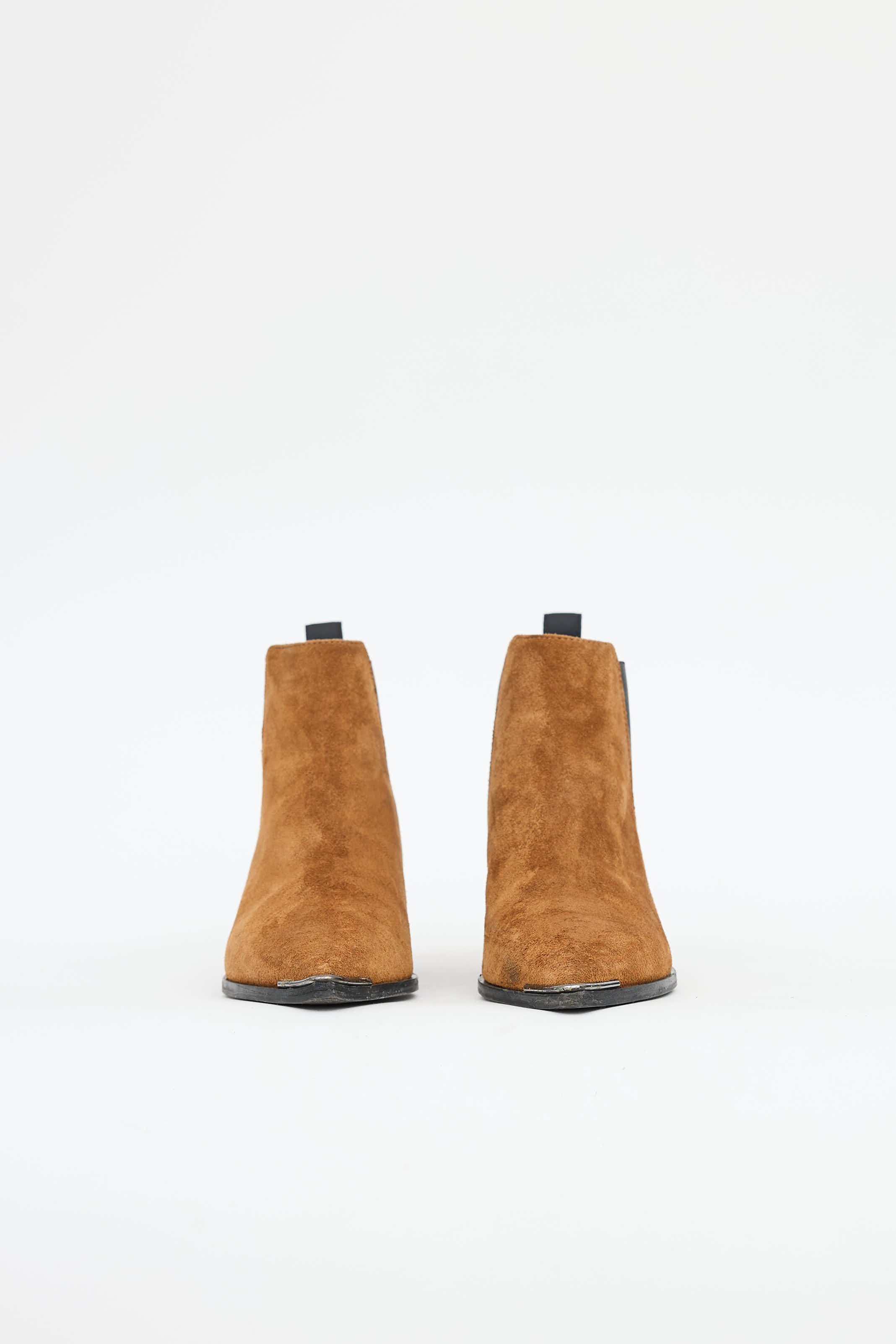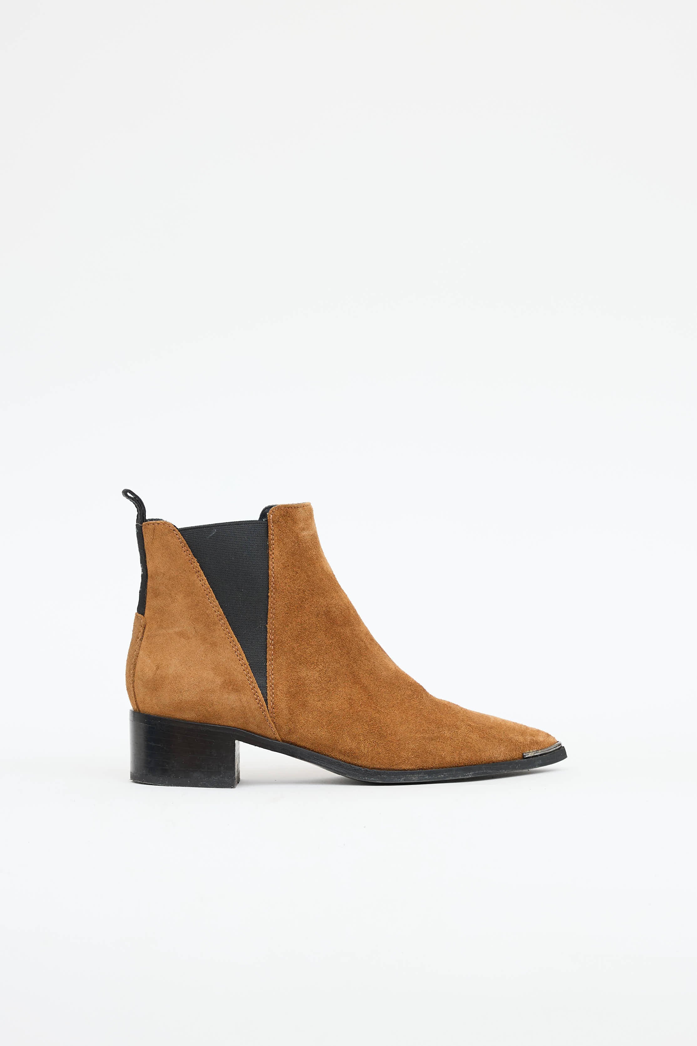 Pre-owned Acne Studios brown suede Jensen boots featuring pointed toe, gun metal hardware at toe, stacked heel, elasticized gore at sides, and logo pull tab at counter.