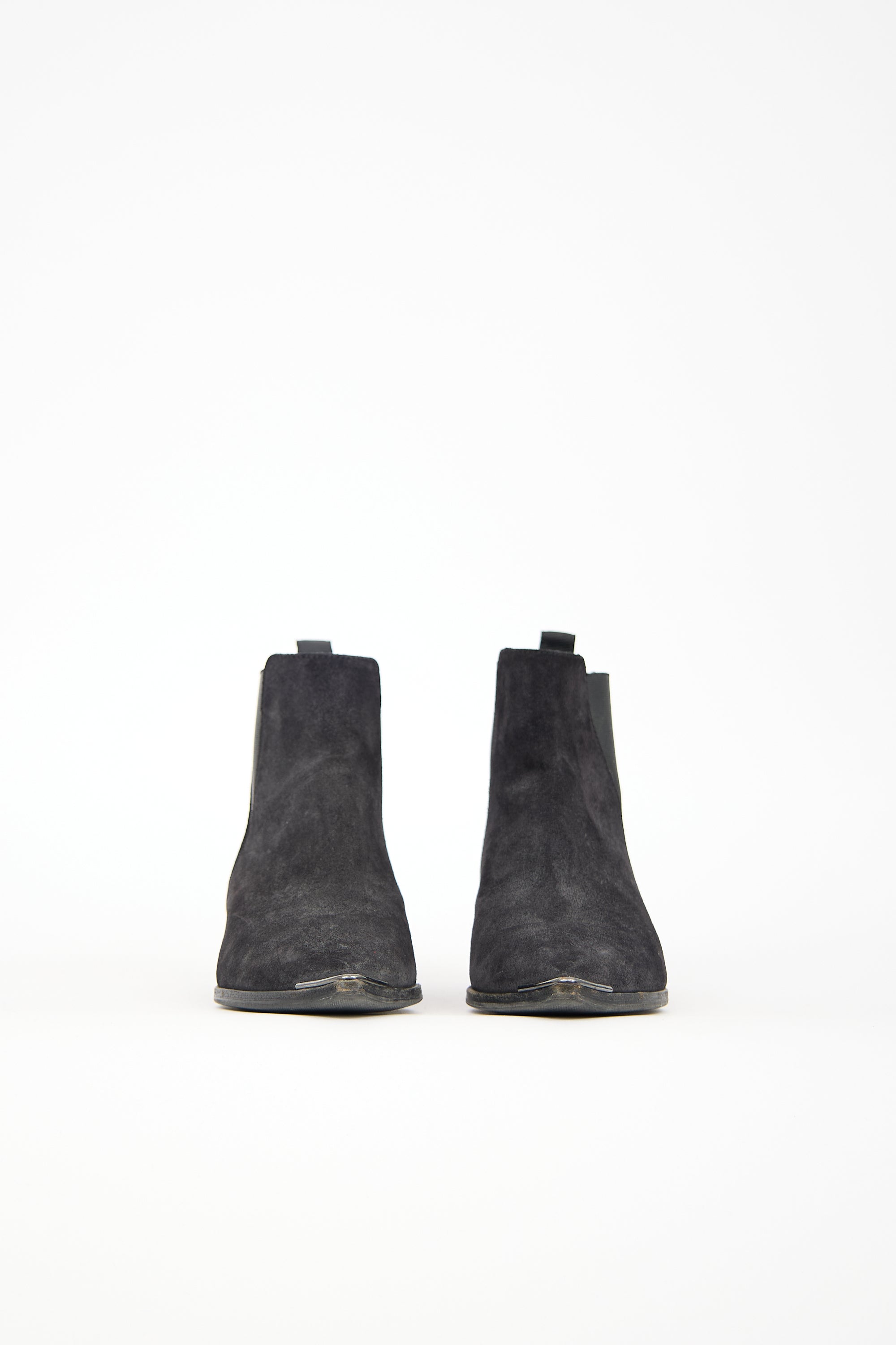 Pre-owned Acne Studios black suede Jensen boots featuring pointed toe, gun metal toe accent, elasticized side panels, logo pull tab at counter, and block heel.
