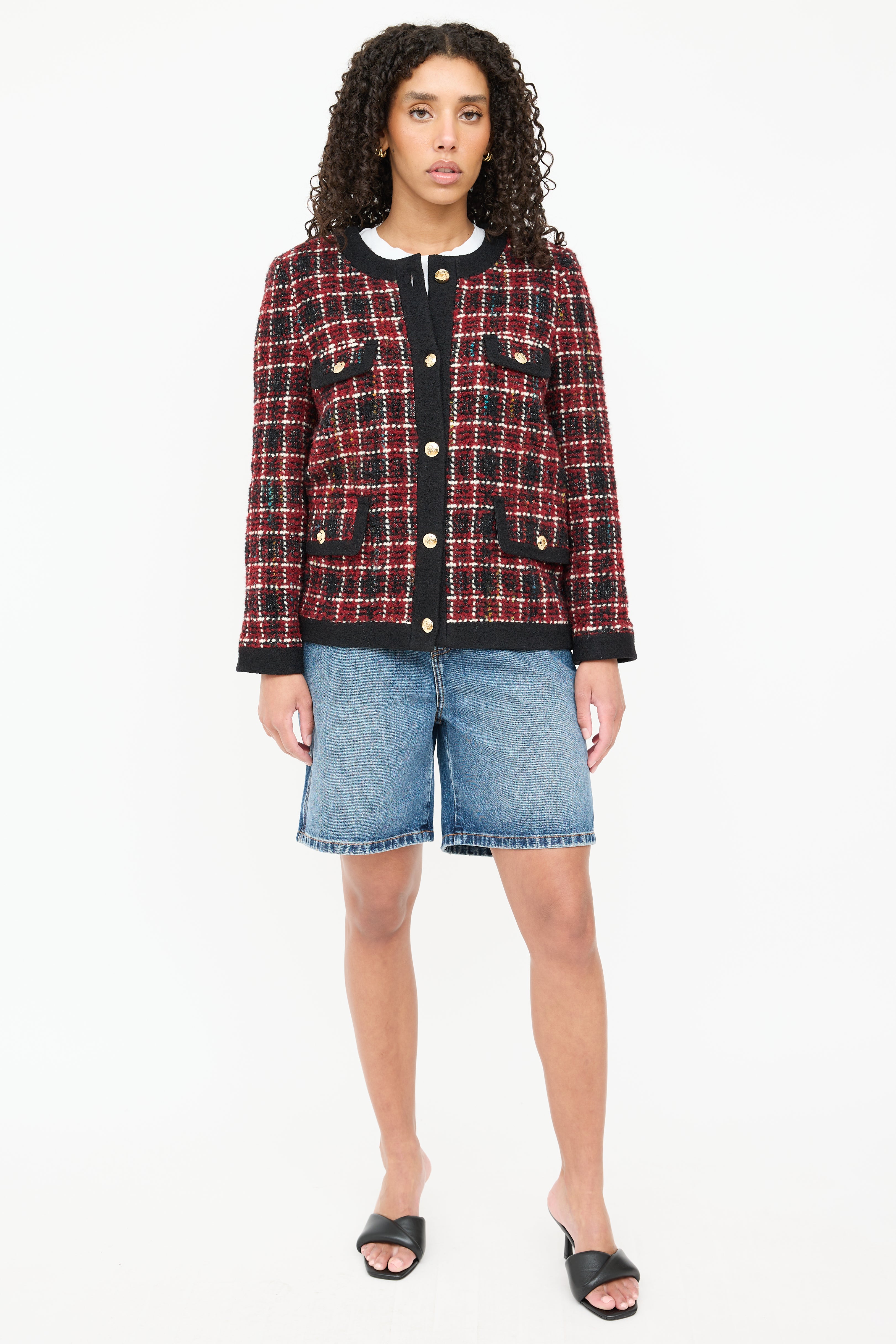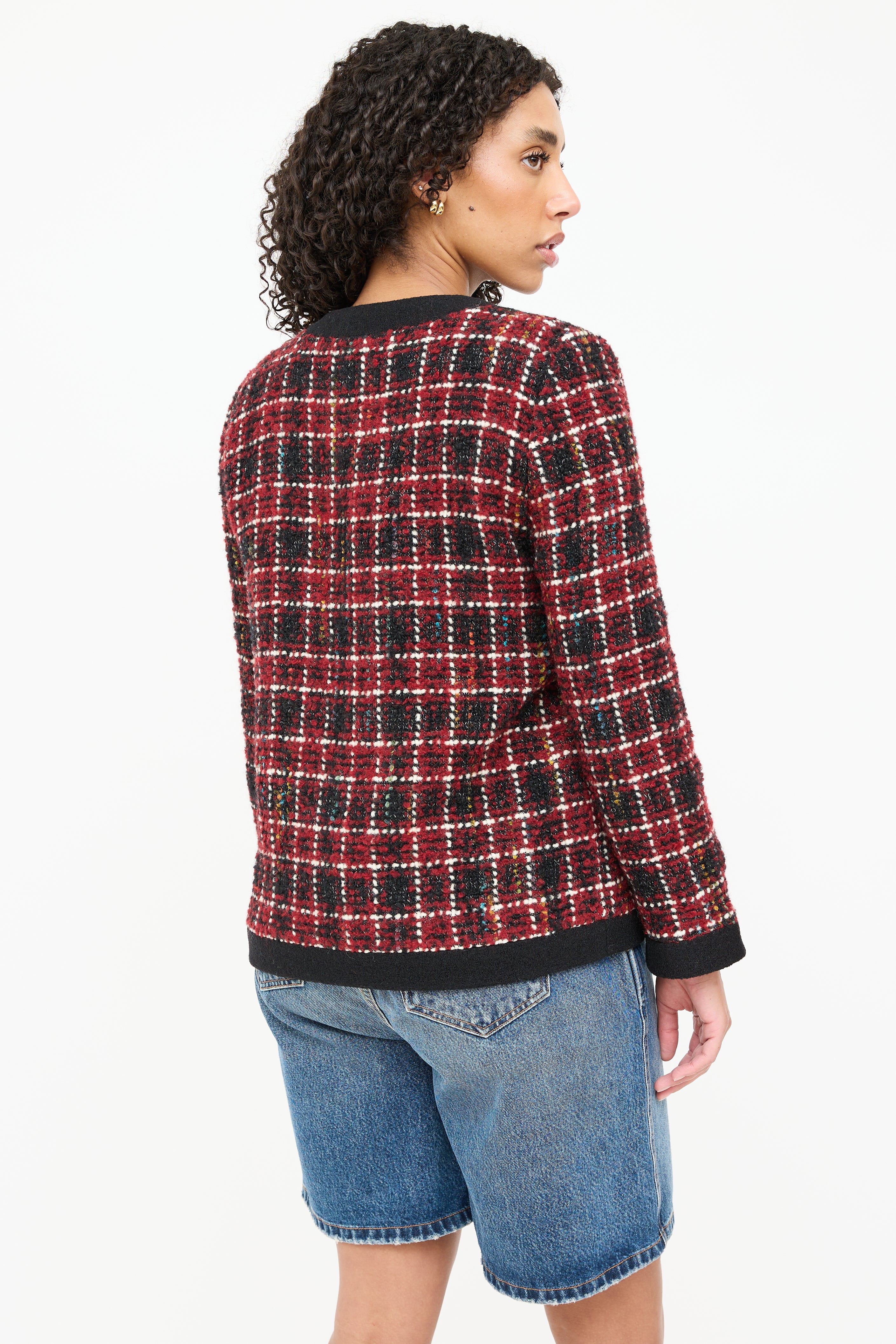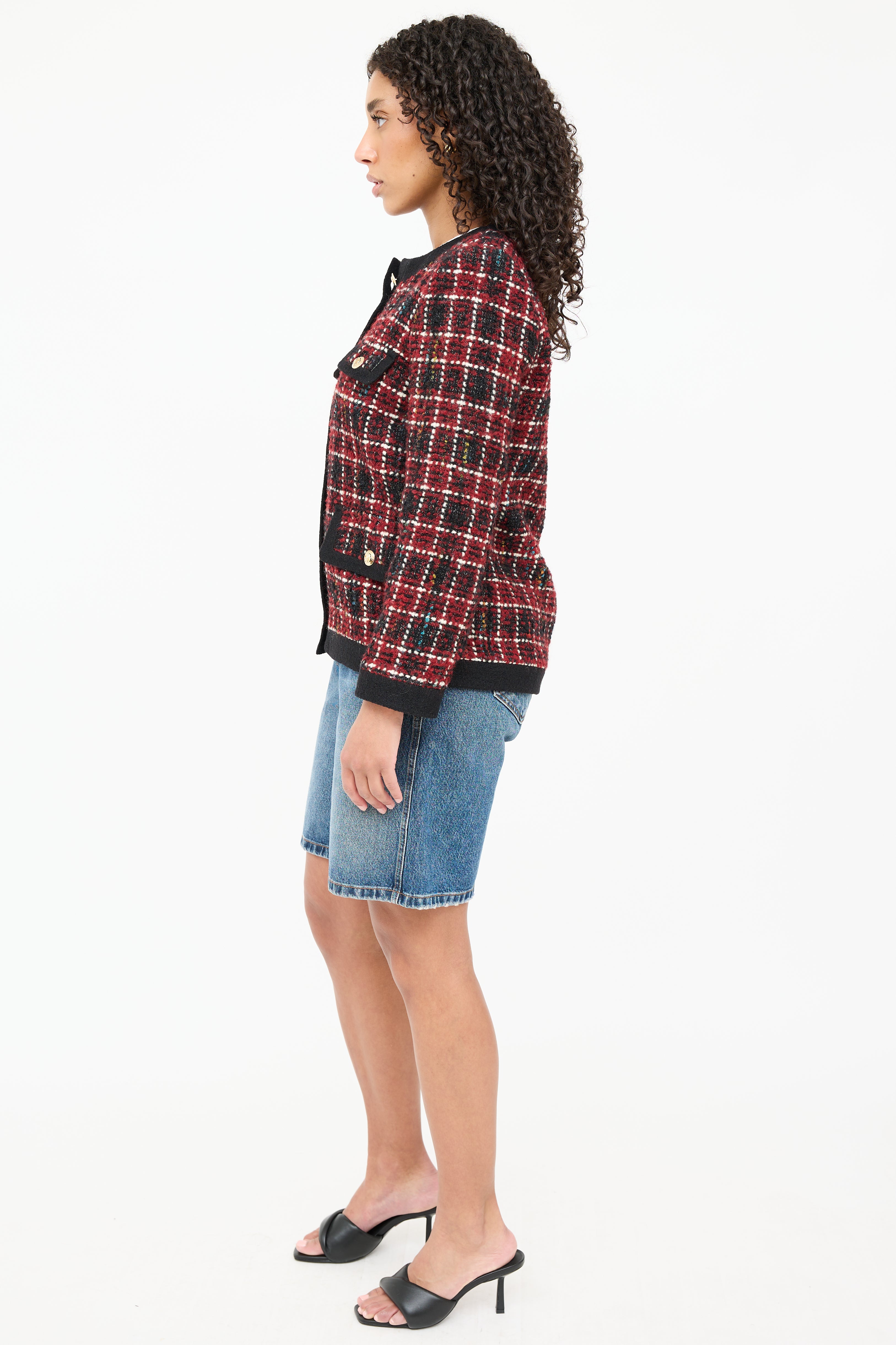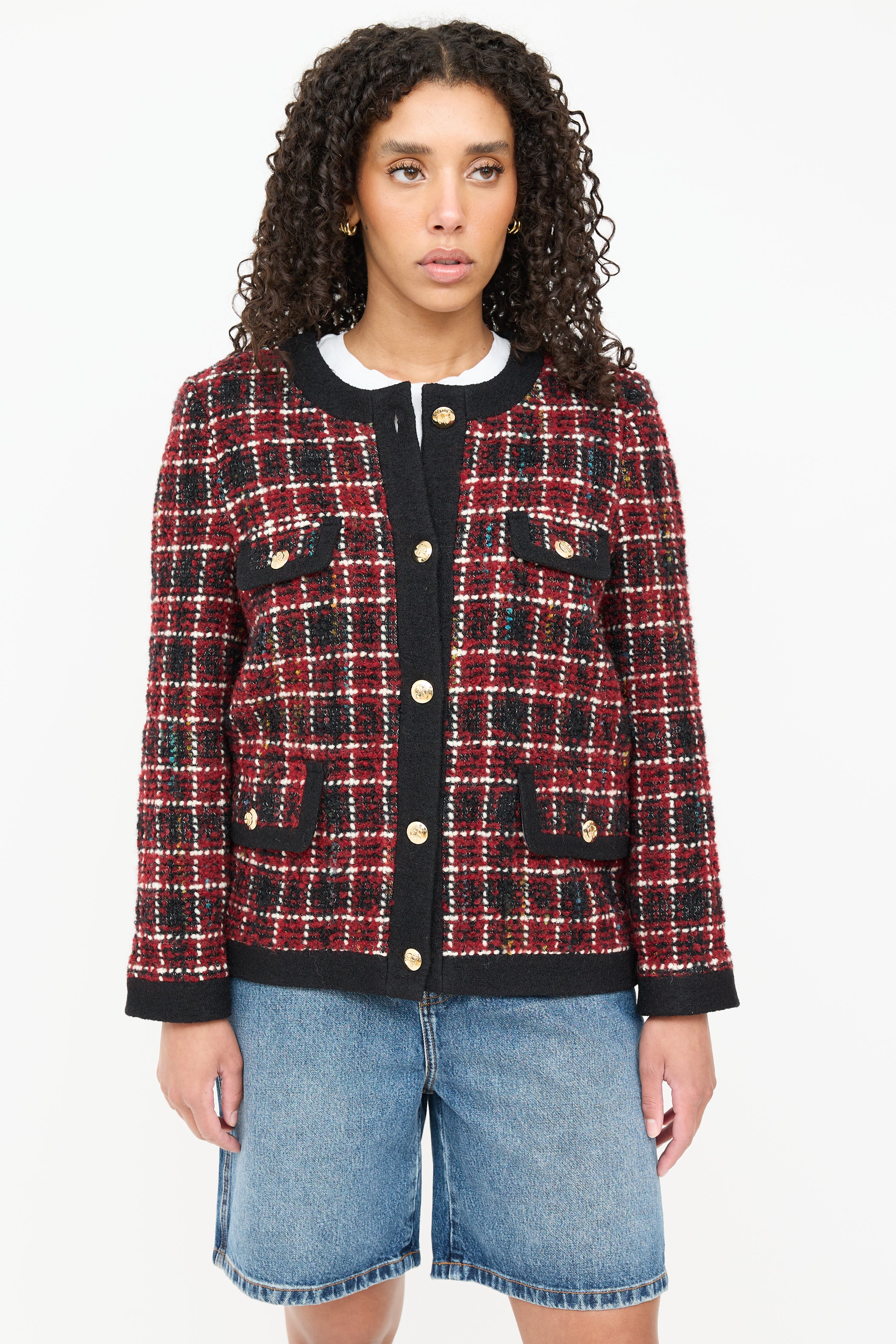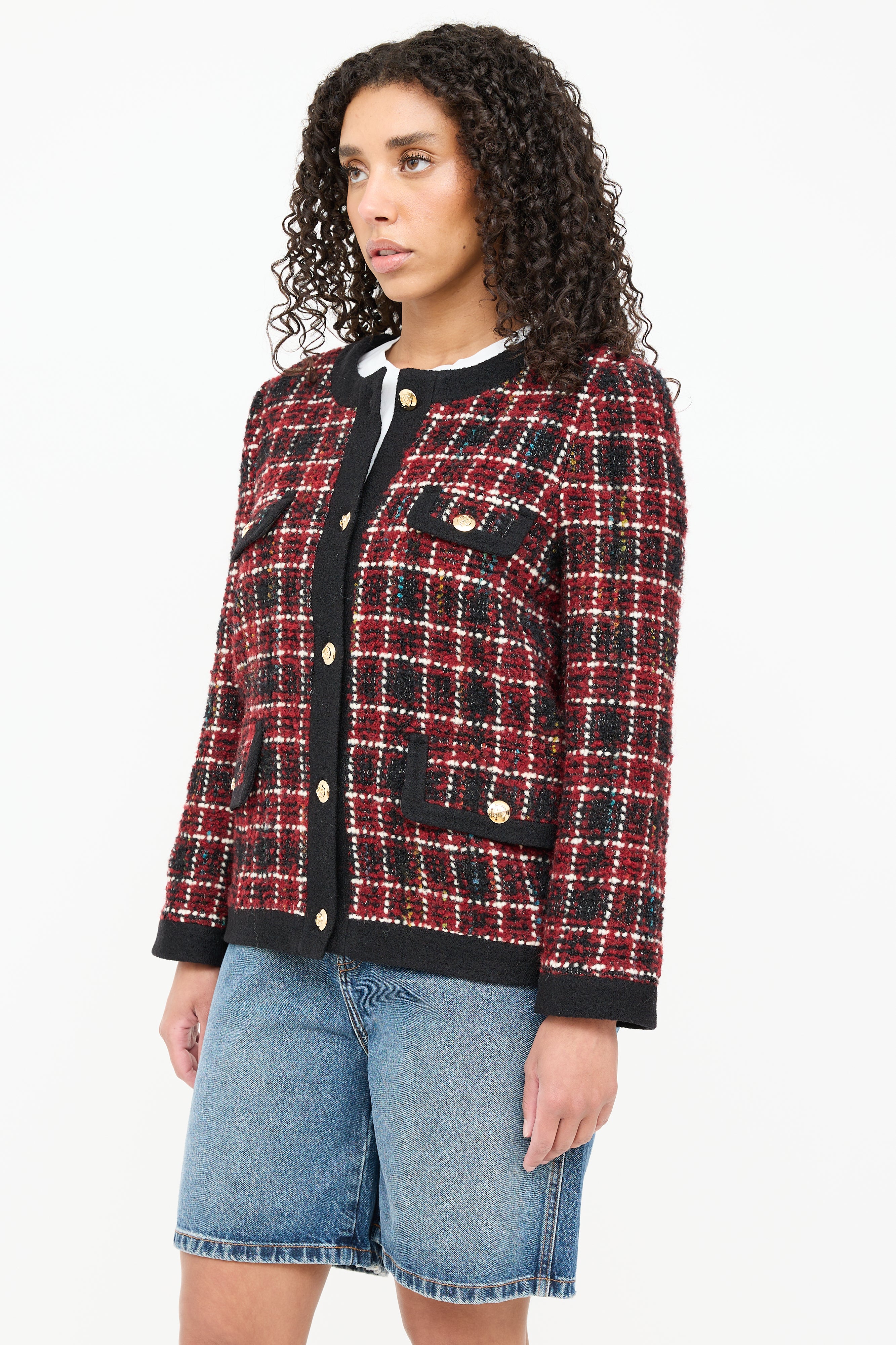 Pre-owned Anine Bing black Lydia wool tweed jacket featuring a red plaid pattern throughout, round neckline, long sleeves, two flap pockets at chest, two flap pockets at hip, and button up closure. Lined.
