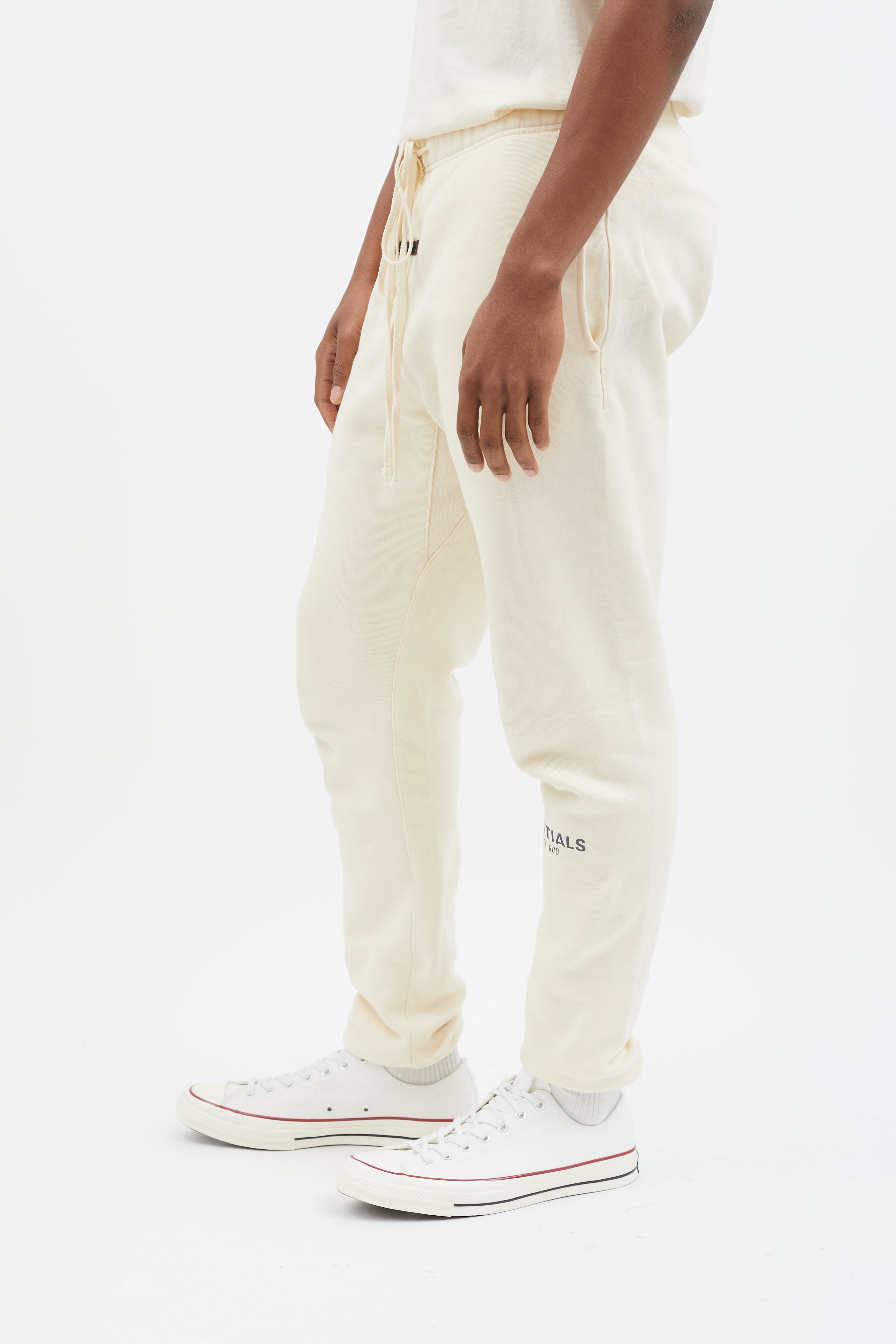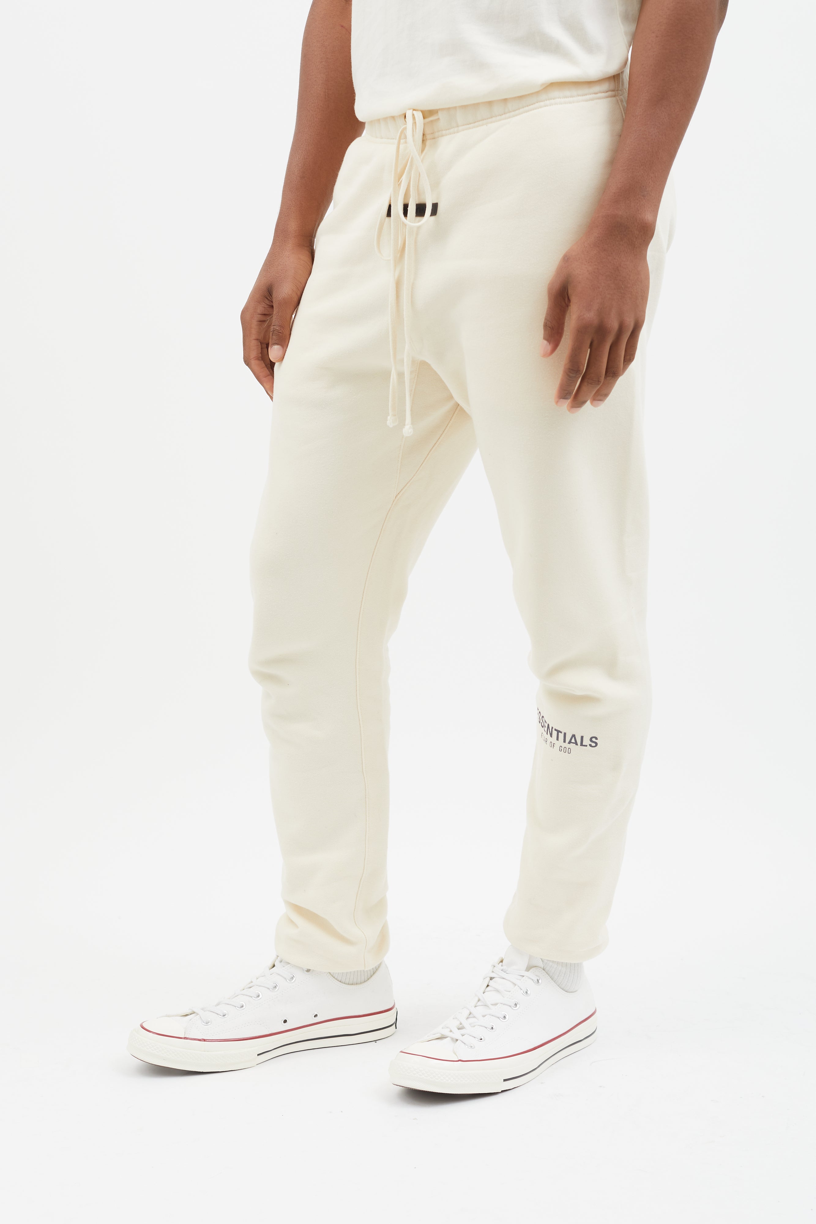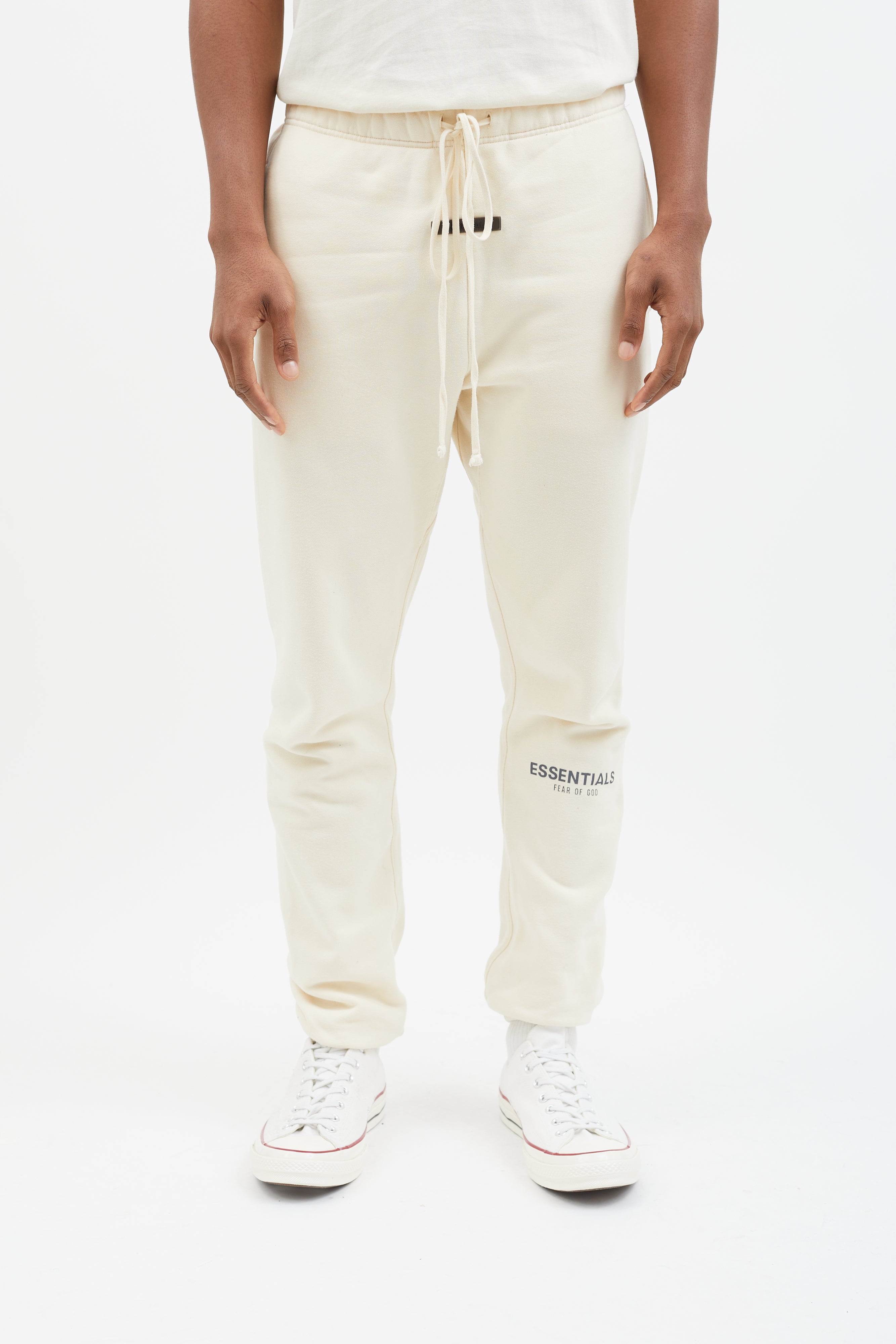 Pre-owned Essentials lounge pants in cream featuring elasticized waistband with oversized drawstring, logo rubber patch at front, three pockets styling, elasticized cuff, and grey stamped logo at left leg.