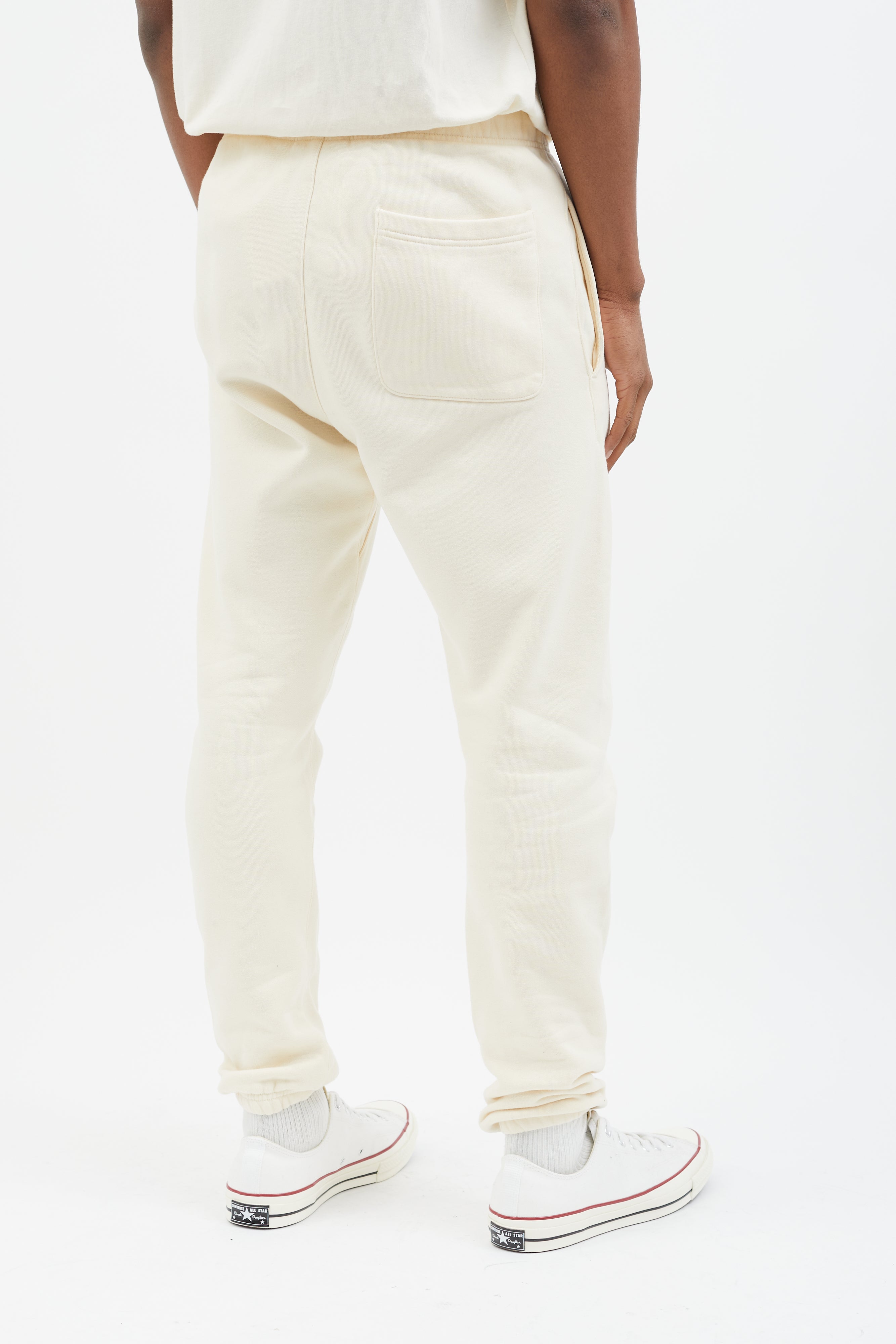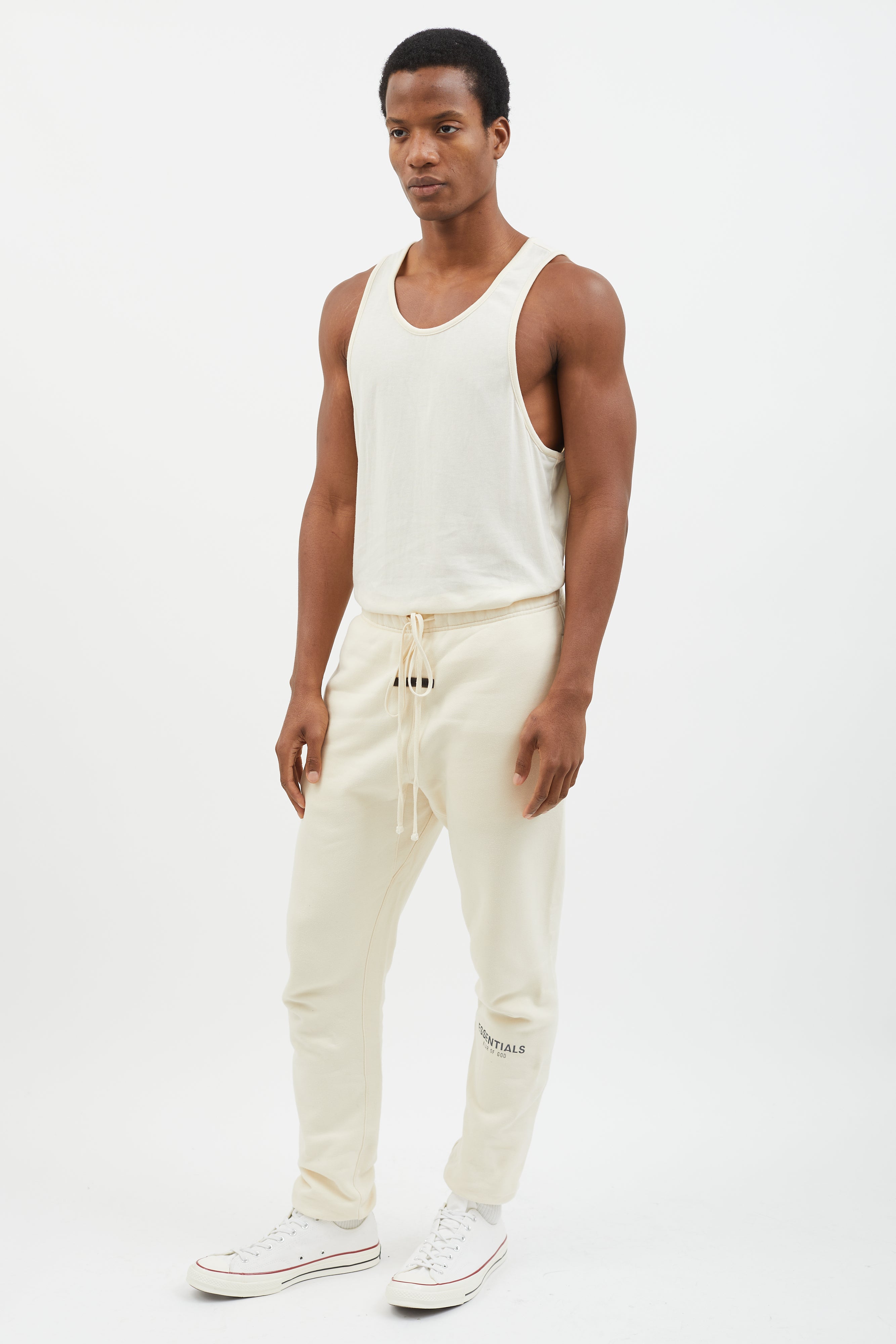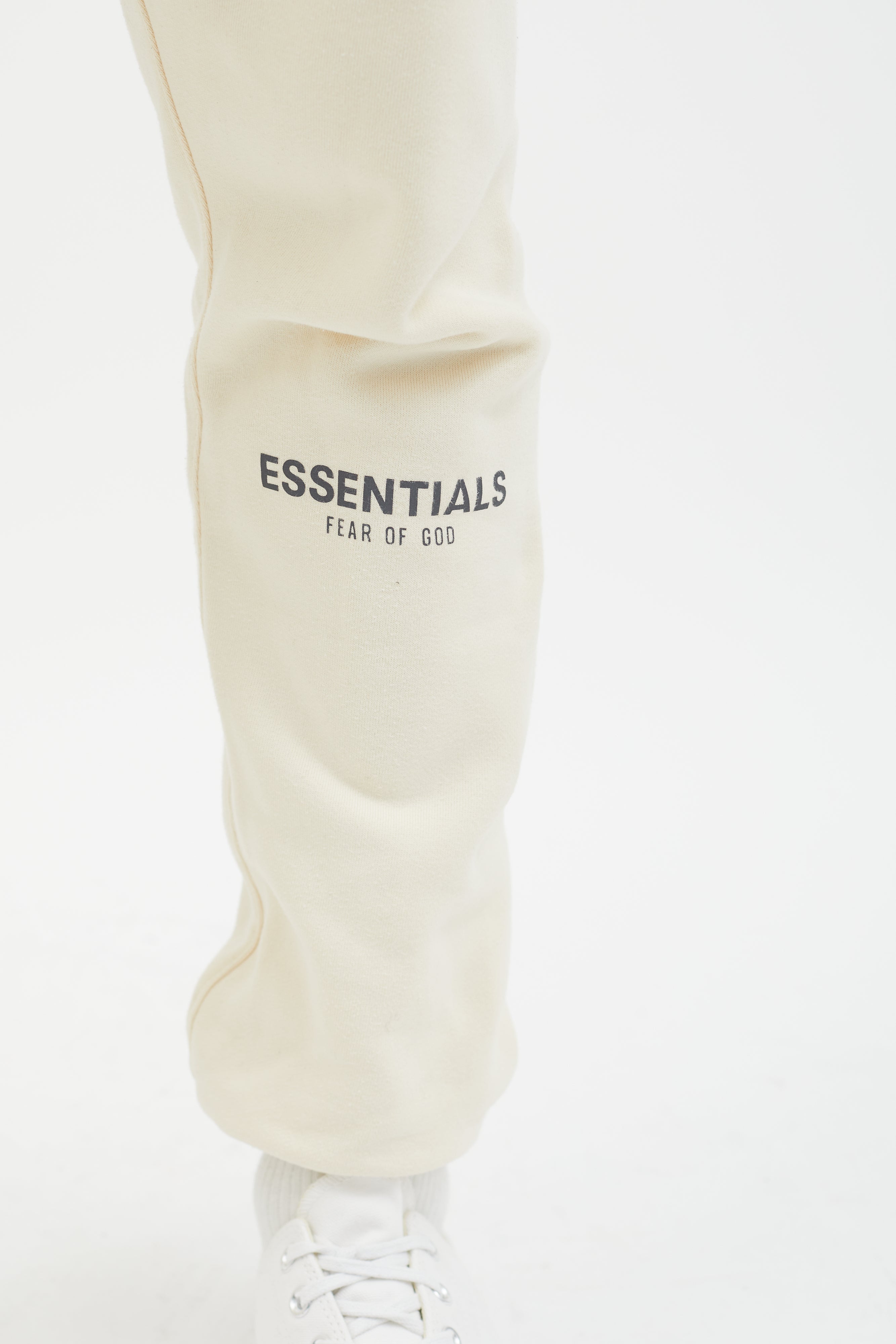 Pre-owned Essentials lounge pants in cream featuring elasticized waistband with oversized drawstring, logo rubber patch at front, three pockets styling, elasticized cuff, and grey stamped logo at left leg.