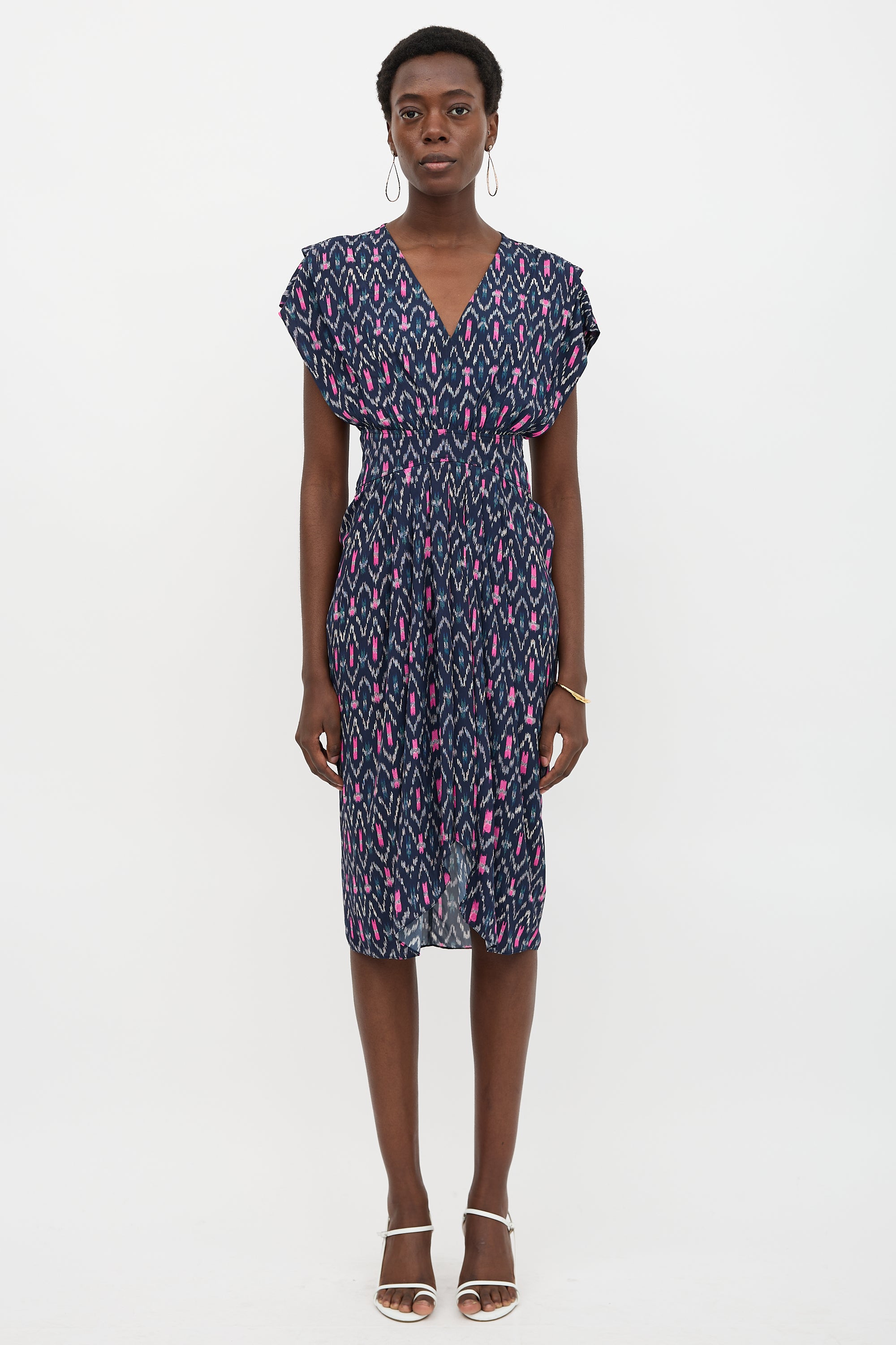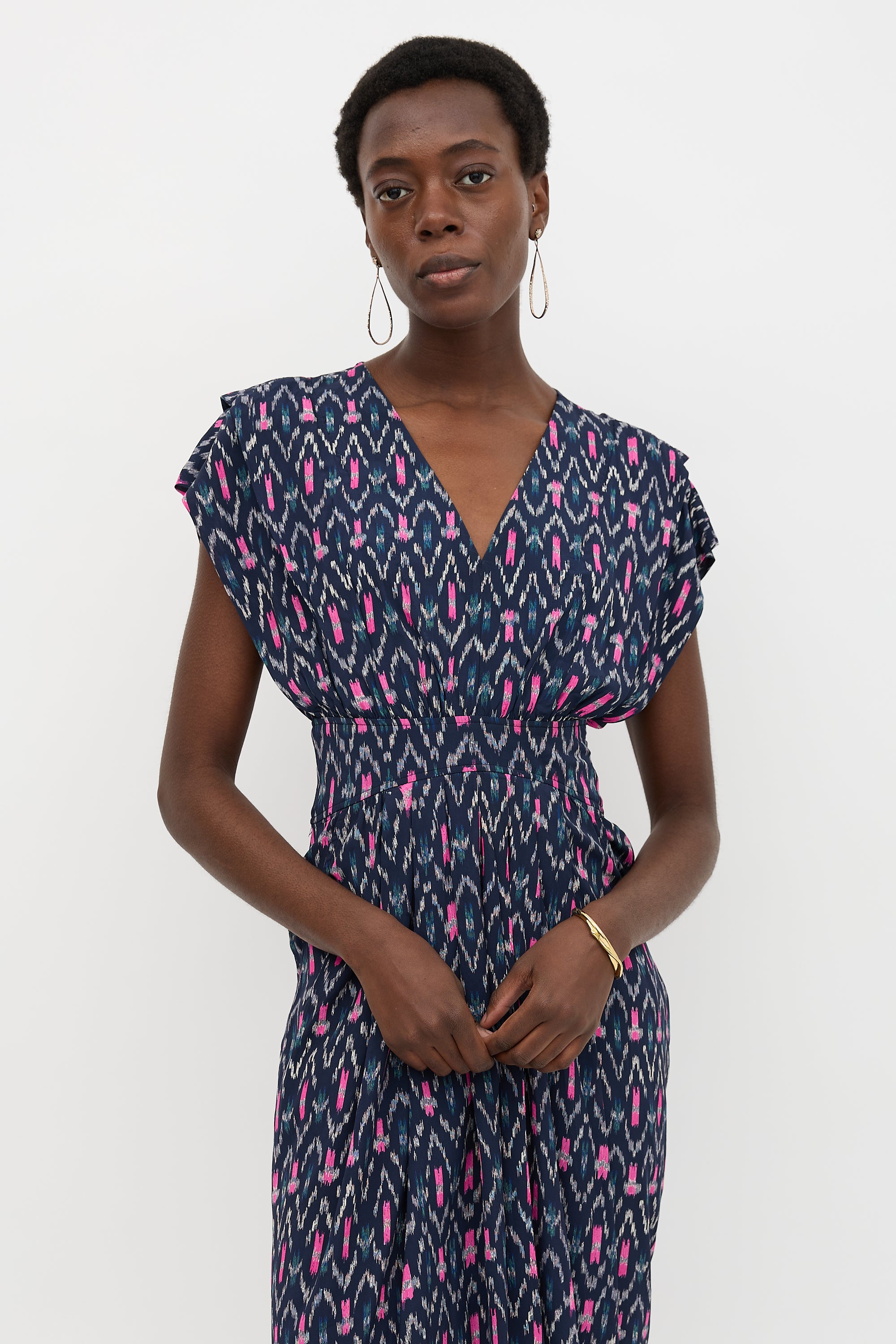 Isabel Marant Étoile navy and pink Almeya midi dress featuring an Ikat print throughout, cap sleeves, two slip pockets at front, side zip closure, gathered skirt, and a high low hem.