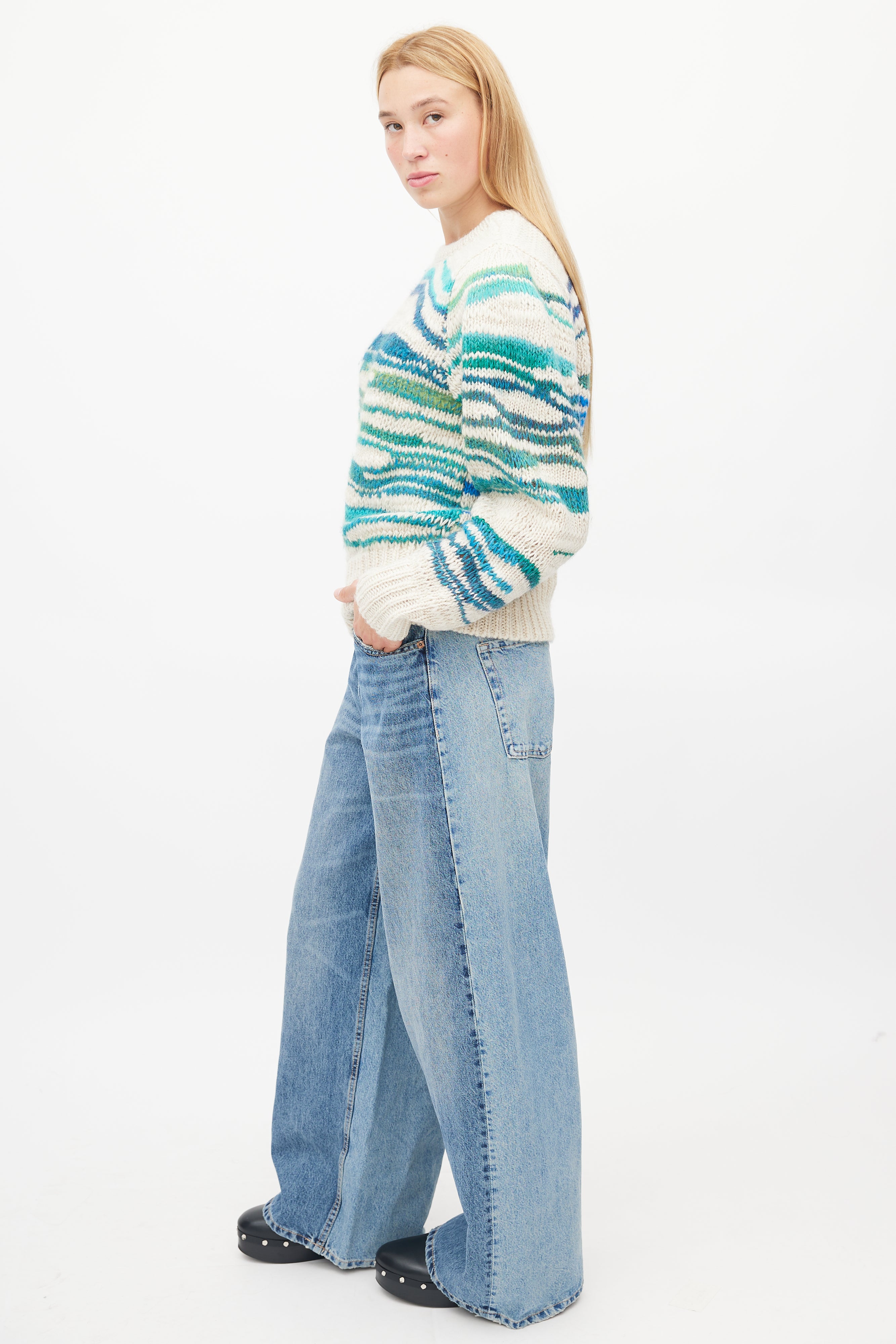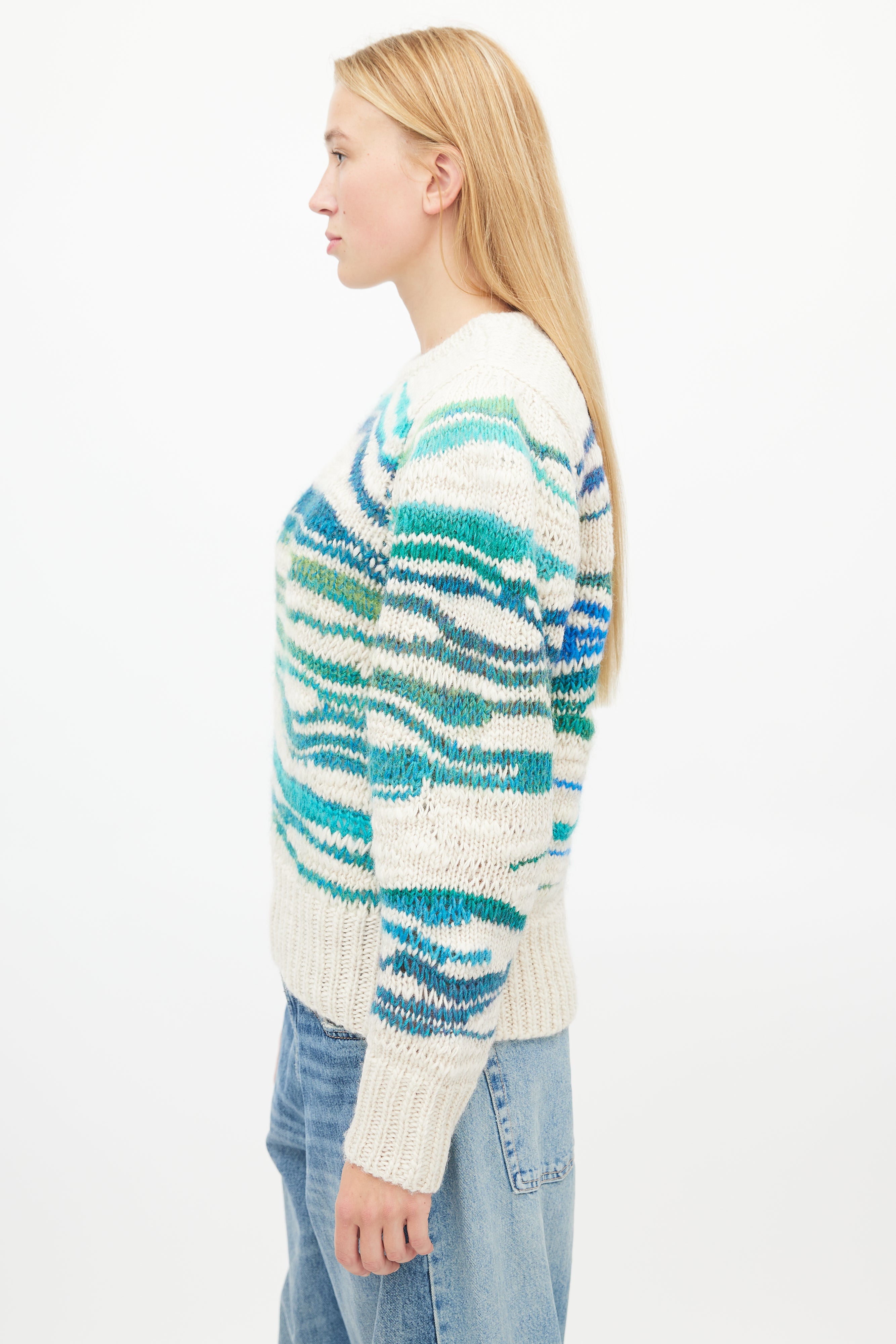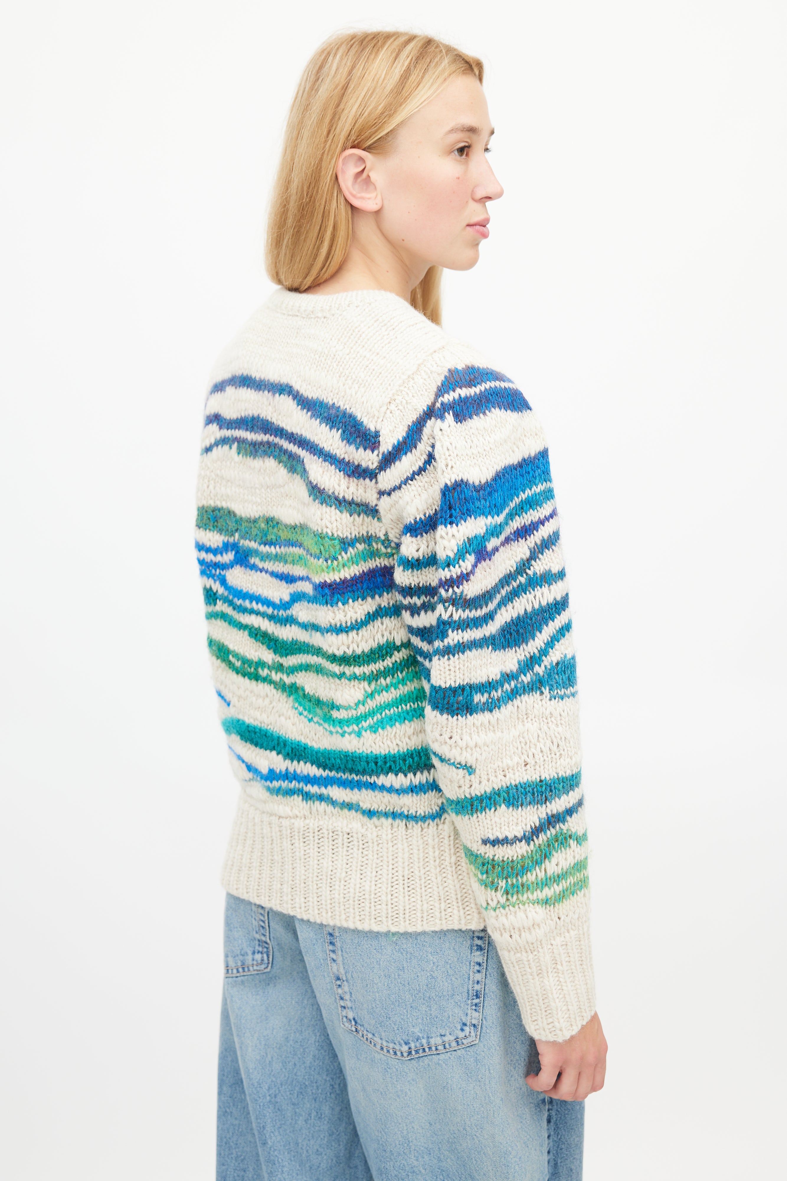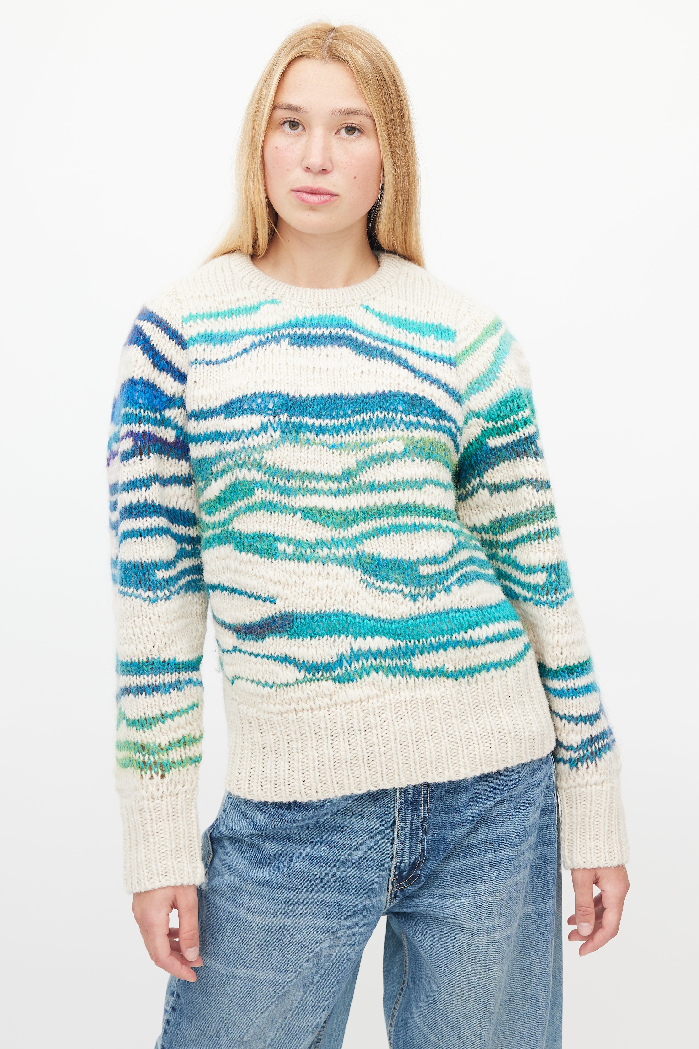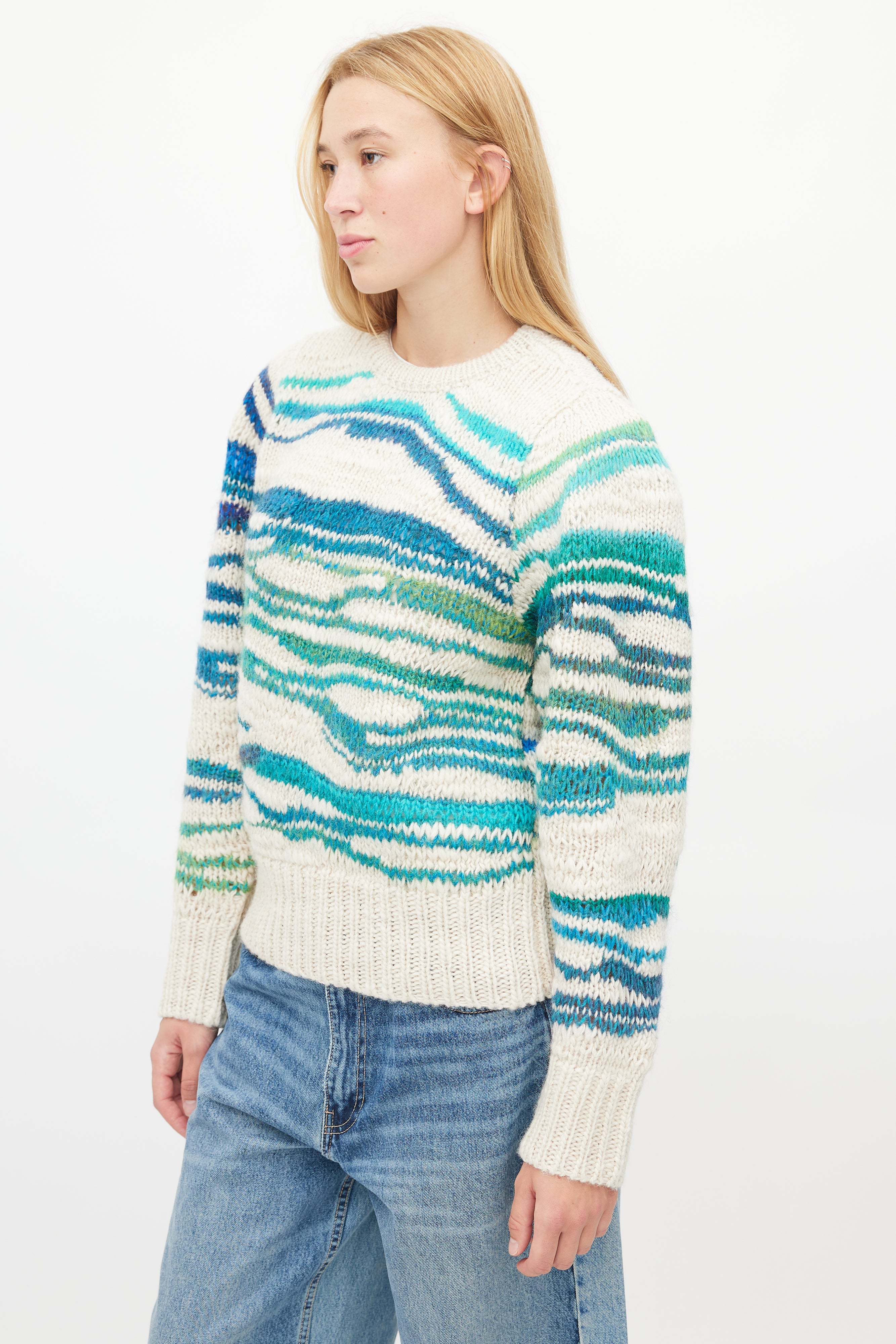Pre-owned Isabel Marant Étoile sweater featuring beige, blue, green and turquoise lines throughout, wide wrist cuffs and wide ribbed hem.