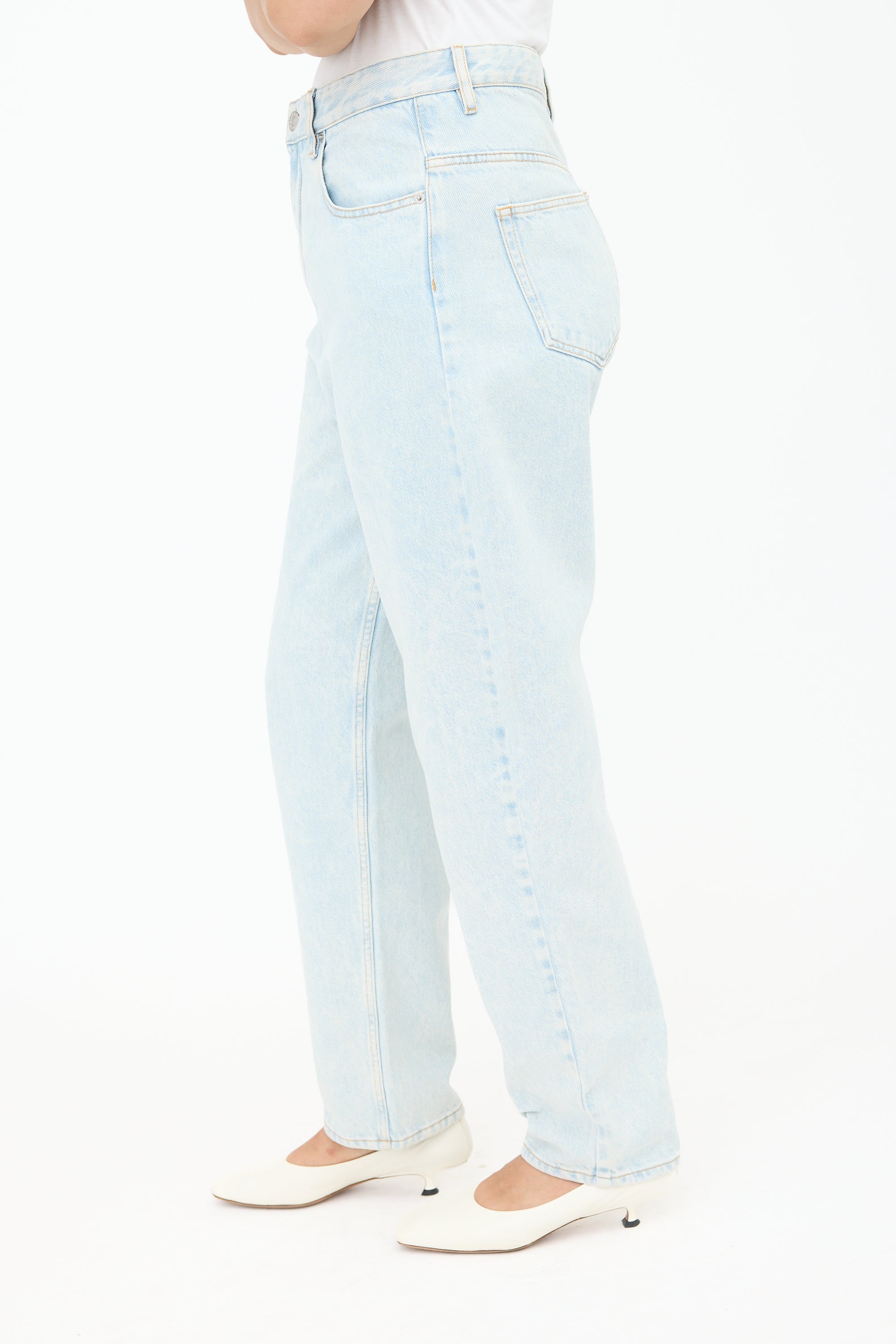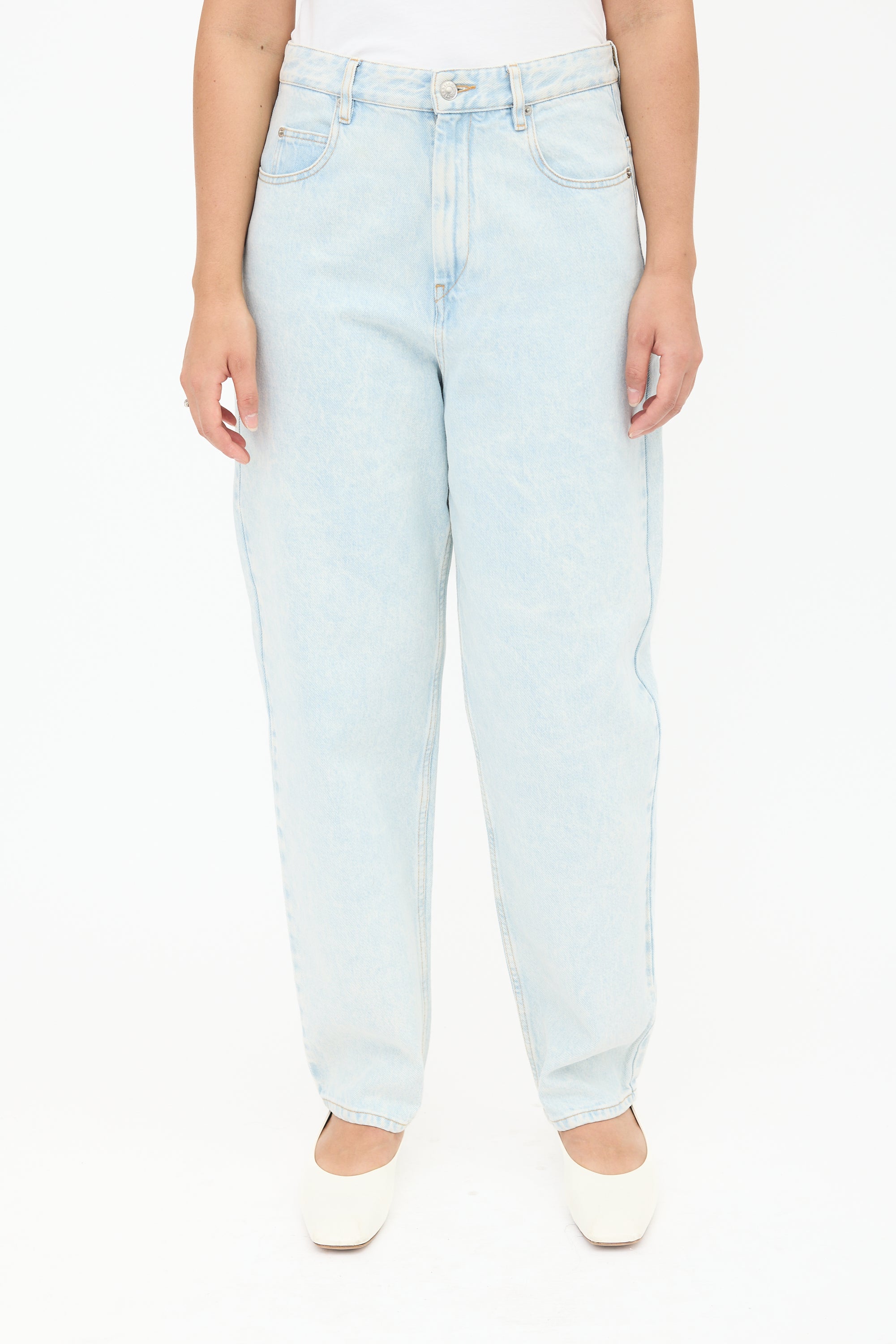 Isabel Marant Étoile light wash high waist Corsysr jeans featuring a zip fly, belt loops, five pocket styling, and a straight leg.