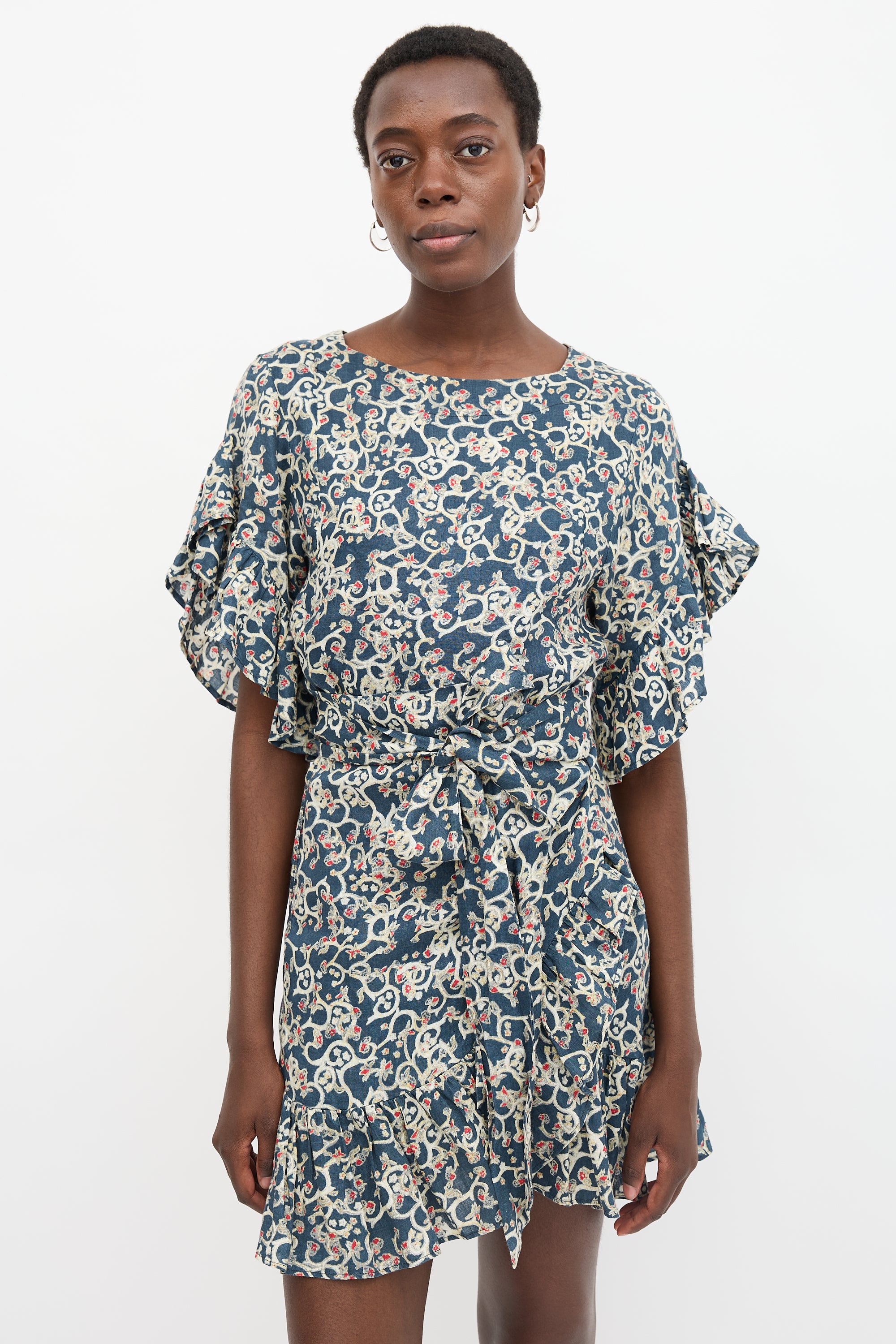 Pre-owned Isabel Marant Étoile green linen Delicia wrap dress featuring white and red filigree print, tie waist, cutout back collar with button closure, and ruffle trim.