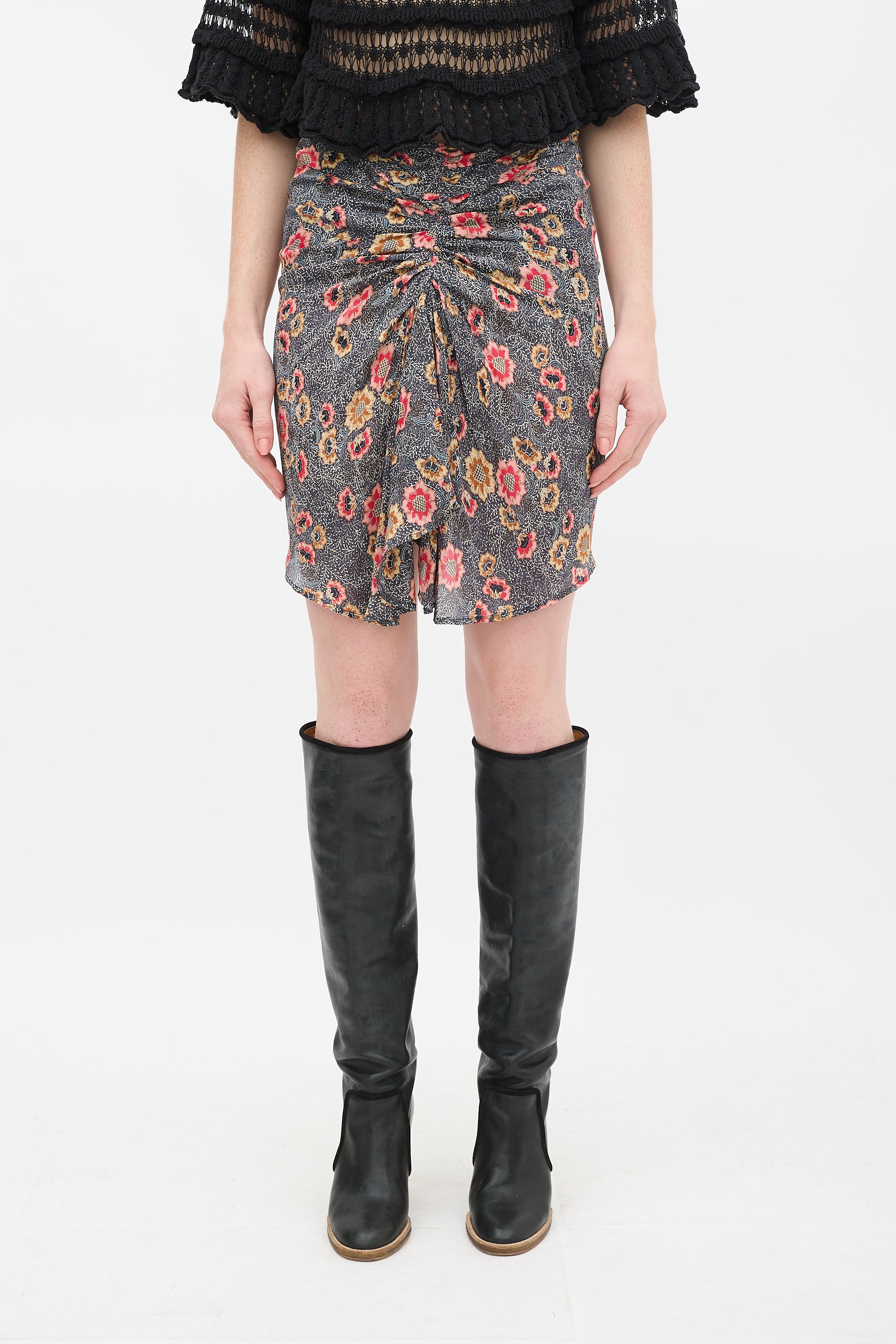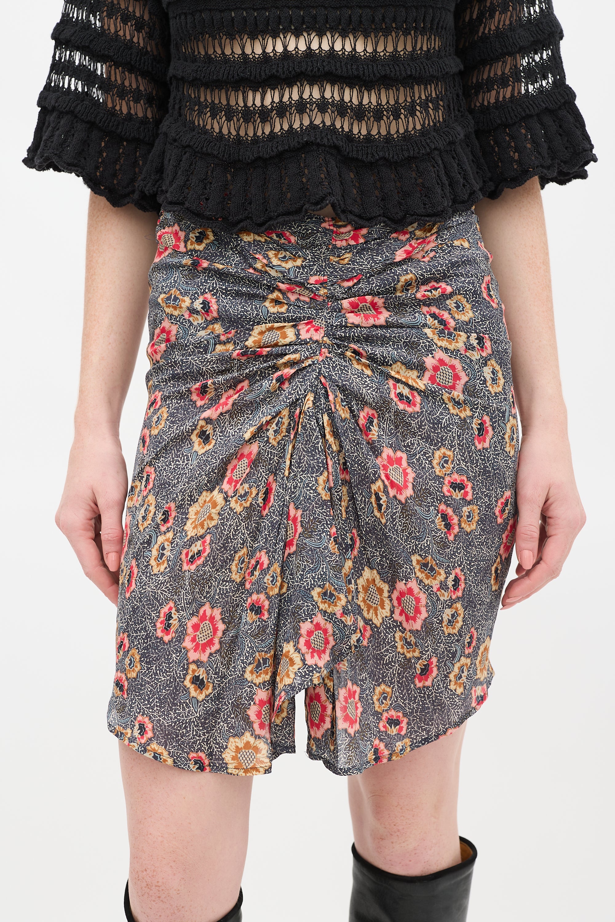 Pre-owned Isabel Marant Étoile navy Sevan Poppy skirt featuring red and gold floral print throughout, ruching at front, and a concealed side zip closure with top hook and eye fastener. Lined.