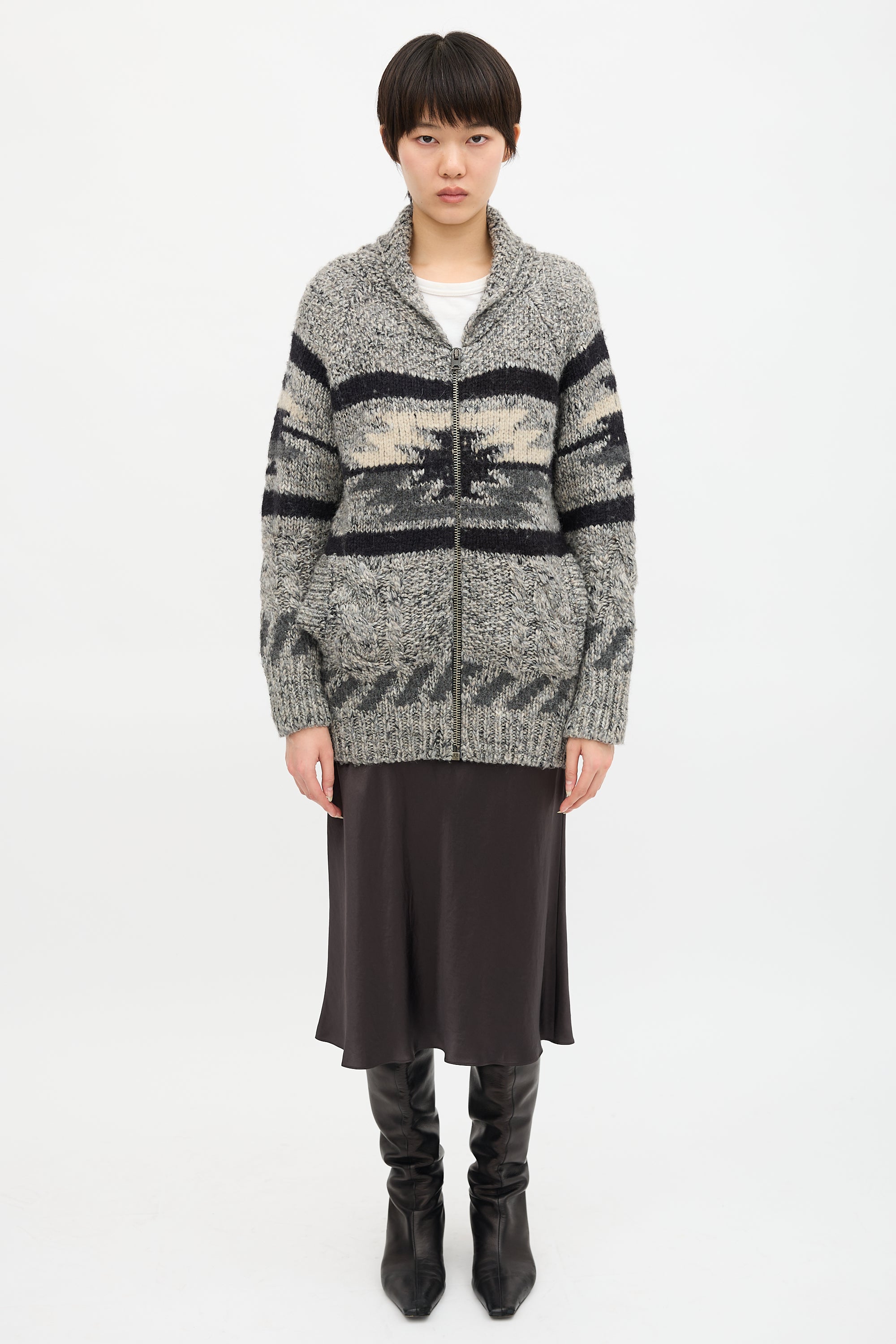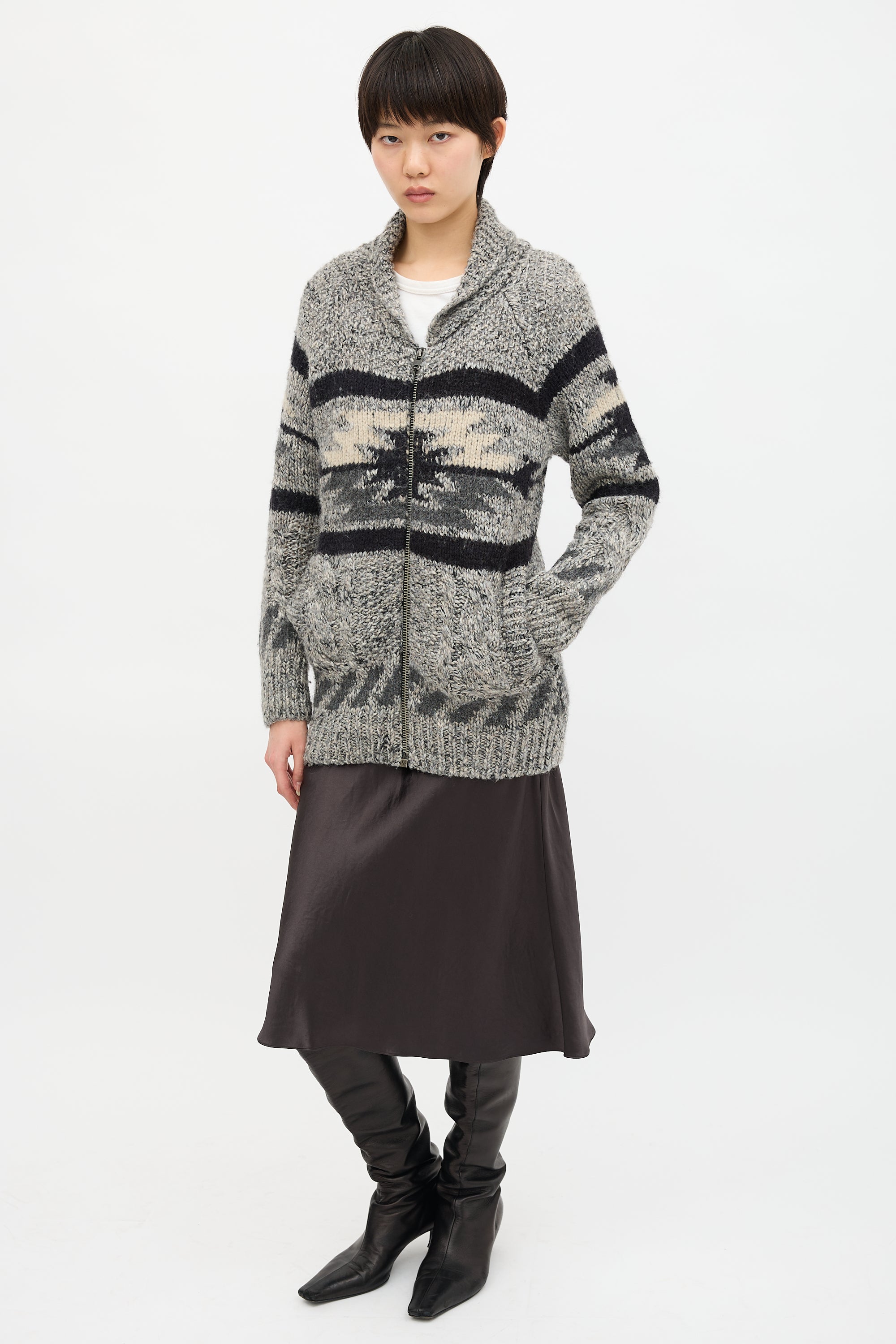 Pre-owned Isabel Marant Étoile wool & alpaca blend grey Odrys cardigan featuring a black and cream stripe intarsia pattern, shawl collar, front zip, and two welt pockets.