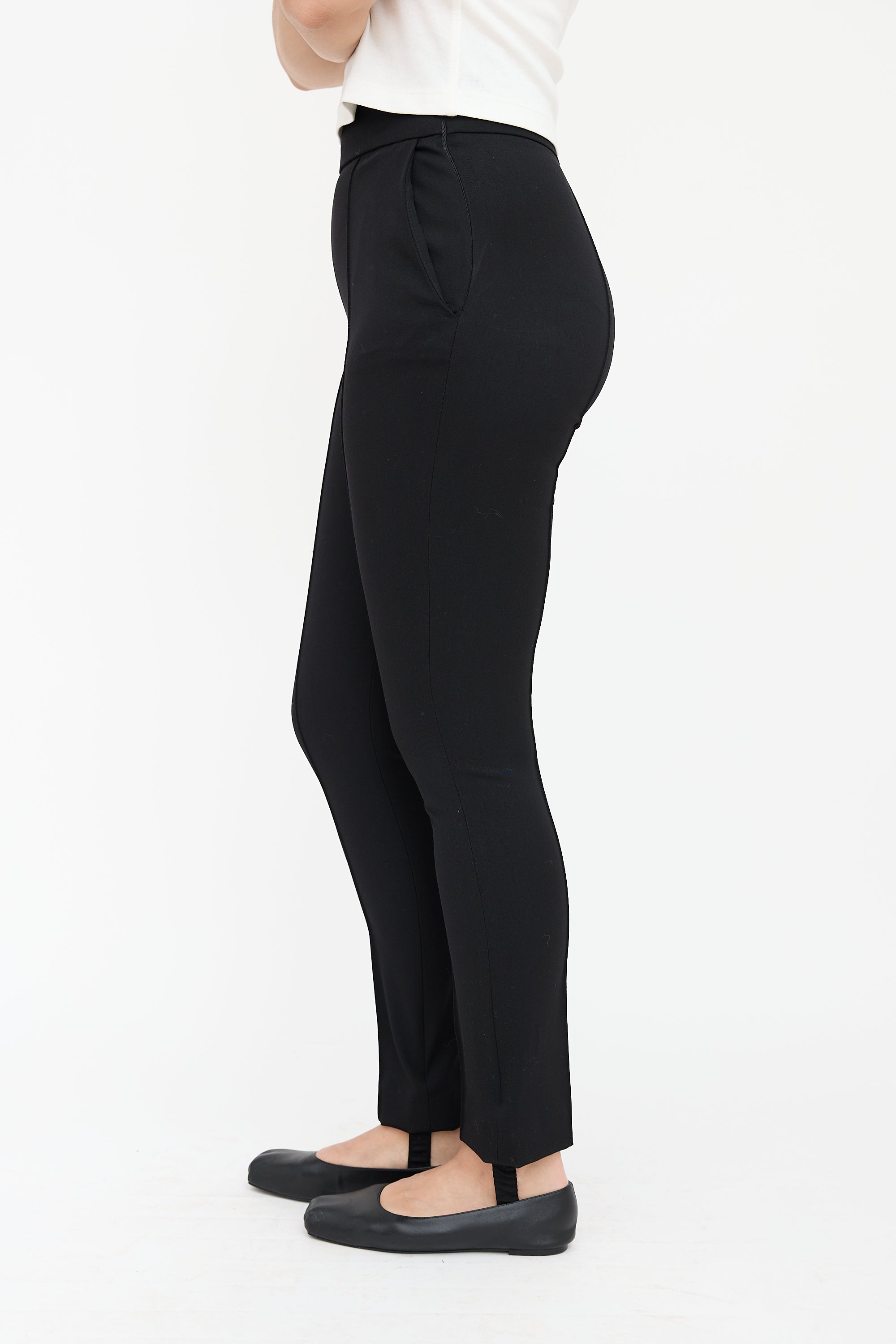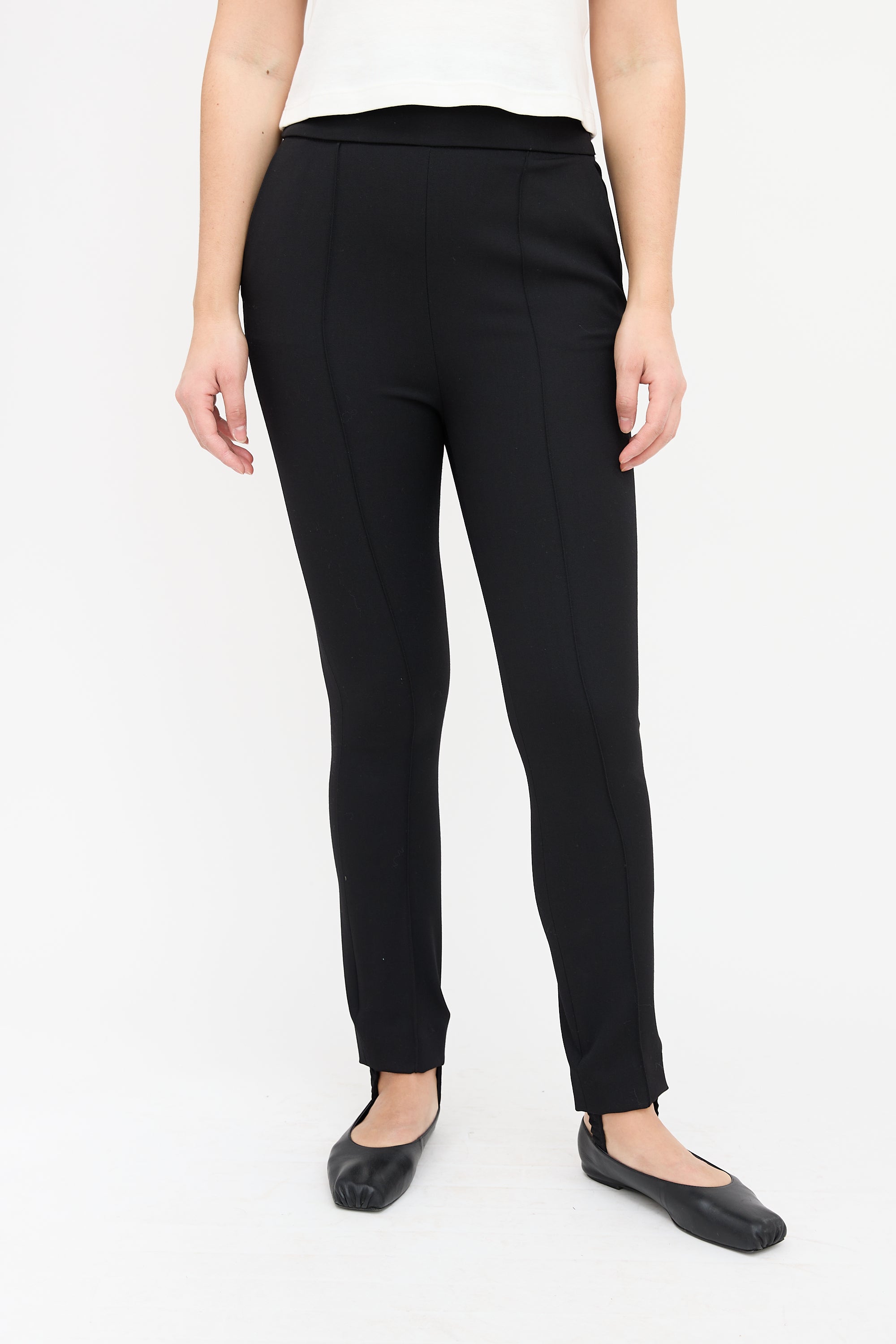Loulou Studio black slim leg pants featuring a side zip closure, creased seams, two slash pockets, and stirrups.