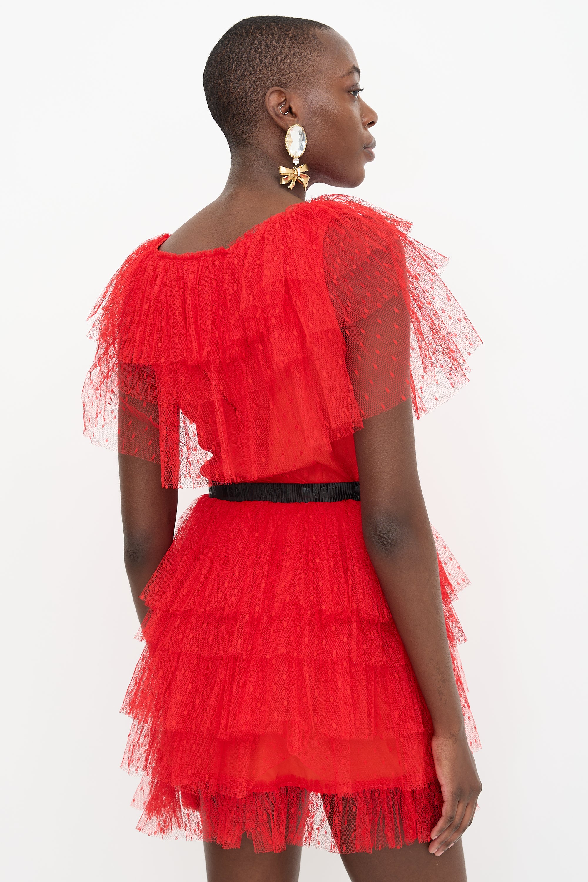 MSGM red mini dress featuring a round neckline, layered polka dot tulle, raw edges, side zip closure with hook fastening, and black grosgrain logo belt at waist. Lined.