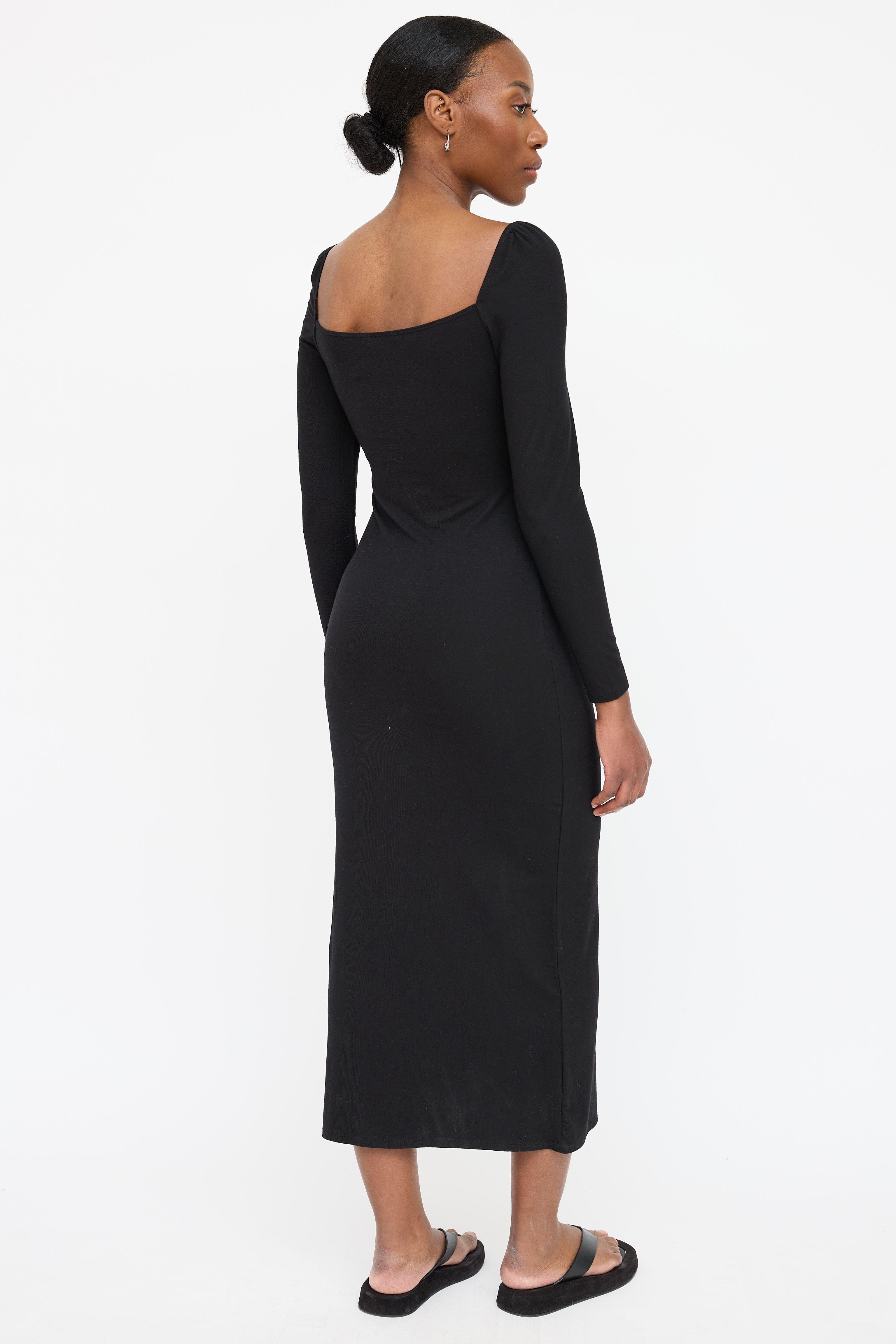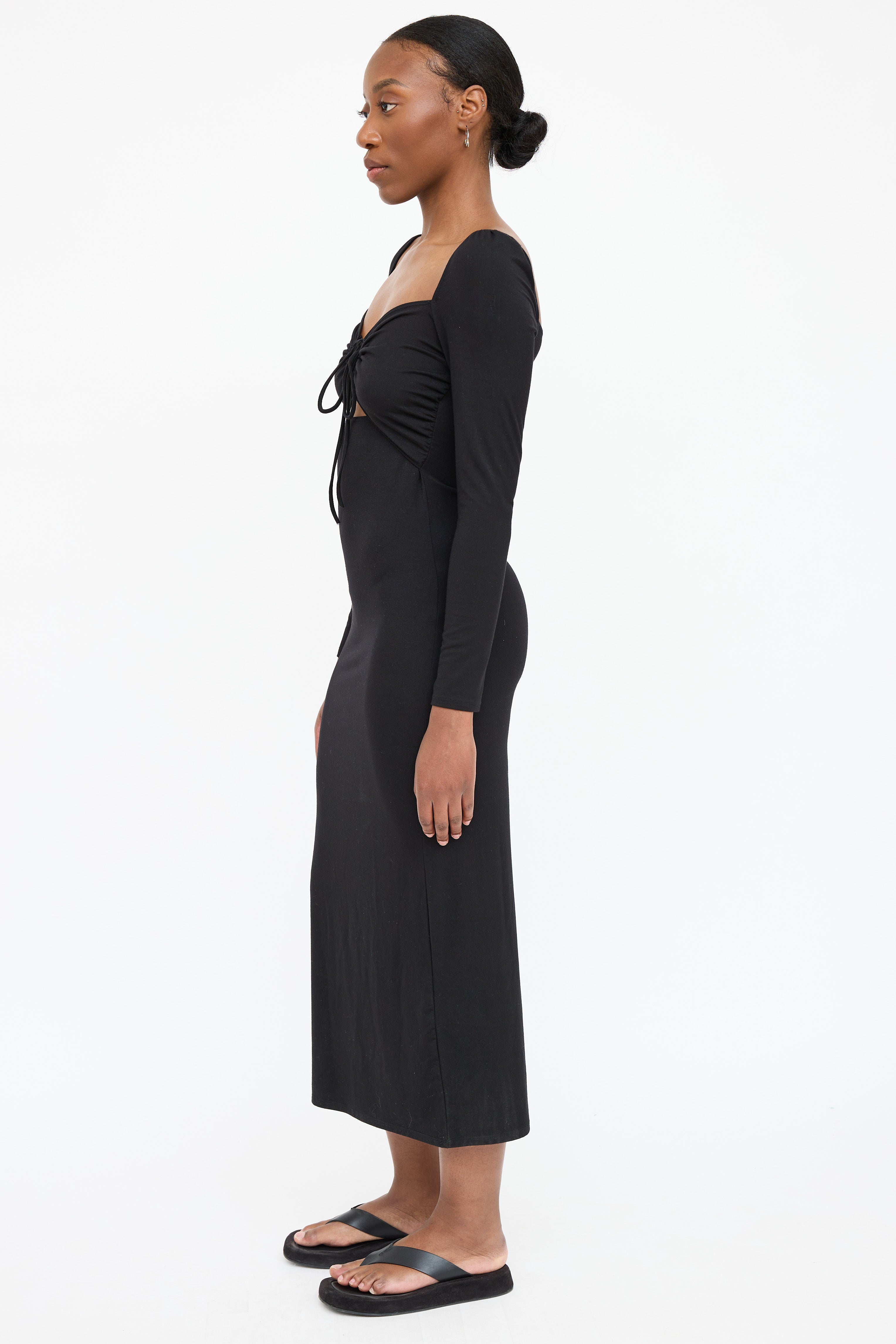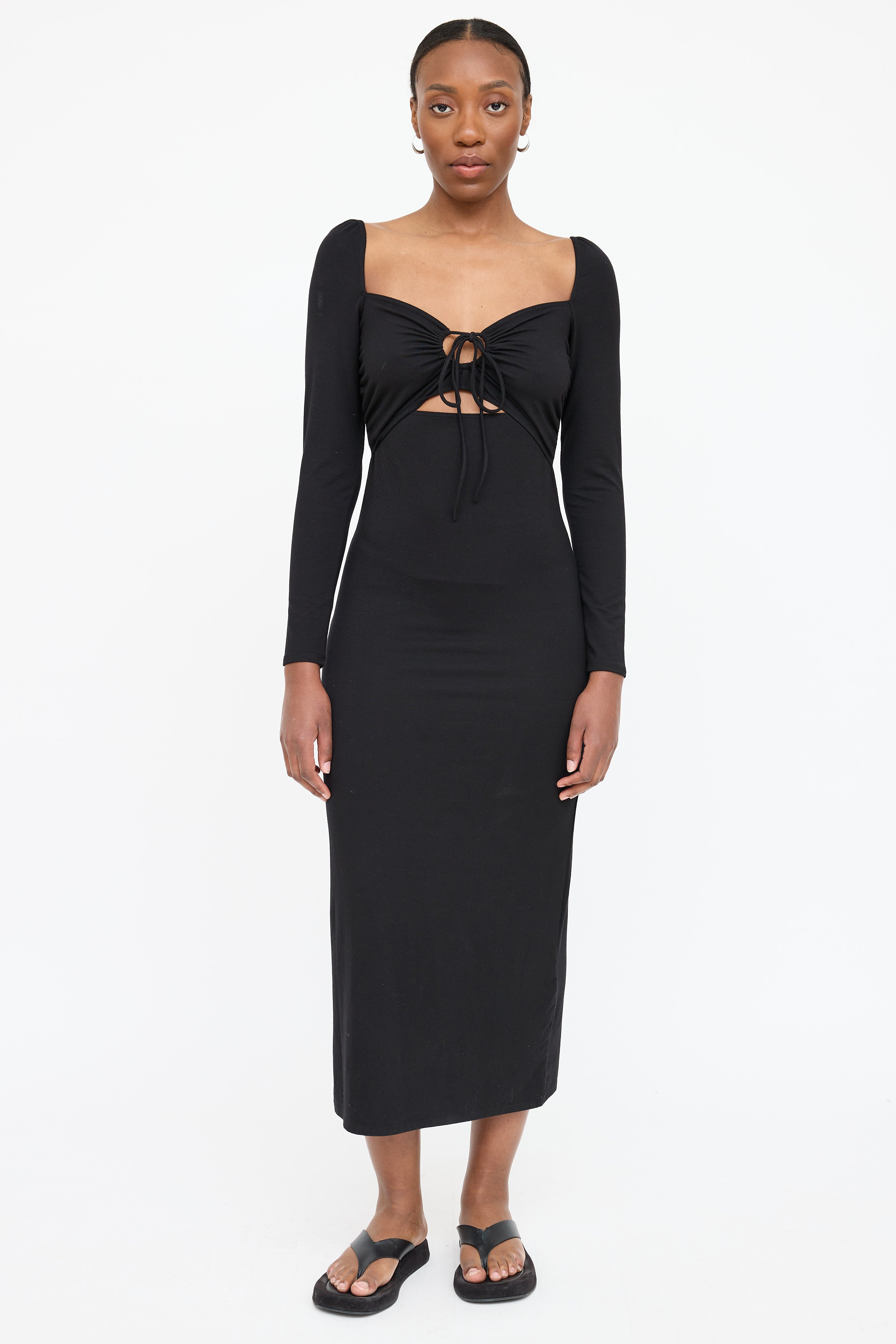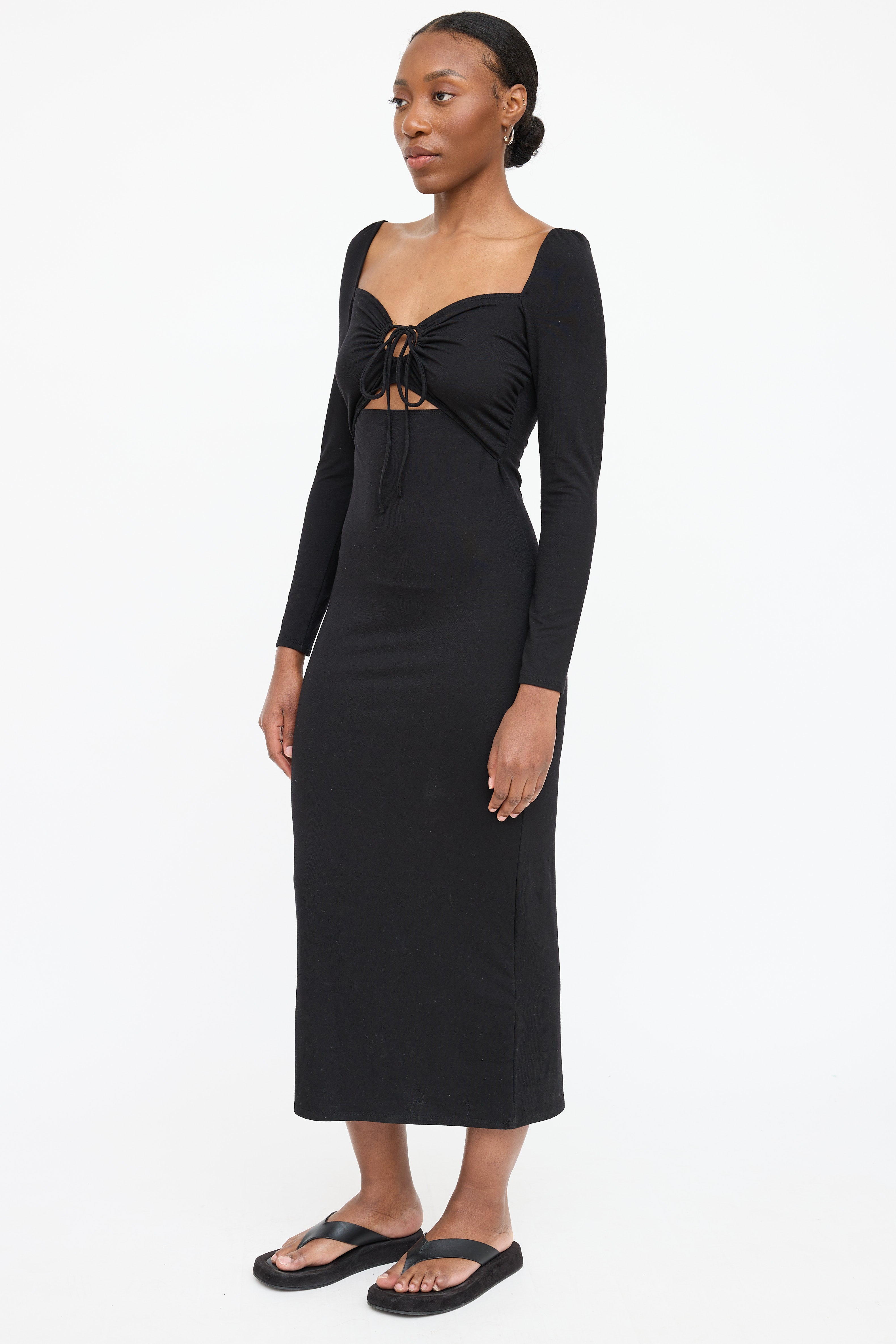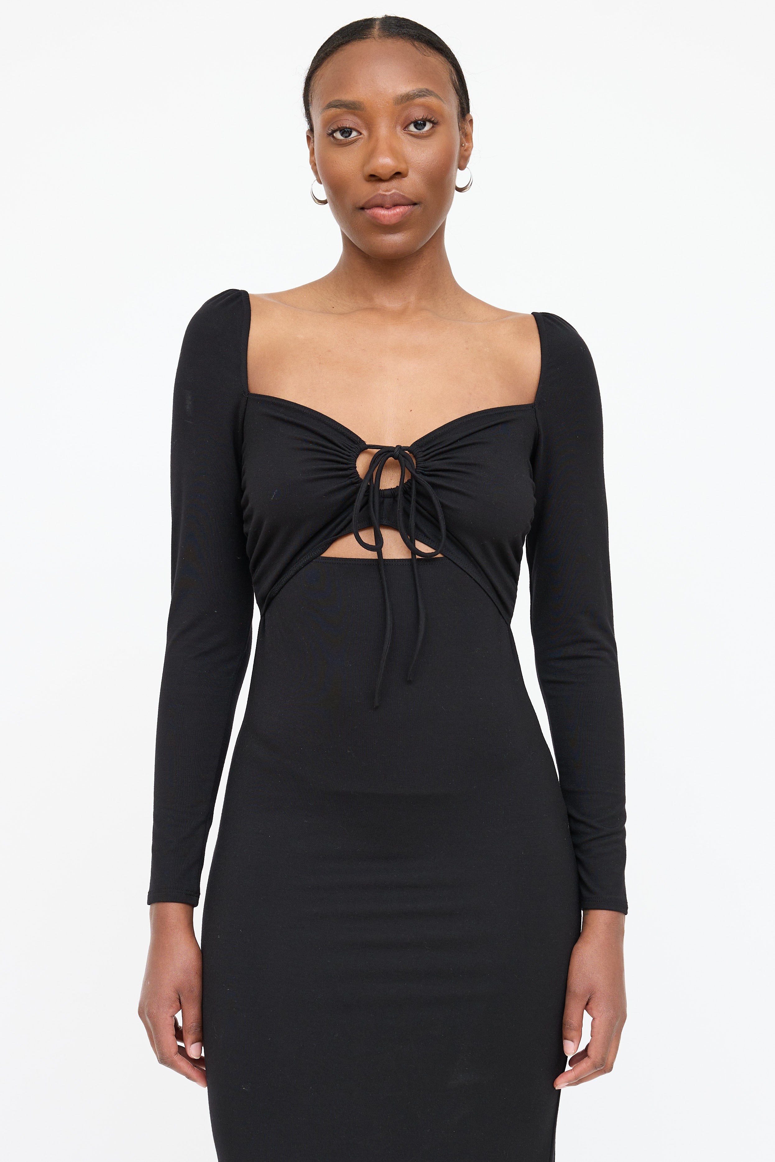 Pre-owned Reformation black long sleeve dress featuring sweetheart neckline, drawstring tie at chest, and cut out at waist.