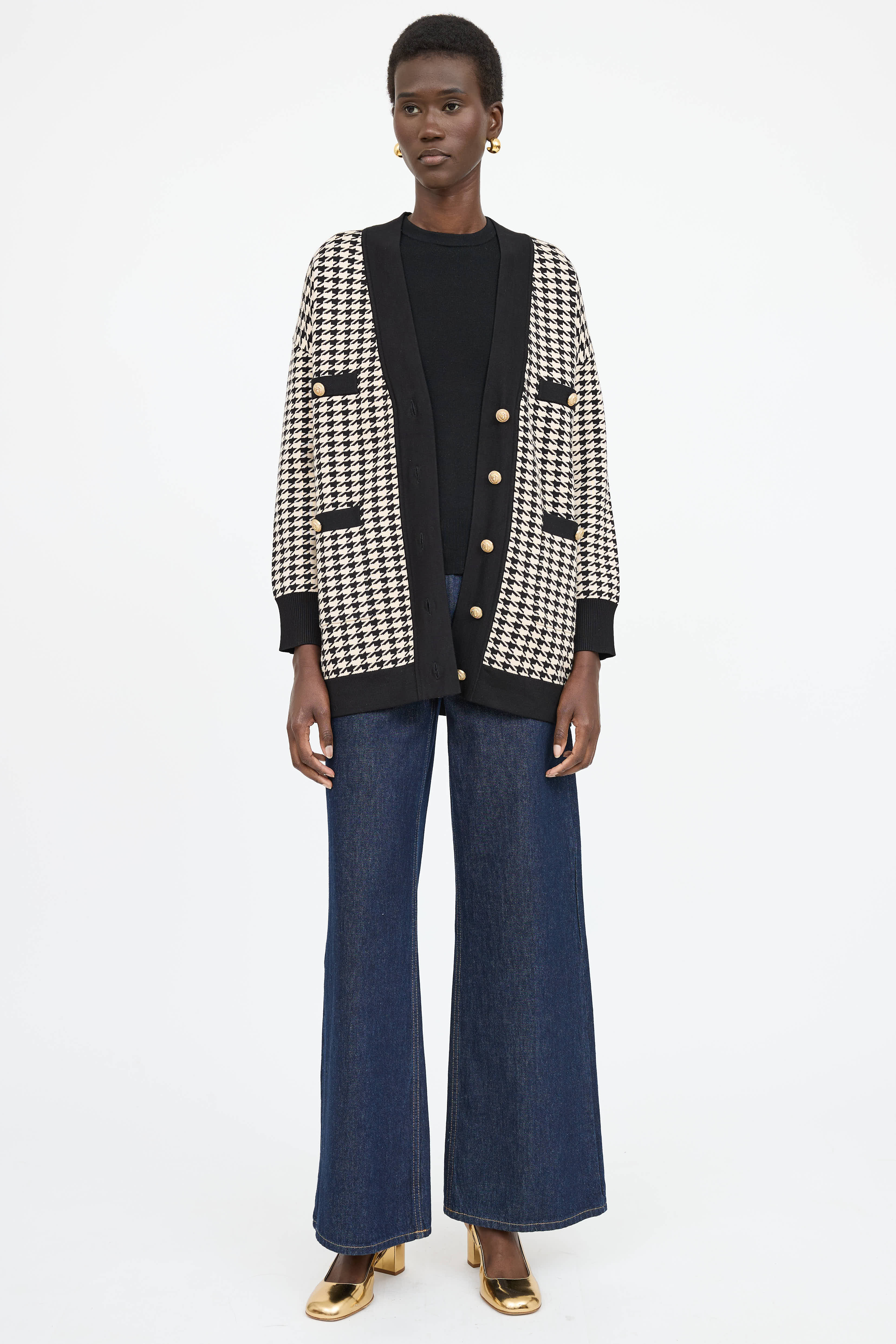 Pre-owned Sandro cream and black long sleeve cardigan featuring v-neckline, gold tone embellished button front, decorative pockets at chest, and welt pockets at front.