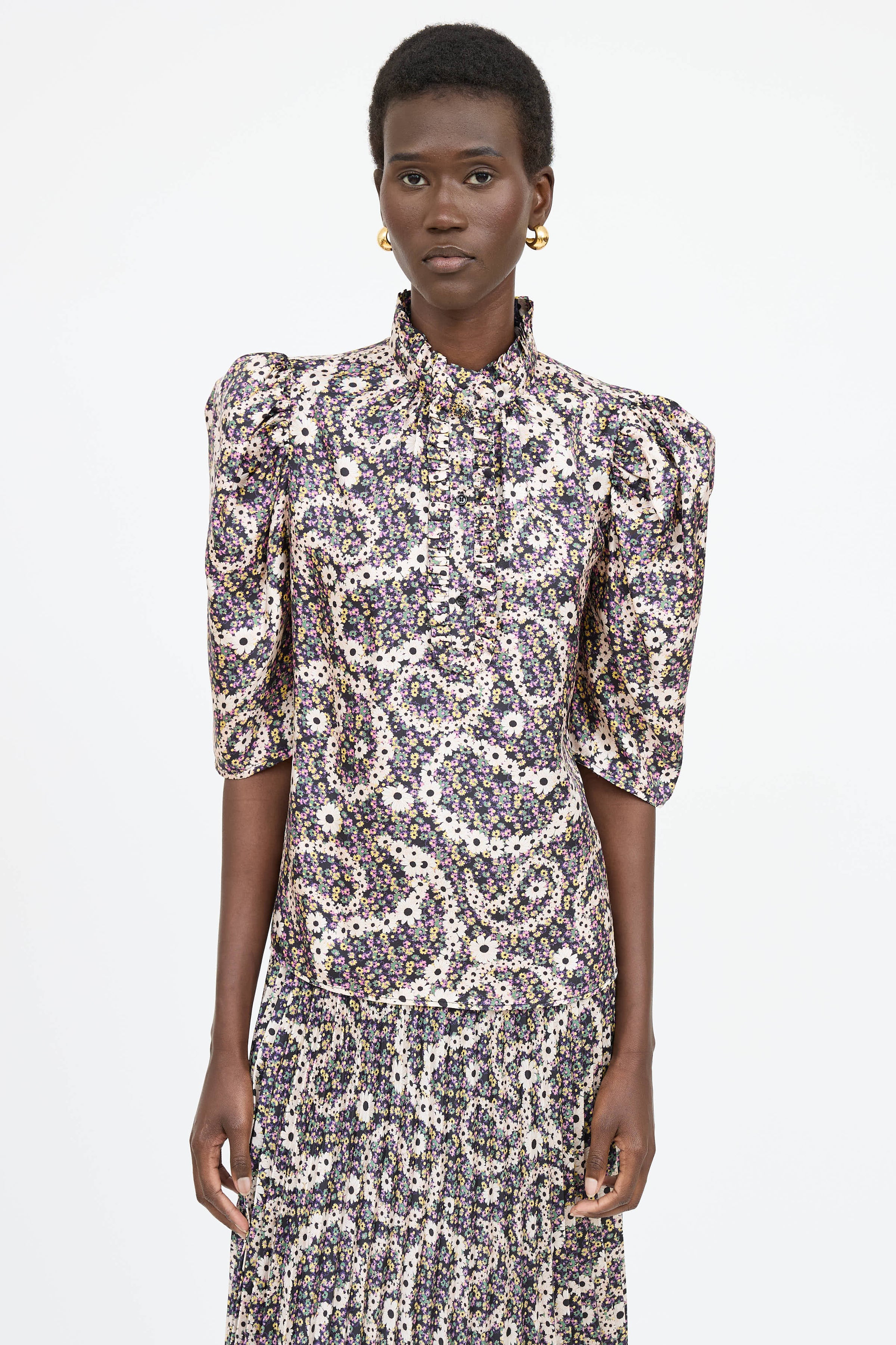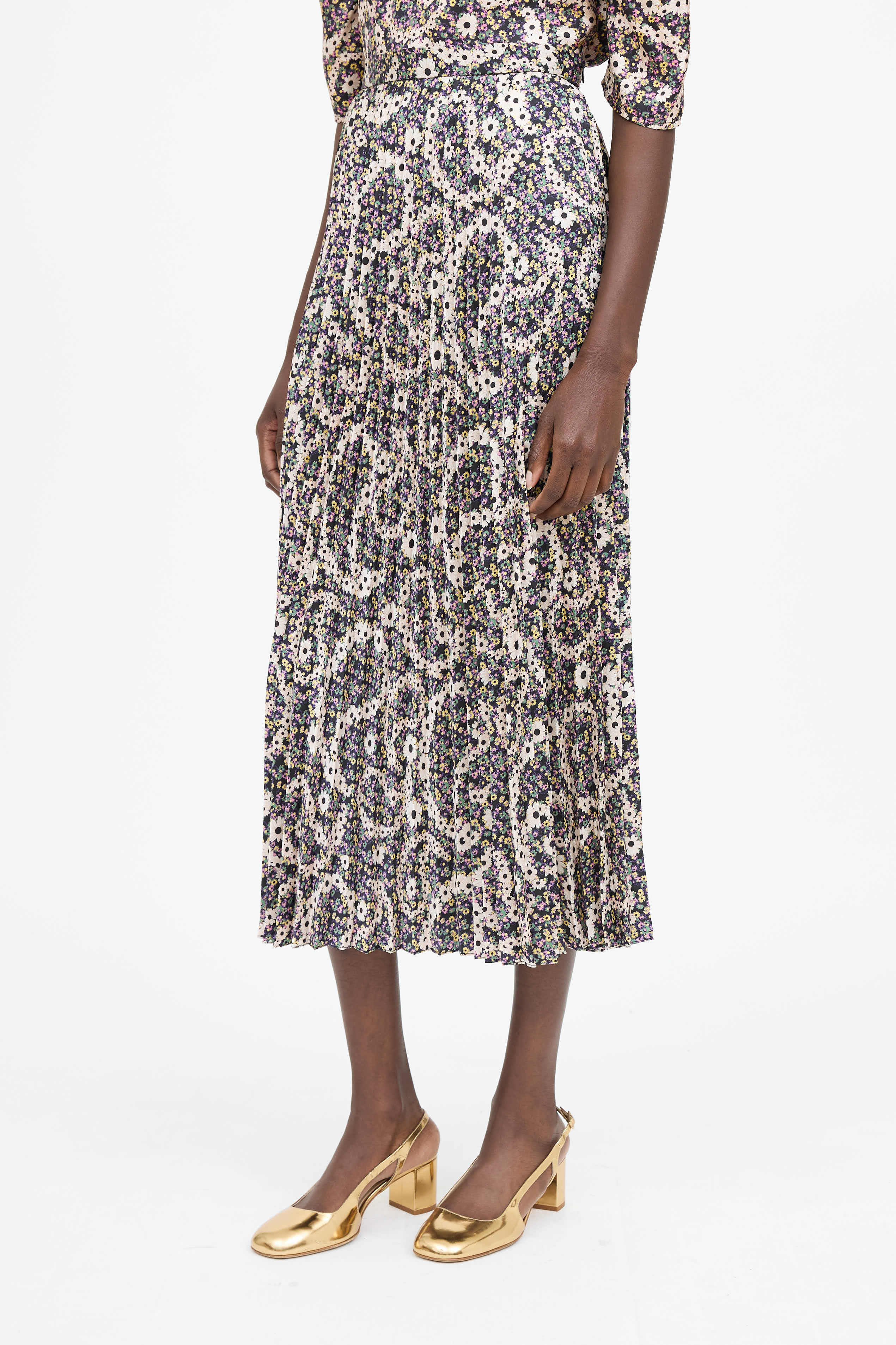 Pre-owned Sandro purple and multicolor satin floral co-ord set featuring ruffle trim long sleeve top, concealed button front with gold tone embellishment, pleated shoulders, and half sleeve. Matching skirt featuring concealed zip at side and pleated throughout.