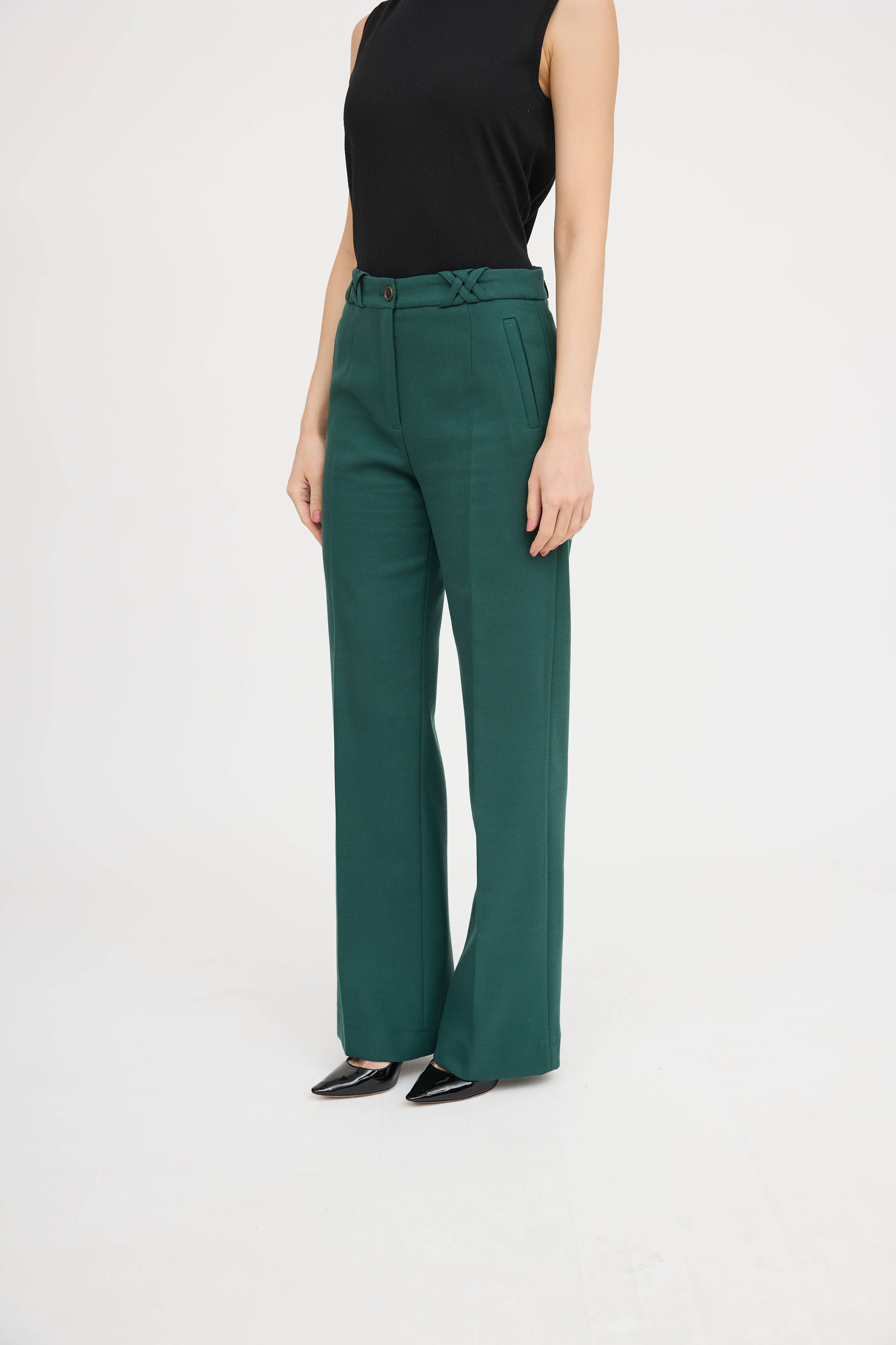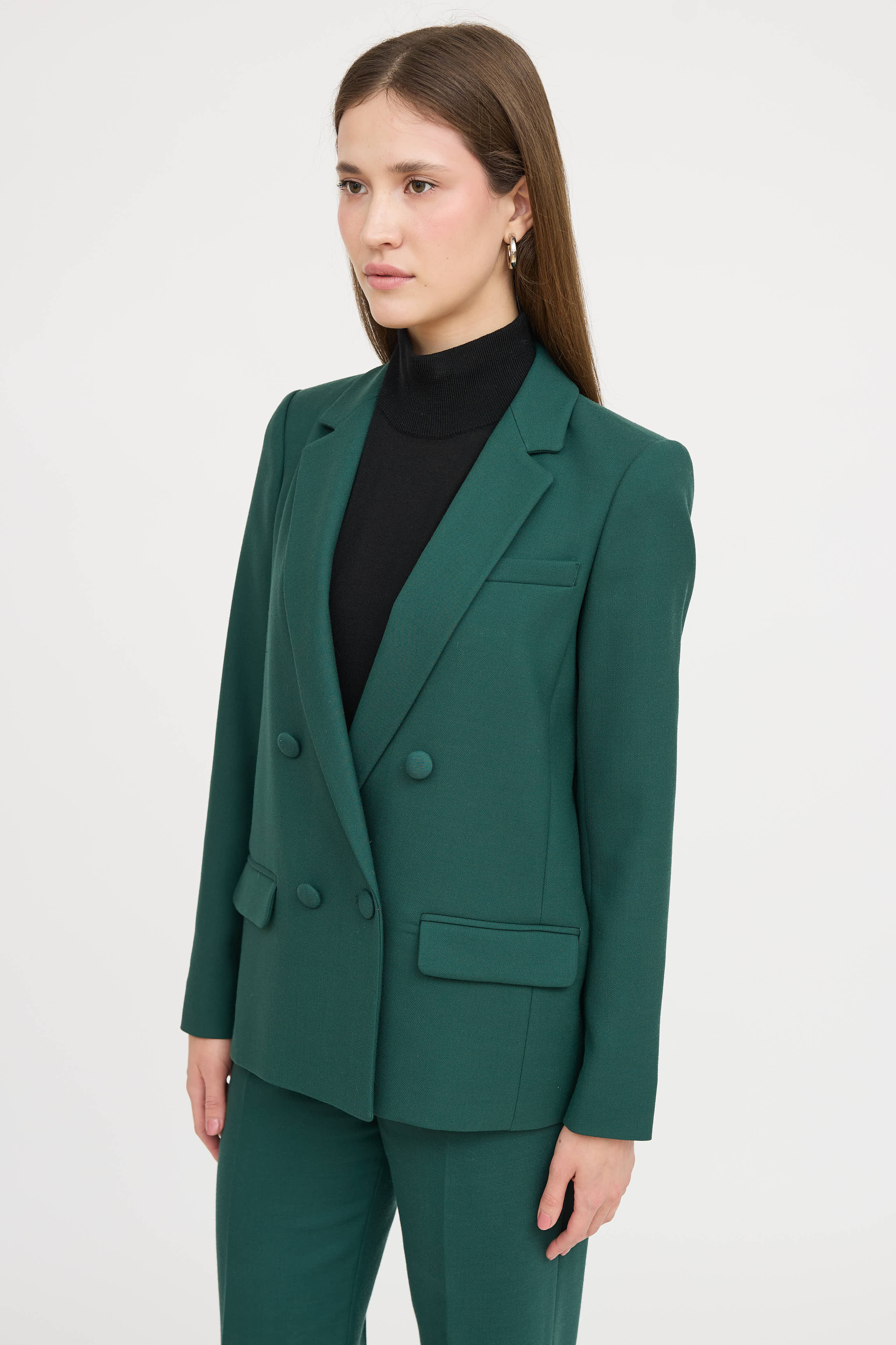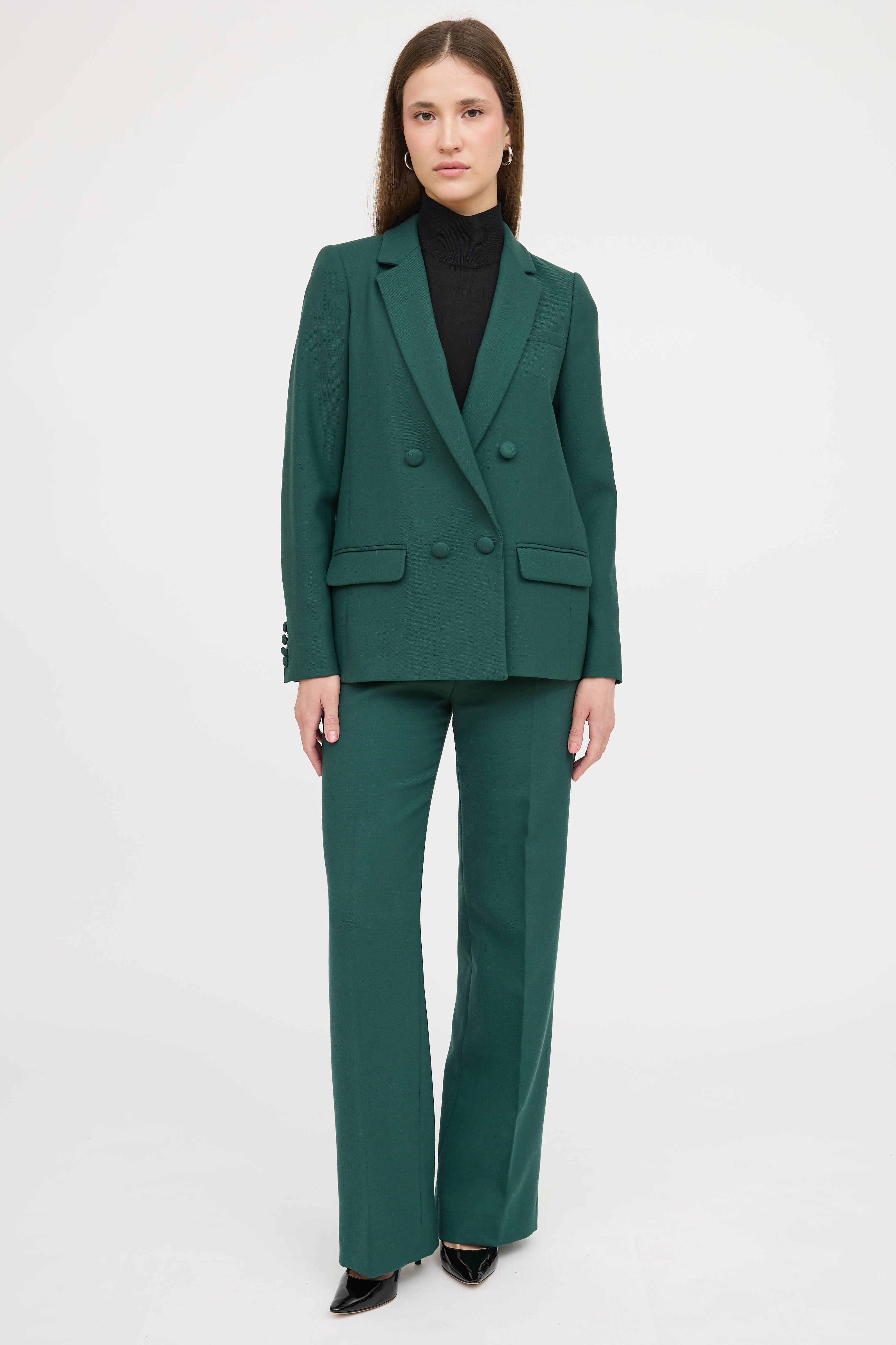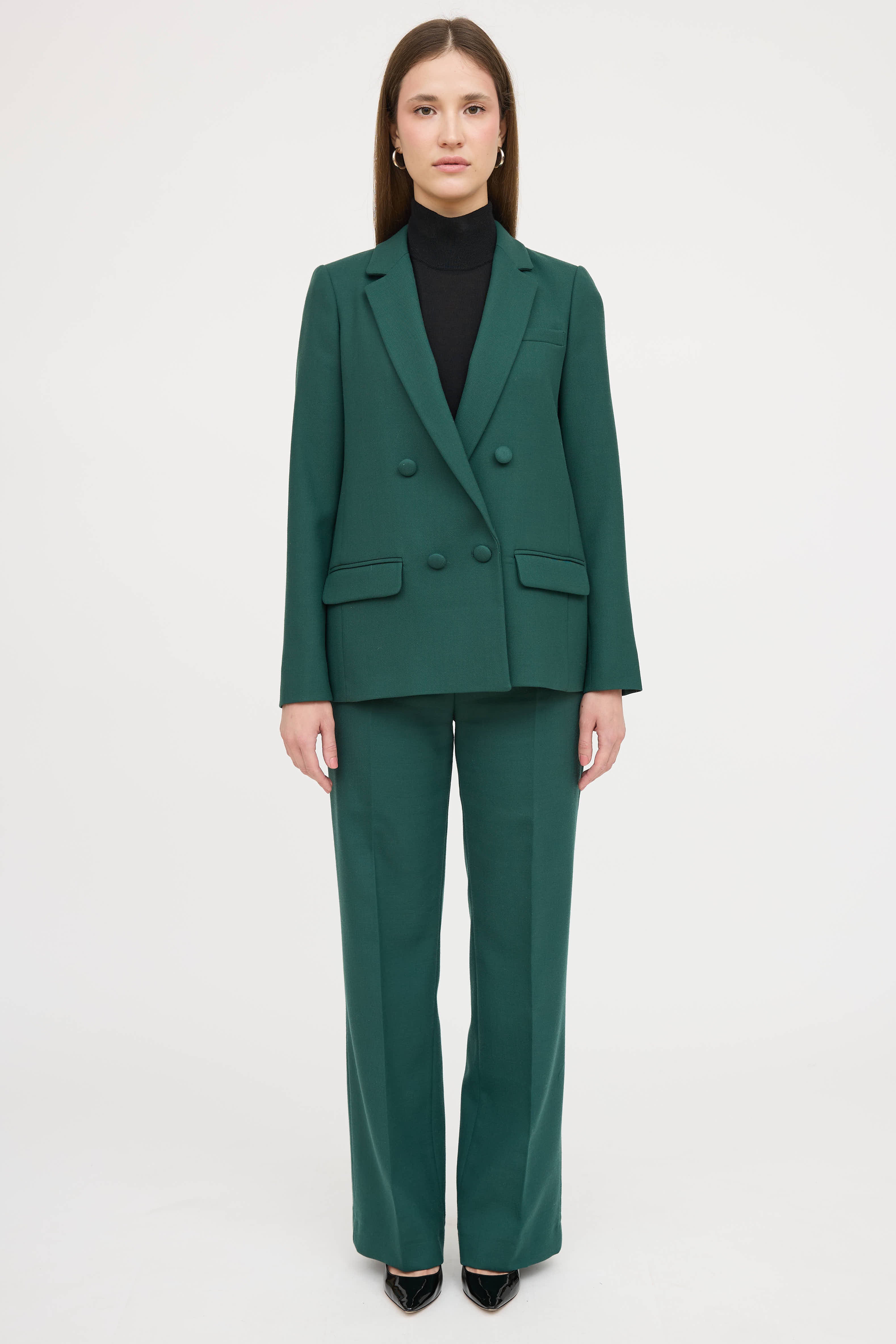 Pre-owned Sézane green blazer and pant co-ord set featuring a long sleeve blazer with notched lapel collar, decorative welt pocket at chest, button front, flap pockets at front, buttoned cuffs, and back vent. Matching pant featuring braided belt loops, zip fly, slit pockets at hip, and welt pockets at back.