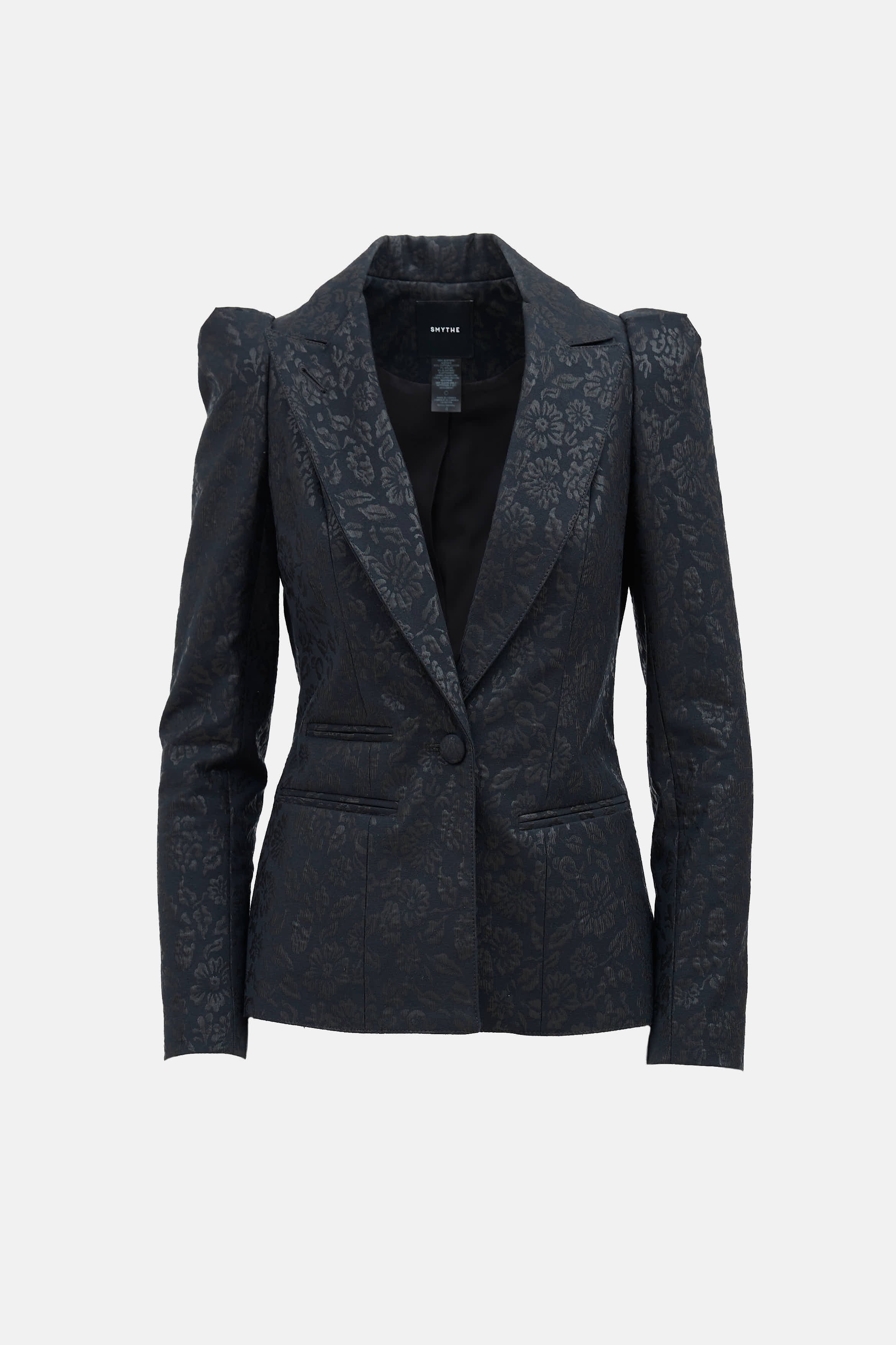 Pre-owned Smythe black long sleeve blazer featuring peak lapel collar, welt pockets at front, puffed pleated shoulders, and singular button front. Lined.