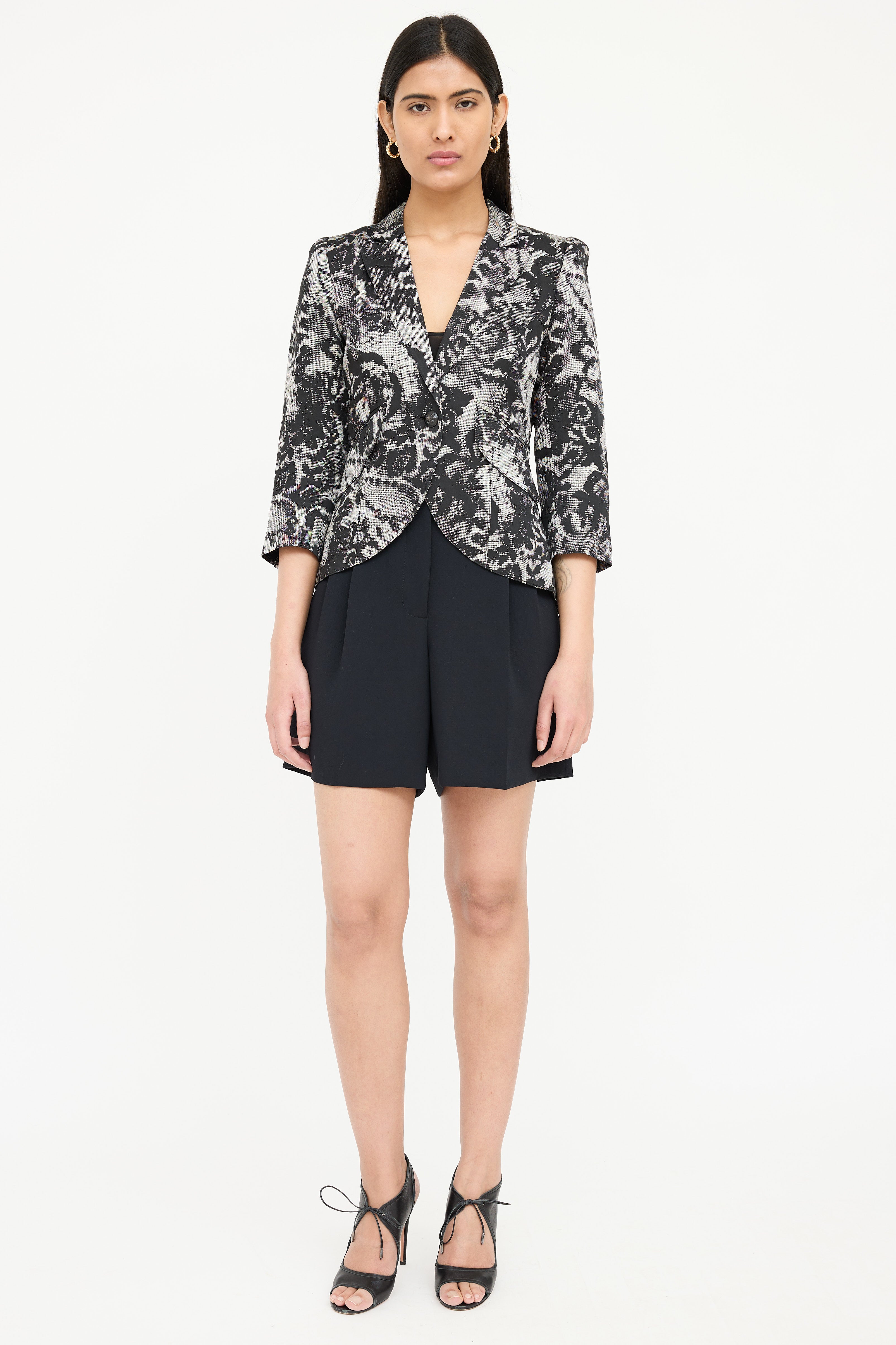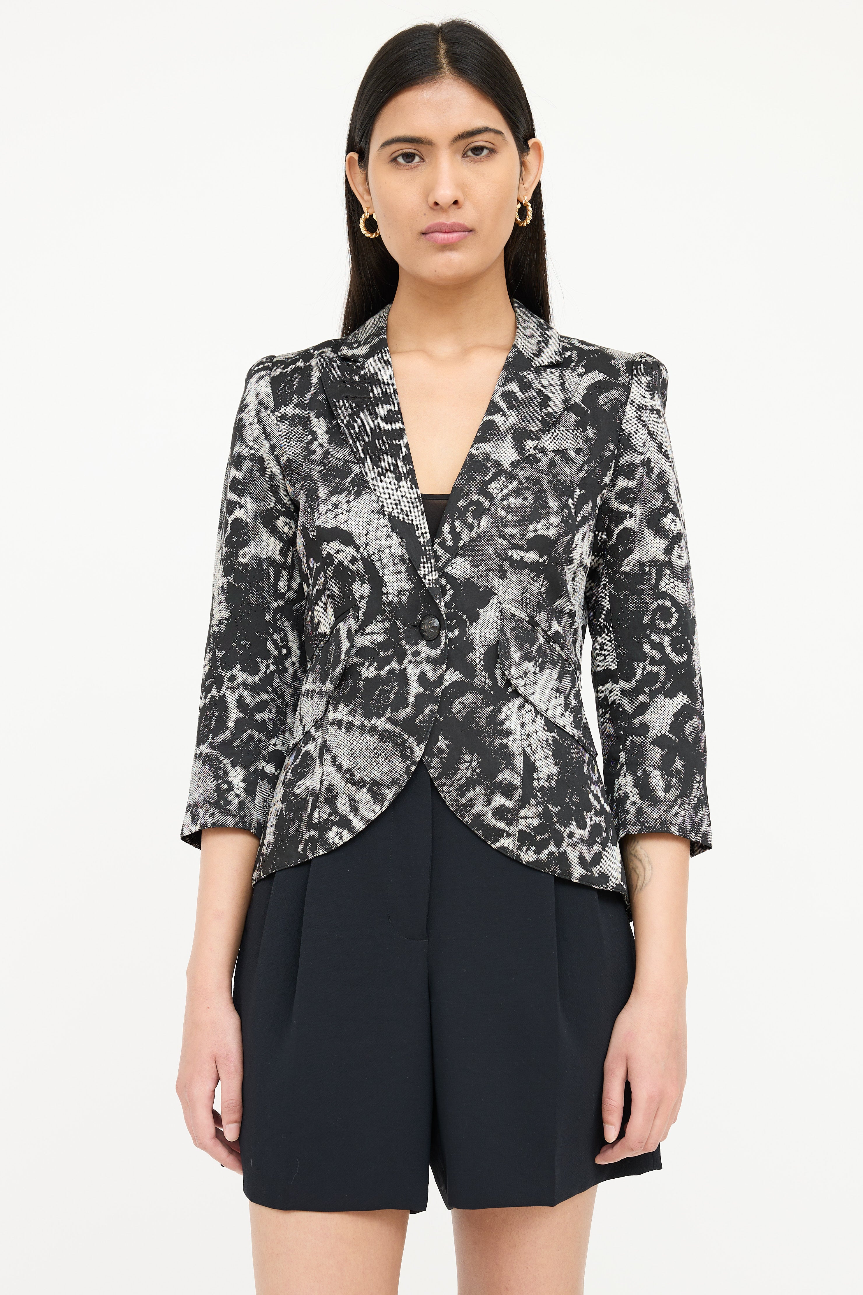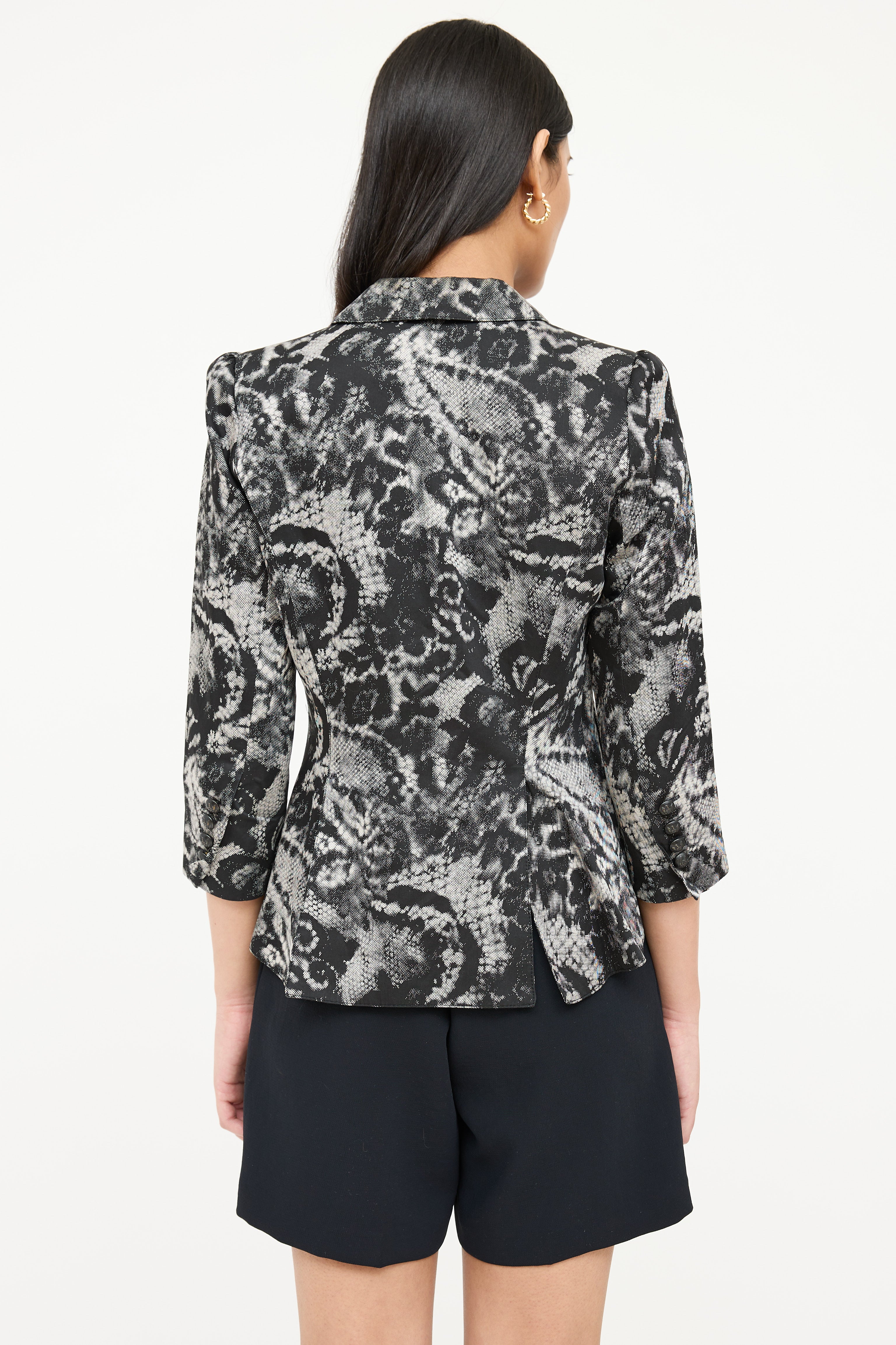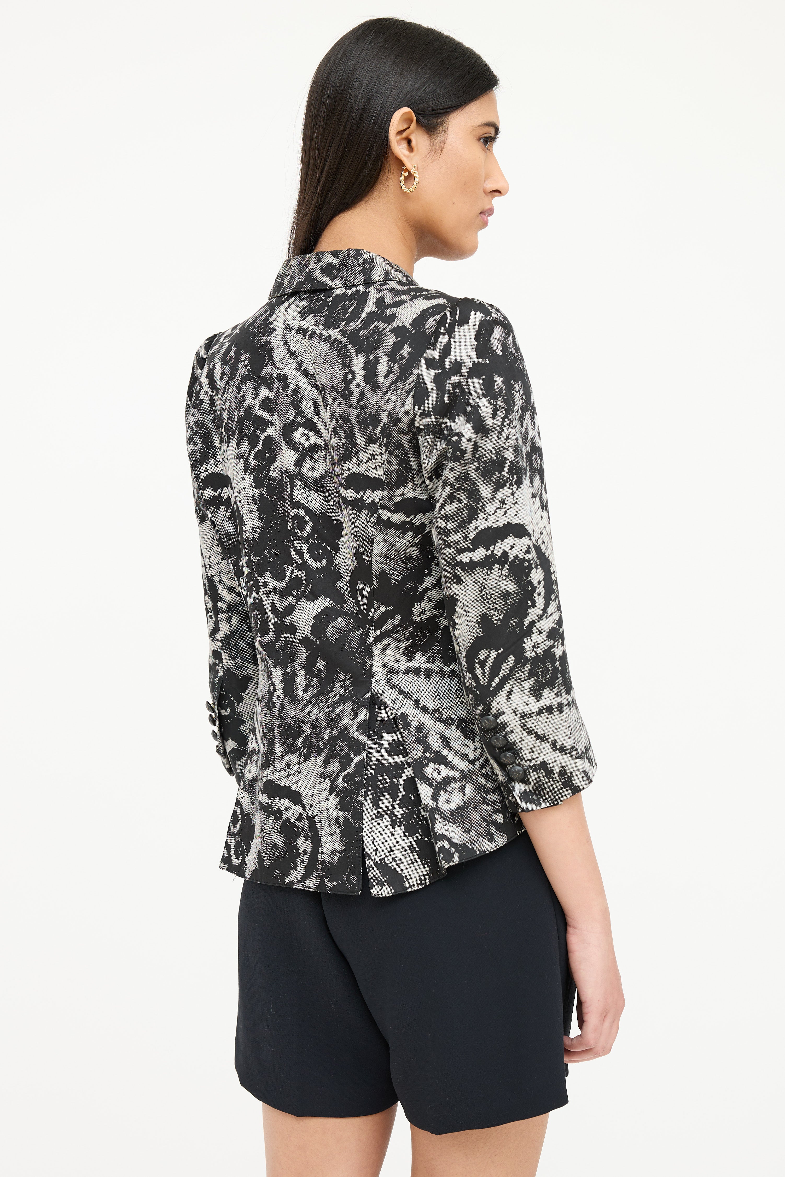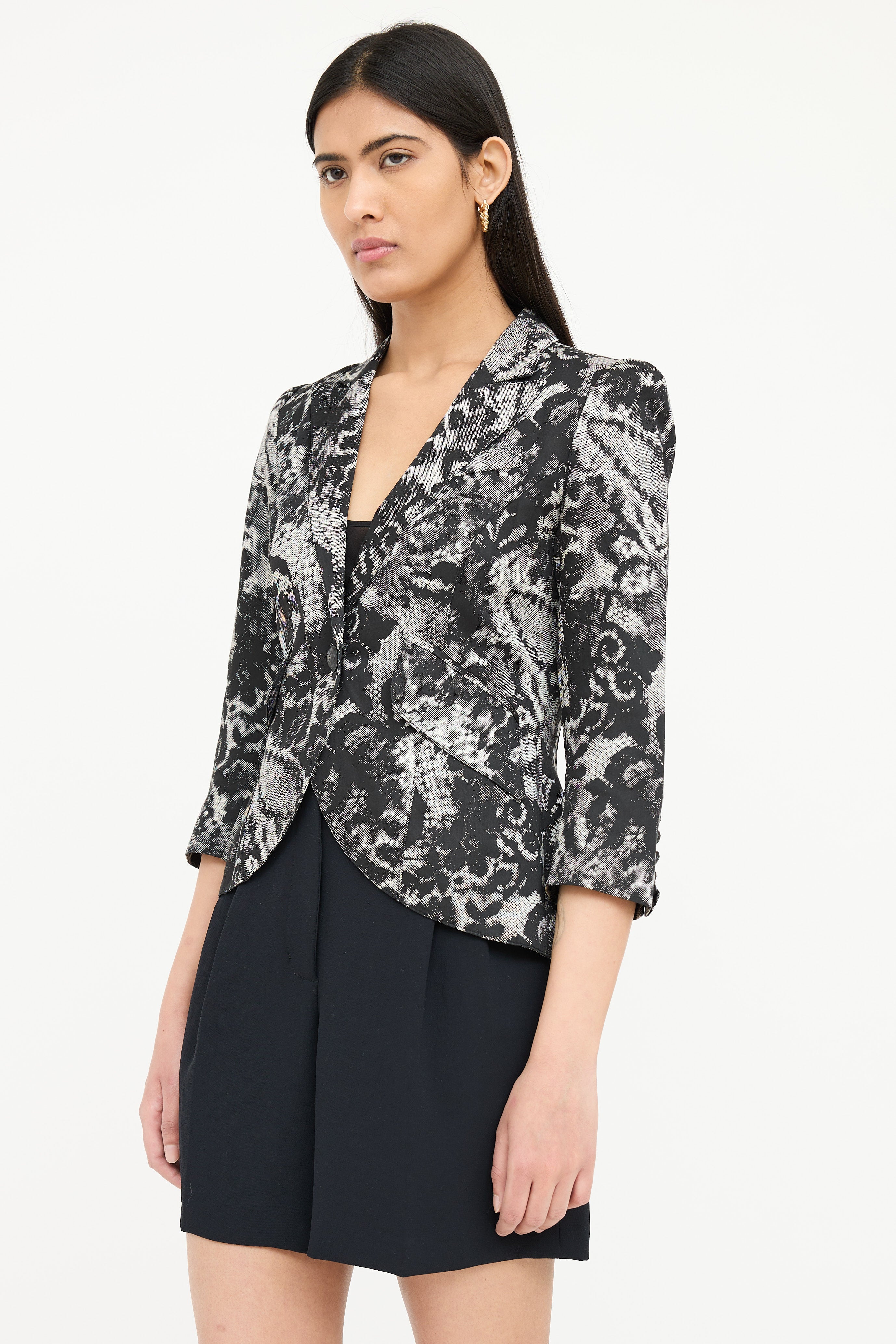 Pre-owned Smythe black and white One Button blazer featuring lace print, peak lapel, single button front, decorative welt at left chest, two front pockets, back double vent, three quarter sleeves, and buttoned cuffs. Lined.