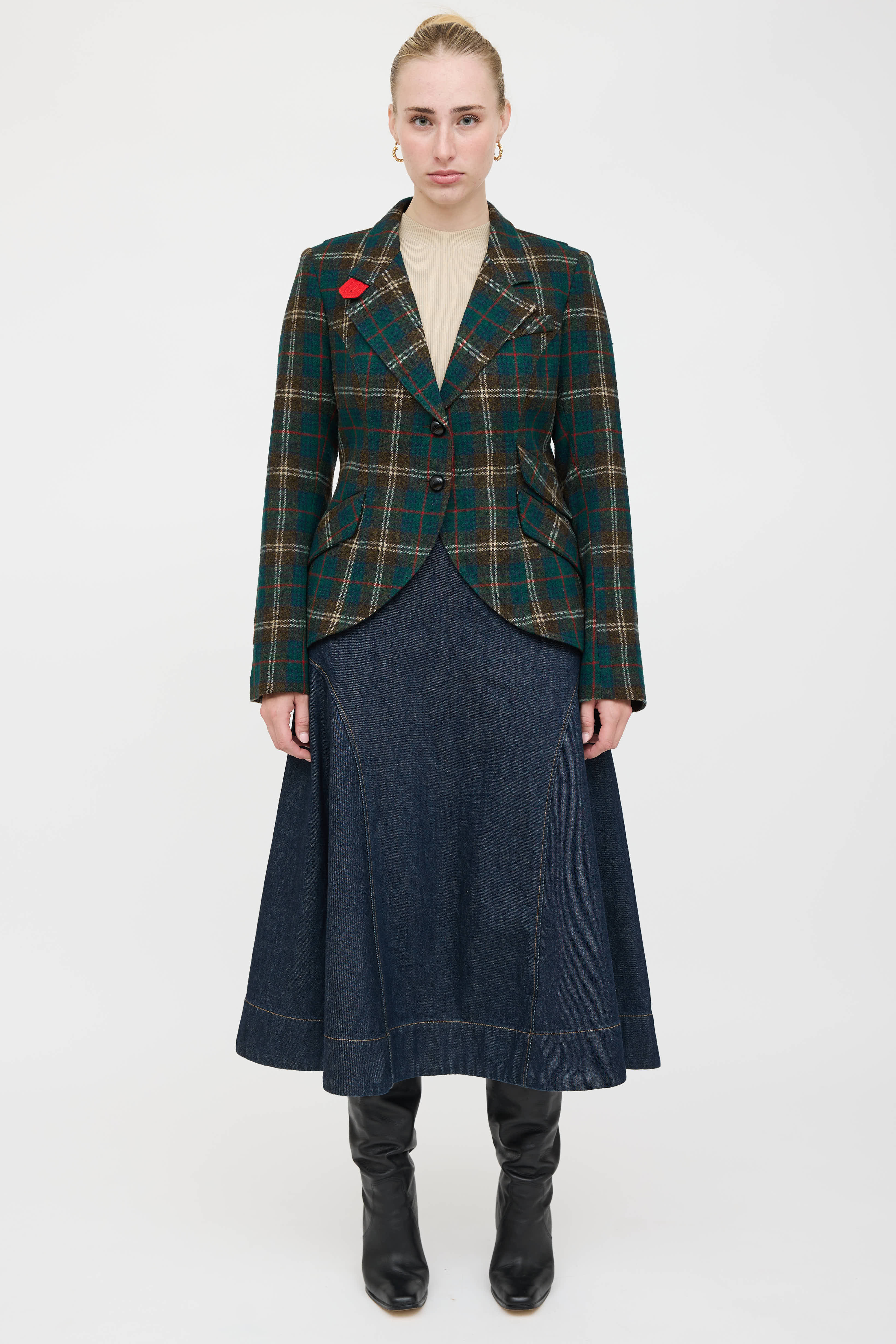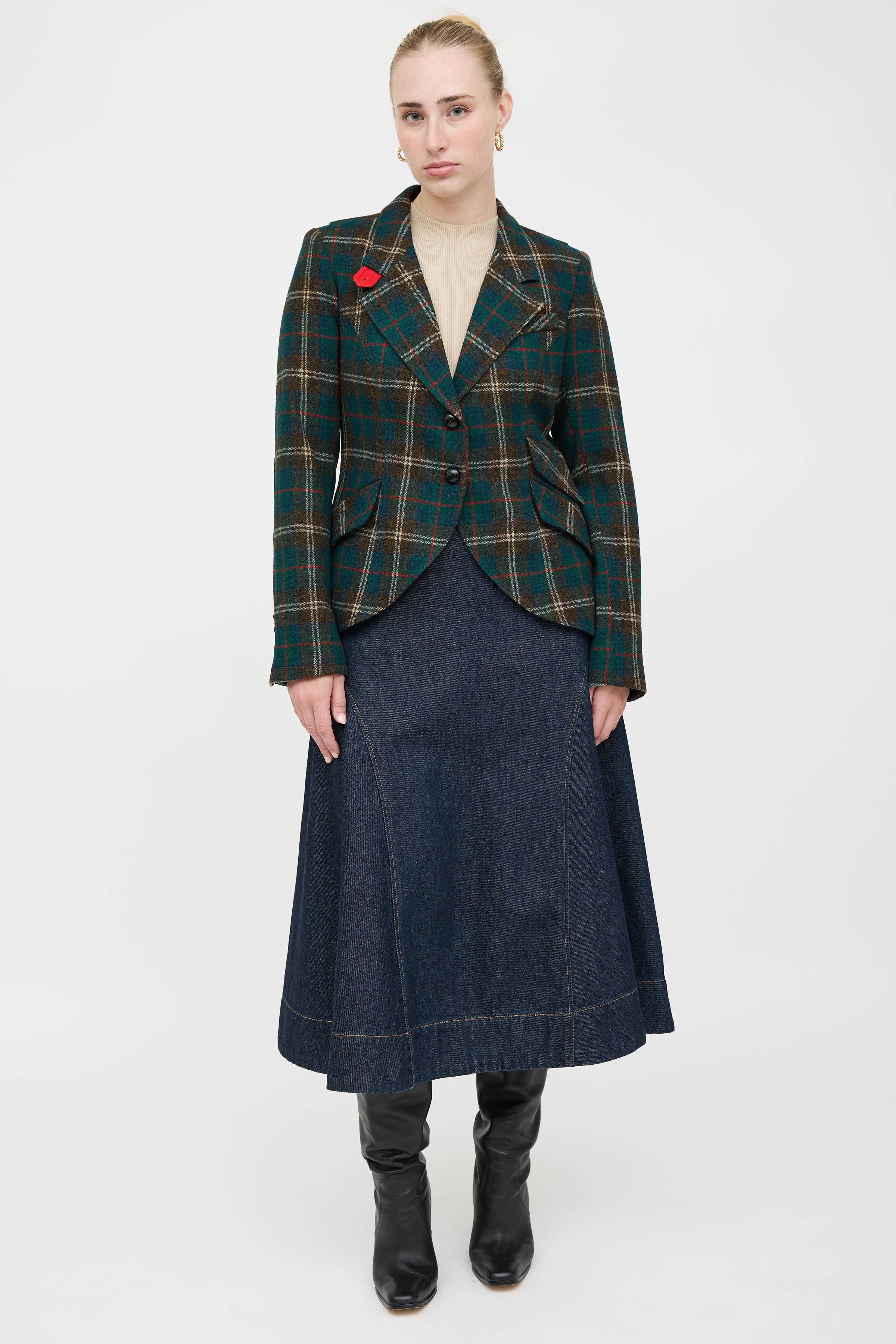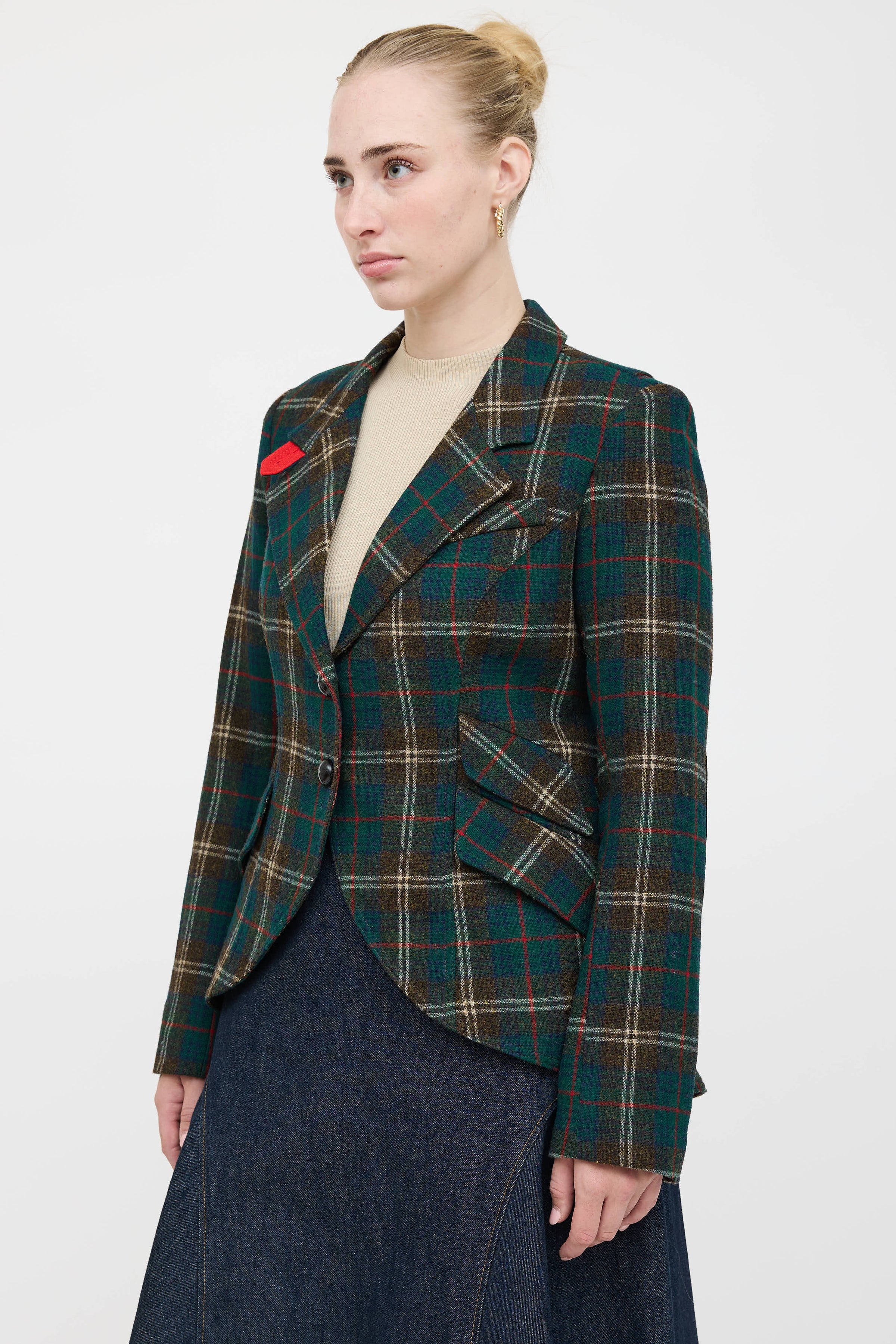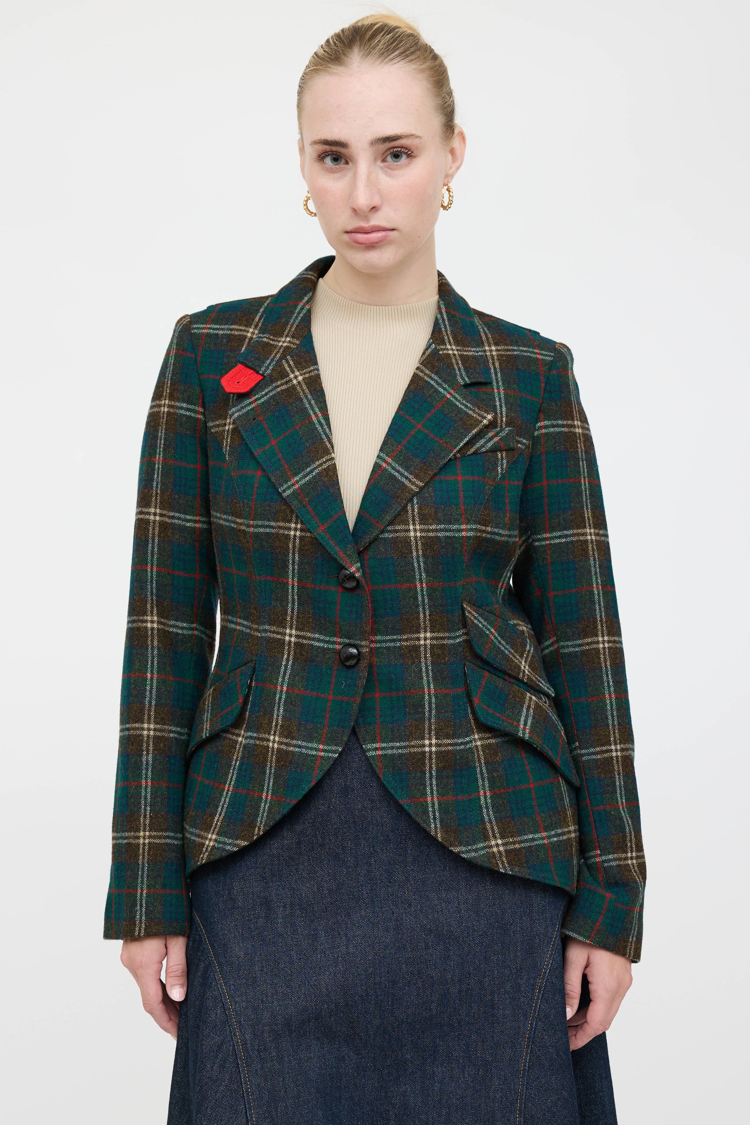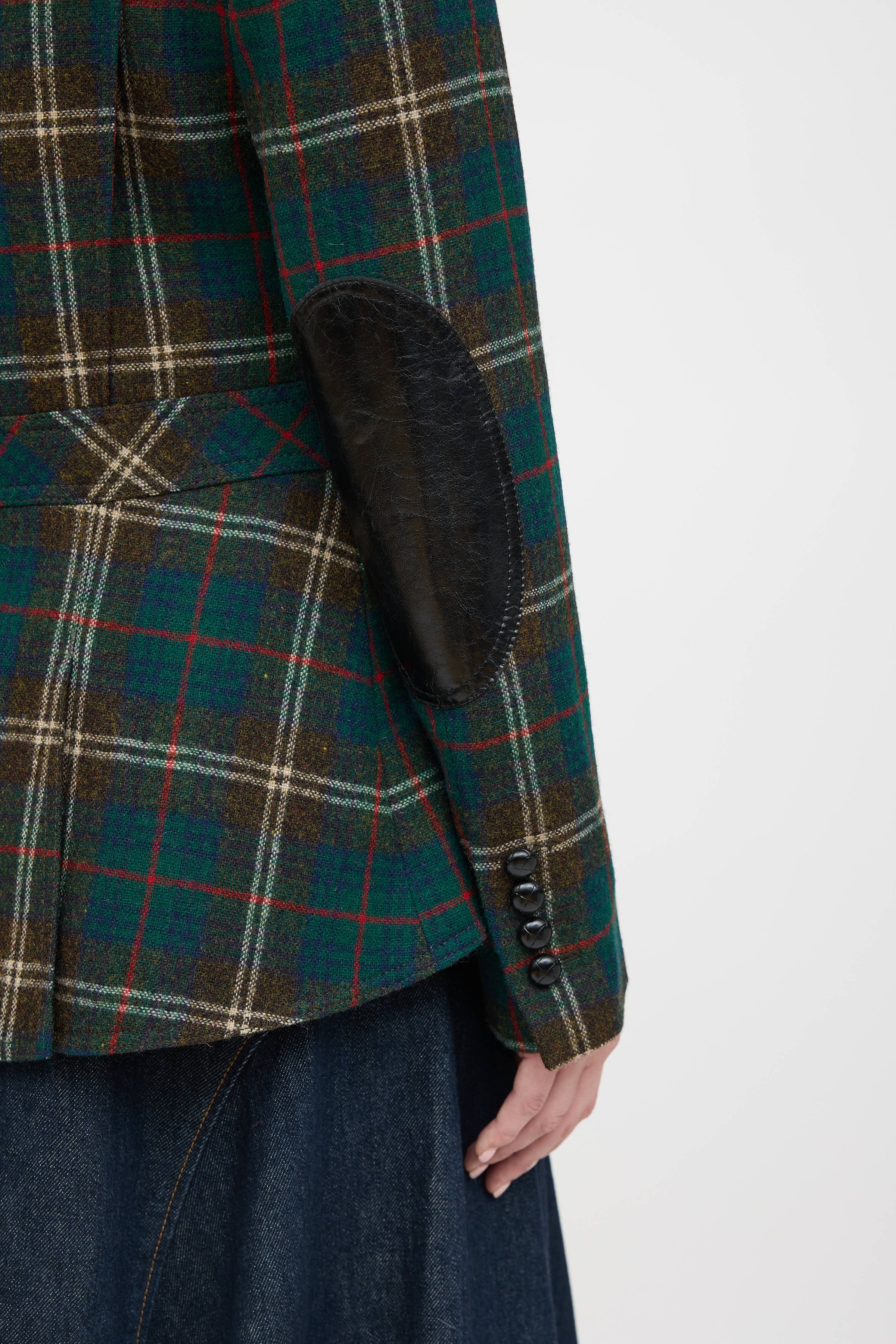 Pre-owned Smythe green and multicolor long sleeve blazer featuring notched lapel collar, dual button front, three flap pockets, leather elbow patches, buttoned cuffs, and back vent. Lined