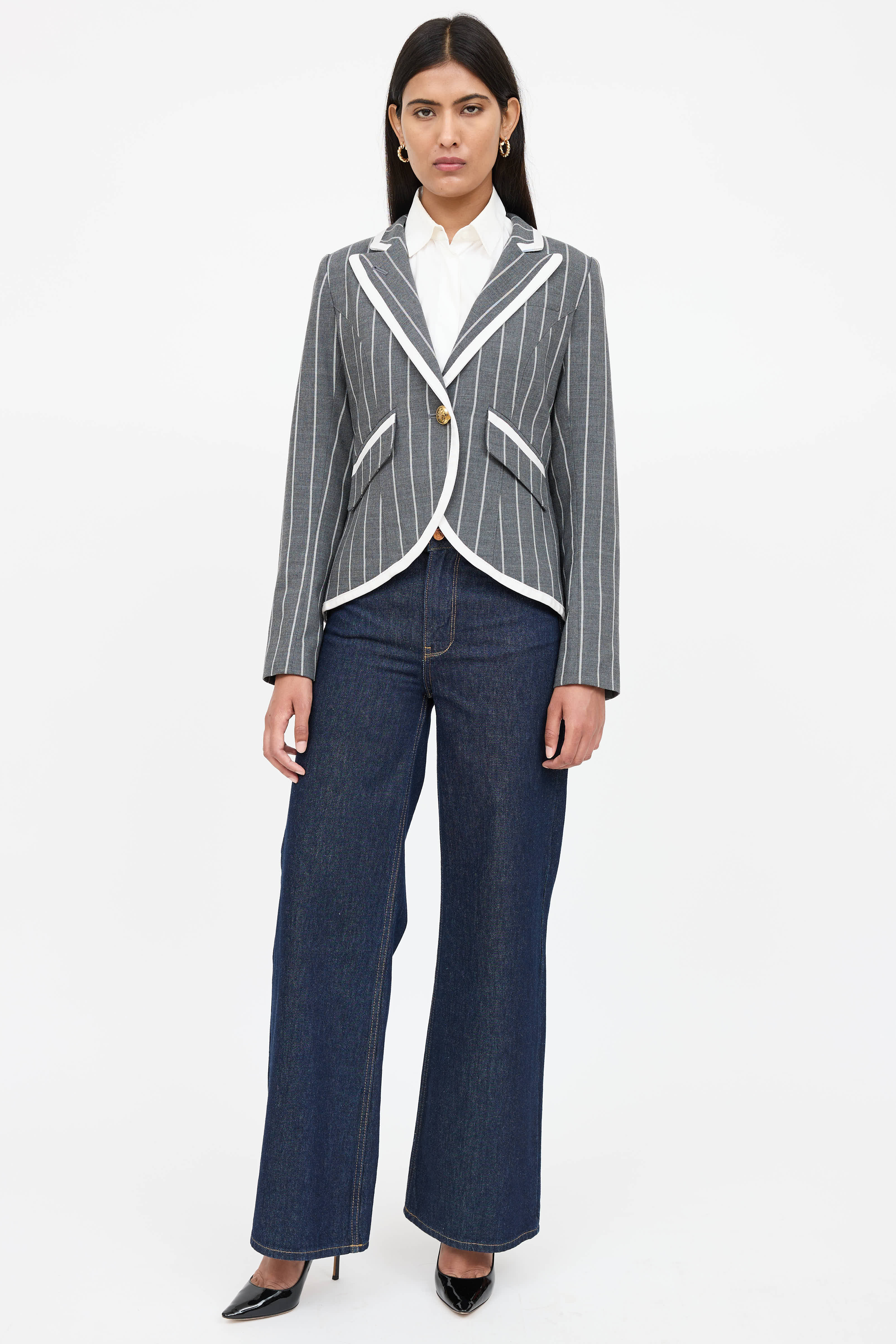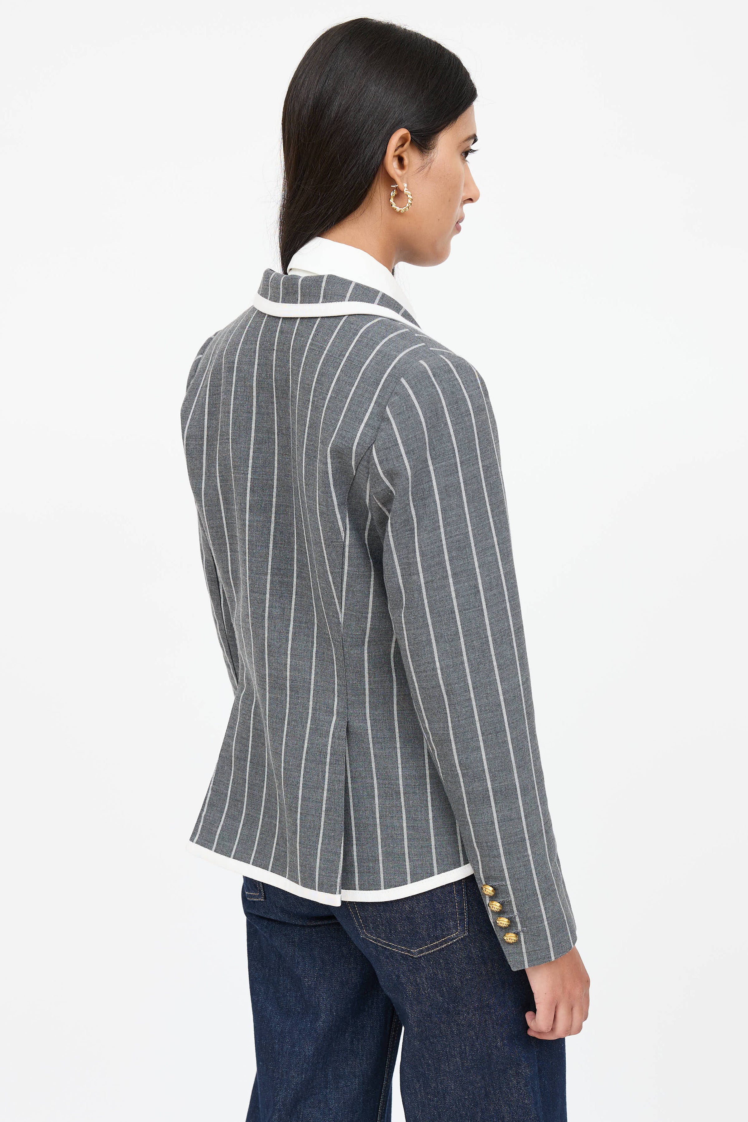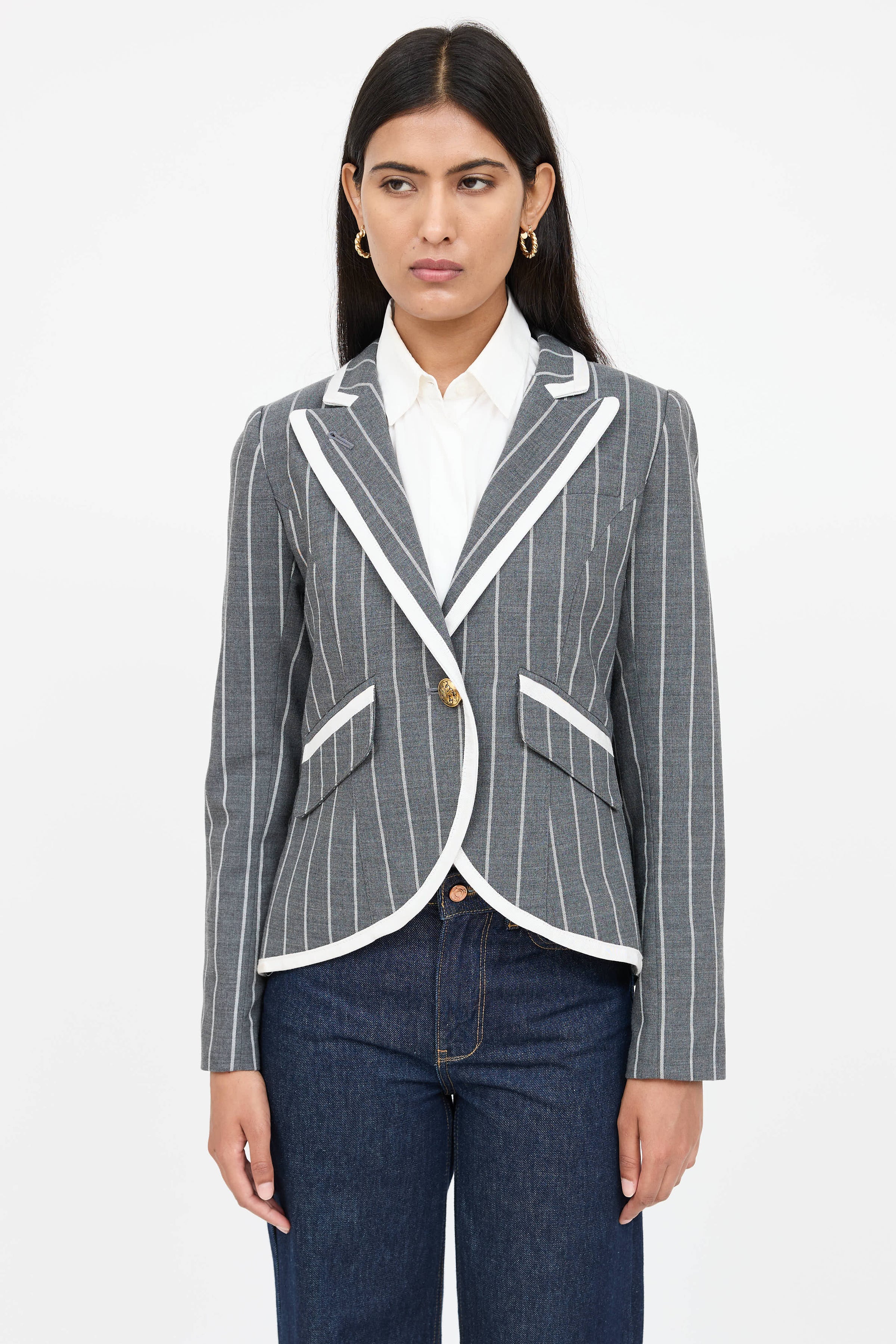 Pre-owned Smythe grey and white striped long sleeve blazer featuring peak lapel collar, gold tone embellishment button front, white trim throughout, decorative welt pocket at chest, flap pockets at side, buttoned cuffs, and back vent. Lined.