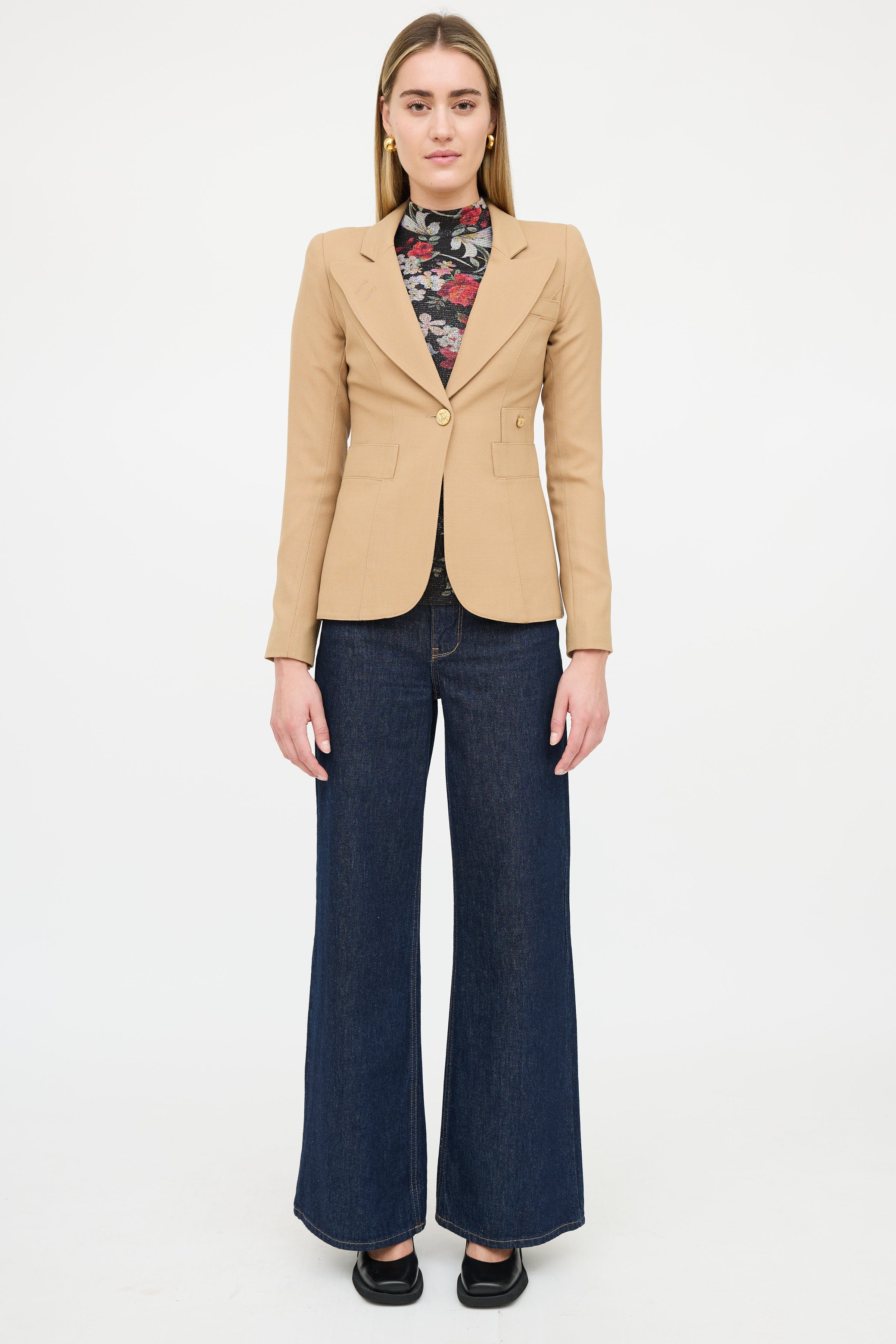 Pre-owned Smythe beige wool Duchess blazer featuring a peak lapel, long sleeves with buttoned cuffs, one faux welt pocket at chest, three patch pockets at hip, high low hem, and gold tone button closure. Lined.