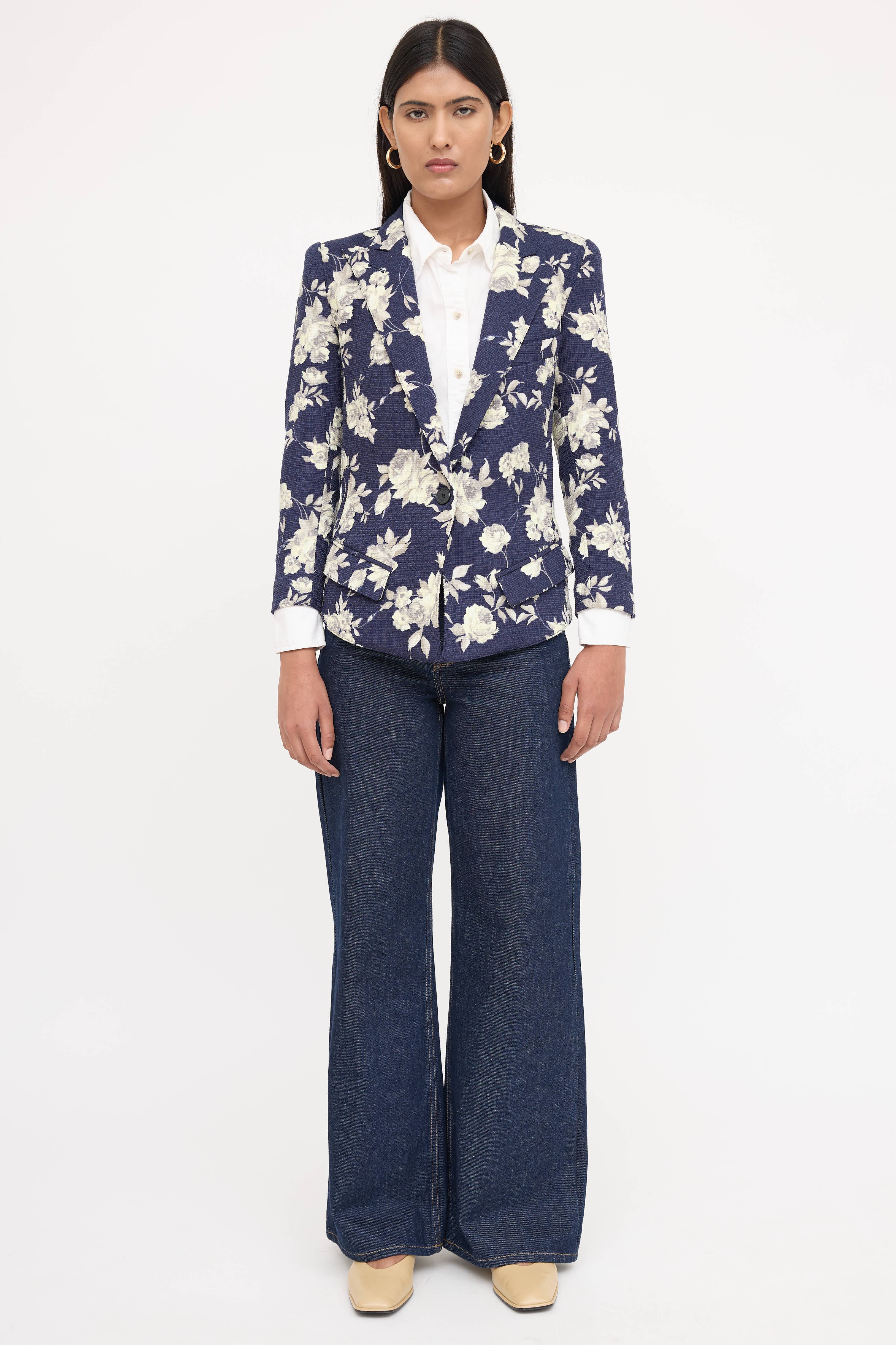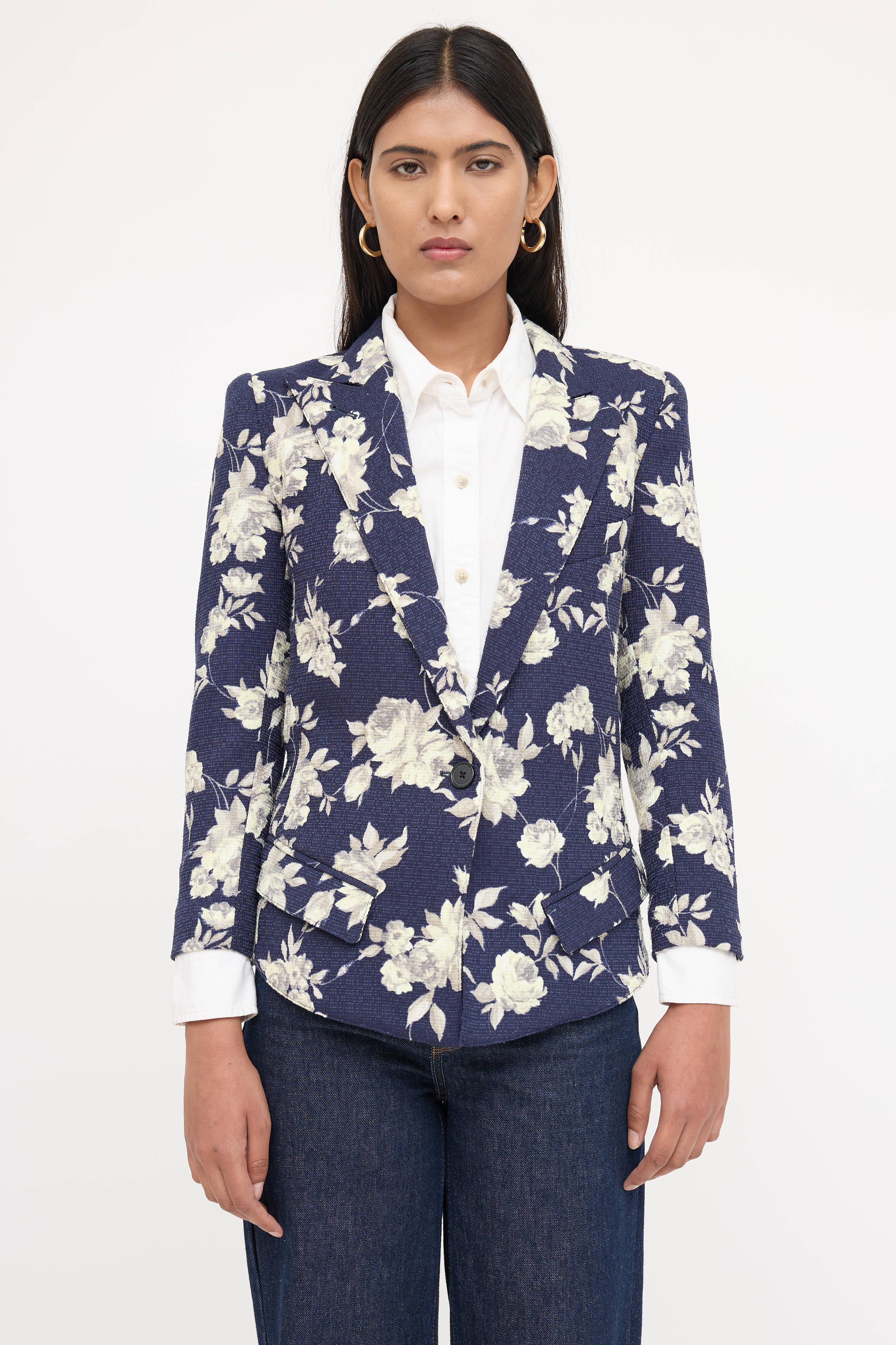 Pre-owned Smythe navy and multicolor floral long sleeve blazer featuring peak lapel collar, shoulder pads, welt pocket at chest, button front, flap pockets at front, buttoned cuffs, and high low hemline. Lined.