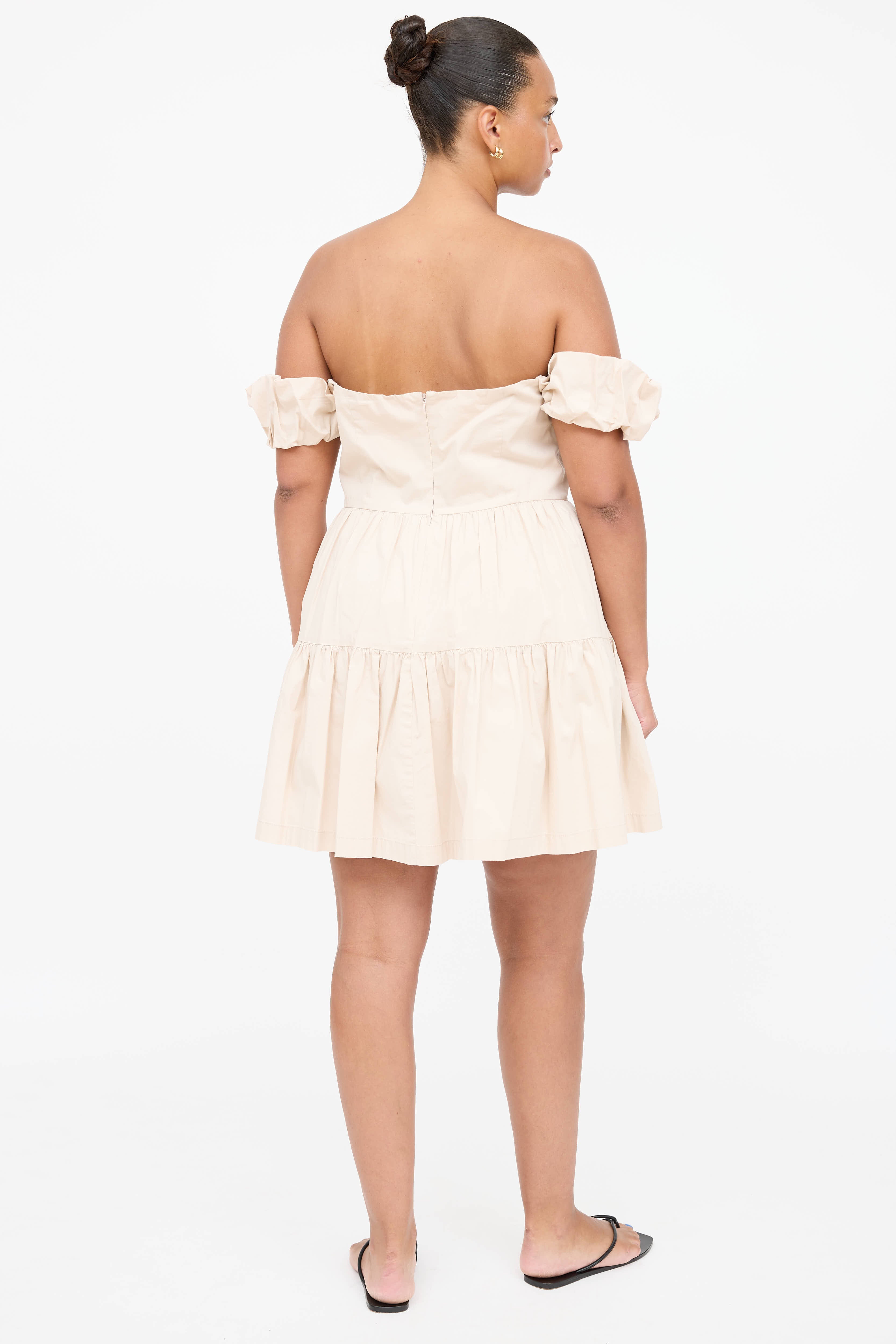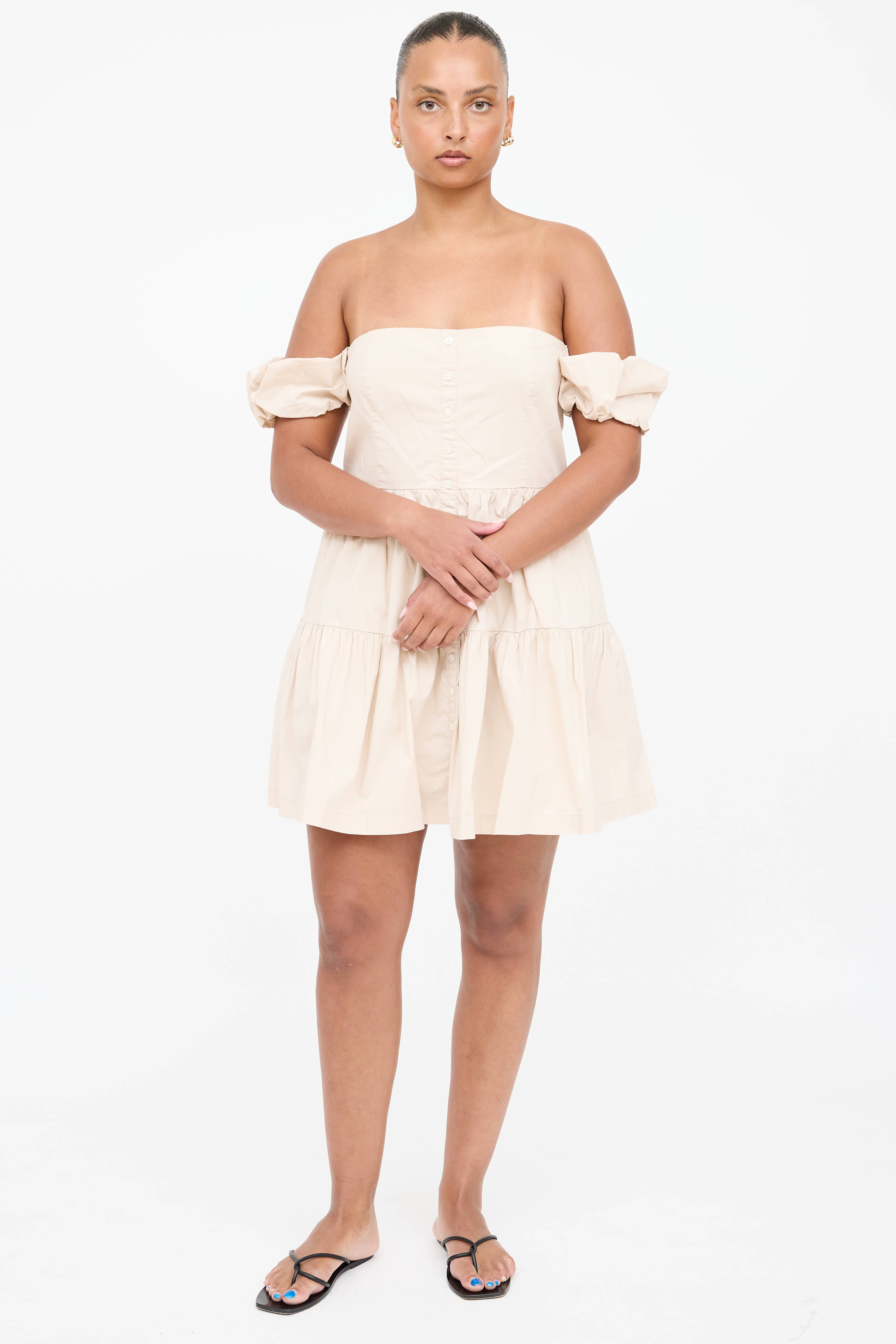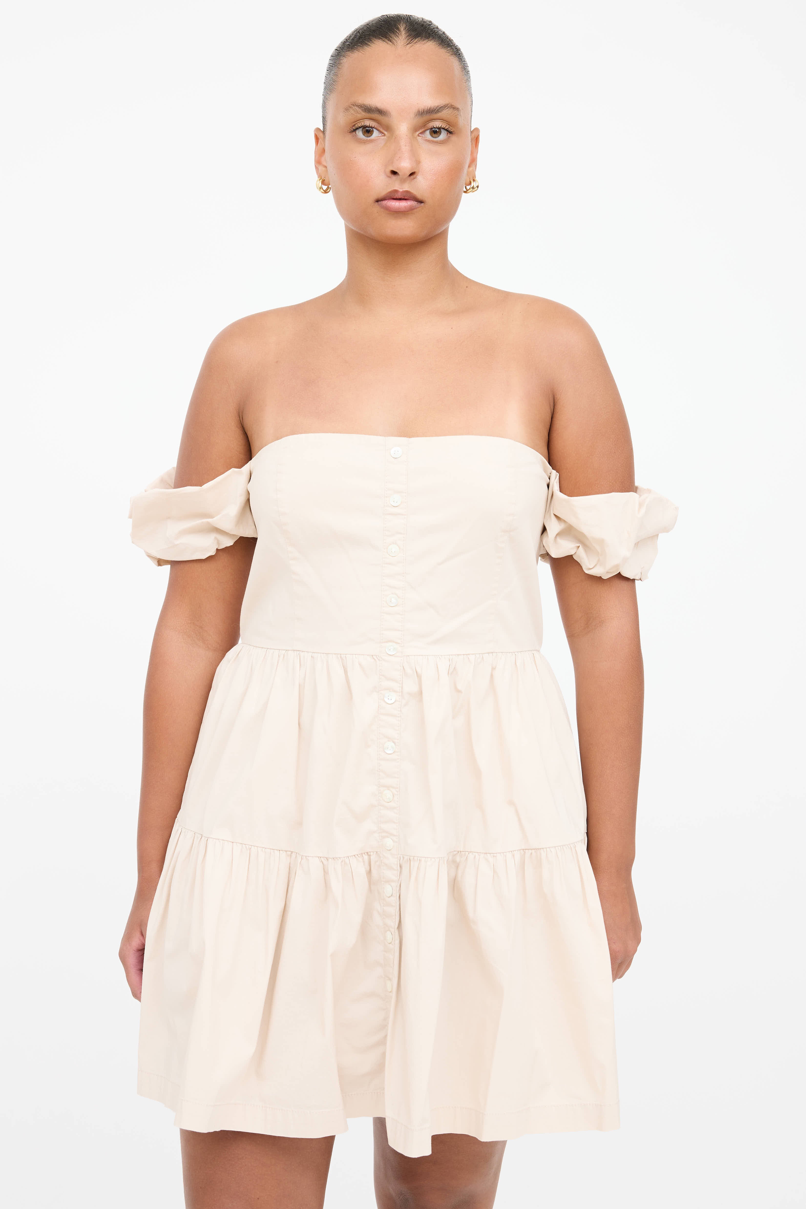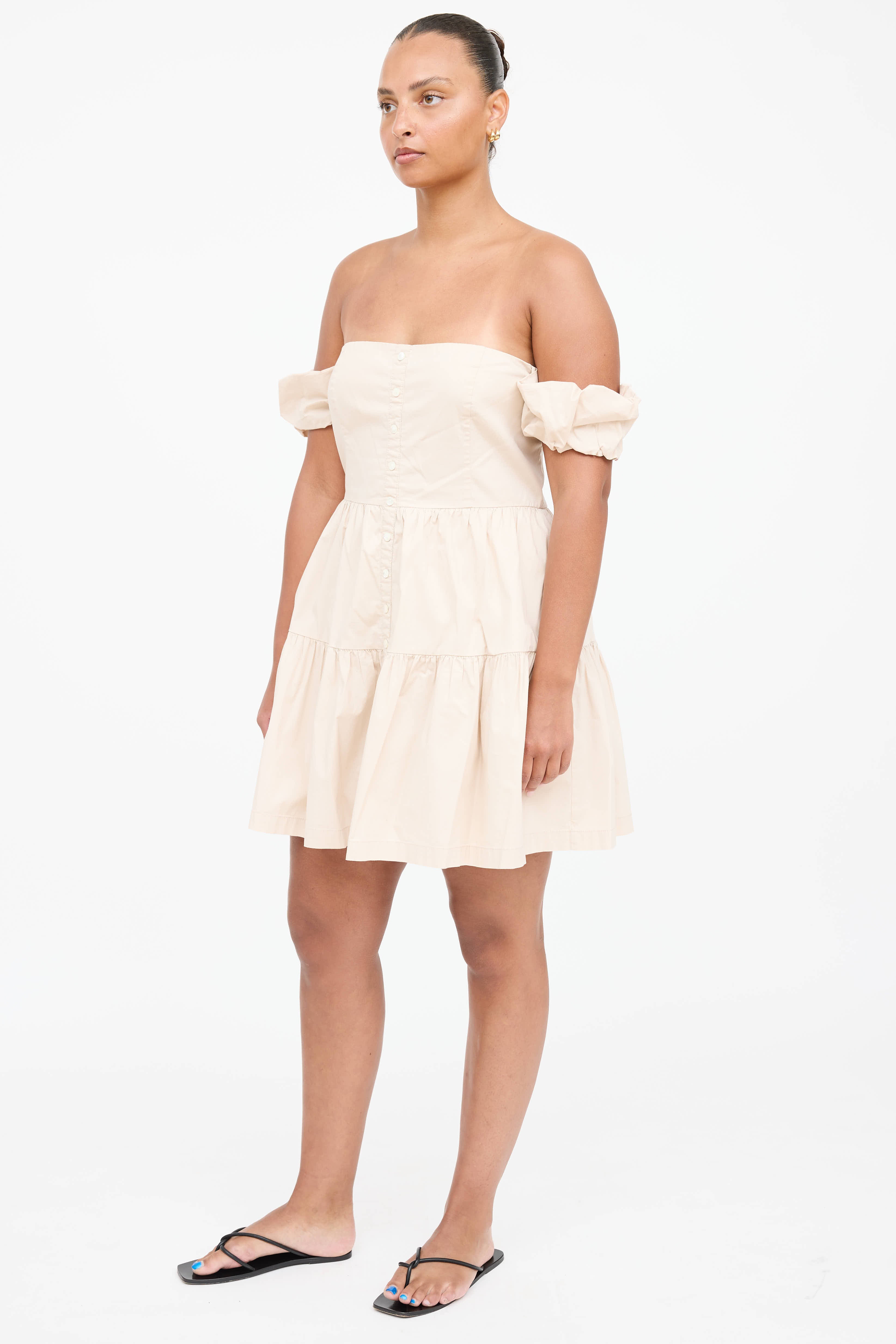 Pre-owned Staud beige dress featuring a straight across neckline, ruffled sleeveless styling, tiered gathered skirt, button up front, and zip closure at back. Lined.
