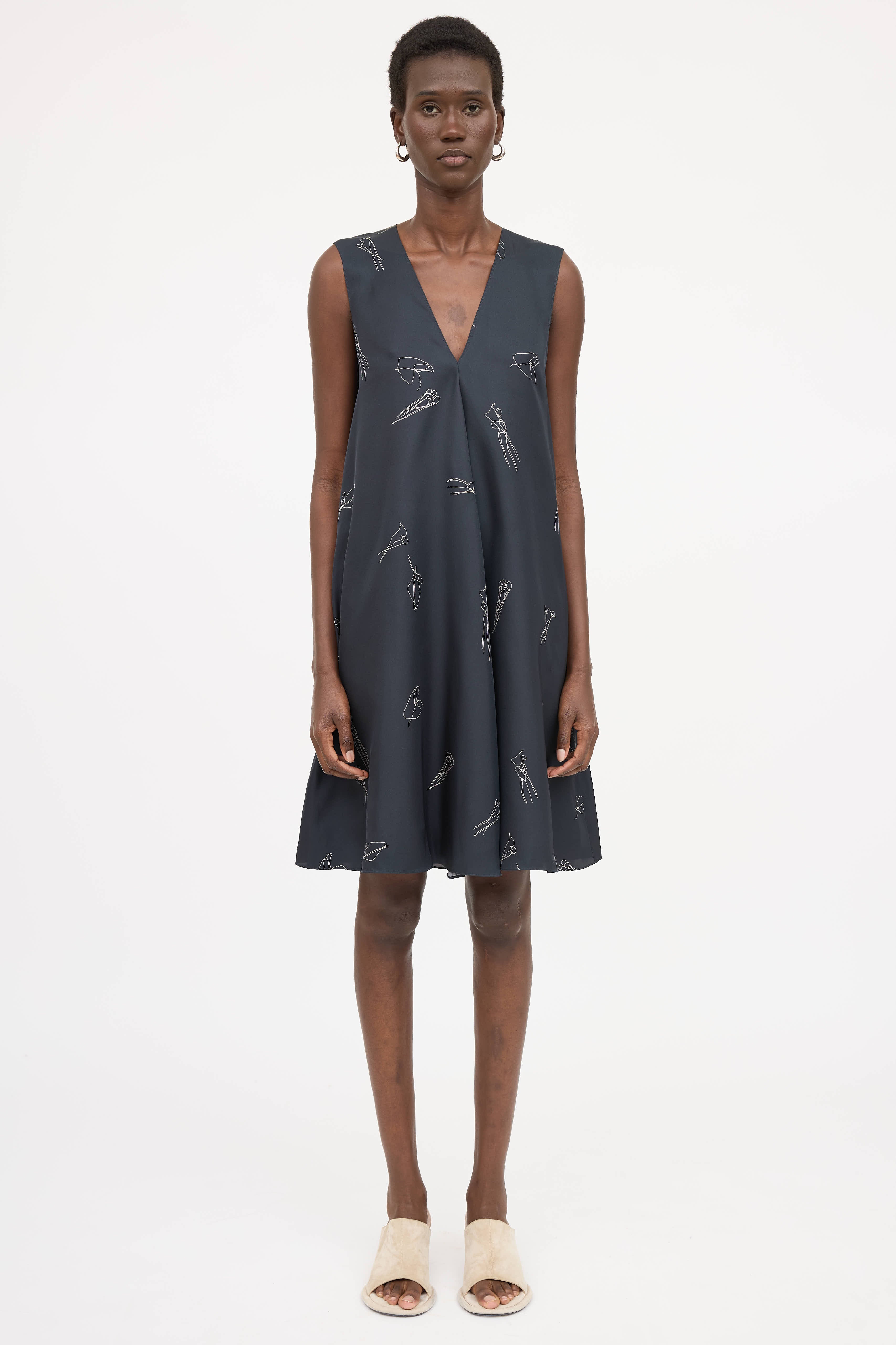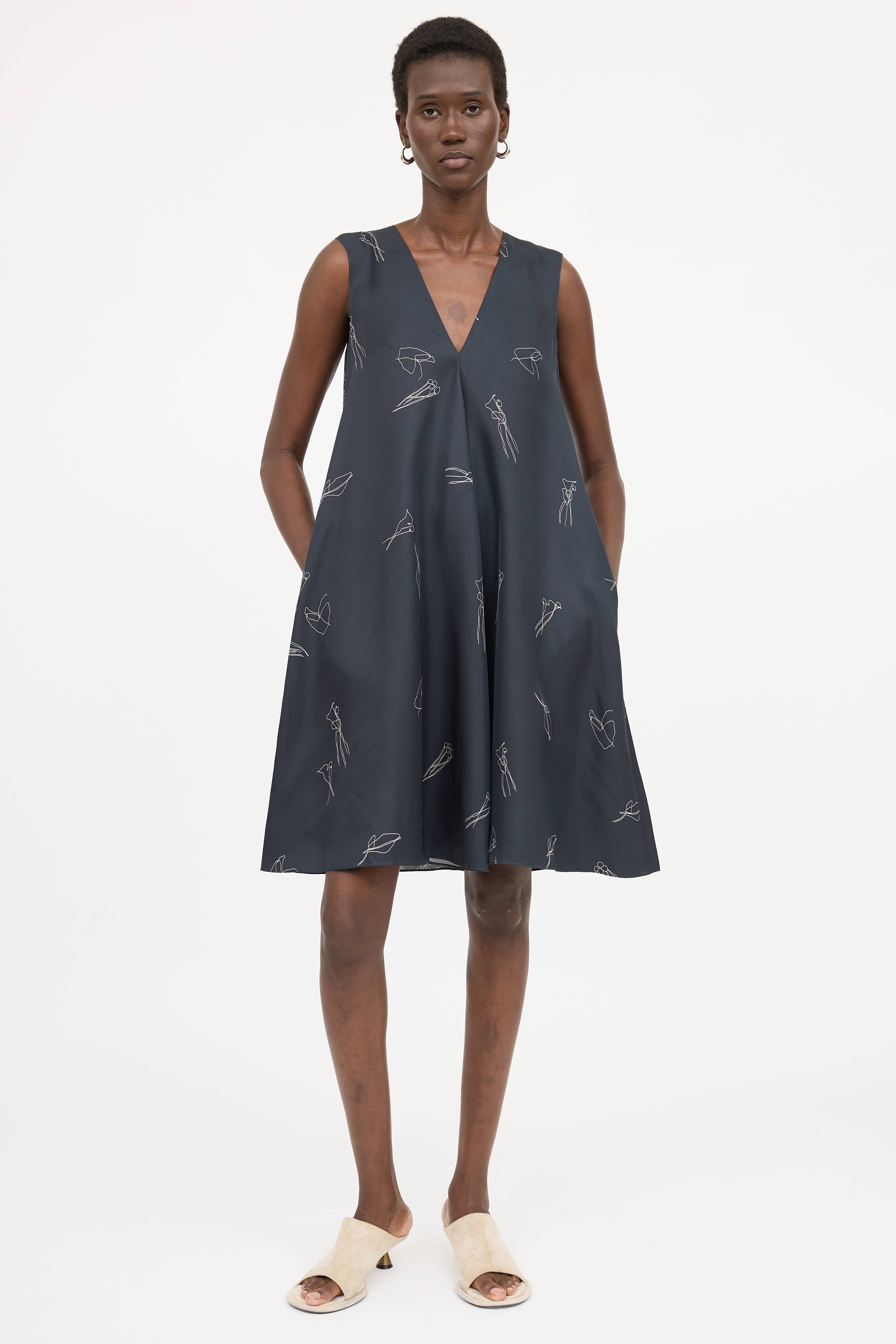 Pre-owned Theory black silk dress featuring V-neckline, A line styling, slip pockets at sides and printed graphic throughout.