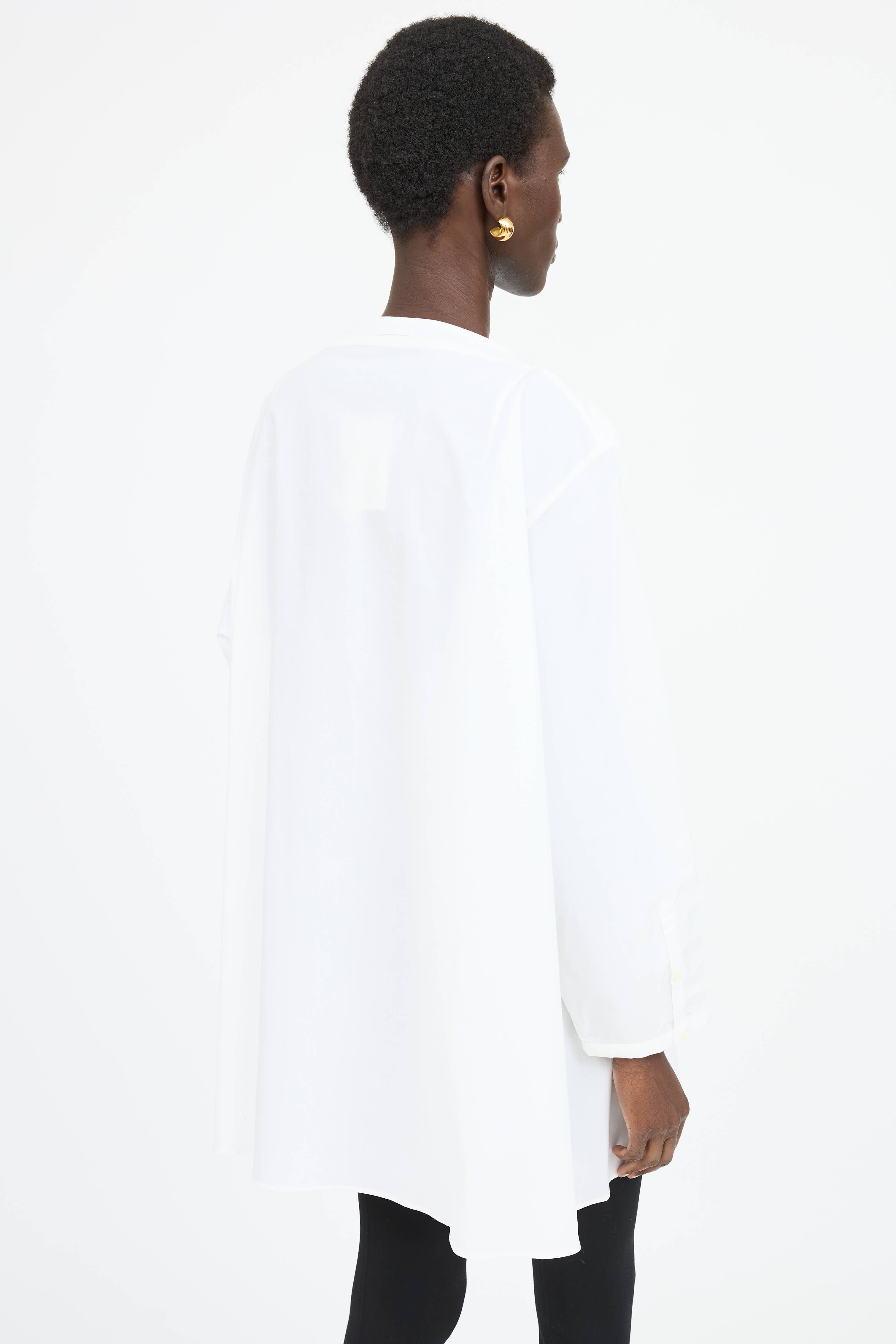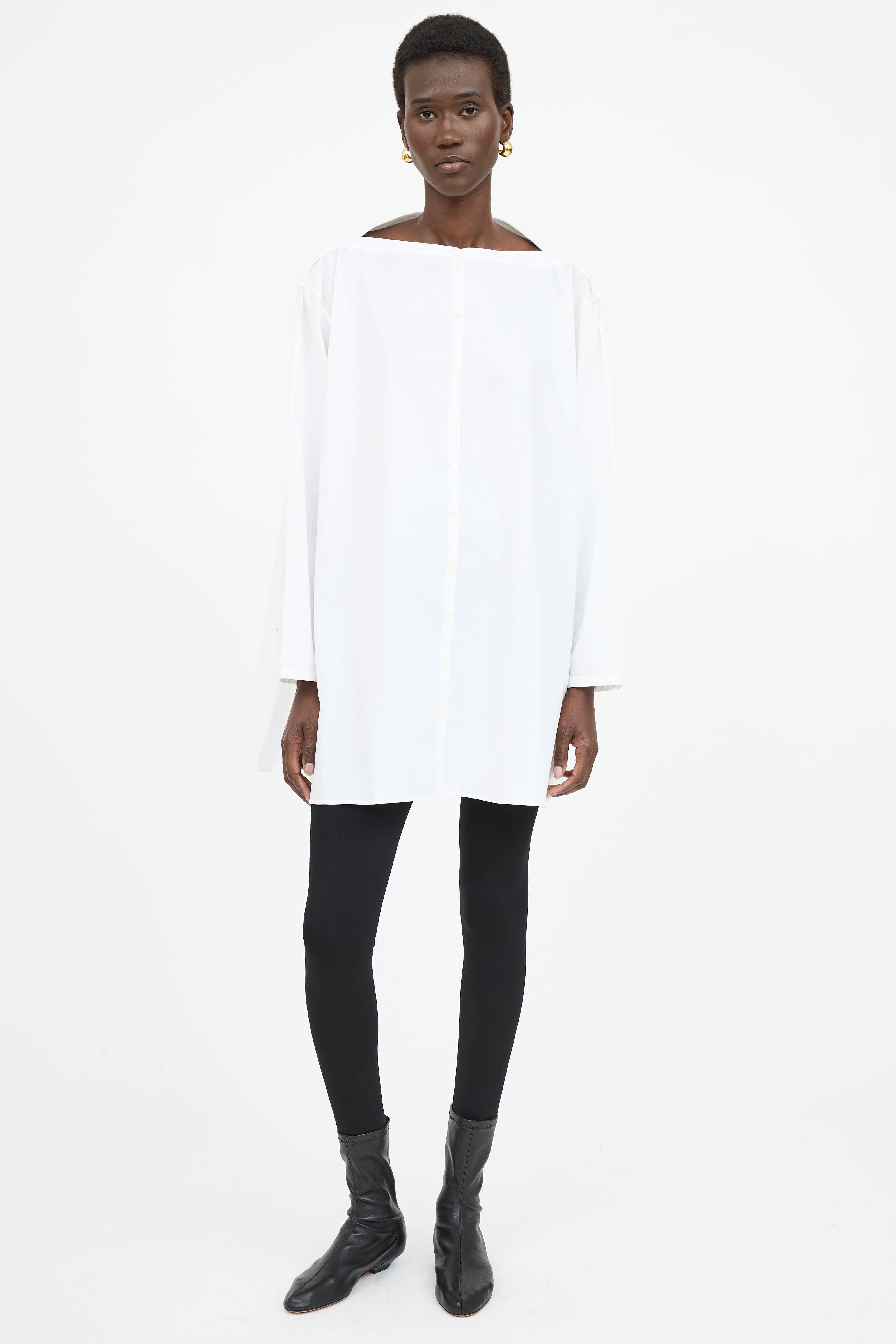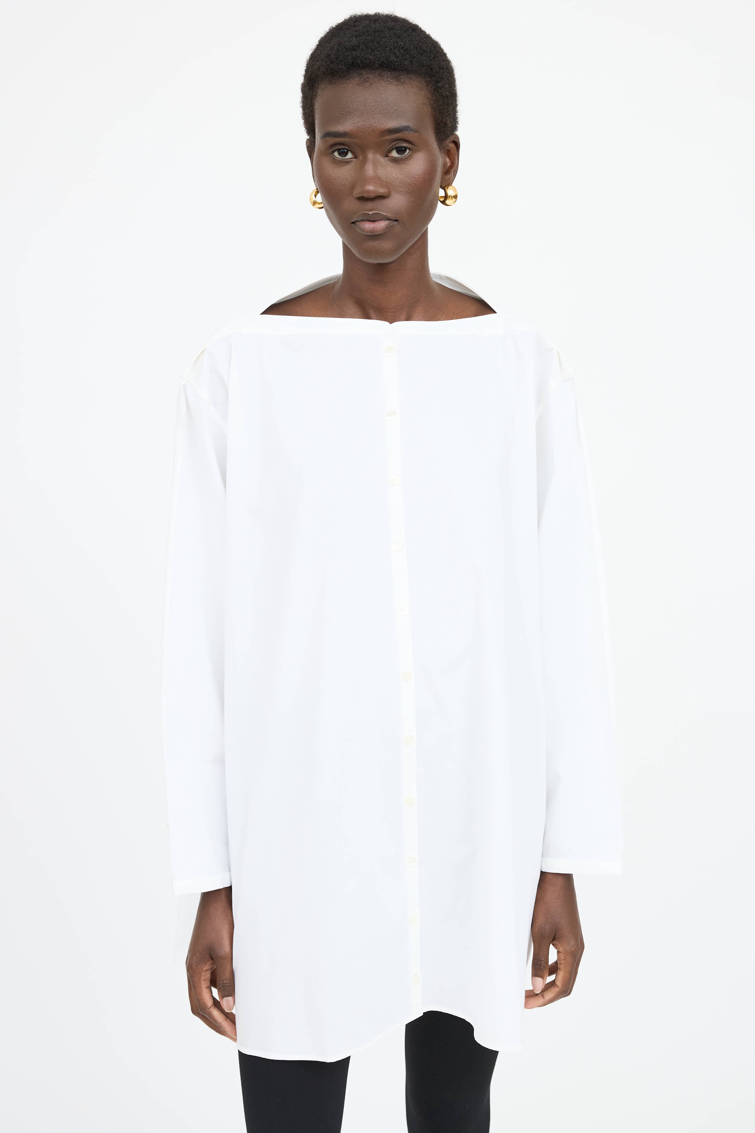 Pre-owned Toteme white long sleeve mini dress featuring boat neckline, button front, and buttoned cuffs.