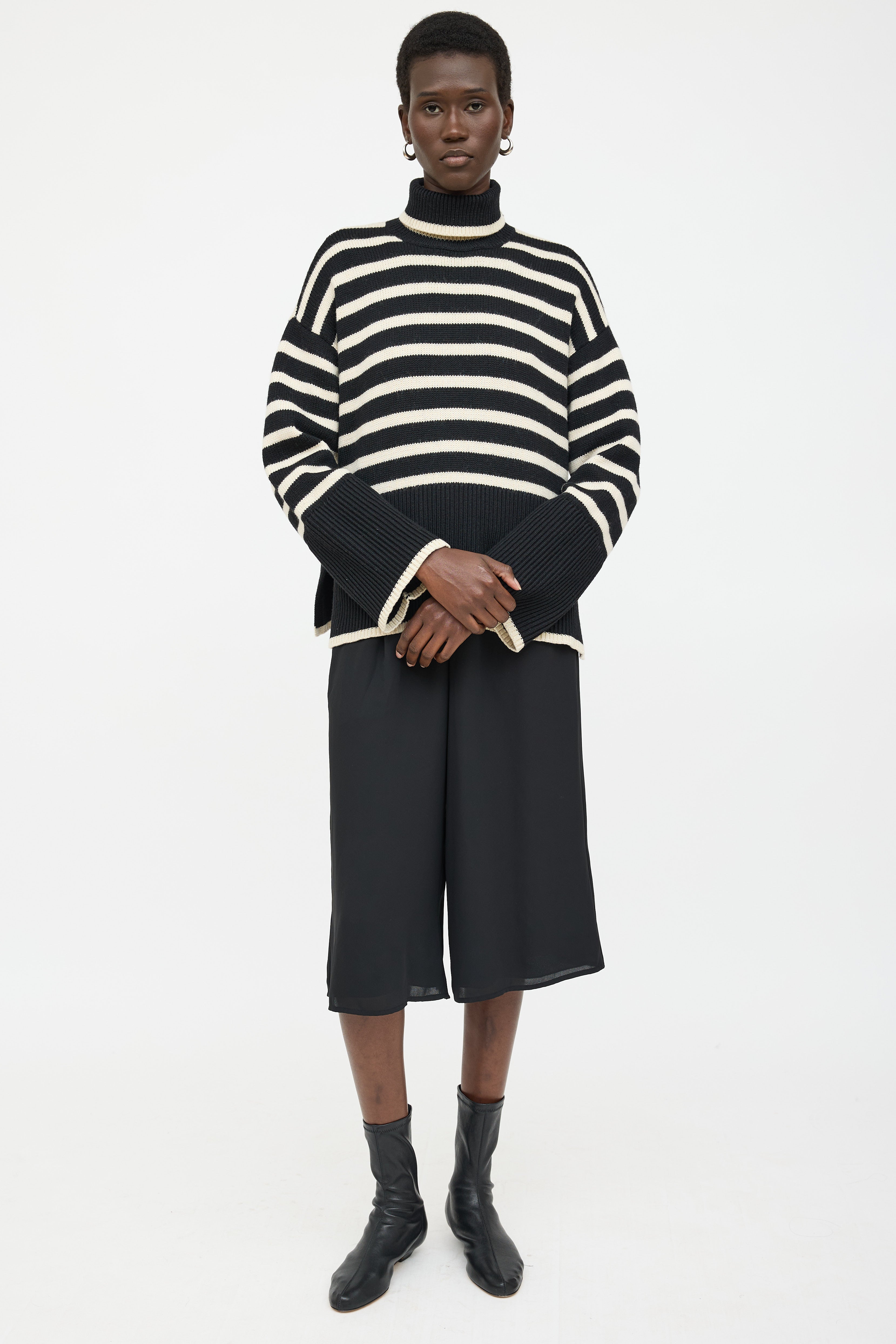 Pre-owned Toteme black wool knit sweater featuring a white striped pattern throughout, turtleneck, long sleeves, and ribbed hem with slits at sides.