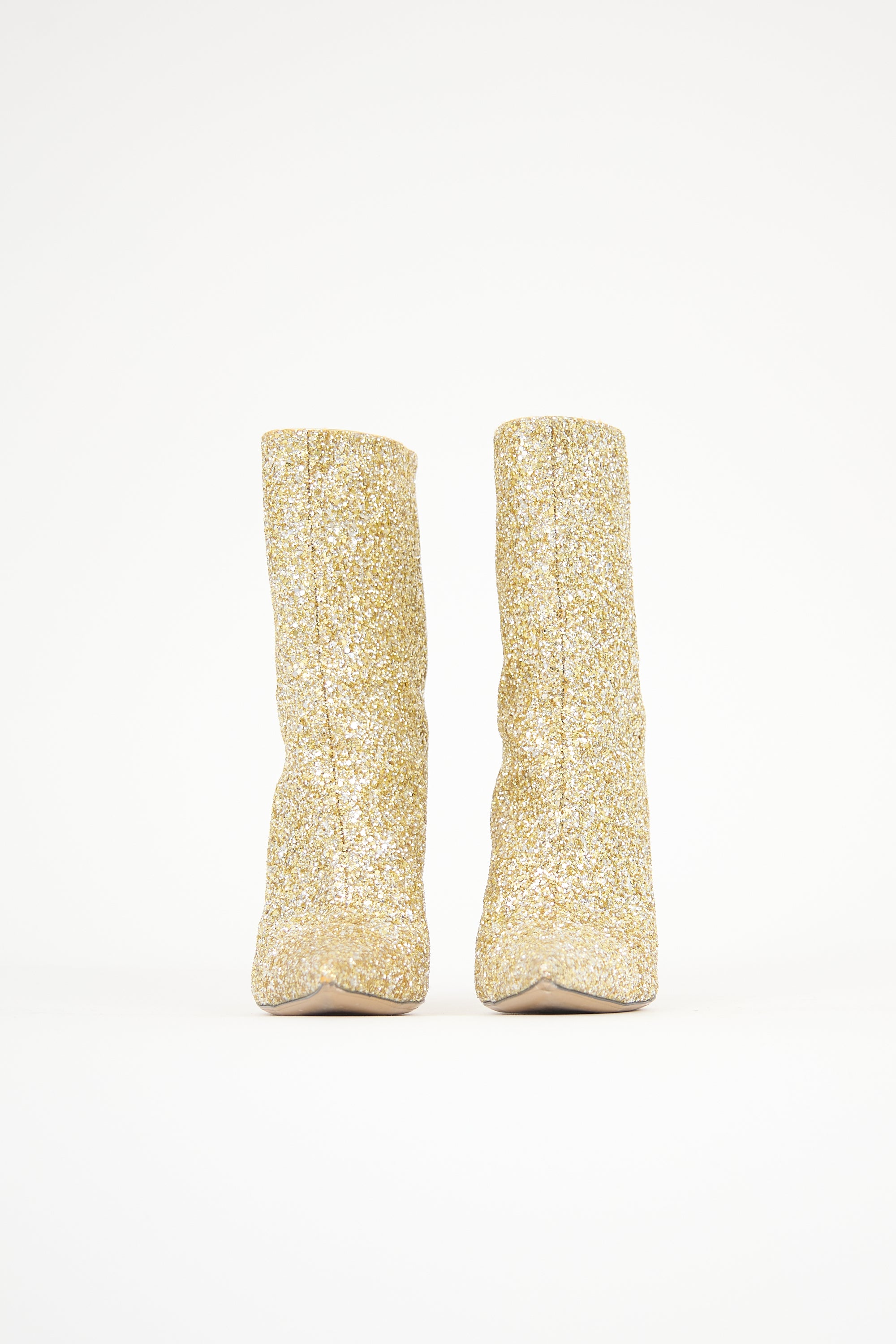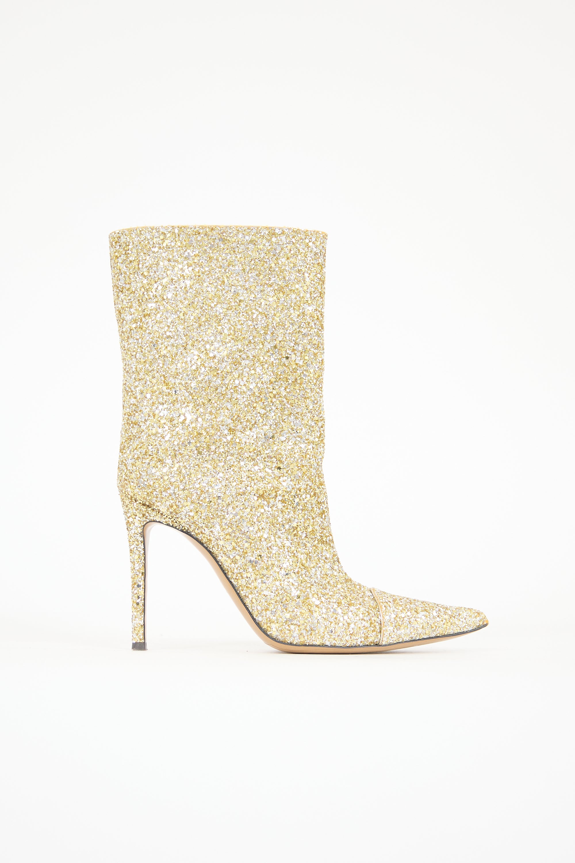 Pre-owned Alexandre Vauthier gold glitter Alex mid calf boots featuring a pointed toe, tonal toe cap, pull on entry, and covered stiletto heel.
