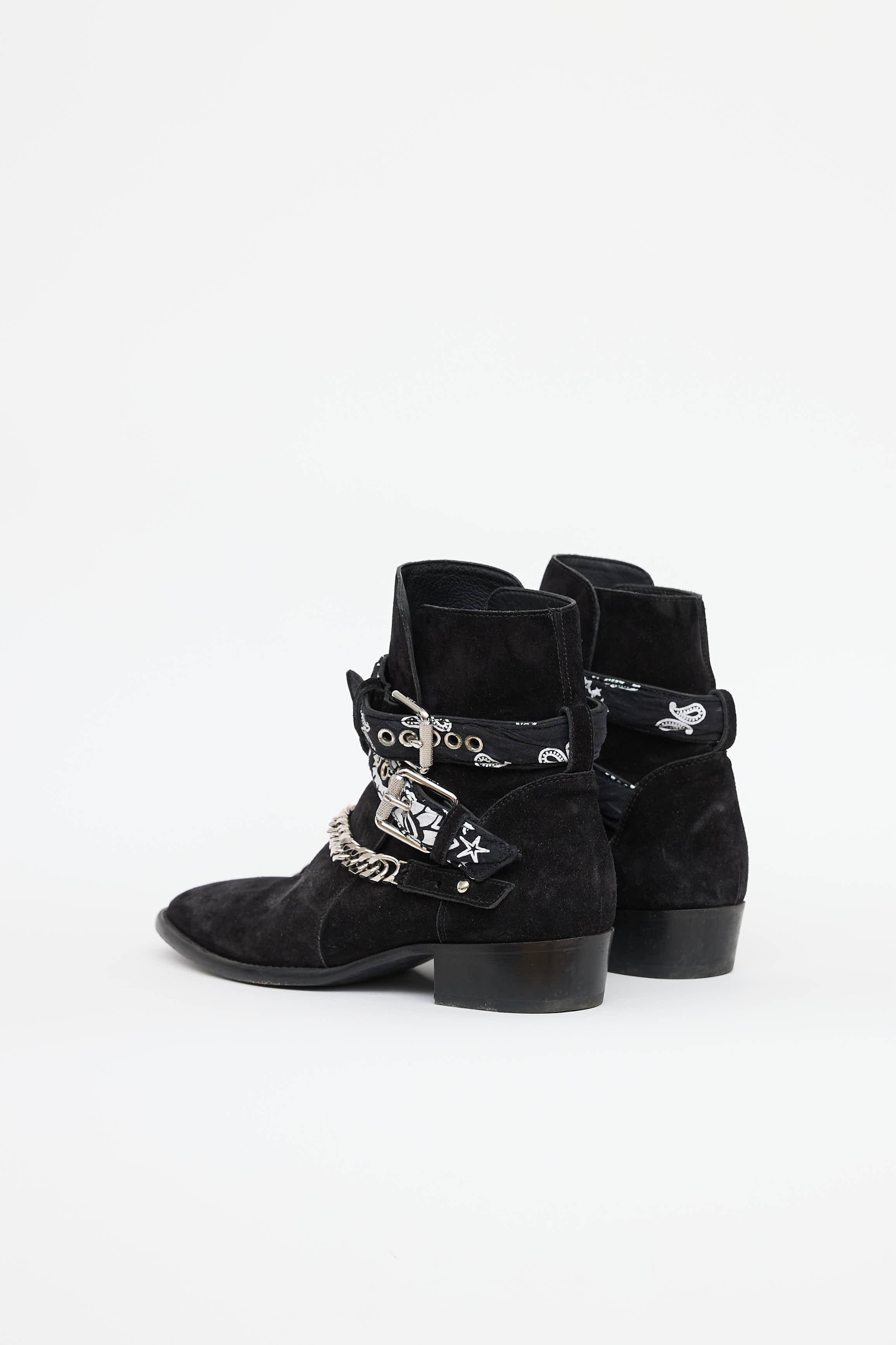 Pre-owned Amiri black suede western ankle boot featuring almond toe, stacked heel, chain at vamp, silver tone hardware, and adjustable straps at ankle.