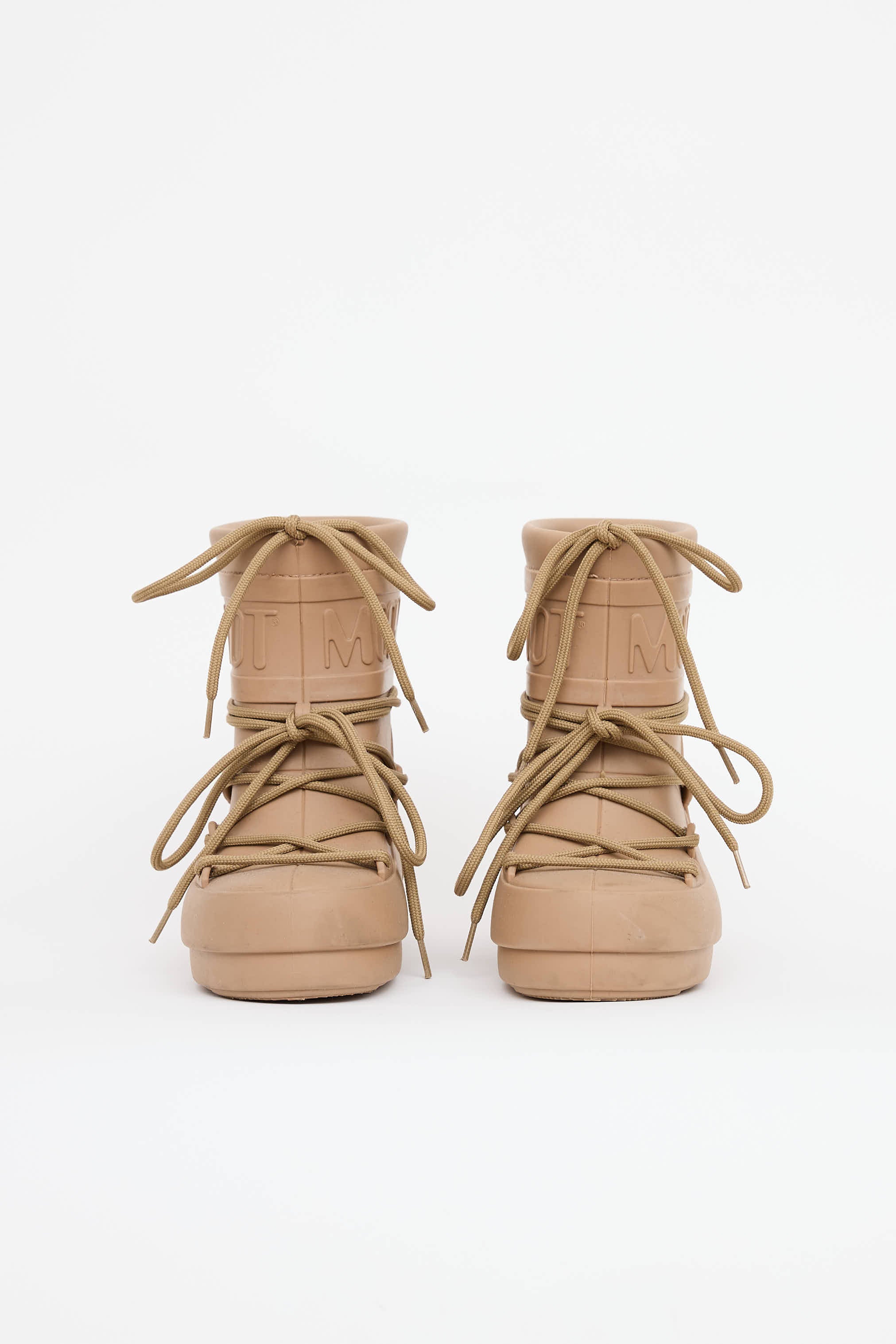Pre-owned Moon Boot beige low rain boot featuring rubber upper, round toe, lace up vamp, and debossed logo at ankle.