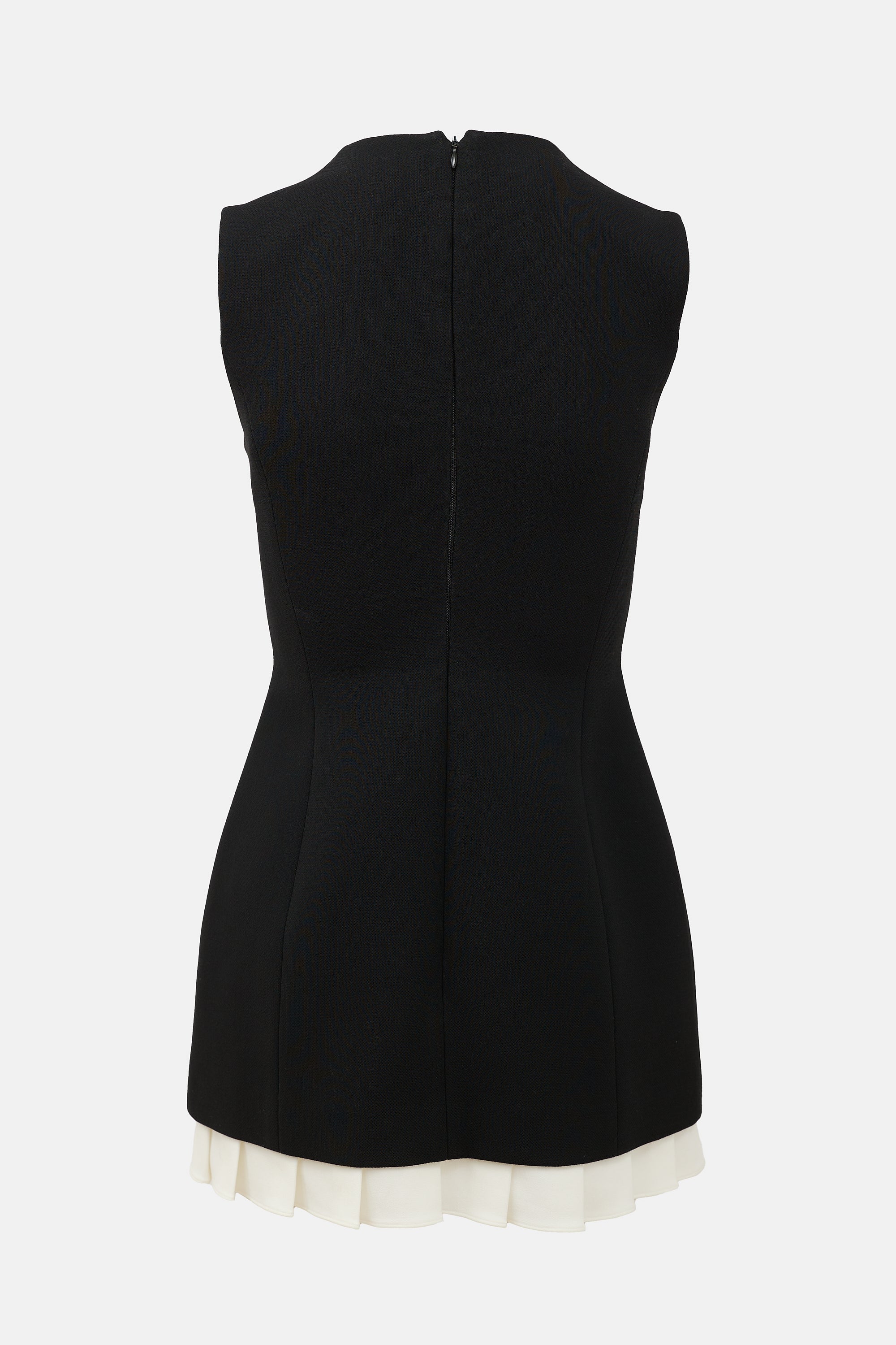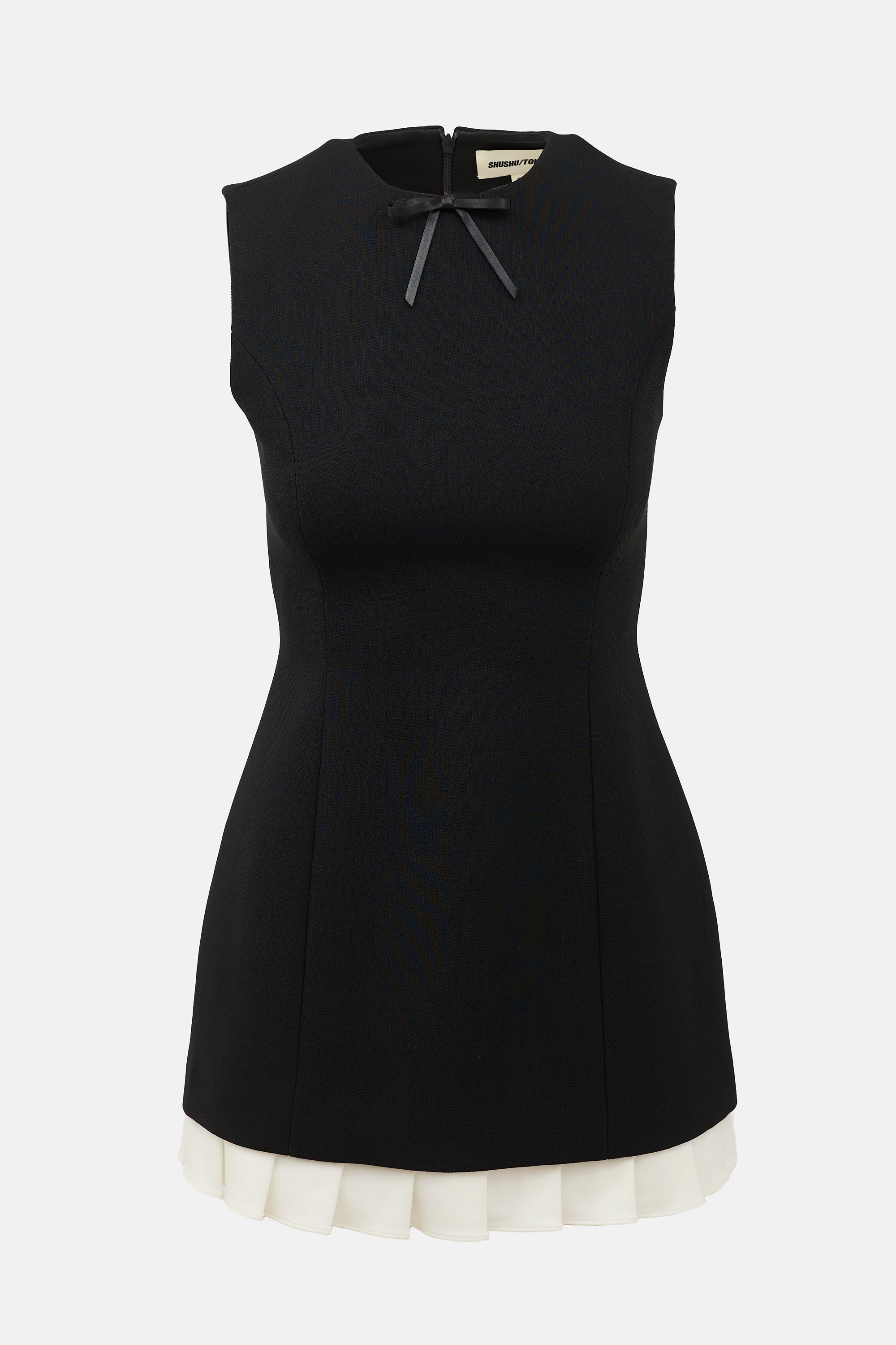 Pre-owned Shushu/Tong black mini dress featuring a round neckline, tonal satin bow at front collar, concealed back zip, sleeveless styling, and white pleated hem.