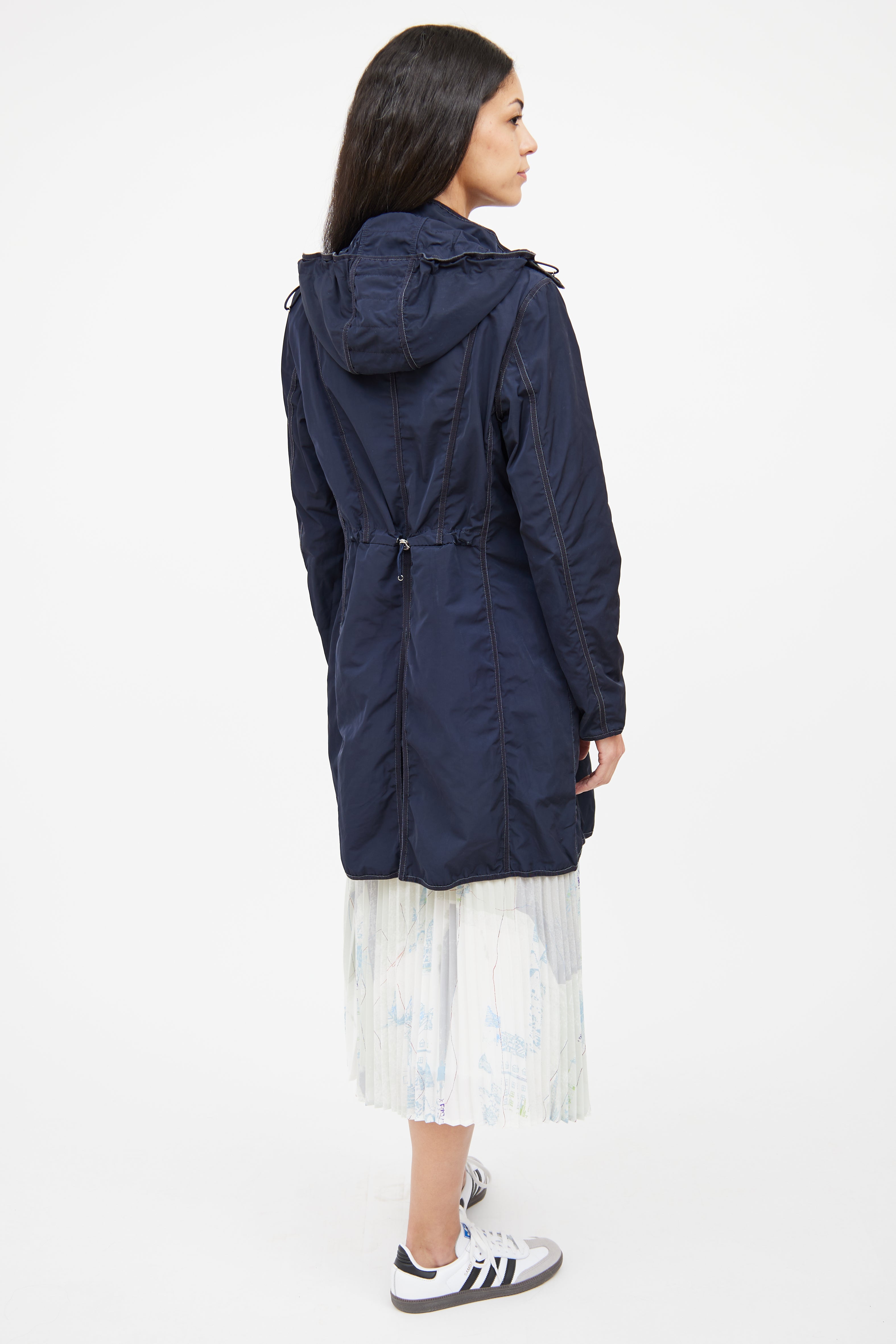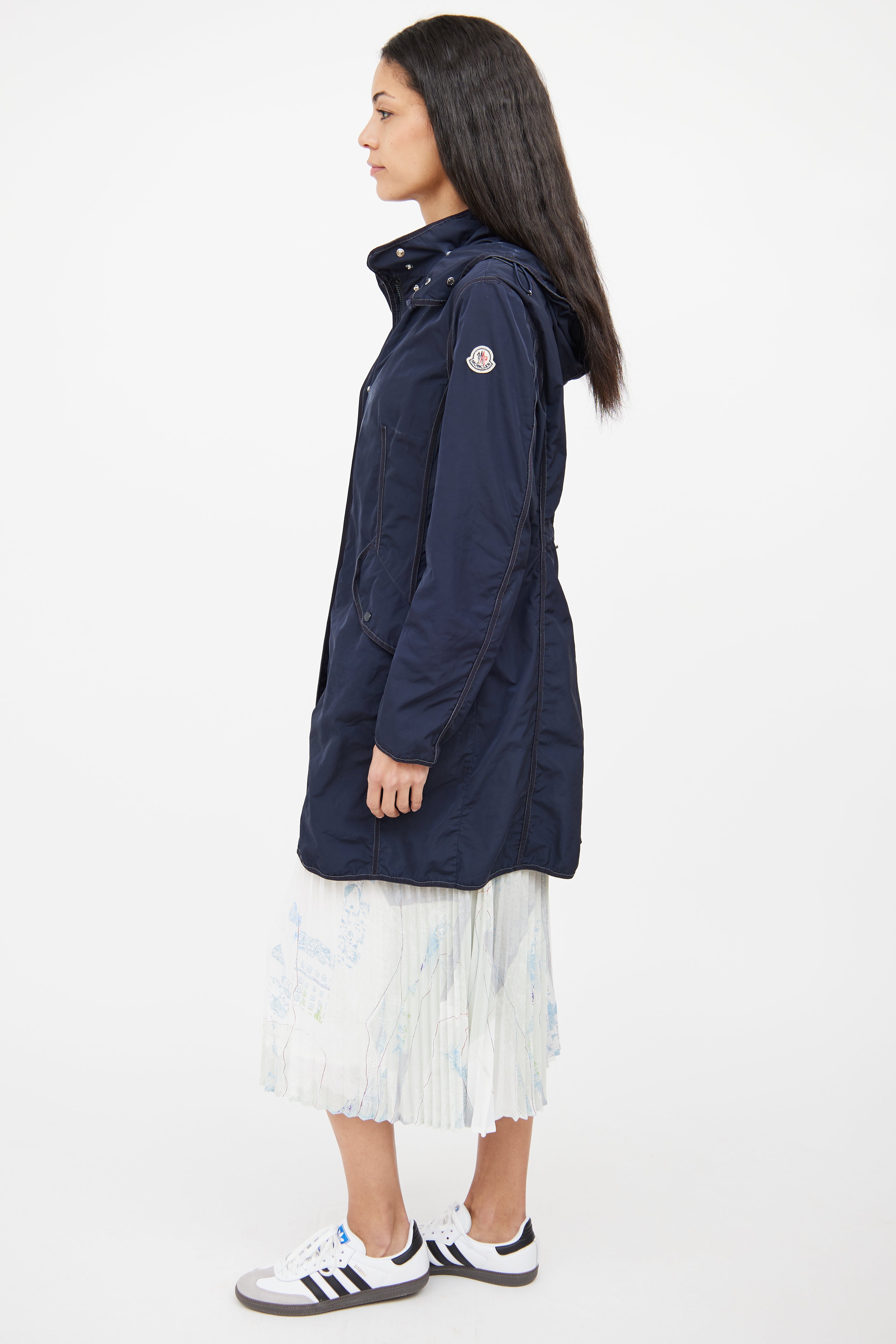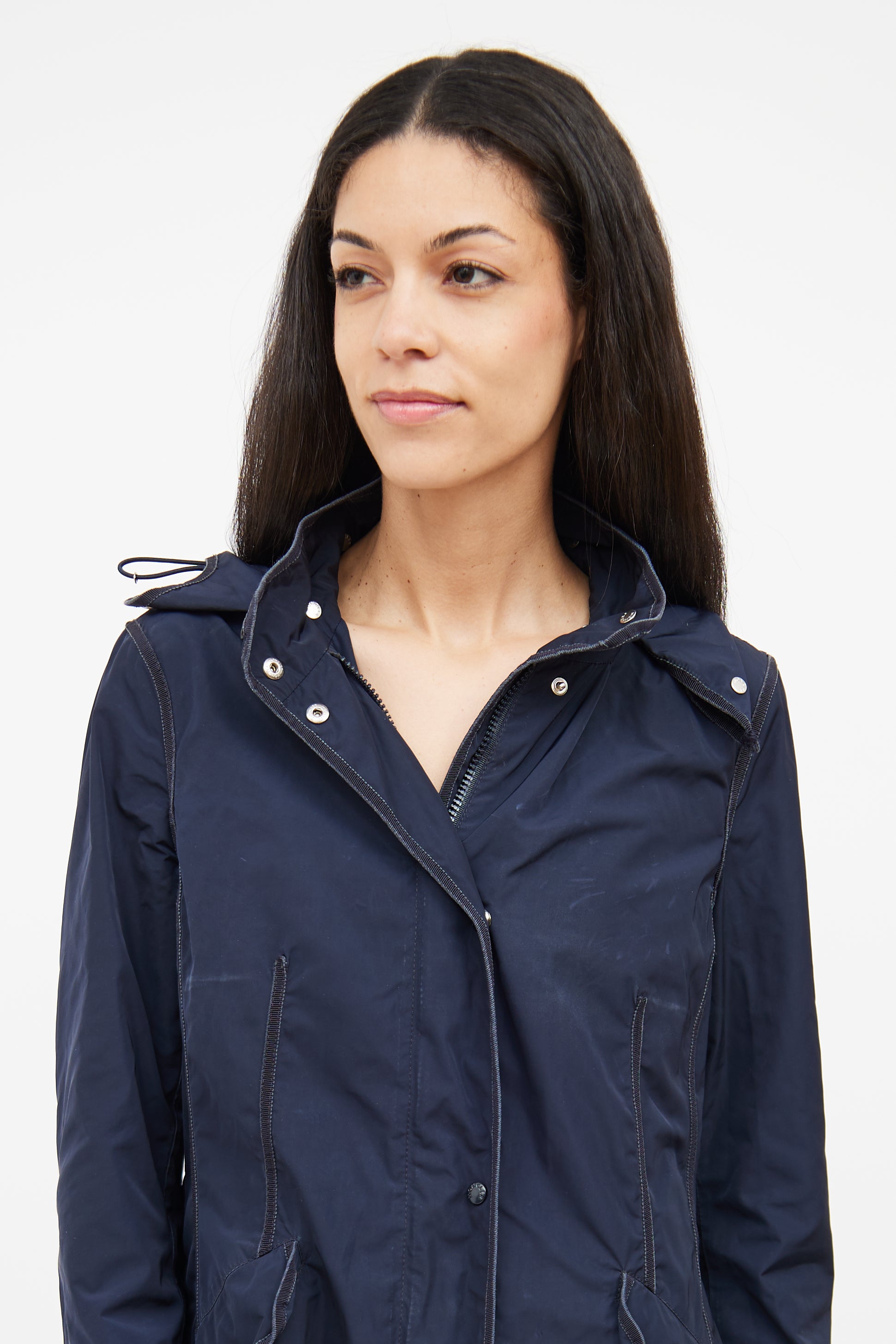 Pre-owned Moncler navy Argelia Anorak jacket featuring detachable hood, adjustable bungee cords on hood, long sleeves with Moncler patch on shoulder, silver tone hardware, webbed trim throughout, zip front closure with snap button closure, snap button flap pockets on waist, and cinched waist on back with adjustable bungee cord.
