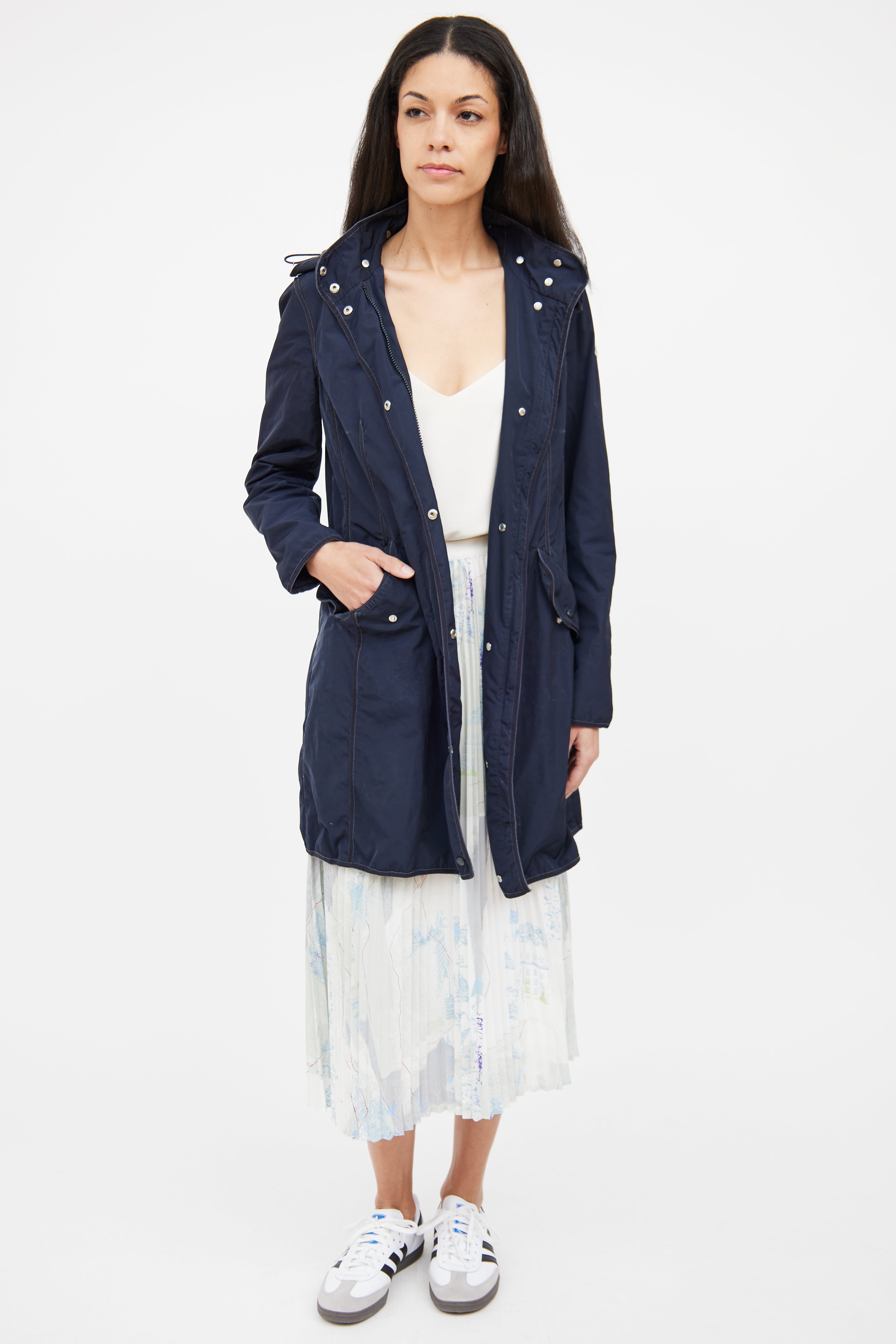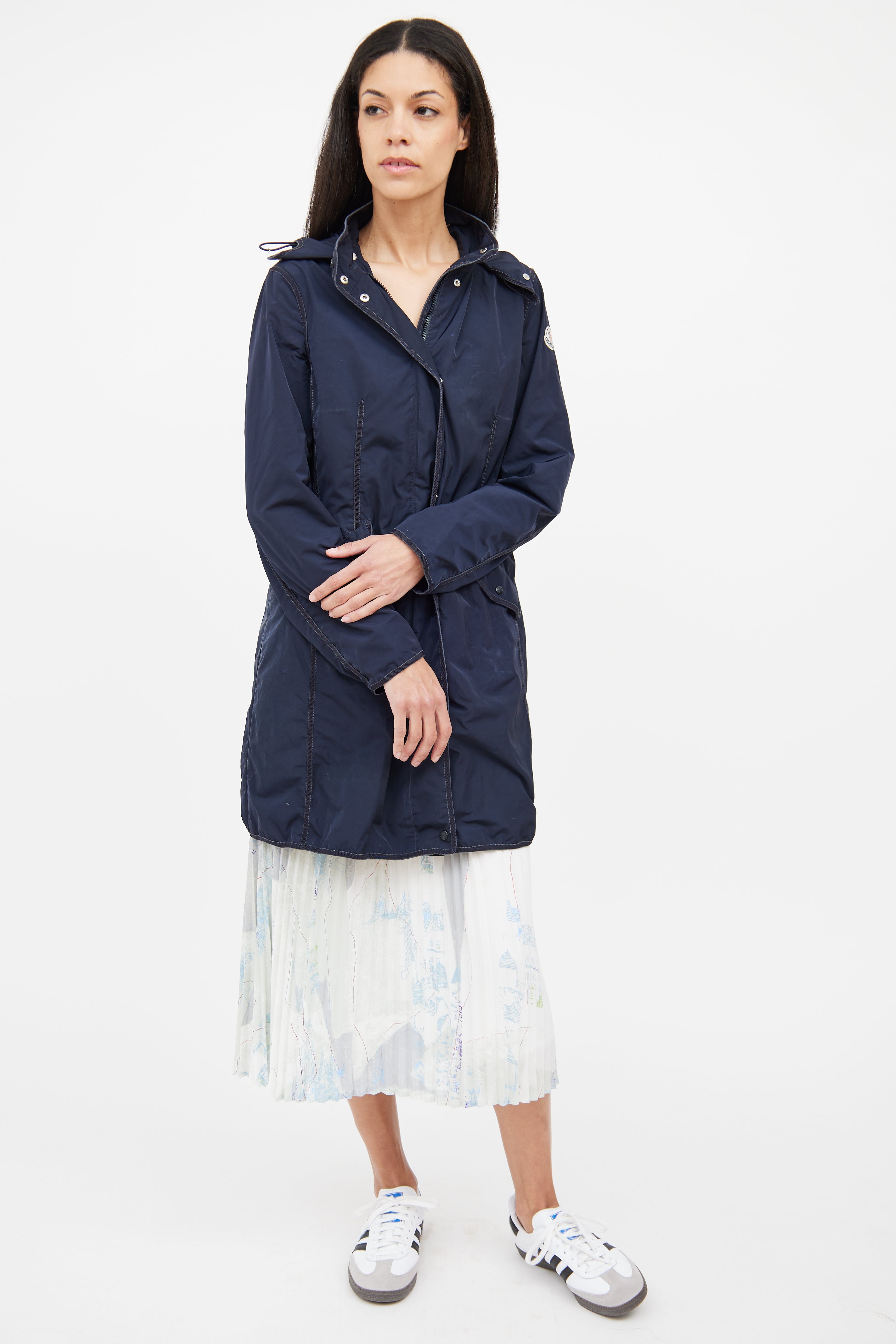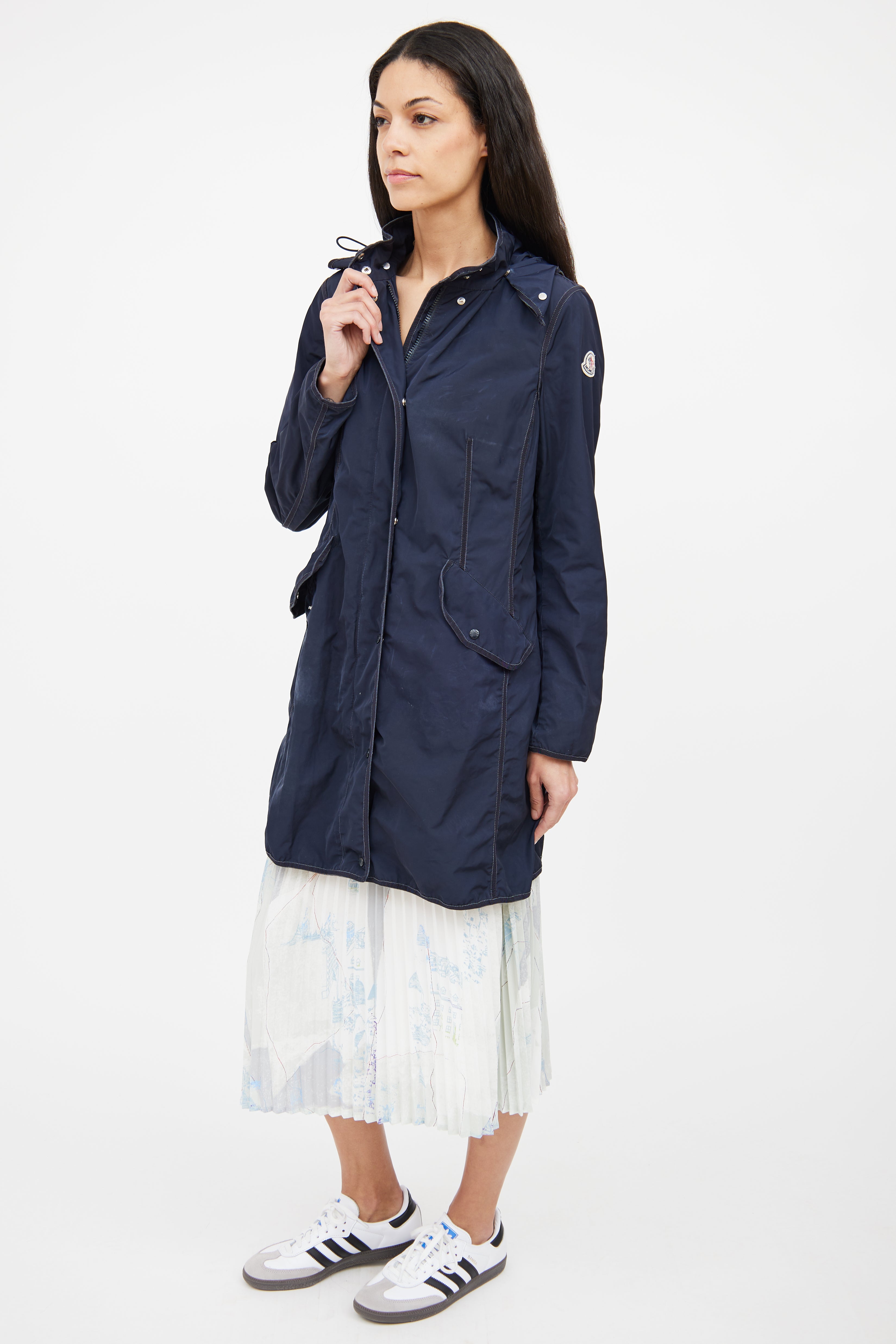 Pre-owned Moncler navy Argelia Anorak jacket featuring detachable hood, adjustable bungee cords on hood, long sleeves with Moncler patch on shoulder, silver tone hardware, webbed trim throughout, zip front closure with snap button closure, snap button flap pockets on waist, and cinched waist on back with adjustable bungee cord.