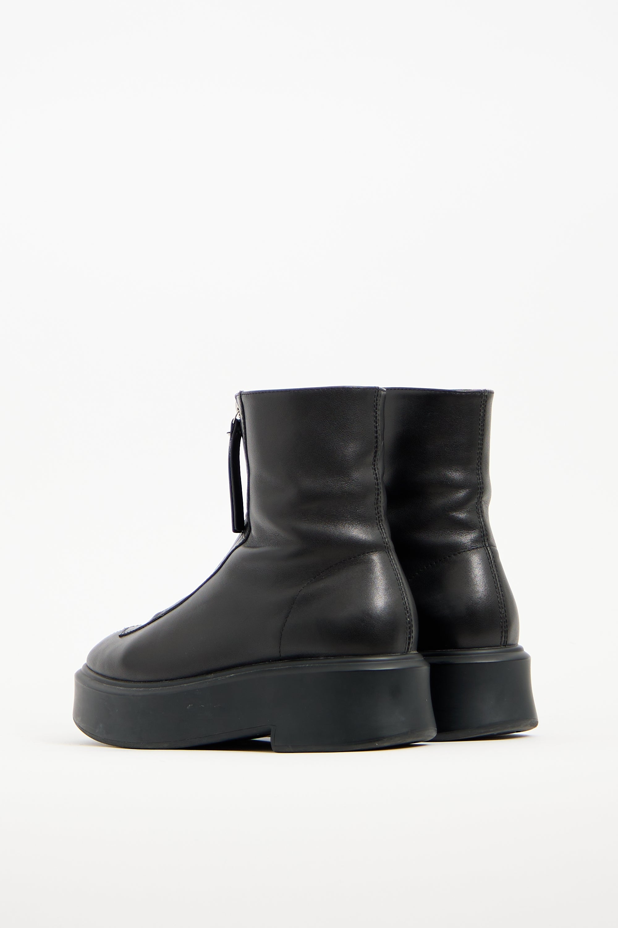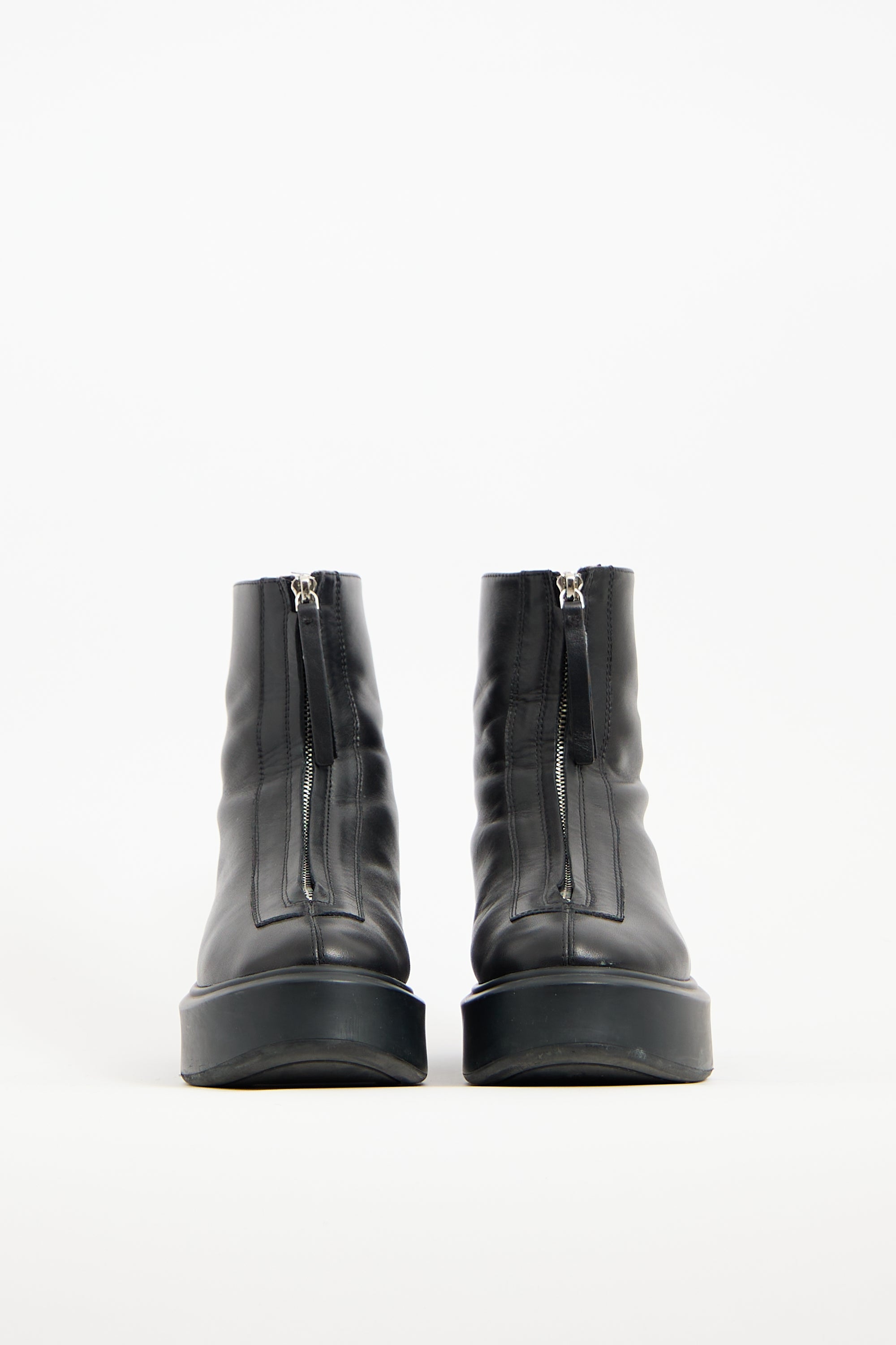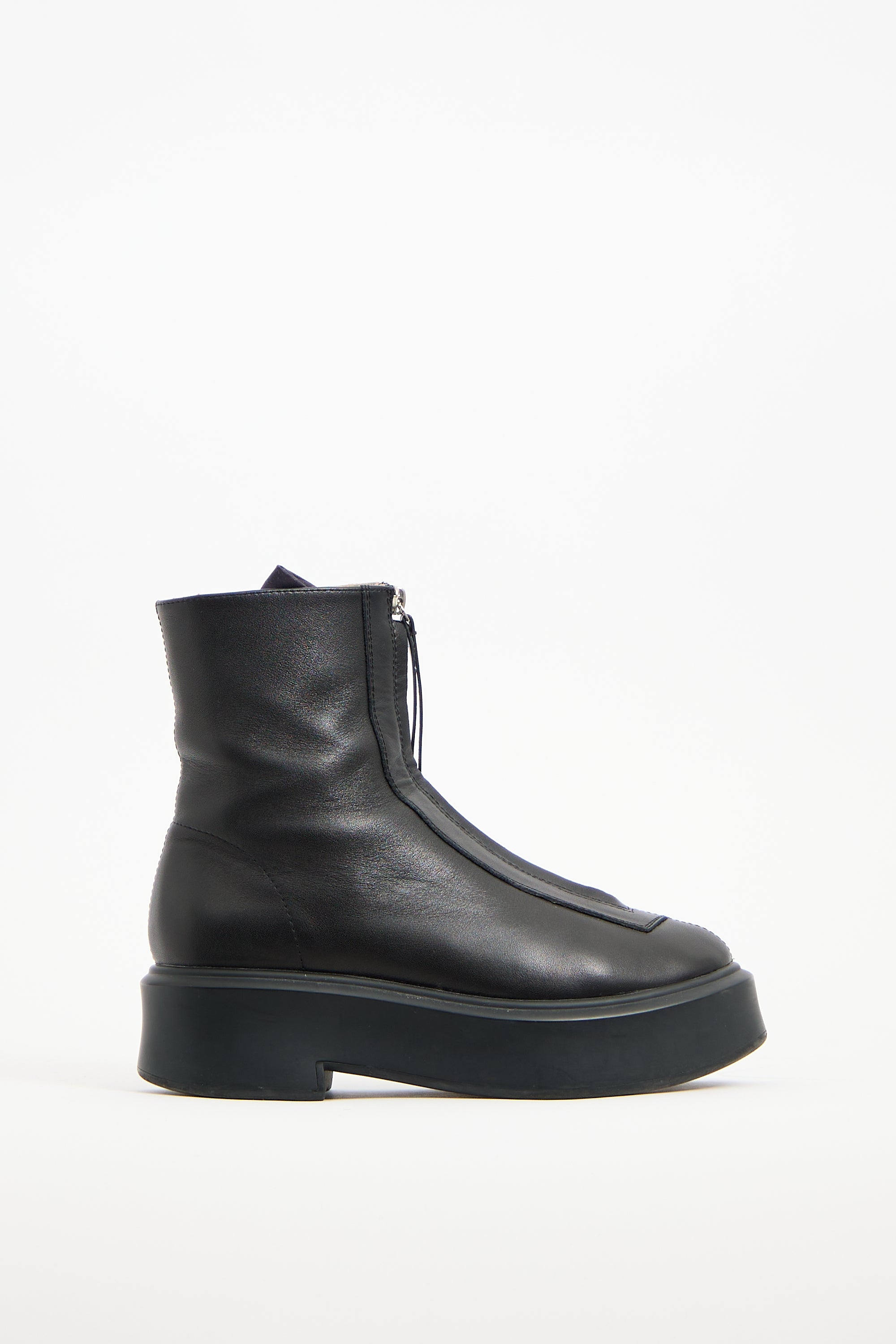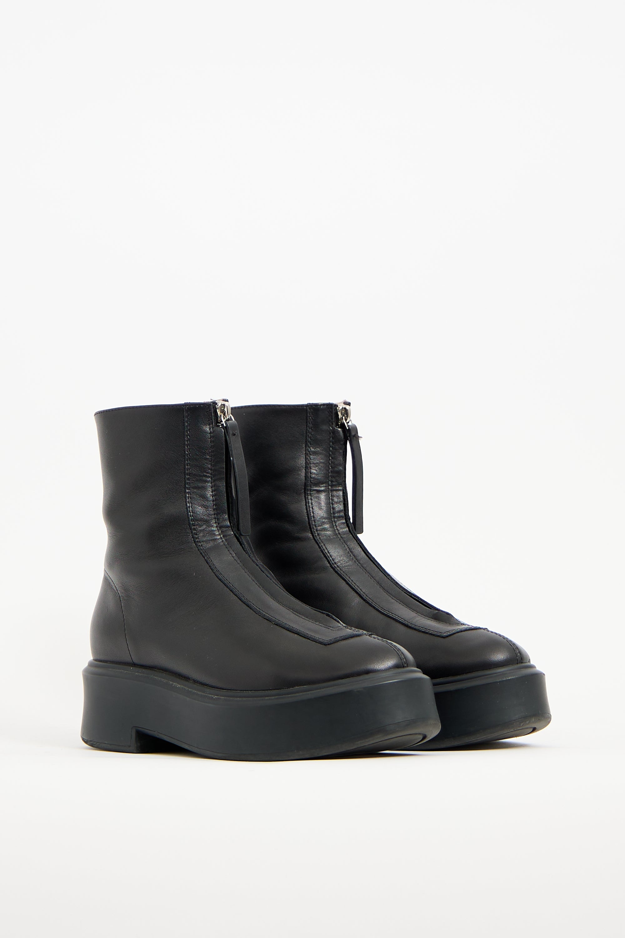 Pre-owned The Row black leather boots featuring rounded toe, front zip closure, platform sole and ankle high shaft.