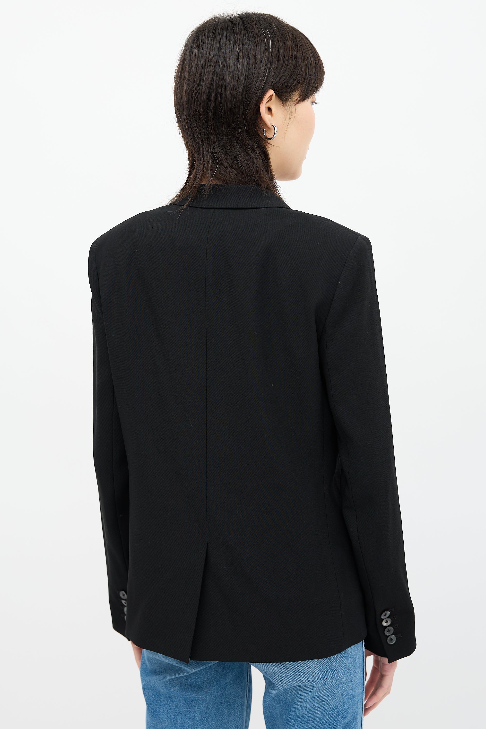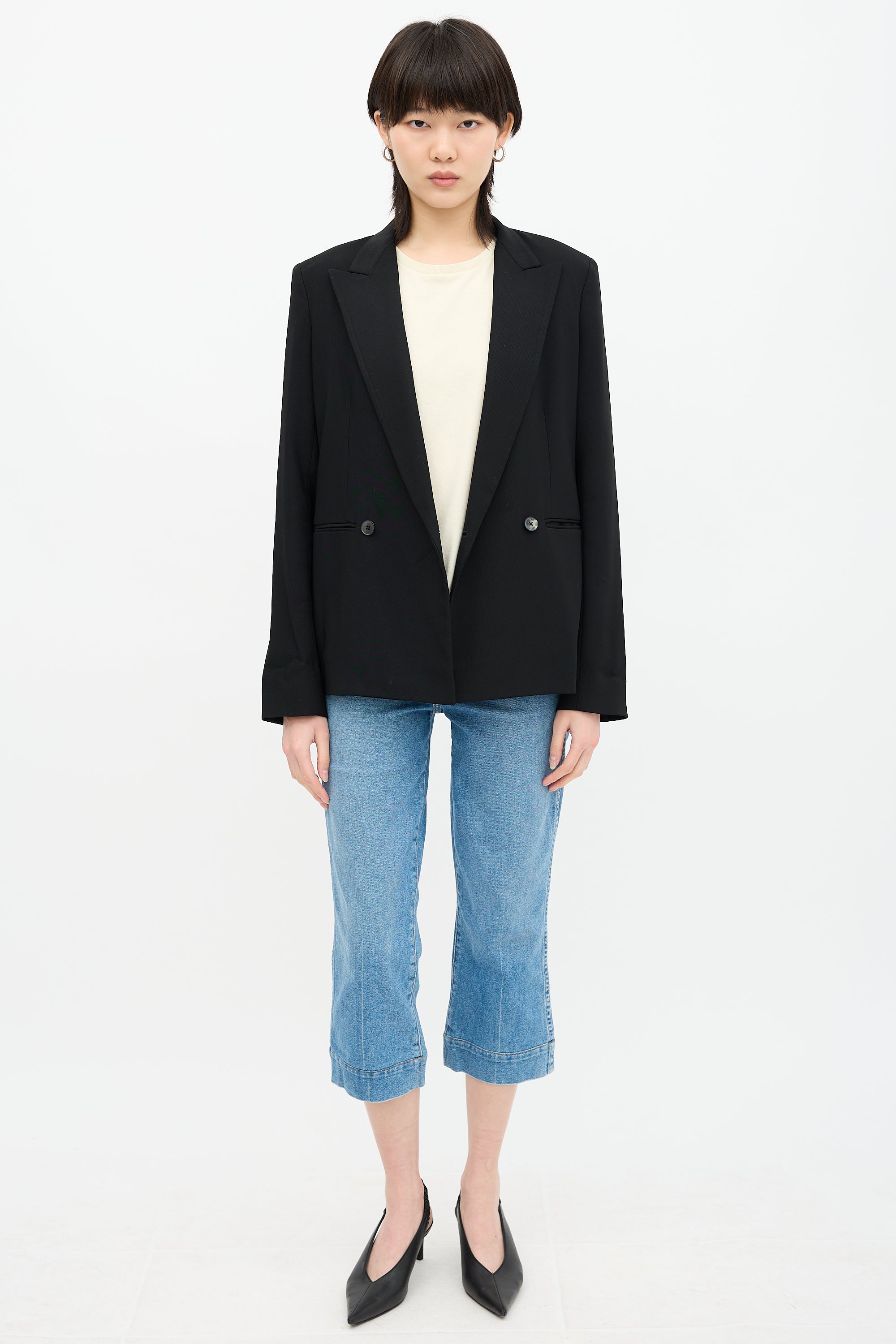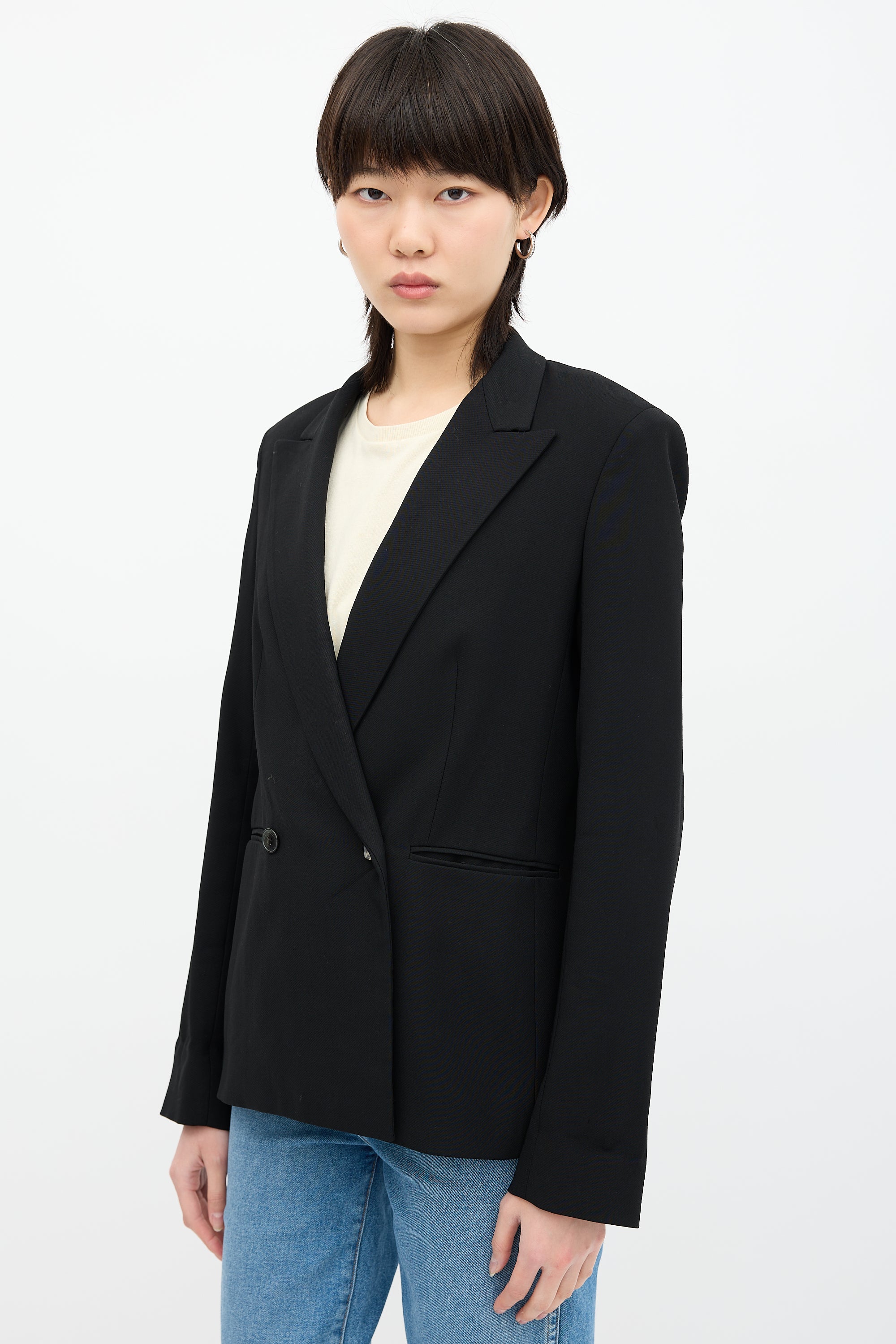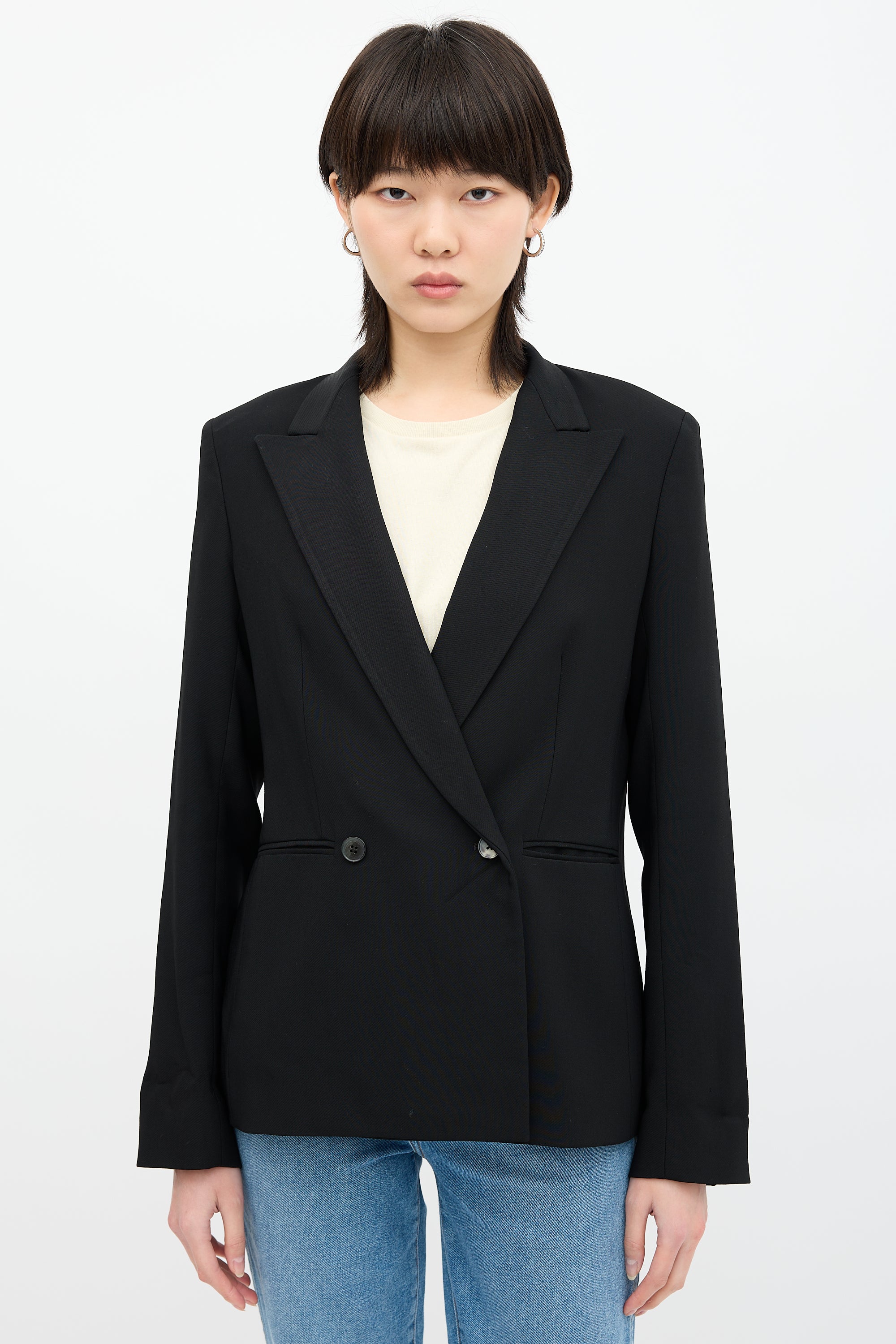 Pre-owned The Row black Lione blazer featuring notched lapel, double breasted button front, two double welt pockets, and back vent. Lined.