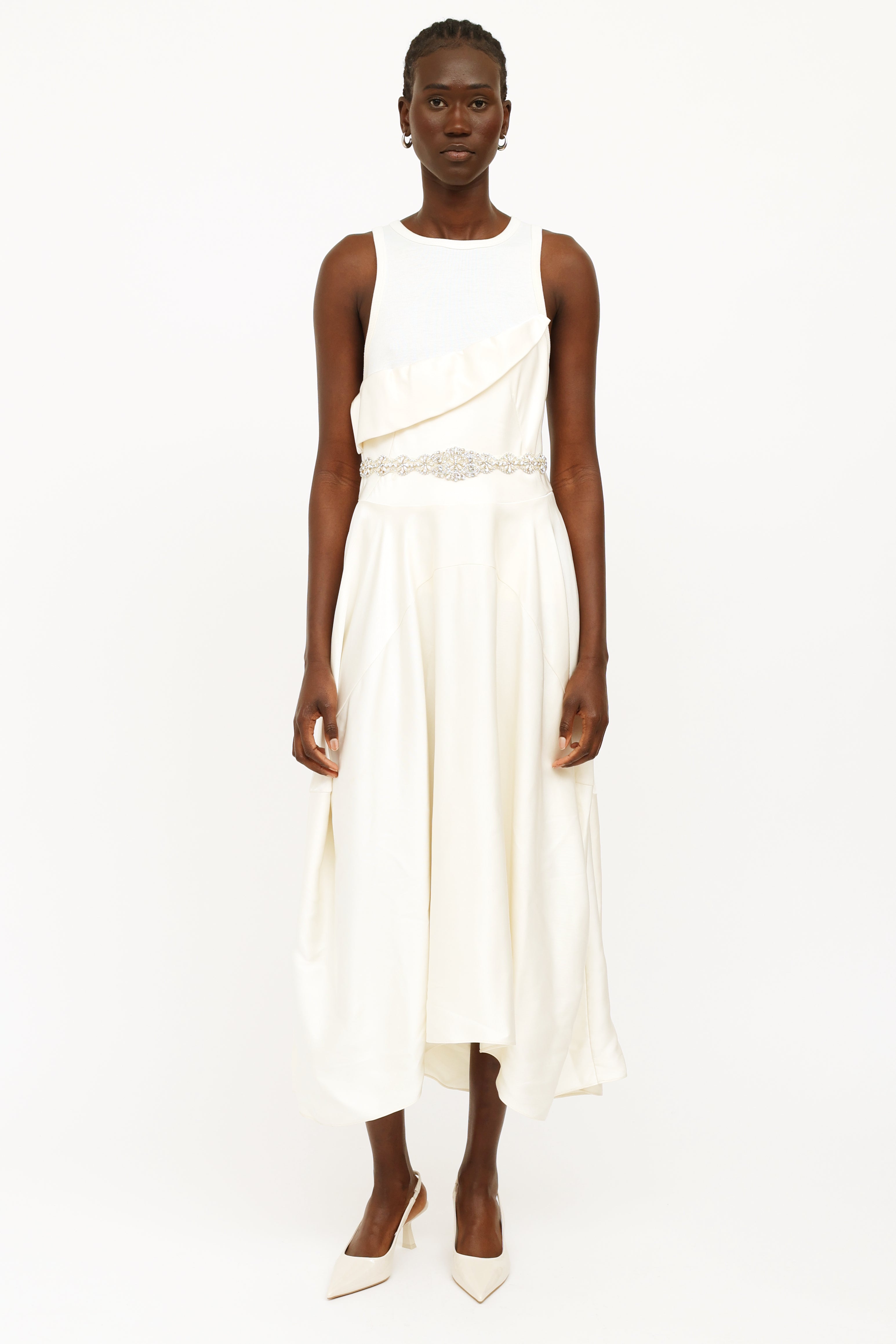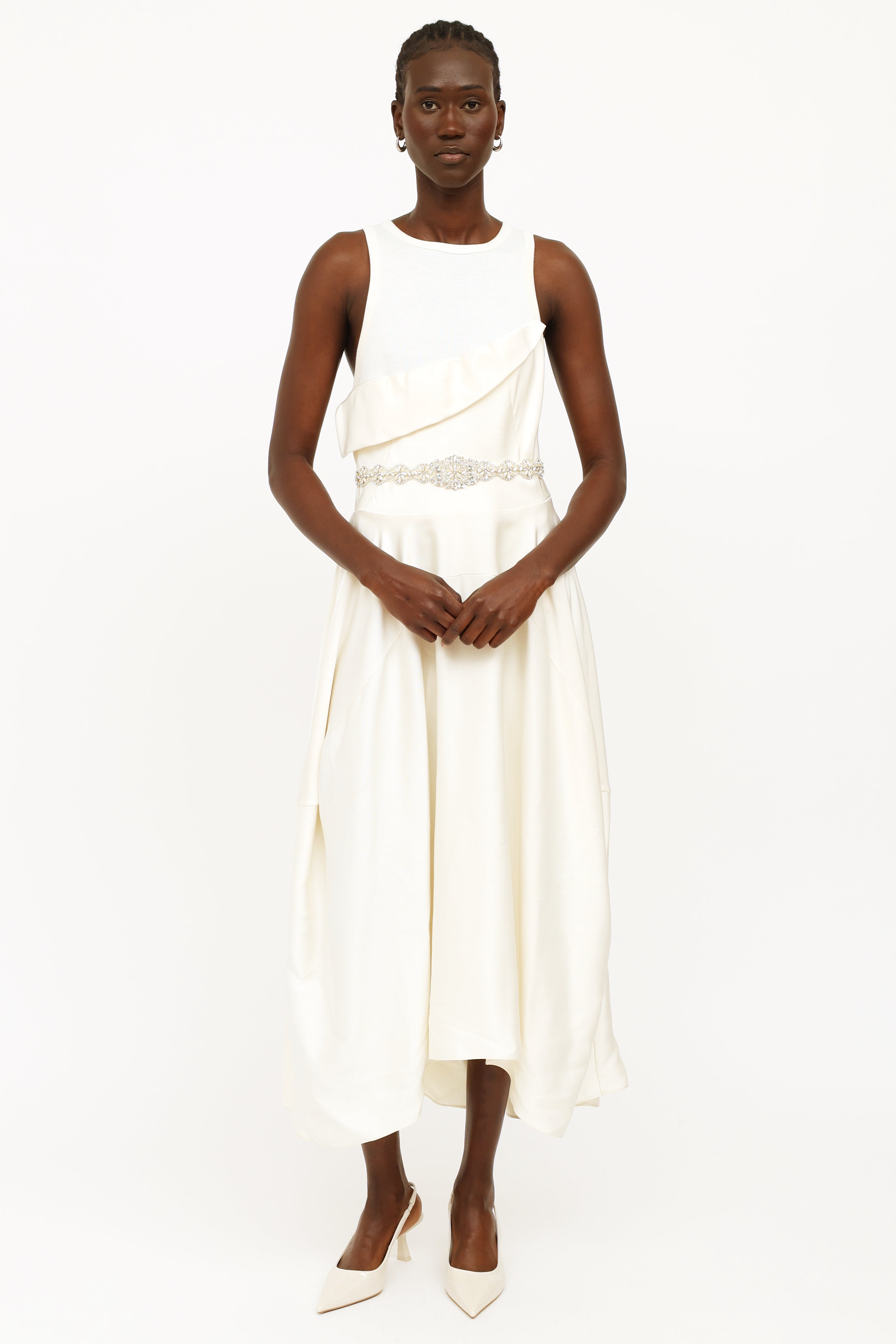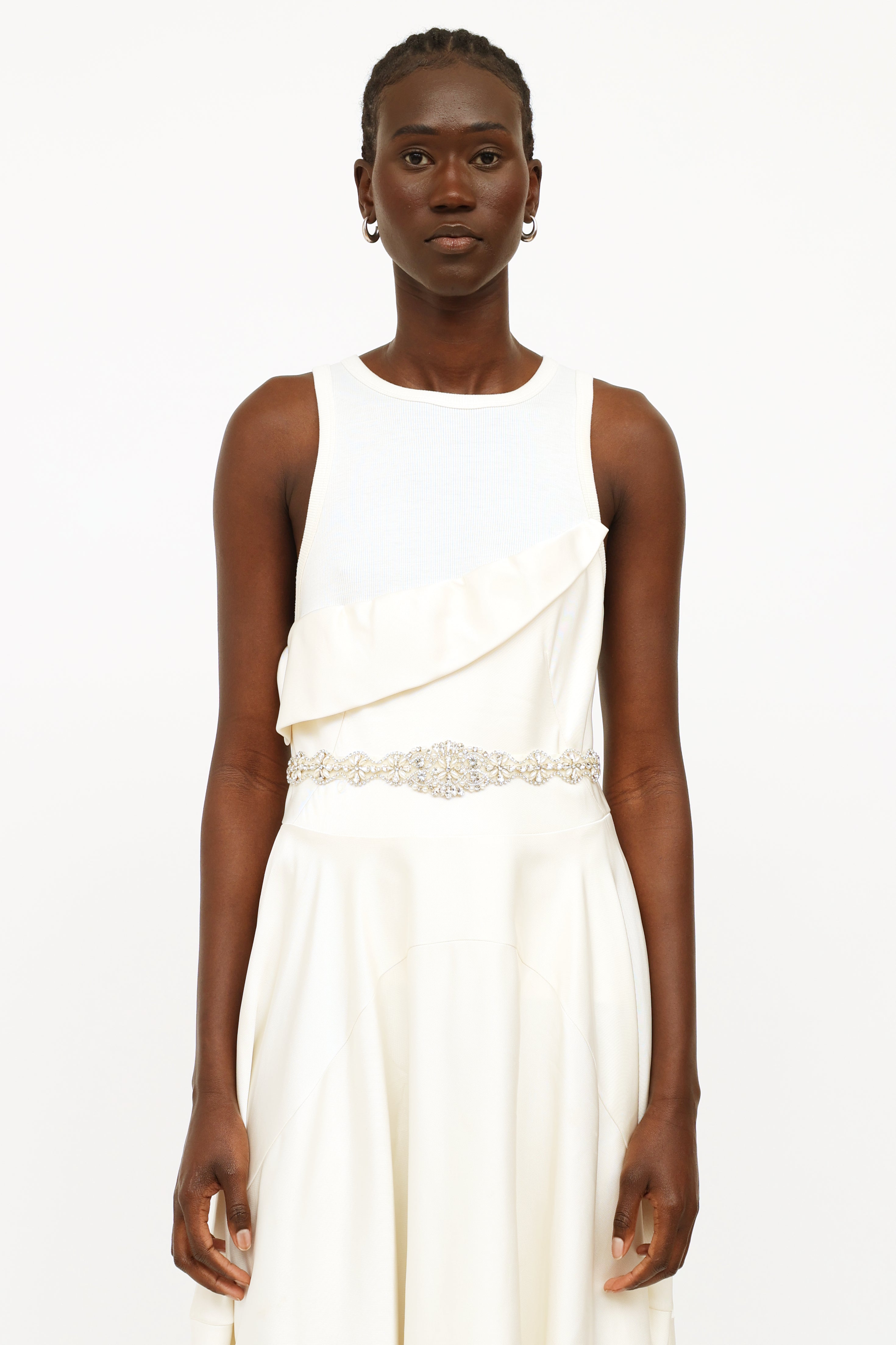 Pre-owned Alexander McQueen cream ribbed tiered dress featuring a round neckline, front tiered ruching at chest, concealed side zip closure, dual slip pockets at waistline, and detachable ribbon belt with embroidered silver toned hardware.